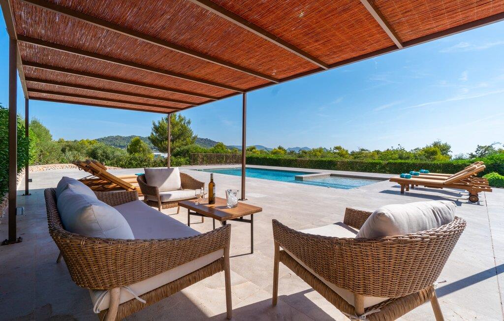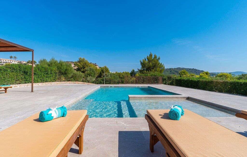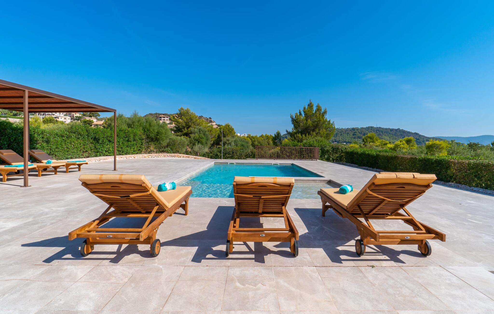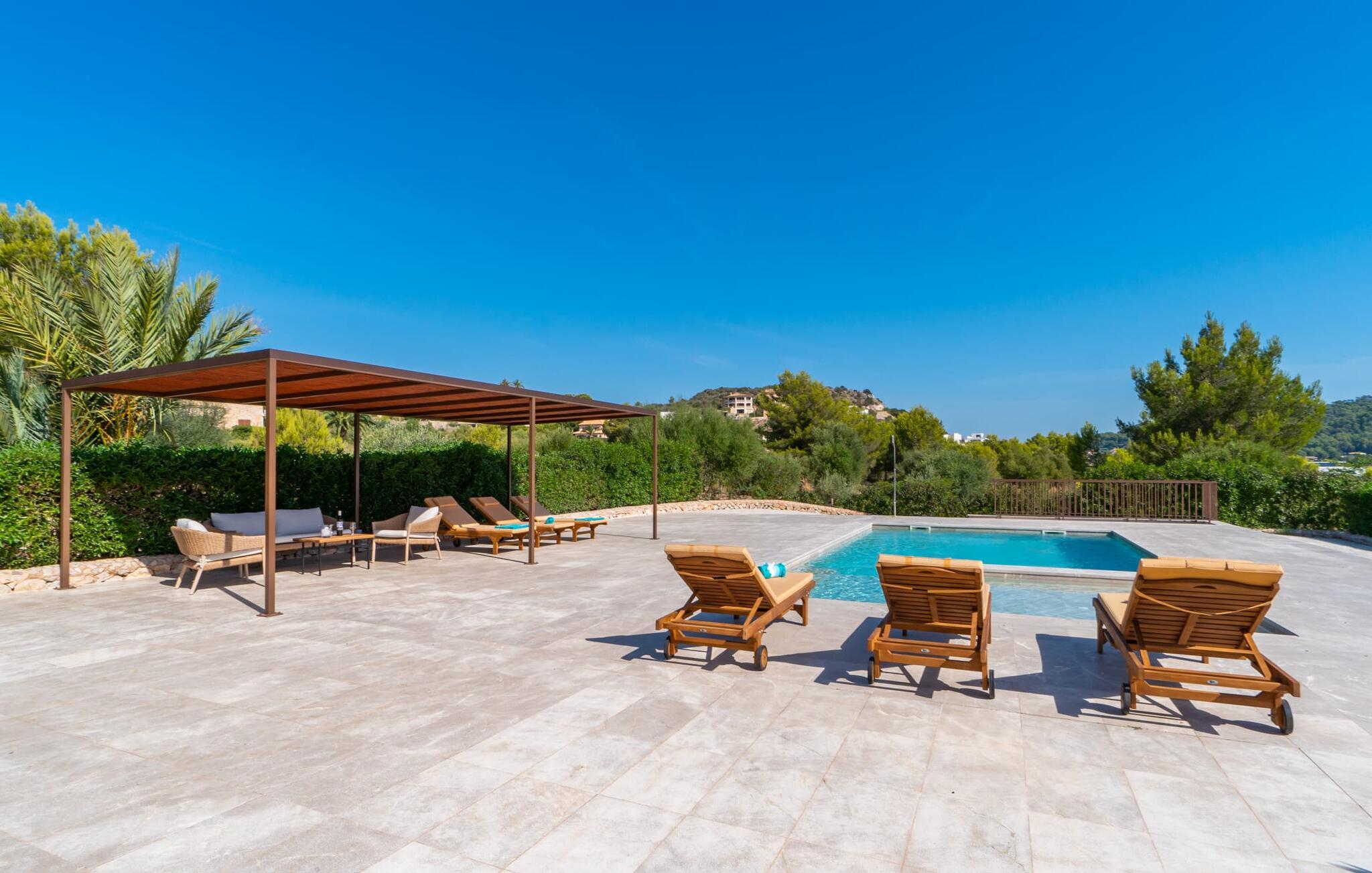 Det romslige, grunne bassenget er lett tilgjengelig og har solsenger av høy kvalitet for soling og en slående pergola for avslapping i skyggen. Solterrassen går sømløst over i en vakker spiseplass og gir naturlig skygge for herlige grillfester, supplert med subtil utendørsbelysning som forsterker stemningen.
