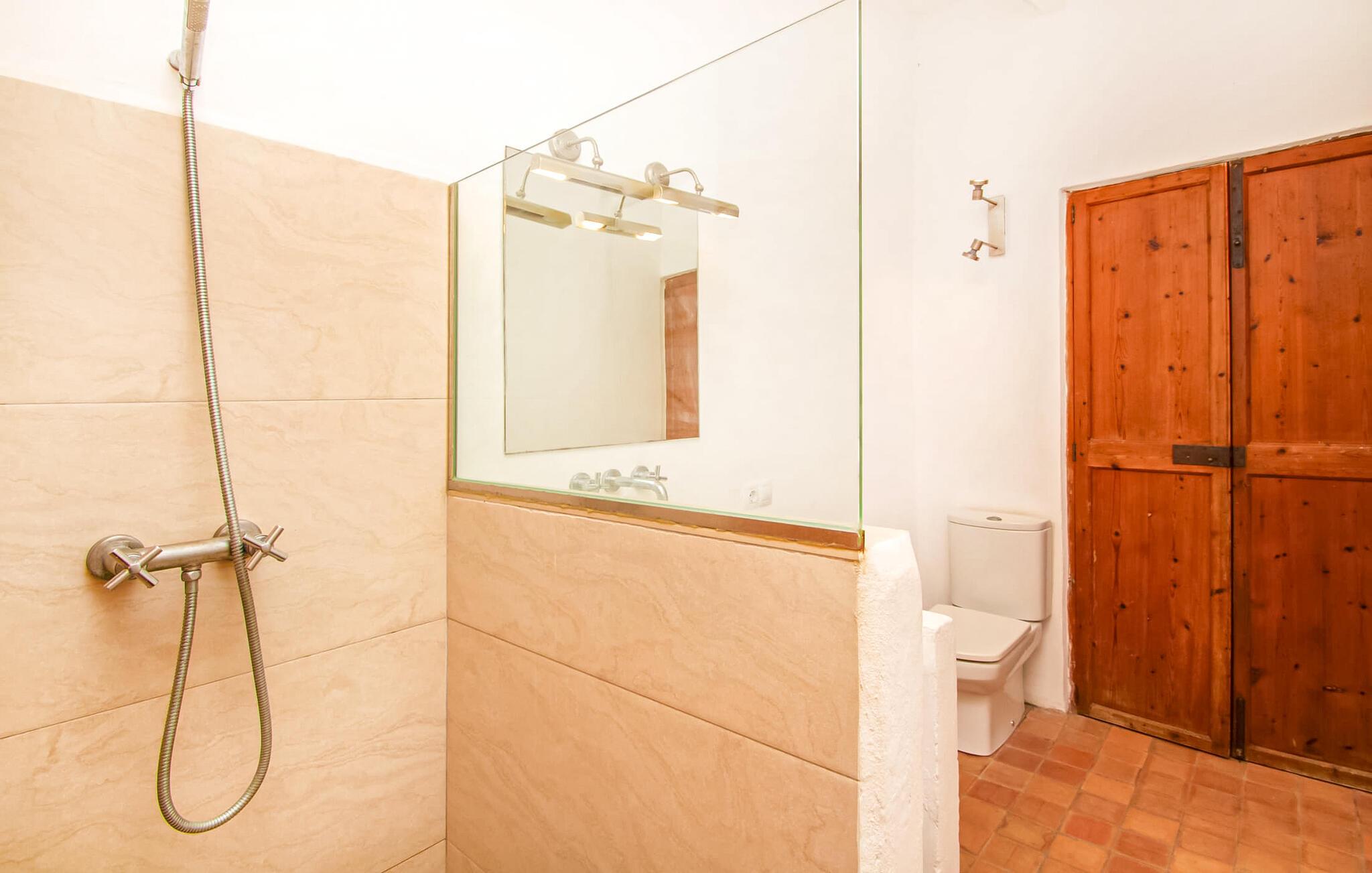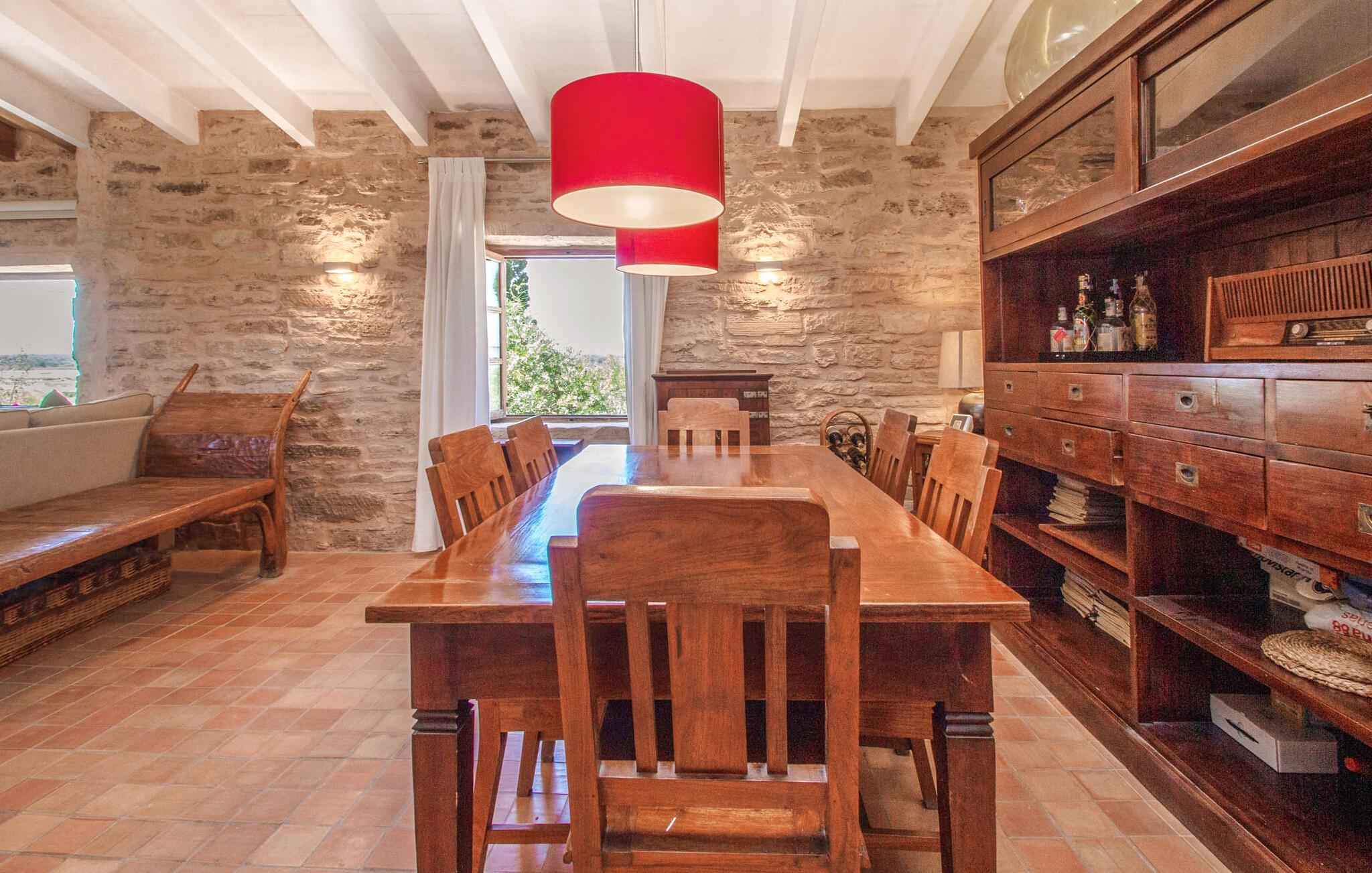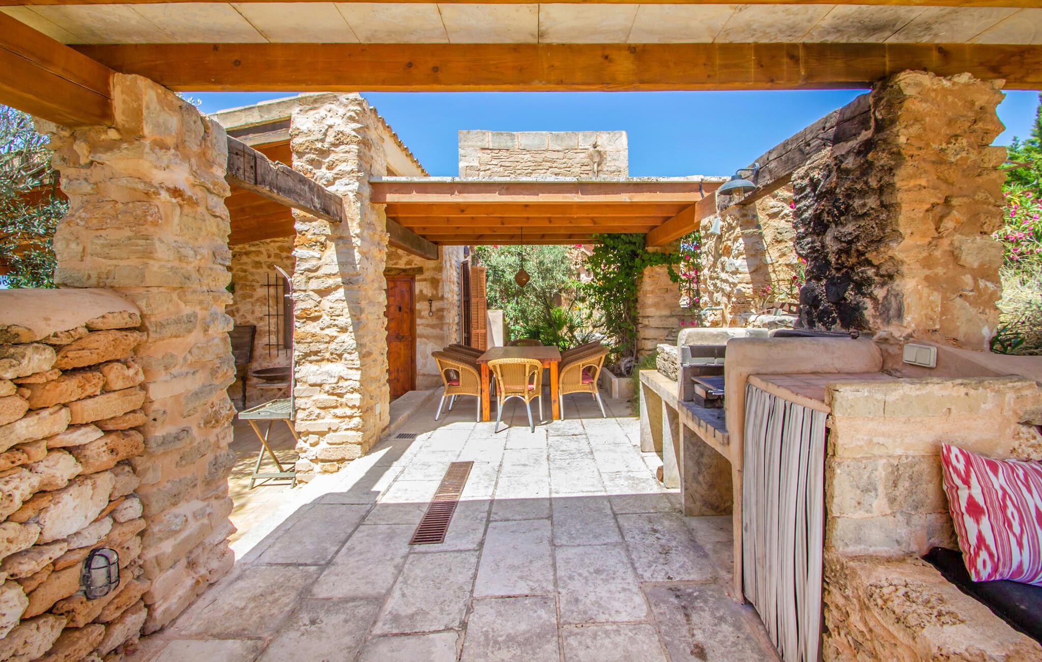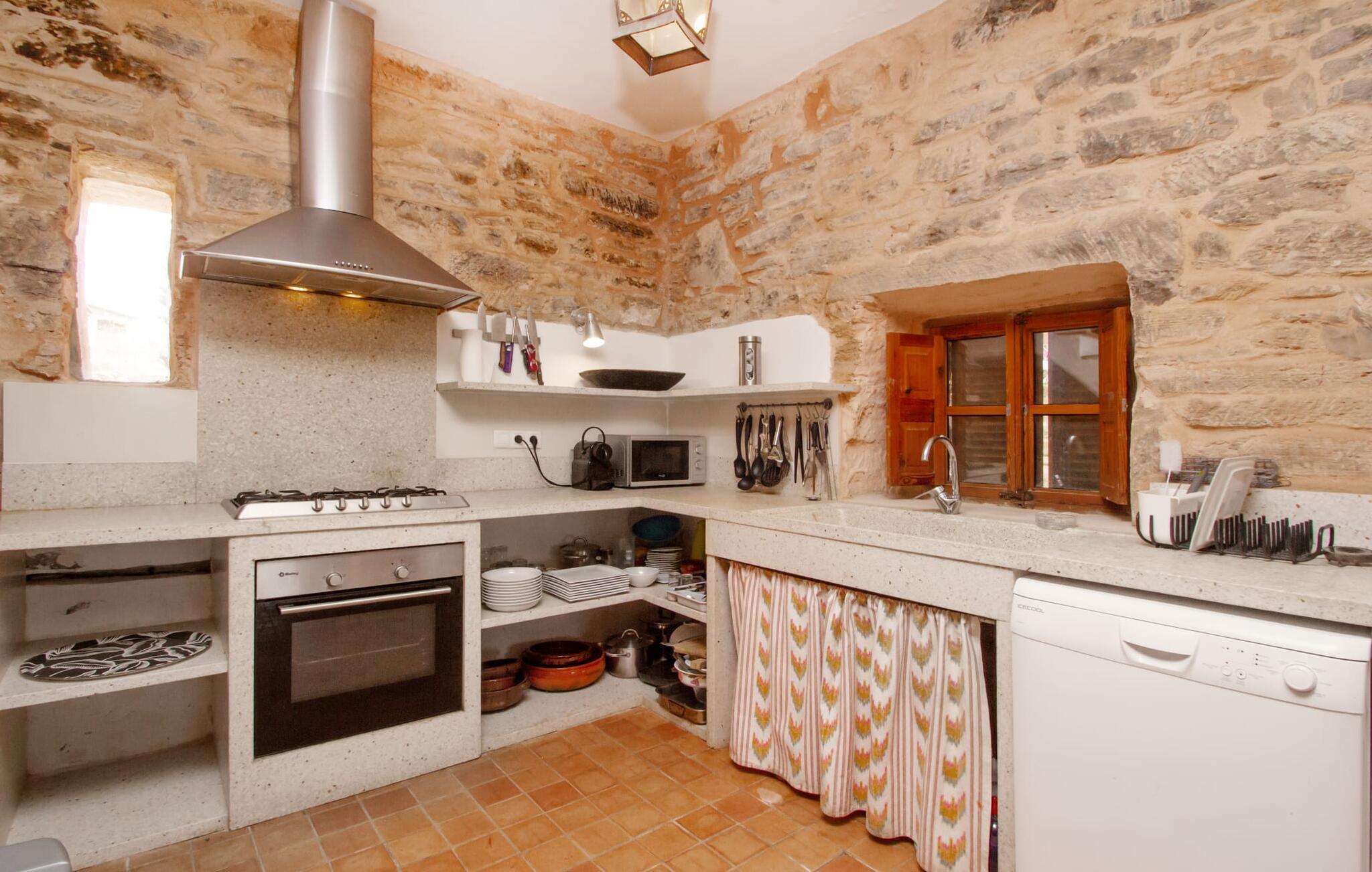 De gamle steinmurene med det gamle mølletårnet er hjemsted for et moderne interiørdesign som har en imponerende herregårdskarakter som er i tråd med sjarmen i disse paradisiske omgivelsene. Samtidig imponerer interiøret med sin designstil av høy kvalitet og åpne planløsning. Bruken av naturlige materialer skaper en flott blanding av komfort og omhyggelig bevaring av verdsatte tradisjoner. Et romslig rom med panoramautsikt forbinder den koselige stuen med den tilstøtende spisestuen. To terrakottaflislagte trappetrinn fører til det tilstøtende åpne kjøkkenet med kjølig, minimalistisk design av mursteinskap med alle de vanlige tekniske bekvemmelighetene. Den inntagende naturligheten fortsetter i de fire soverommene med synlige steinvegger. Tre av dem ligger i første etasje, mens det fjerde ligger på et åpent plan over kjøkkenet i det gamle mølletårnet. Din personlige følelse av luksus avrundes av fire komplette bad med toppmoderne innredning, inkludert dusjkabinett eller badekar. Dermed er det ingenting som står i veien for at opptil ni personer kan slappe helt av på ferien. Es Moli des Trenc er det perfekte tilfluktsstedet for familier og venner som reiser sammen i nostalgiske omgivelser og med en helt fantastisk beliggenhet.