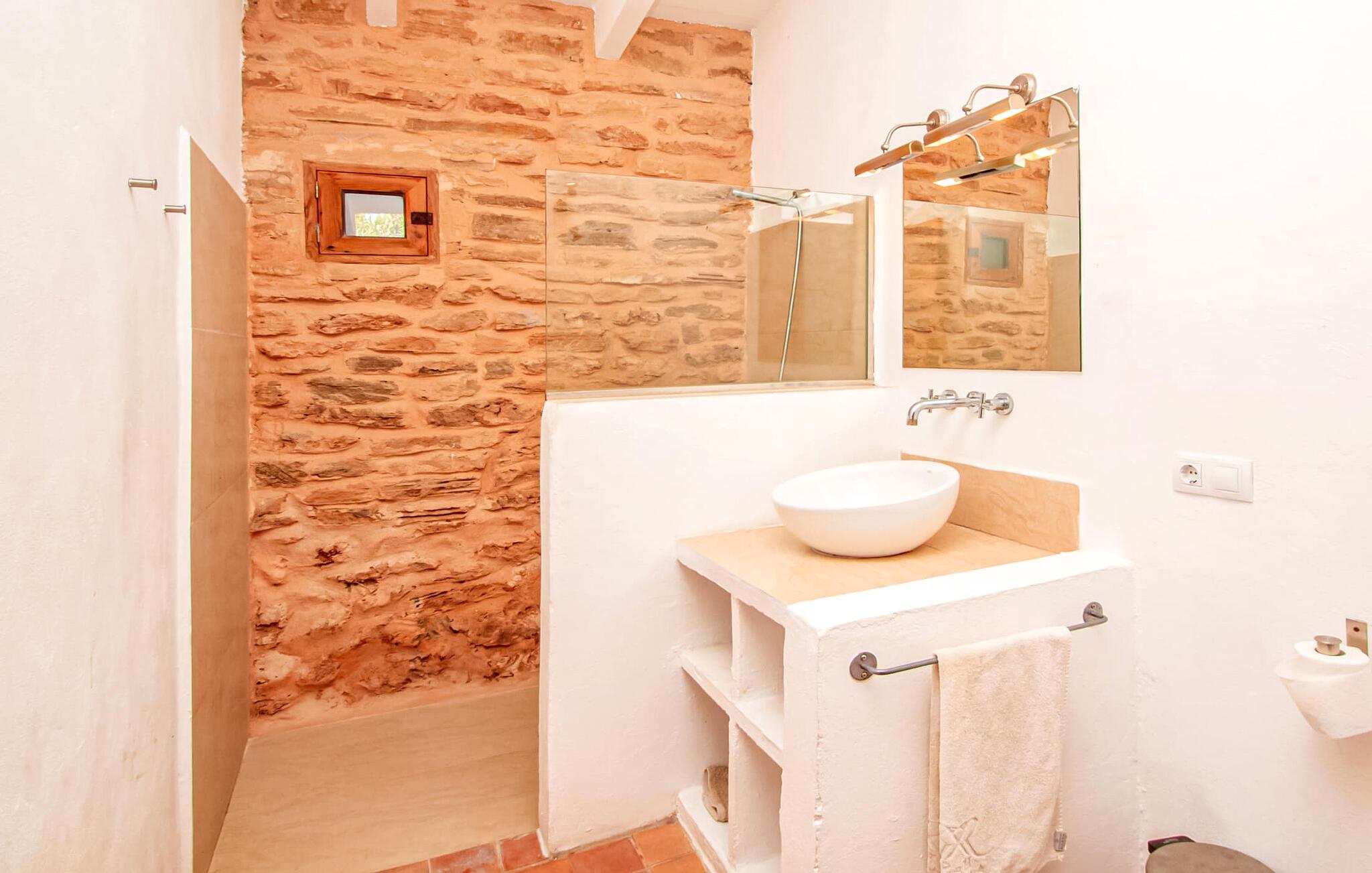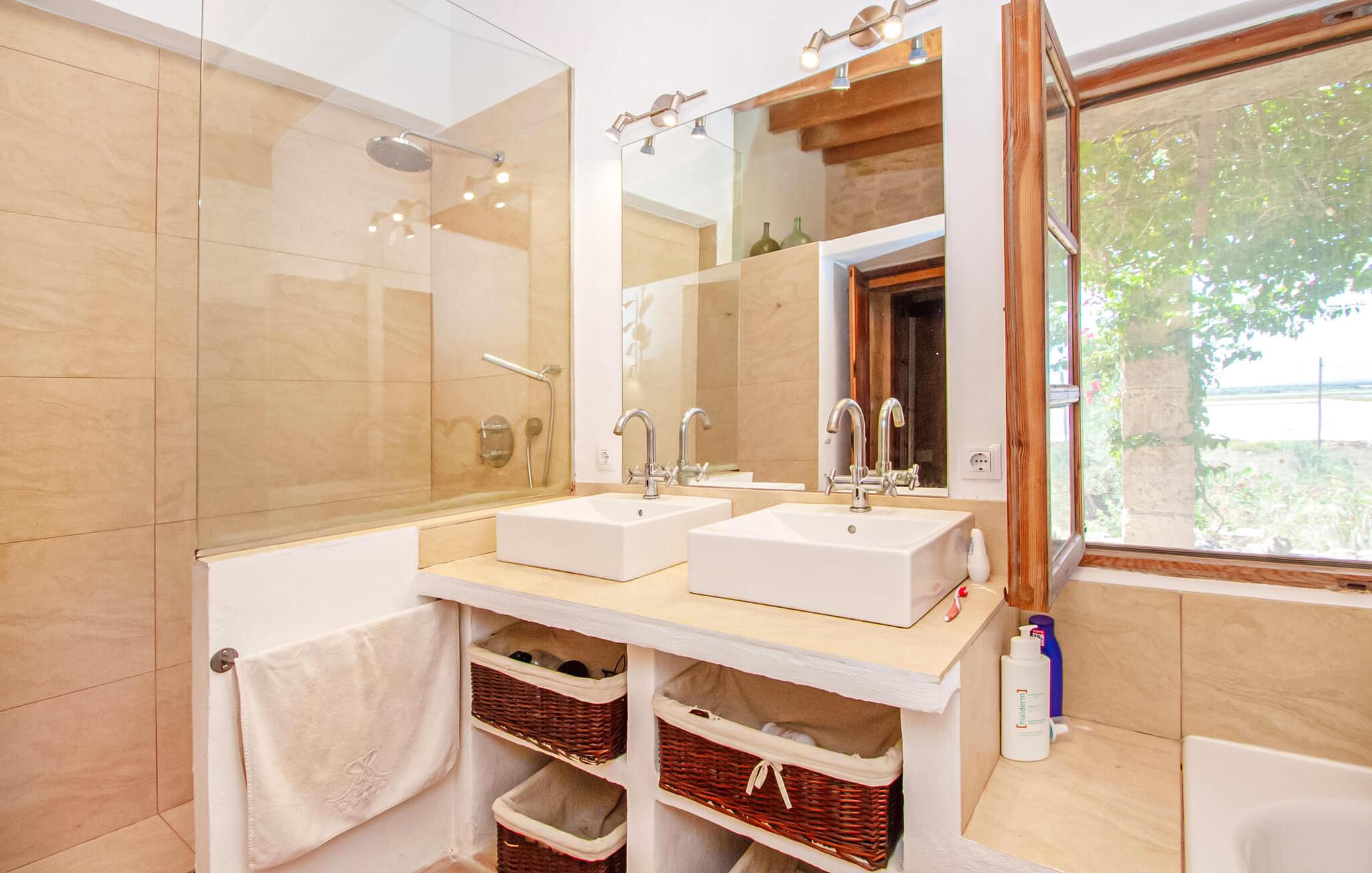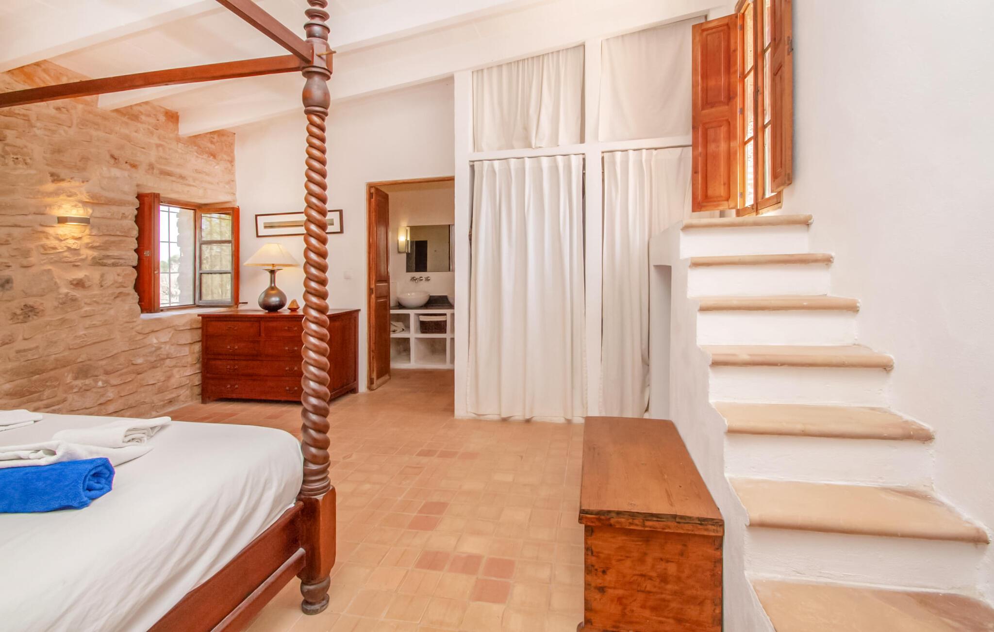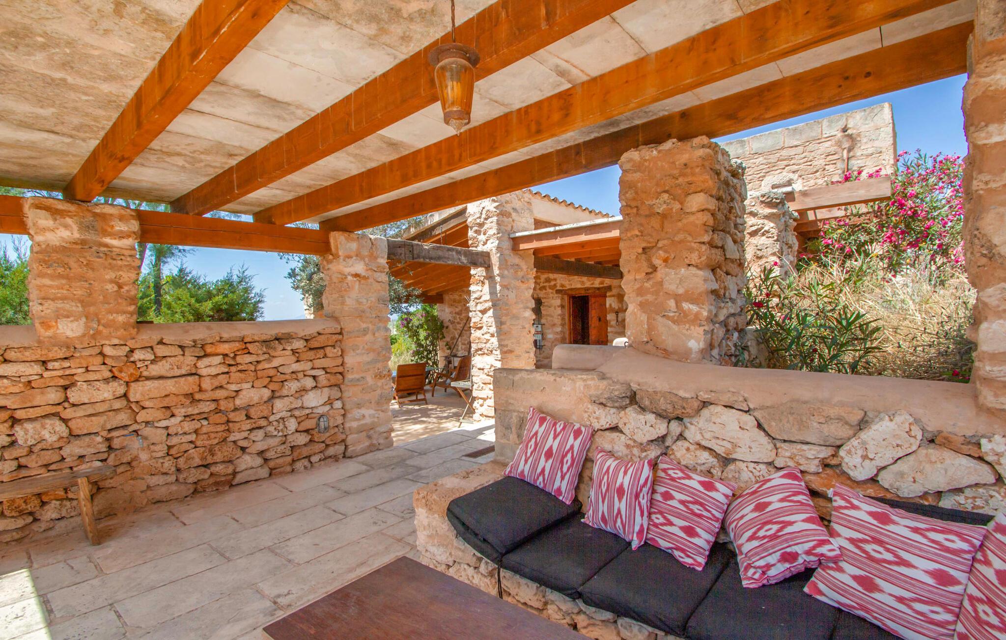 De gamle steinmurene med det gamle mølletårnet er hjemsted for et moderne interiørdesign som har en imponerende herregårdskarakter som er i tråd med sjarmen i disse paradisiske omgivelsene. Samtidig imponerer interiøret med sin designstil av høy kvalitet og åpne planløsning. Bruken av naturlige materialer skaper en flott blanding av komfort og omhyggelig bevaring av verdsatte tradisjoner. Et romslig rom med panoramautsikt forbinder den koselige stuen med den tilstøtende spisestuen. To terrakottaflislagte trappetrinn fører til det tilstøtende åpne kjøkkenet med kjølig, minimalistisk design av mursteinskap med alle de vanlige tekniske bekvemmelighetene. Den inntagende naturligheten fortsetter i de fire soverommene med synlige steinvegger. Tre av dem ligger i første etasje, mens det fjerde ligger på et åpent plan over kjøkkenet i det gamle mølletårnet. Din personlige følelse av luksus avrundes av fire komplette bad med toppmoderne innredning, inkludert dusjkabinett eller badekar. Dermed er det ingenting som står i veien for at opptil ni personer kan slappe helt av på ferien. Es Moli des Trenc er det perfekte tilfluktsstedet for familier og venner som reiser sammen i nostalgiske omgivelser og med en helt fantastisk beliggenhet.