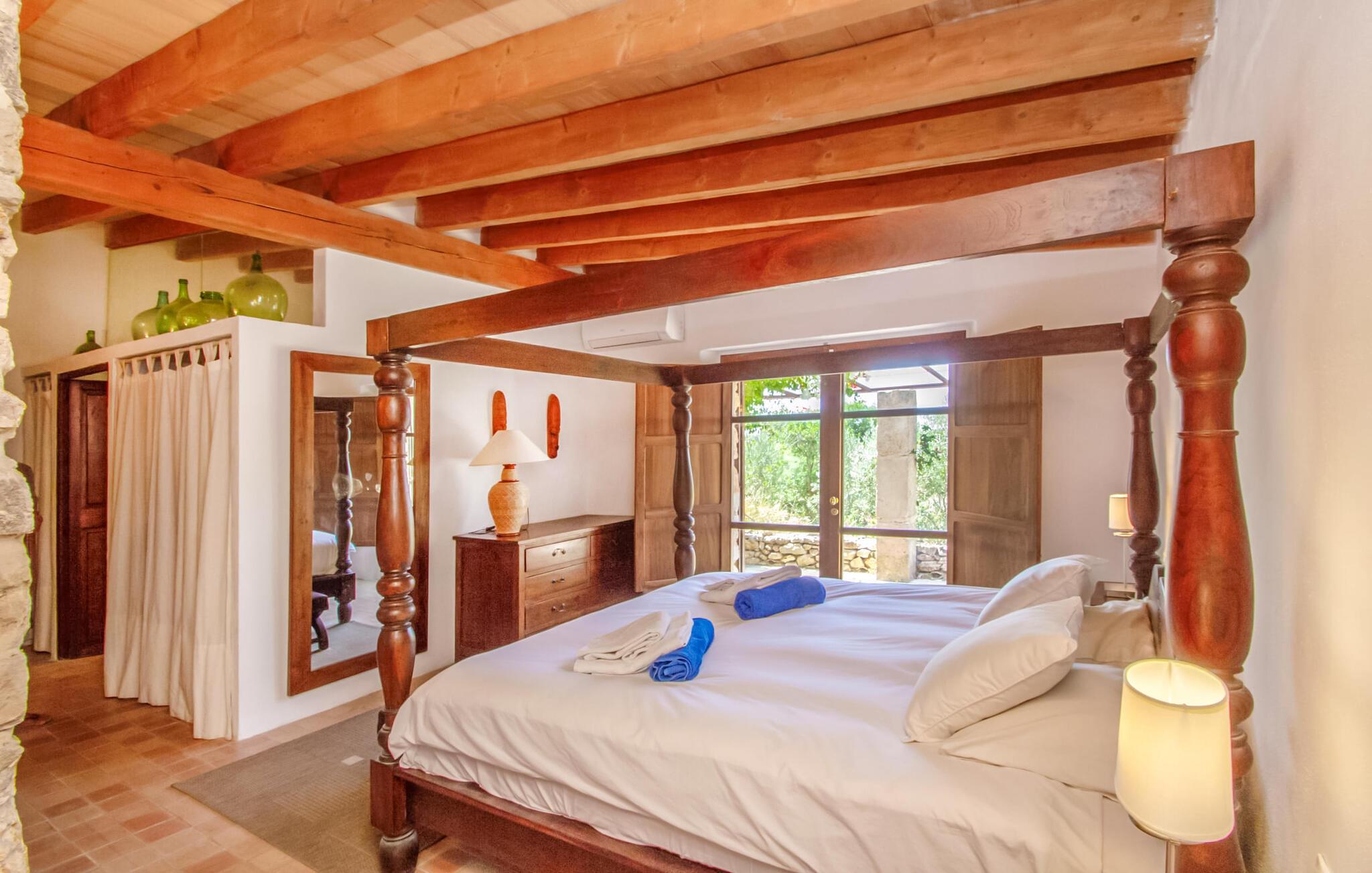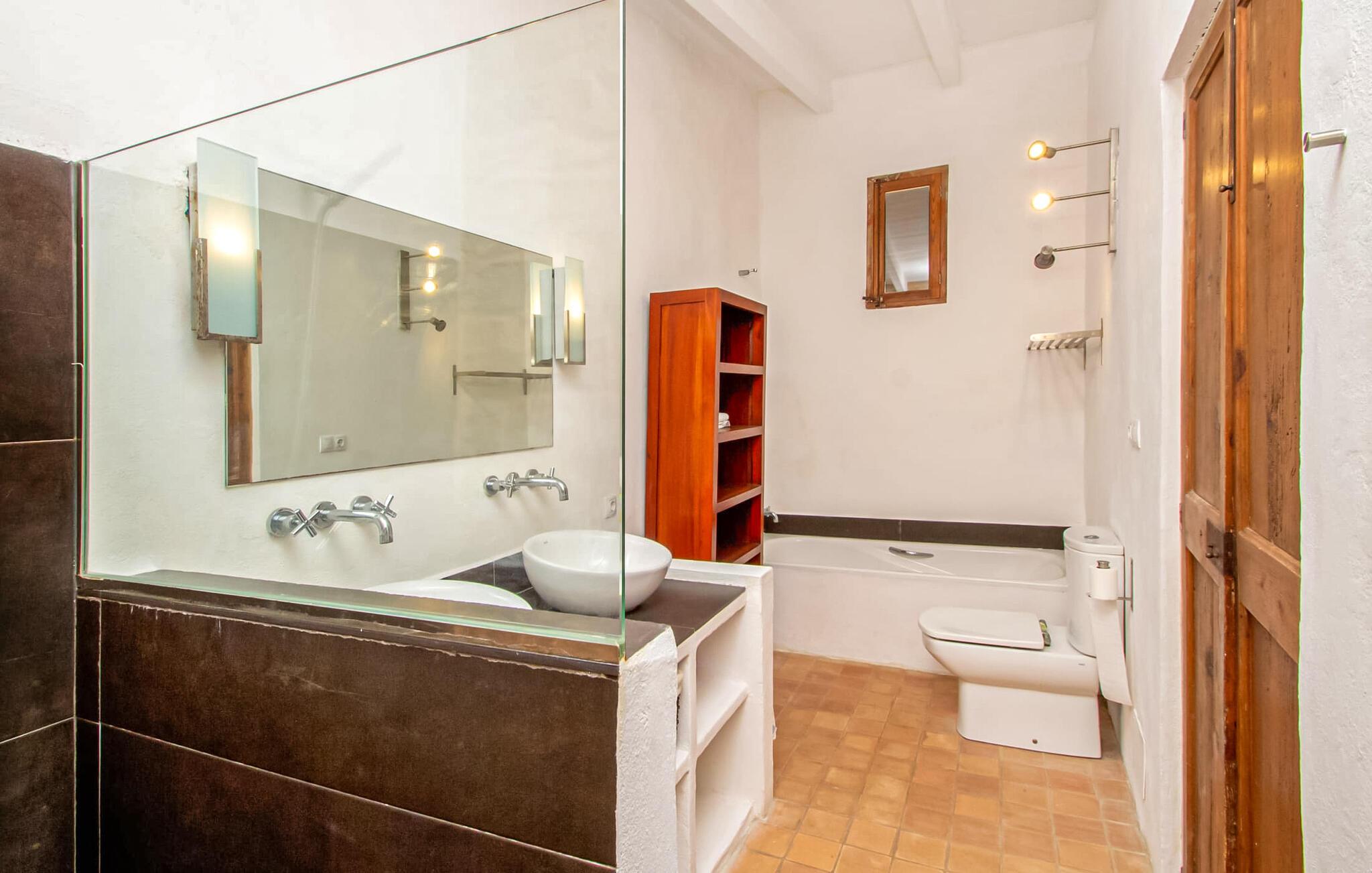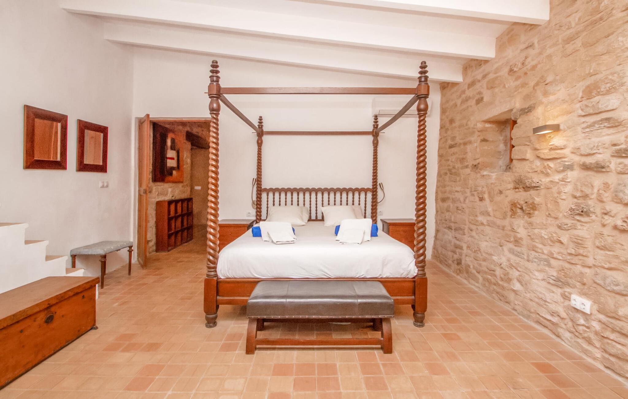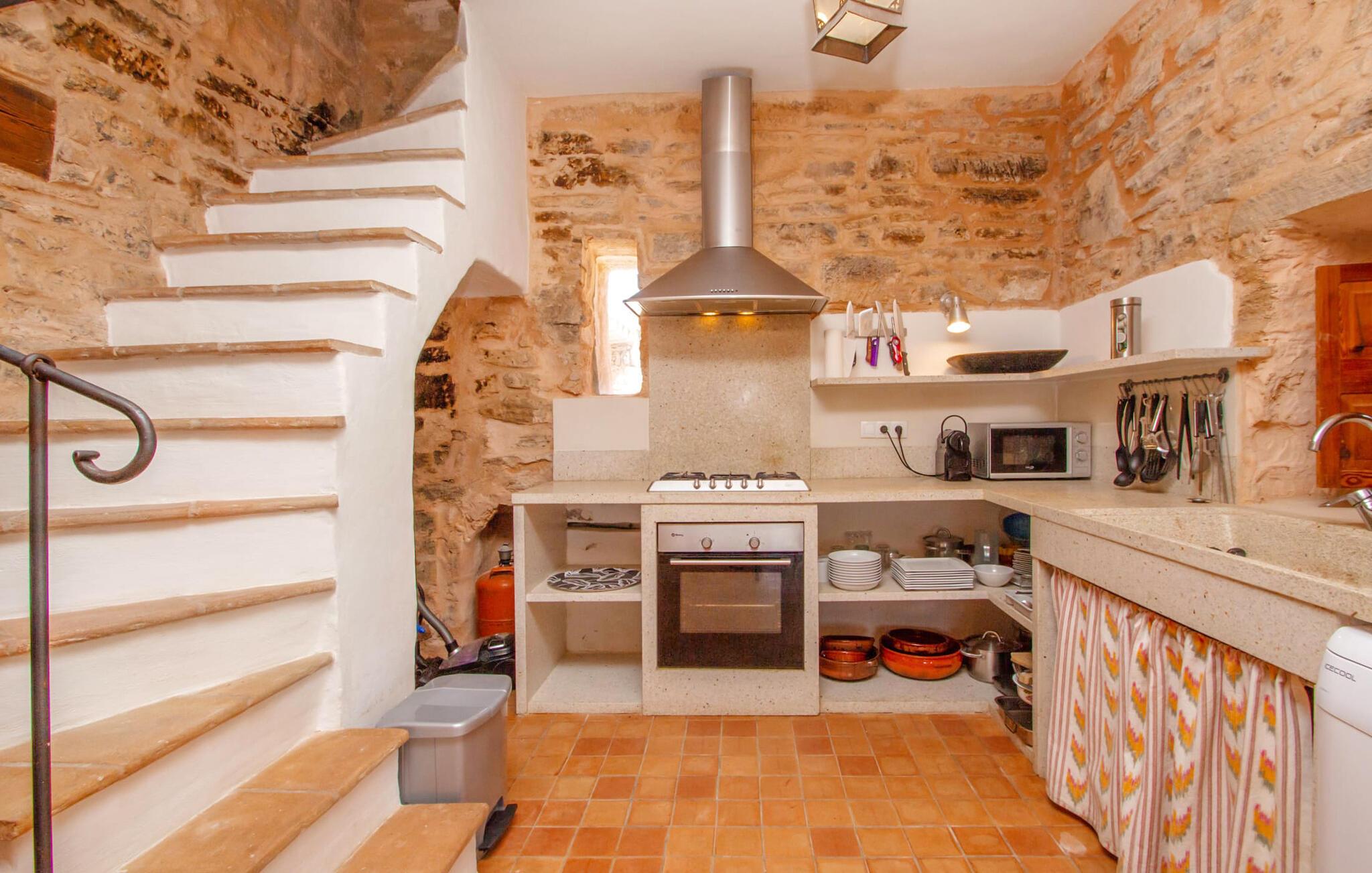De gamle steinmurene med det gamle mølletårnet er hjemsted for et moderne interiørdesign som har en imponerende herregårdskarakter som er i tråd med sjarmen i disse paradisiske omgivelsene. Samtidig imponerer interiøret med sin designstil av høy kvalitet og åpne planløsning. Bruken av naturlige materialer skaper en flott blanding av komfort og omhyggelig bevaring av verdsatte tradisjoner. Et romslig rom med panoramautsikt forbinder den koselige stuen med den tilstøtende spisestuen. To terrakottaflislagte trappetrinn fører til det tilstøtende åpne kjøkkenet med kjølig, minimalistisk design av mursteinskap med alle de vanlige tekniske bekvemmelighetene. Den inntagende naturligheten fortsetter i de fire soverommene med synlige steinvegger. Tre av dem ligger i første etasje, mens det fjerde ligger på et åpent plan over kjøkkenet i det gamle mølletårnet. Din personlige følelse av luksus avrundes av fire komplette bad med toppmoderne innredning, inkludert dusjkabinett eller badekar. Dermed er det ingenting som står i veien for at opptil ni personer kan slappe helt av på ferien. Es Moli des Trenc er det perfekte tilfluktsstedet for familier og venner som reiser sammen i nostalgiske omgivelser og med en helt fantastisk beliggenhet.