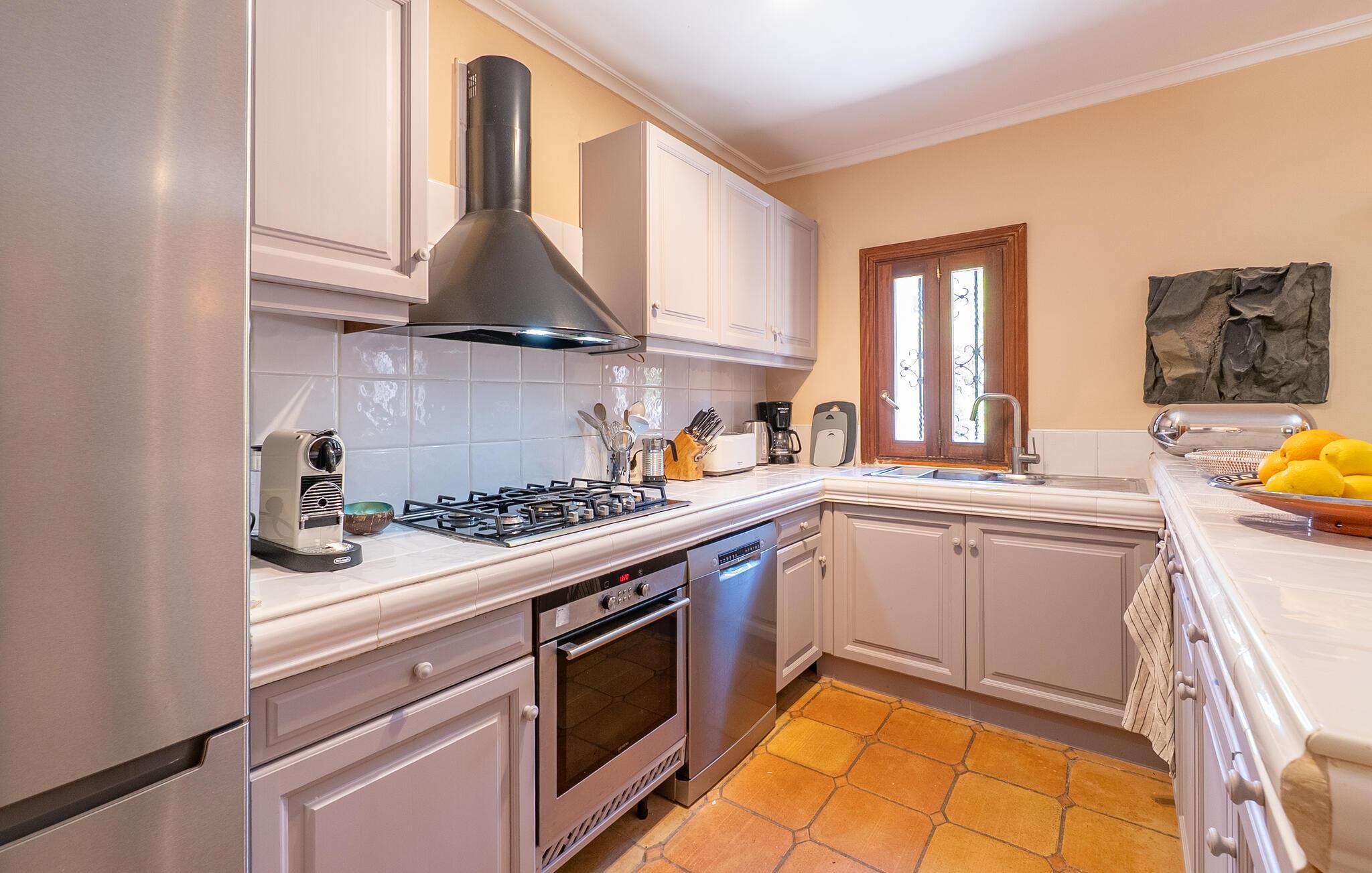 Motstykket til dette finner du i villaens lyse og vennlige interiør, der det er ytterligere tre koselige sittegrupper i rottingstil i første etasje, hvor du kan lese eller slappe av på kjøligere dager. En vakkert buet bue fører inn til det halvåpne kjøkkenet. Her er det komfyr, stekeovn, kjøleskap, oppvaskmaskin, brødrister, vannkoker og Nespresso-kaffemaskin for tilberedning av deilige måltider, noe som ikke etterlater noe å ønske for kresne villakokker. I første etasje er det også tre dobbeltrom med klimaanlegg (to av dem med eget bad), som er preget av samme fargevalg og utsøkte møbler som stue-/spiseområdet. I et ekstra bad inviterer et grasiøst, frittstående badekar deg til å ta et beroligende bad med levende lys om kvelden. I øverste etasje, som nås via en utvendig trapp, er det ytterligere et soverom med dobbeltseng og eget bad. Terrassen her oppe byr på panoramautsikt over det vakre landskapet.