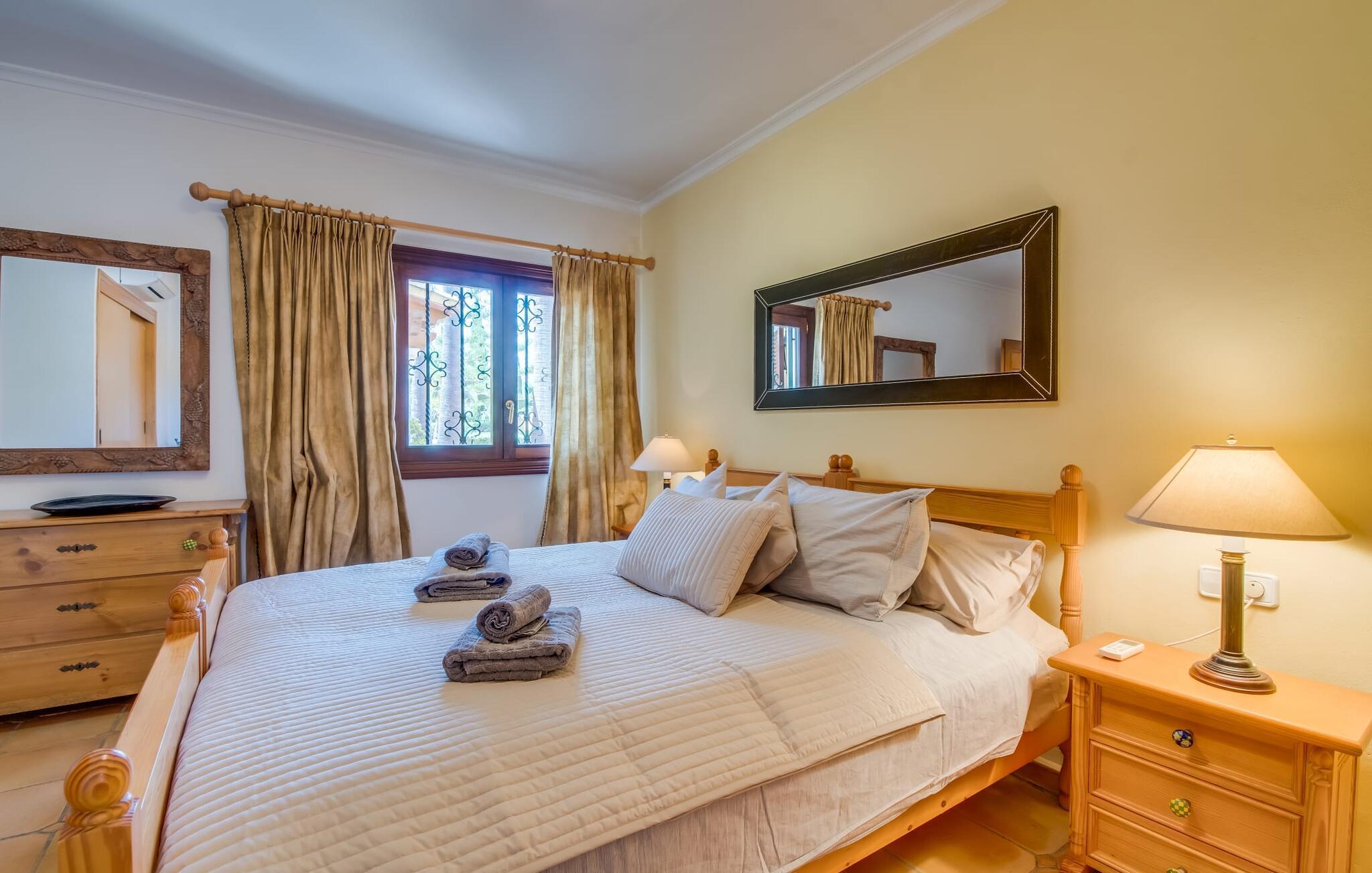 Dette feriehuset ligger i den sørligste delen av øya, Migjorn, og er et ideelt utgangspunkt for en rekke utflukter og oppdagelsesreiser på øya. Veien MA-4013, som ikke ligger langt unna, forbinder nærliggende Calonge (1,7 km) med kystbyen Cala d'Or (3,1 km). Du kan gjøre dine daglige innkjøp i begge byene. I Calonge er det et tradisjonelt lite ukemarked på torsdager, der du kan handle inn fersk frukt og grønnsaker. Cala d'Or tiltrekker seg også besøkende til villaen med sin elegante marina, livlige natteliv, mange gode restauranter og elegante barer. En kort kjøretur langs sørøstkysten fører deg til en rekke små, men vakre sandbukter med turkisfarget vann. Selv i høysesongen er det som regel mulig å finne et mer tilbaketrukket sted her. Buktene i naturreservatet Mondragó er spesielt imponerende. Den kilometerlange, drømmeaktige Es Trenc-stranden ligger også bare en halvtime unna. Leter du etter den vakreste villa- og strandferien? Da er Villa Es Rafal Calonge det rette stedet for deg! Villa Es Rafal Calonge, bygget i hvit Ibiza-stil, ligger vakkert til på landsbygda mellom landsbyen Calonge og kystbyen Cala d'Or på sørøstkysten av Mallorca. Villaen er av høy kvalitet og er omgitt av en vakker palmehage. Du kan gå på shopping i Calonge eller Cala d'Or i nærheten. Flere vakre bukter på sørøstkysten kan nås raskt med bil i løpet av et kvarter.
