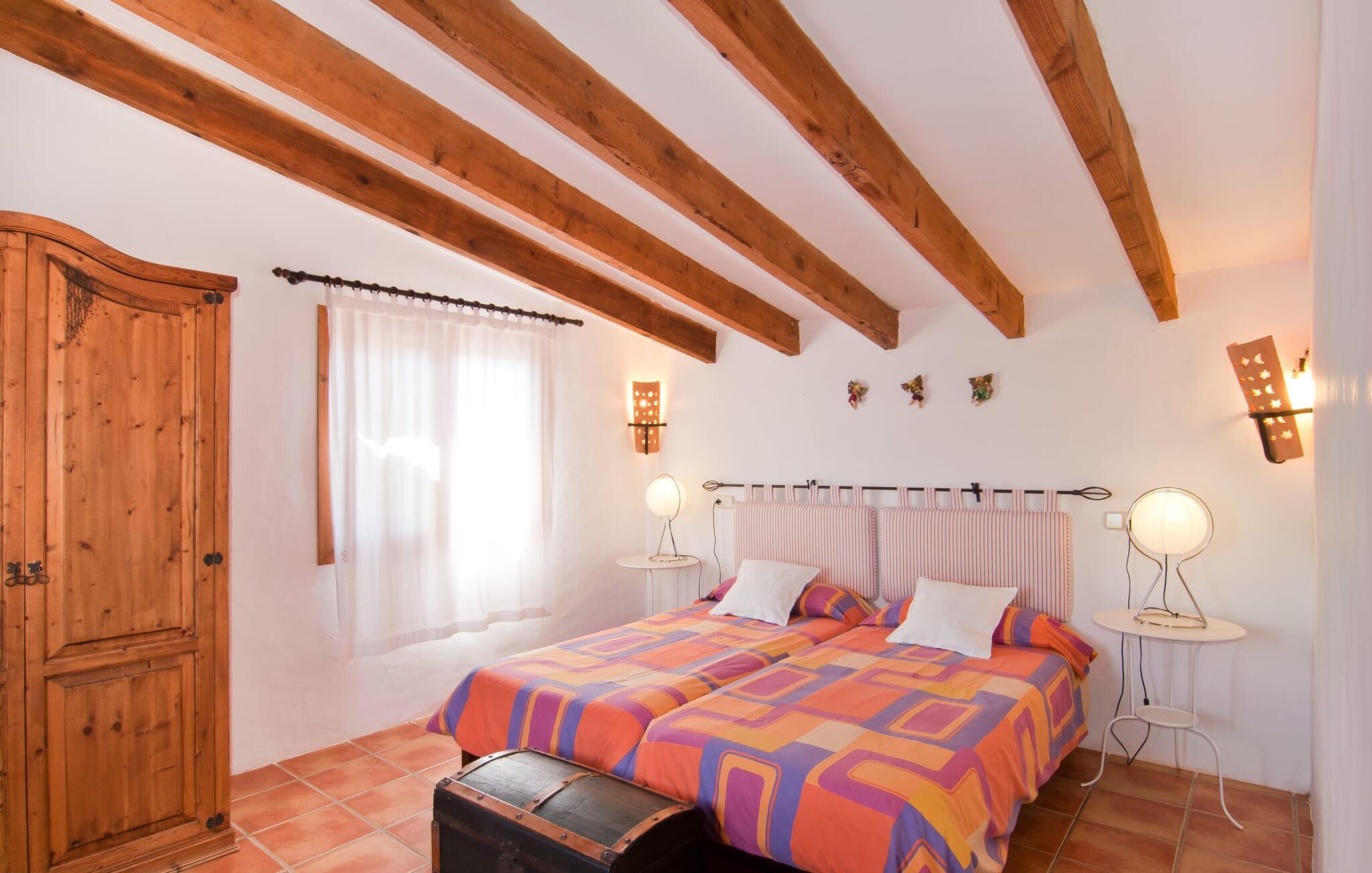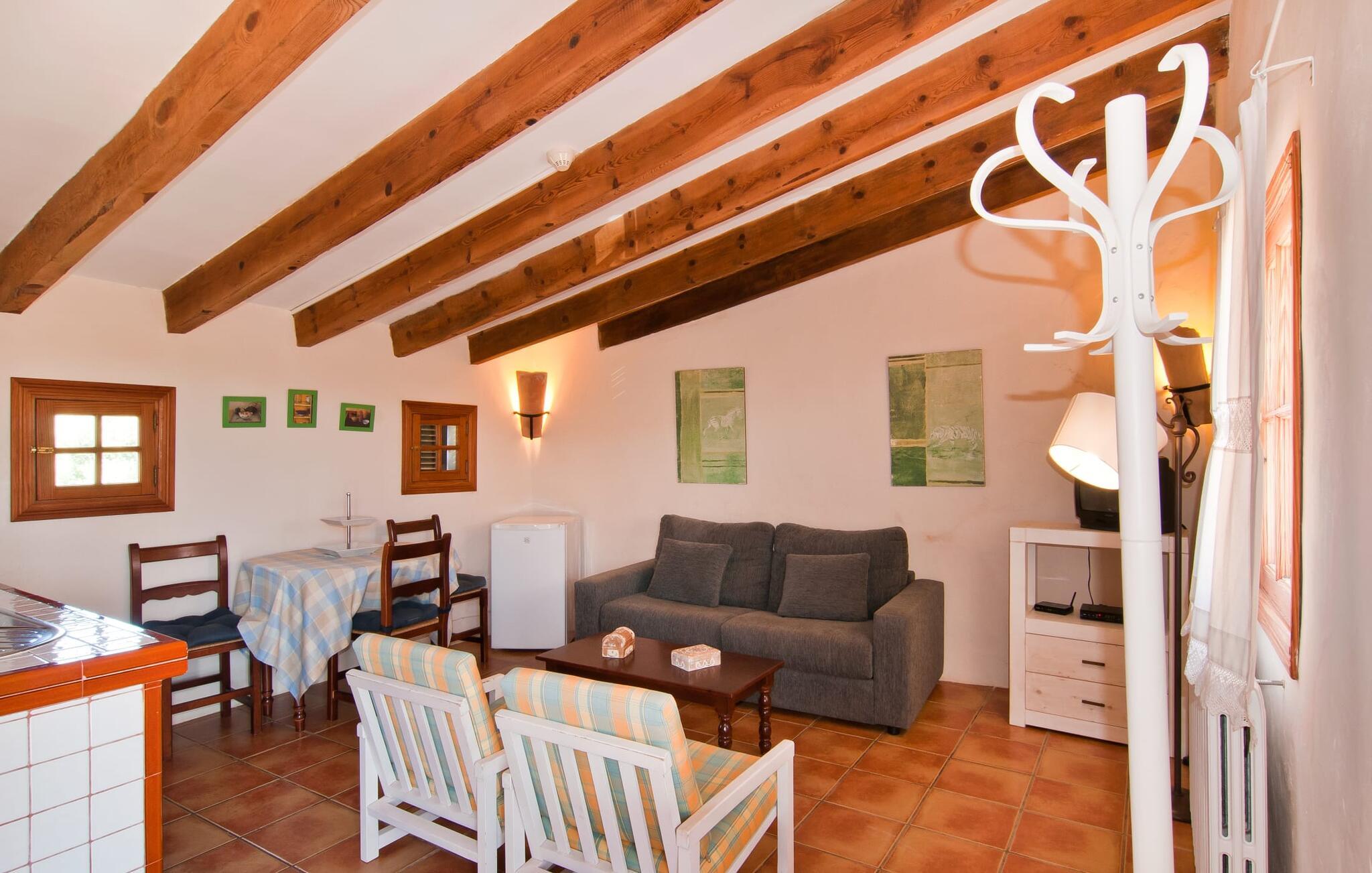 Hver enhet har sin egen unike sjarm. Den nesten 40 m² store Es Graner-leiligheten, der funksjonalitet og fargerik komfort er i høysetet, ligger i øverste etasje og har en romslig takterrasse med en sensasjonelt vakker utsikt som du har helt for deg selv. En gang i tiden ble det lagret korn her oppe, derav navnet Graner. Stuen med de typiske mallorcinske trebjelkene i taket og natursteinselementene er det perfekte stedet å slappe av etter timer tilbrakt utendørs i solen. Og i den integrerte kjøkkenkroken kan du enkelt tilberede en velsmakende matbit på gasskomfyren med to bluss. På soverommet står to enkeltsenger ved siden av hverandre og innbyr til en god natts søvn, og det er også plass til en barneseng hvis det skulle være behov for det. Badet, som også er innredet i mallorcinsk stil, har naturlig lys og dusjnisje. Og hvis du ikke er fornøyd med boarealet i ditt private hjem, kan du gjøre hele eiendommen om til et blomstrende utendørs oppholds-, spise- og lekerom.