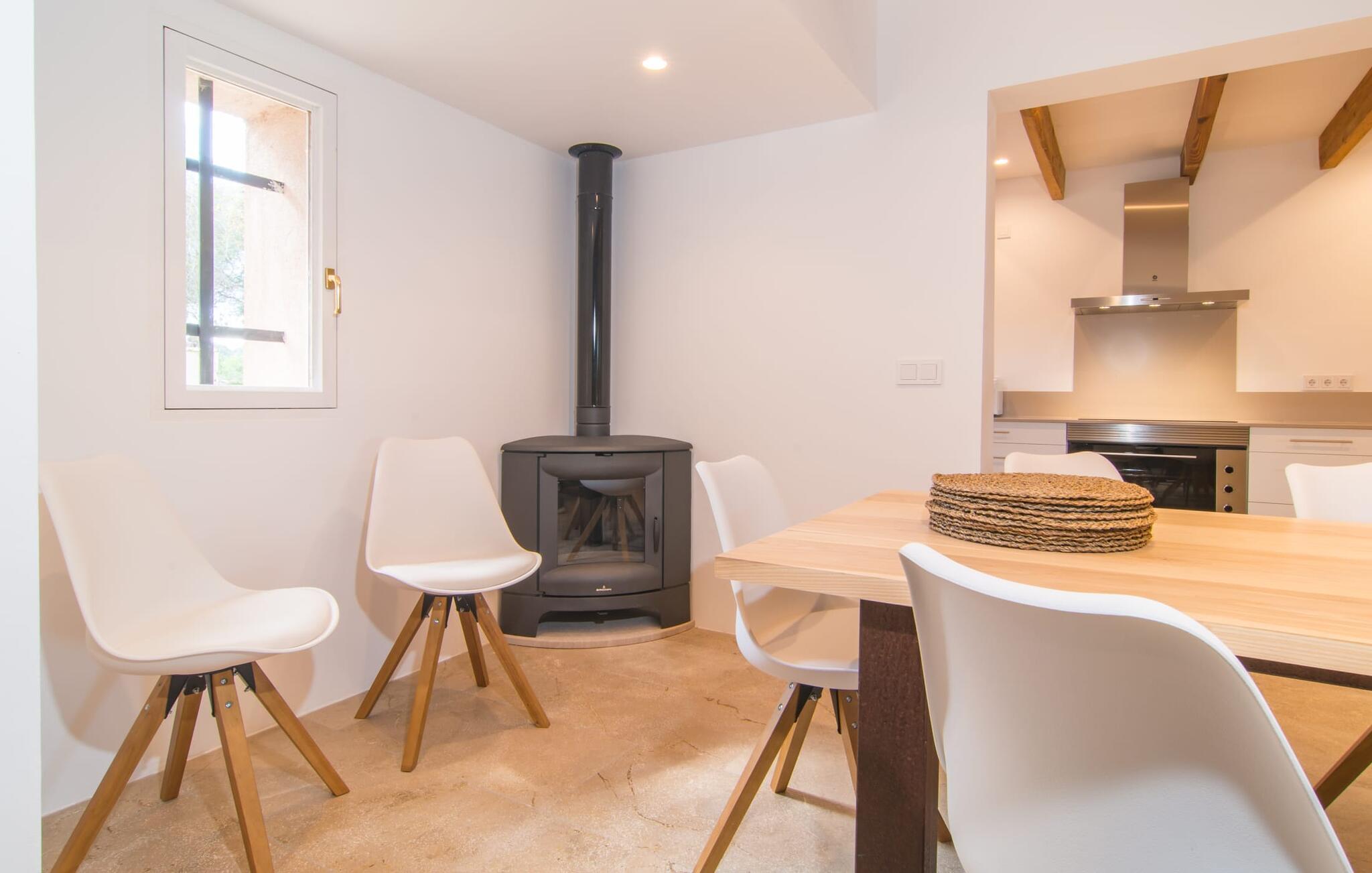 Inne i det toetasjes huset møtes du av en stor åpen stue med rustikke bjelker og munter mallorkinsk innredning som skaper en varm og innbydende atmosfære. Kjøkkenet i tradisjonell stil er fullt utstyrt for felles matlaging og har alle de viktigste hvitevarene. I andre etasje er det tre soverom med direkte utgang til en takterrasse, mens det i første etasje er to romantiske soverom med eget bad. Hvert av de fire badene har dusj og toalett. Tykke steinvegger holder villaen kjølig om sommeren, og med sentralvarme og peis er den et perfekt tilfluktssted året rundt. Denne unike eiendommen lover en uforglemmelig ferieopplevelse.