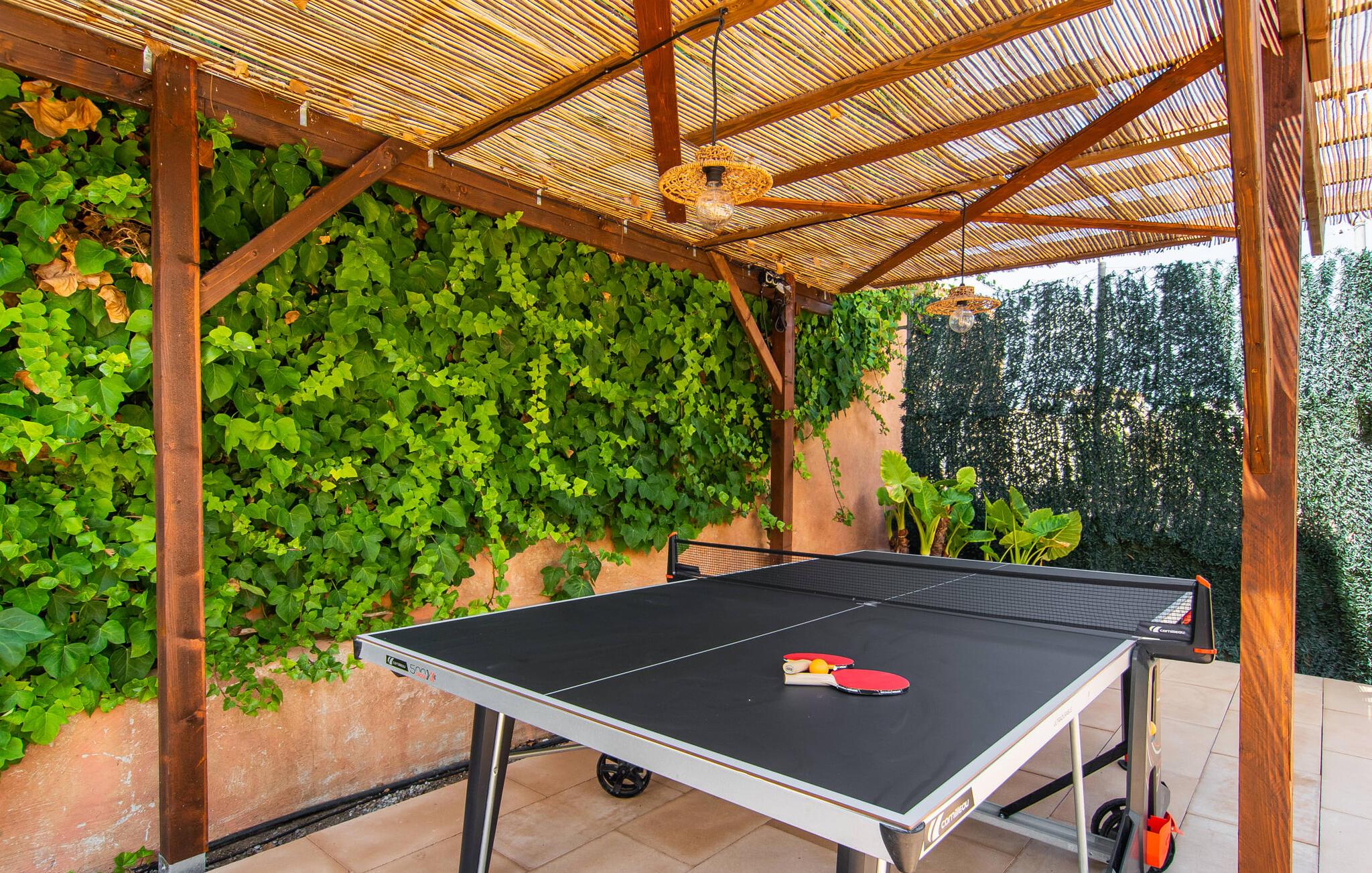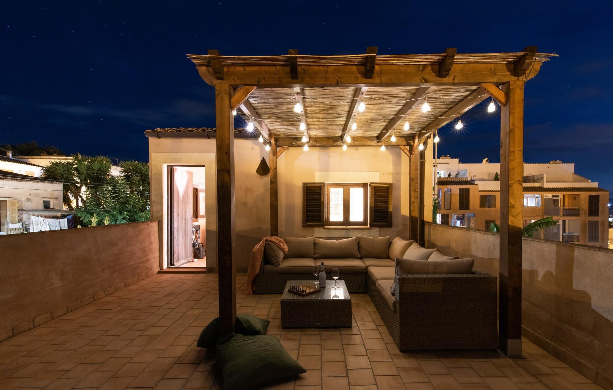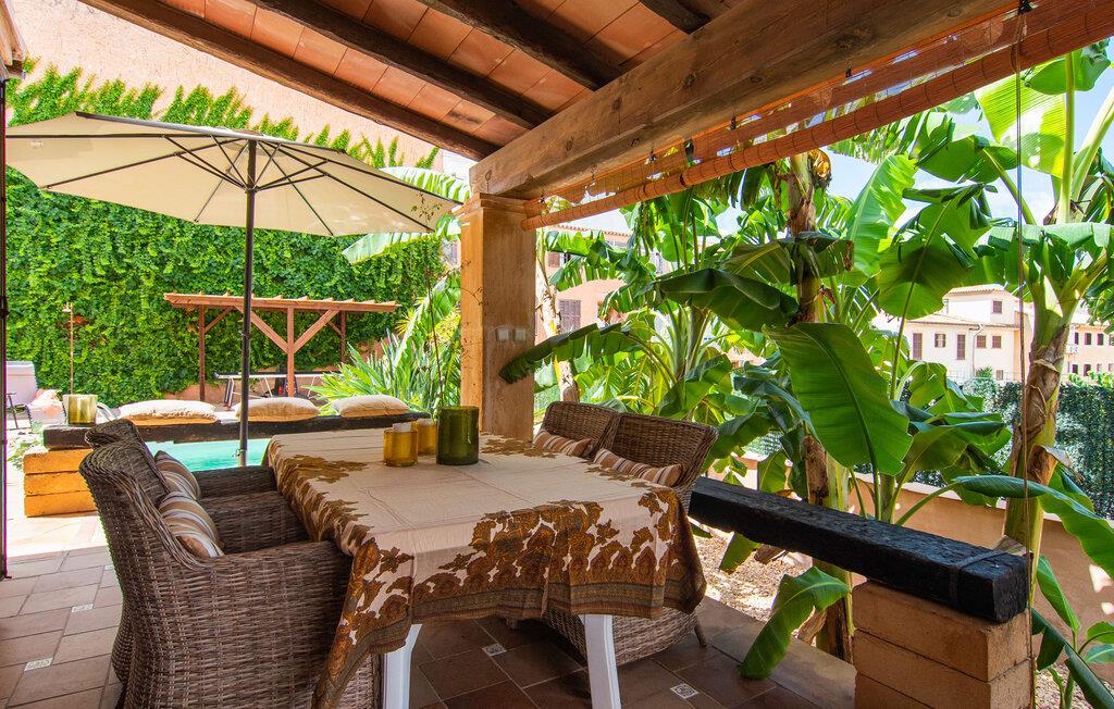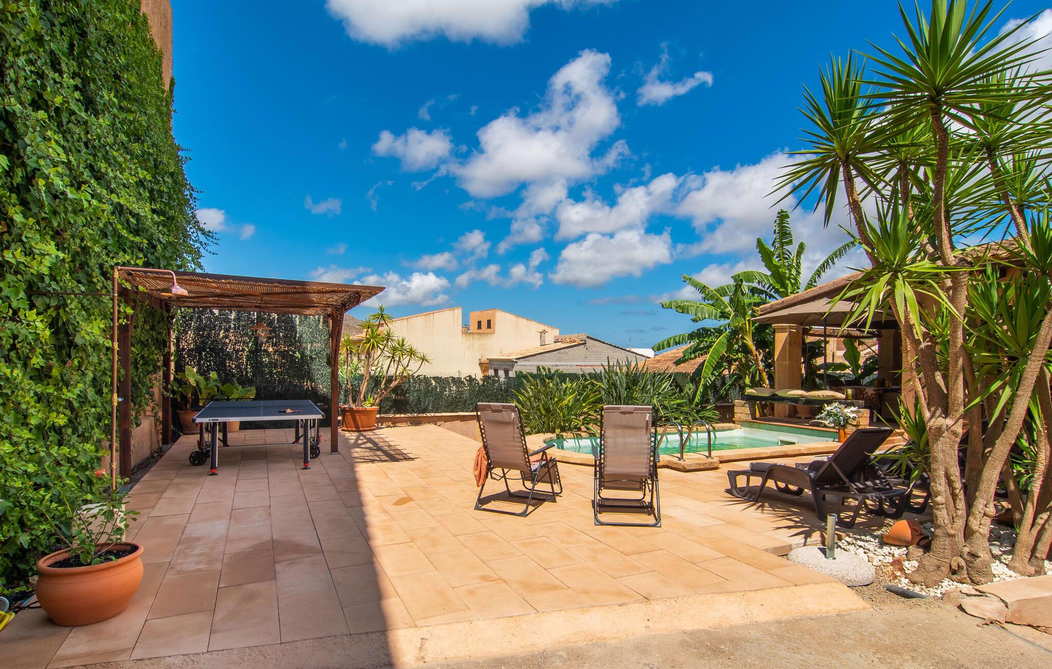 Tenk hva man kan finne gjemt på uteplasser! Veggen til nabohuset er overgrodd av klatreplanter, noe som gjør at hagen føles som en juvel som er beskyttet fra alle kanter når du sitter på den gamle trebjelken over det koselige bassenget. De som ønsker å perfeksjonere sine krabbeferdigheter på ferien, har det kanskje bedre på nærmeste strand, men de som bare setter pris på følelsen av avslapping som et basseng gir, vil tilbringe mange lykksalige timer i denne gårdsplassen som er brolagt med naturlig grus og fliser i den tradisjonelt vakre mallorkinske fargen. Hvis du ønsker å være aktiv, vil bordtennisbordet i skyggen av en pergola komme godt med. Du kan selv velge hvor du vil nyte solen på øya: enten direkte ved bassenget eller ved siden av huset. Med grillen kan du skape et kulinarisk høydepunkt, slik at ikke bare hud og sjel, men også ganen blir skjemt bort på ferien. En overbygd terrasse innbyr til å slappe av i skyggen. Når mørket faller på, tennes utendørsbelysningen som ved et trylleslag, og hagen får umiddelbart en annen form. Benytt anledningen til å oppleve den mens du morer deg med et parti sjakk eller et rimelig utfordrende puslespill.
