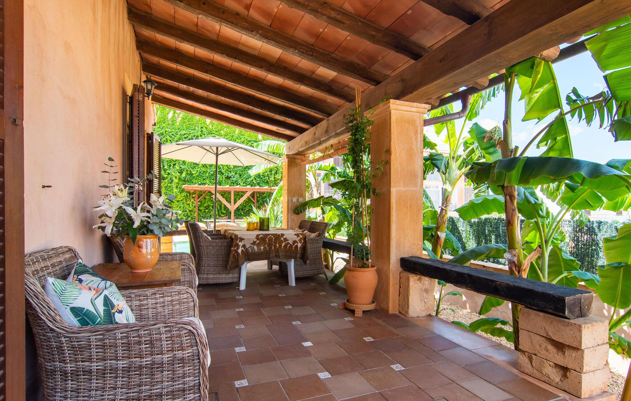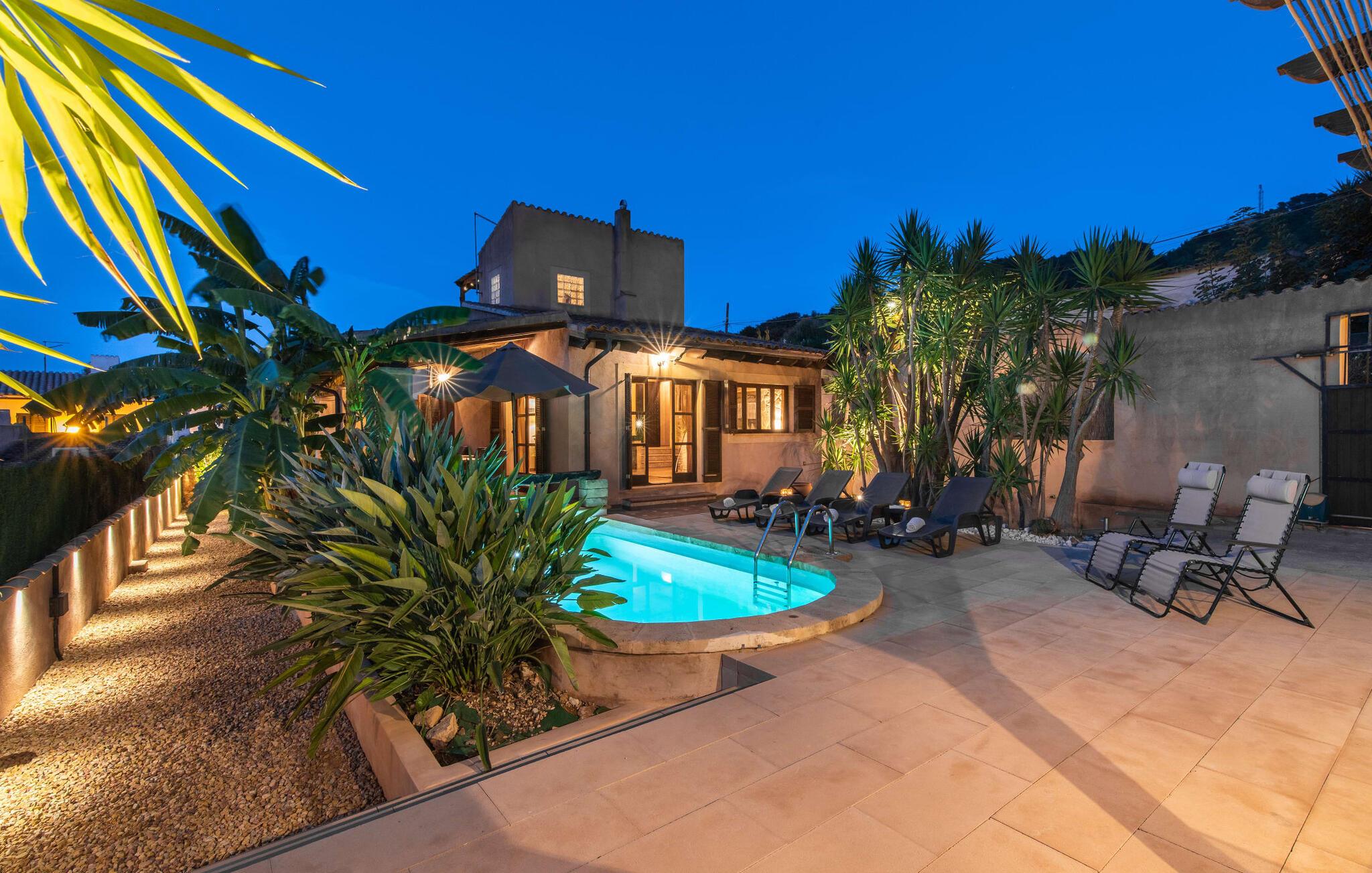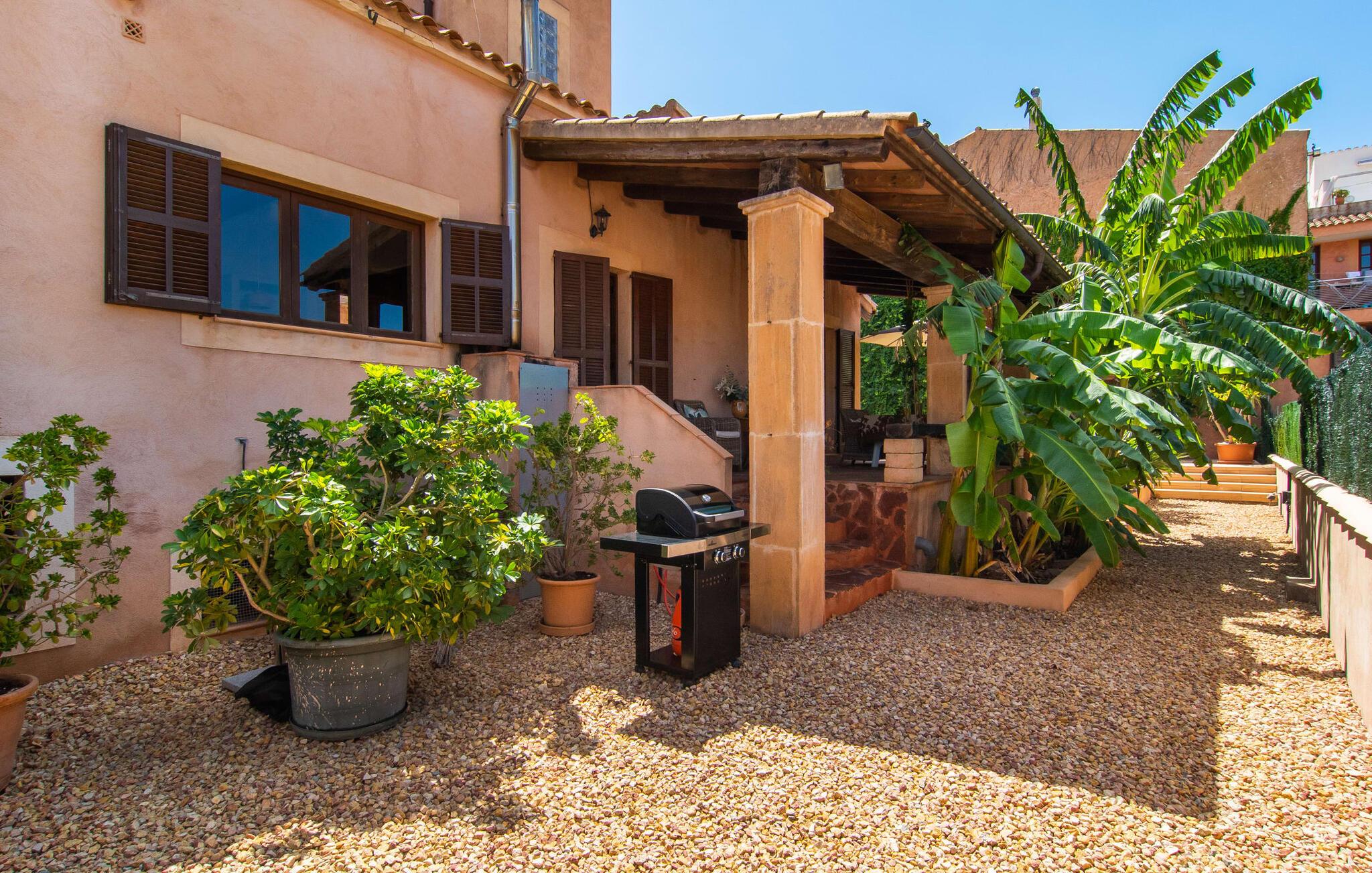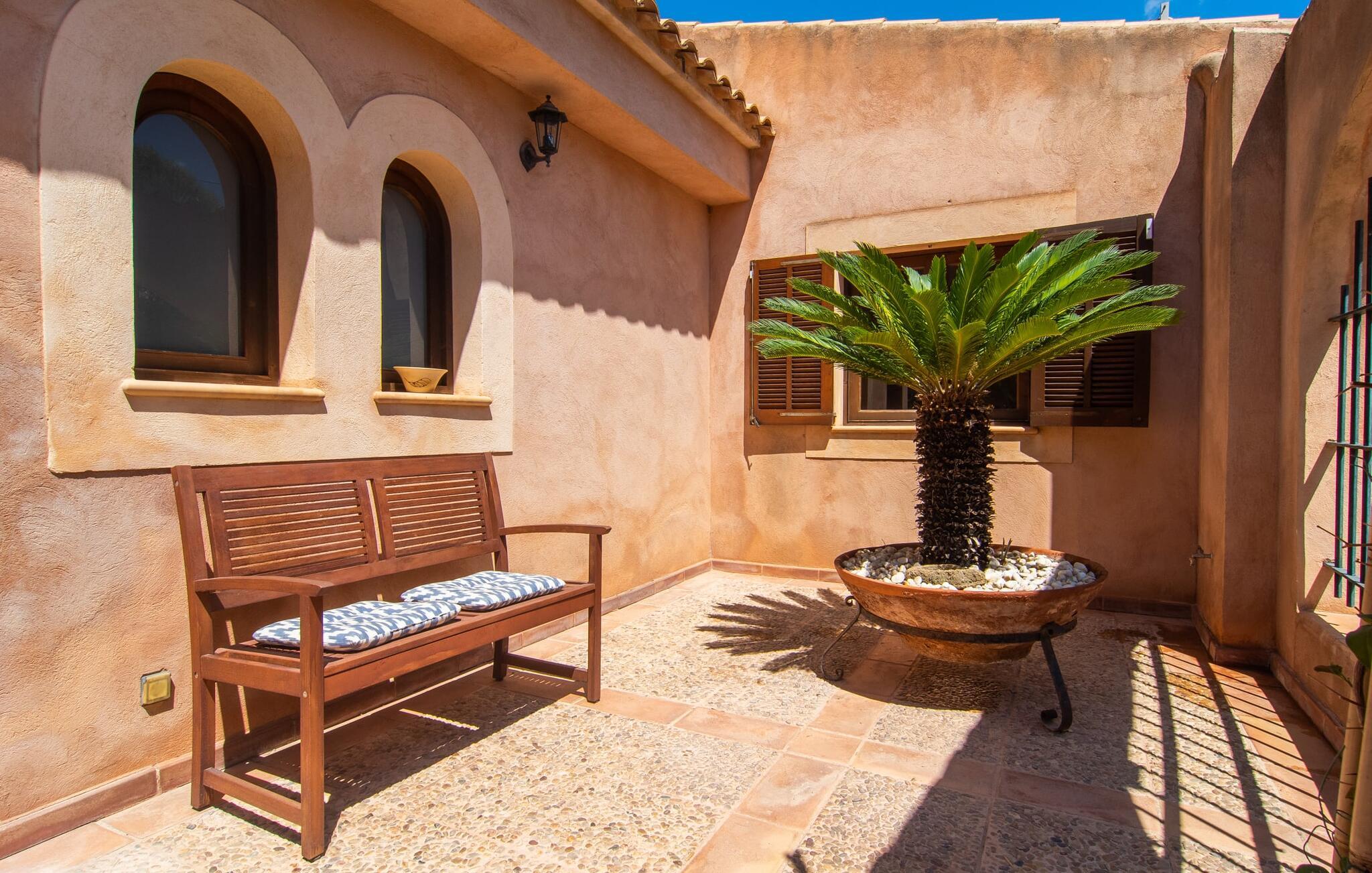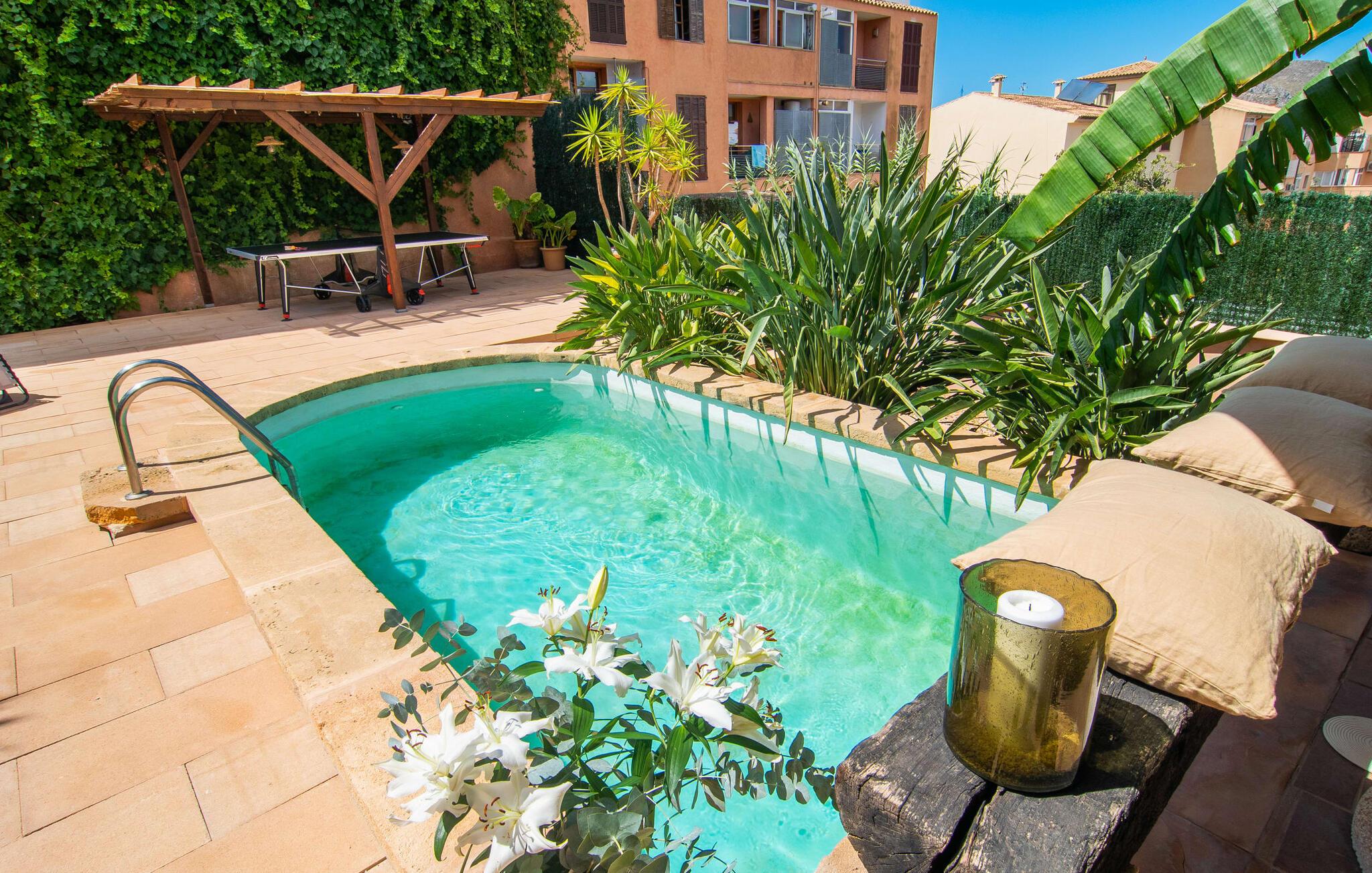 Tenk hva man kan finne gjemt på uteplasser! Veggen til nabohuset er overgrodd av klatreplanter, noe som gjør at hagen føles som en juvel som er beskyttet fra alle kanter når du sitter på den gamle trebjelken over det koselige bassenget. De som ønsker å perfeksjonere sine krabbeferdigheter på ferien, har det kanskje bedre på nærmeste strand, men de som bare setter pris på følelsen av avslapping som et basseng gir, vil tilbringe mange lykksalige timer i denne gårdsplassen som er brolagt med naturlig grus og fliser i den tradisjonelt vakre mallorkinske fargen. Hvis du ønsker å være aktiv, vil bordtennisbordet i skyggen av en pergola komme godt med. Du kan selv velge hvor du vil nyte solen på øya: enten direkte ved bassenget eller ved siden av huset. Med grillen kan du skape et kulinarisk høydepunkt, slik at ikke bare hud og sjel, men også ganen blir skjemt bort på ferien. En overbygd terrasse innbyr til å slappe av i skyggen. Når mørket faller på, tennes utendørsbelysningen som ved et trylleslag, og hagen får umiddelbart en annen form. Benytt anledningen til å oppleve den mens du morer deg med et parti sjakk eller et rimelig utfordrende puslespill.