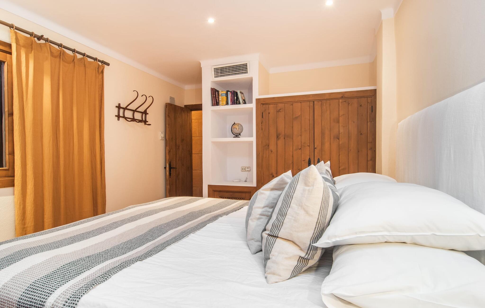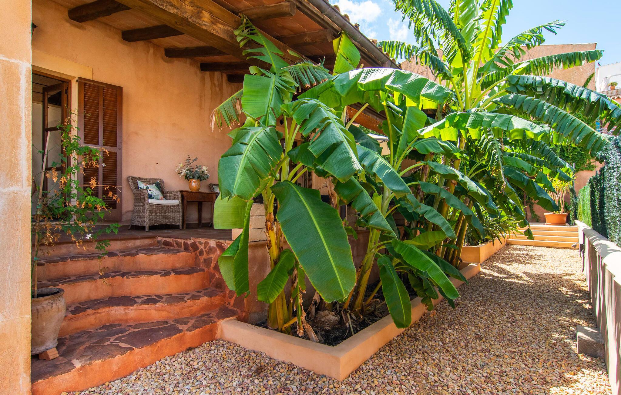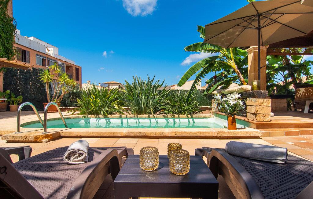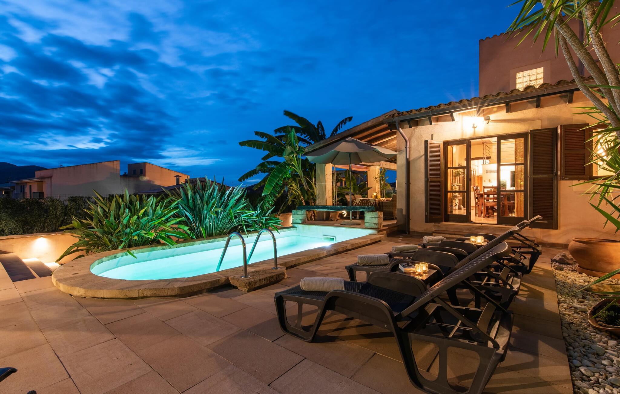 Tenk hva man kan finne gjemt på uteplasser! Veggen til nabohuset er overgrodd av klatreplanter, noe som gjør at hagen føles som en juvel som er beskyttet fra alle kanter når du sitter på den gamle trebjelken over det koselige bassenget. De som ønsker å perfeksjonere sine krabbeferdigheter på ferien, har det kanskje bedre på nærmeste strand, men de som bare setter pris på følelsen av avslapping som et basseng gir, vil tilbringe mange lykksalige timer i denne gårdsplassen som er brolagt med naturlig grus og fliser i den tradisjonelt vakre mallorkinske fargen. Hvis du ønsker å være aktiv, vil bordtennisbordet i skyggen av en pergola komme godt med. Du kan selv velge hvor du vil nyte solen på øya: enten direkte ved bassenget eller ved siden av huset. Med grillen kan du skape et kulinarisk høydepunkt, slik at ikke bare hud og sjel, men også ganen blir skjemt bort på ferien. En overbygd terrasse innbyr til å slappe av i skyggen. Når mørket faller på, tennes utendørsbelysningen som ved et trylleslag, og hagen får umiddelbart en annen form. Benytt anledningen til å oppleve den mens du morer deg med et parti sjakk eller et rimelig utfordrende puslespill.