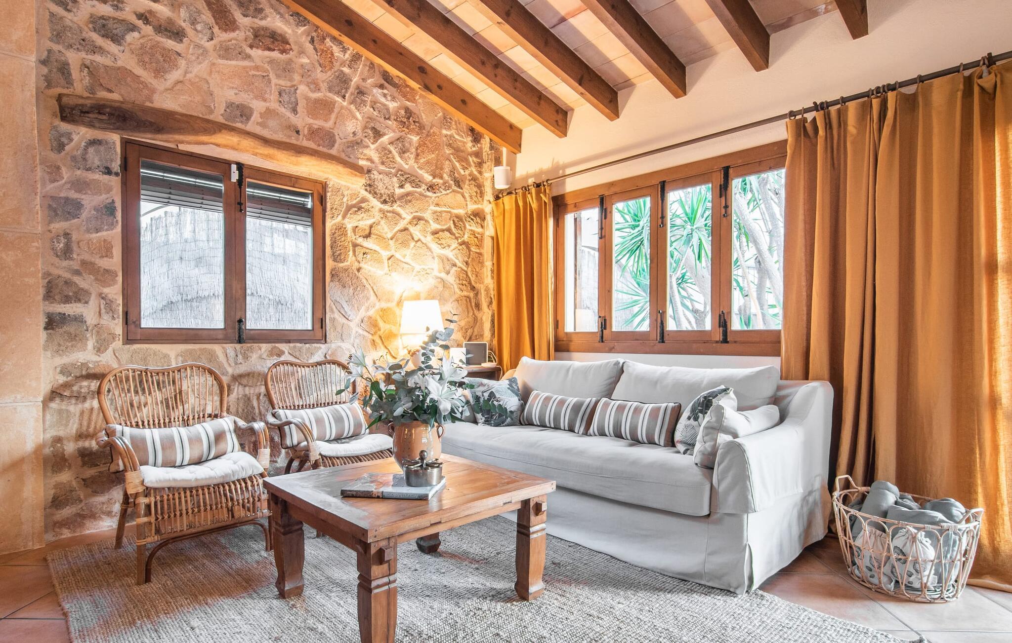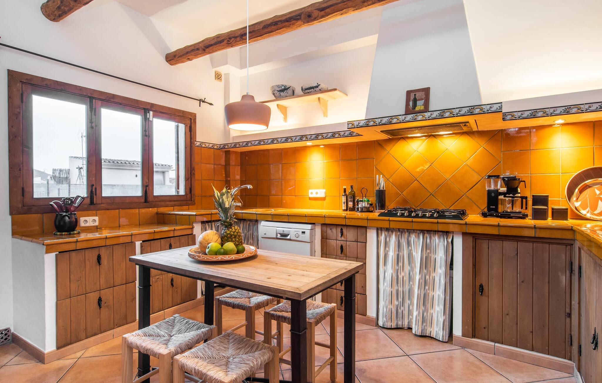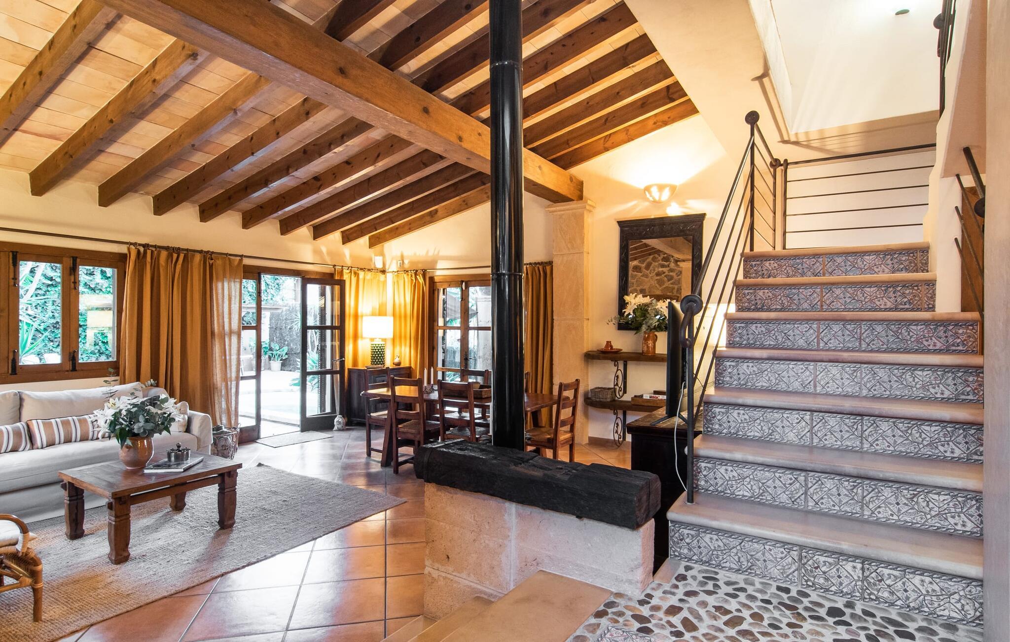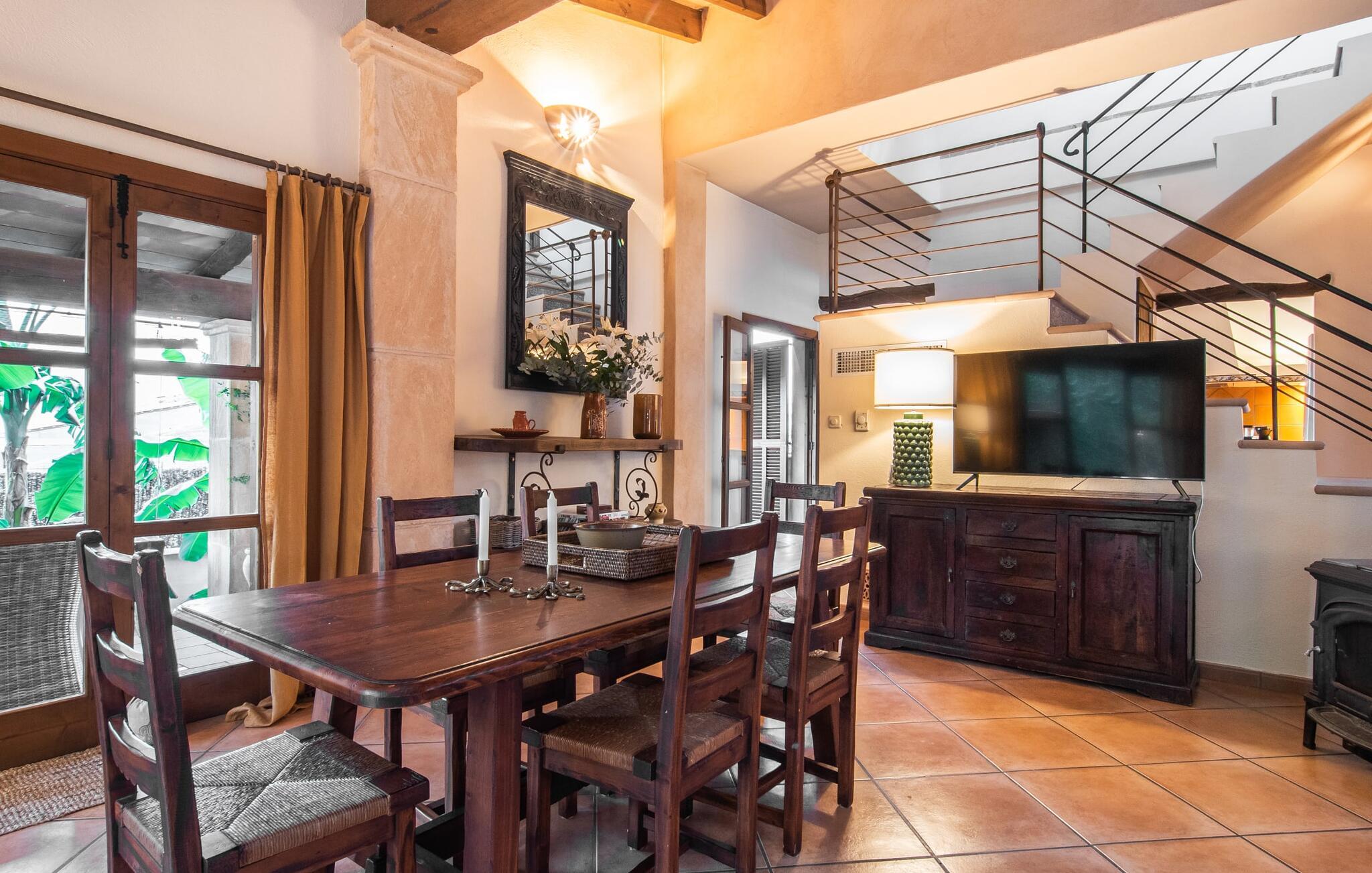 Med stor sans for detaljer har eieren også lykkes med å skape et unikt uttrykk i interiøret. Små, omsorgsfullt arrangerte detaljer understreker det spesielle ved spisestuen, som har et spisebord og teknisk sett er en del av uteområdet når terrassedøren er helt åpen, slik at luften fra øya kan strømme inn. De antikke møblene i elegante, mørke tretoner kombinert med et nøkternt utvalg av pyntegjenstander skaper en koselig atmosfære, som avrundes av den milde knitringen fra peisen. En av veggene i stuen er preget av typisk mallorkinsk arkitektur med naturstein og trebjelker, som også går igjen i taket. Kjøkkenet ligger også i første etasje og er fullt utstyrt med fargerike, gule fliser. I midten av kjøkkenet står det et trebord som gir god plass til å tilberede store måltider. Tilgang til de to soverommene og begge badene er via den dekorative gangen med steinmosaikkgulv. Ett av soverommene har en dobbeltseng, det andre har to enkeltsenger. Ett av badene har også badekar og gir derfor mulighet for et koselig bad med levende lys. En trapp fører opp fra stuen til et vaskerom og en idyllisk takterrasse, som er delvis dekket av en pergola som automatisk blir opplyst i skumringen. En loungegruppe inviterer deg til å nyte, men denne gangen med en bonusutsikt over havet av røde tak og slottet.