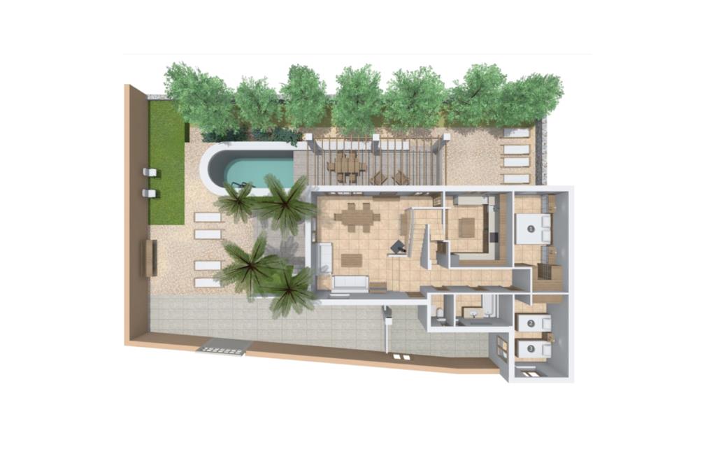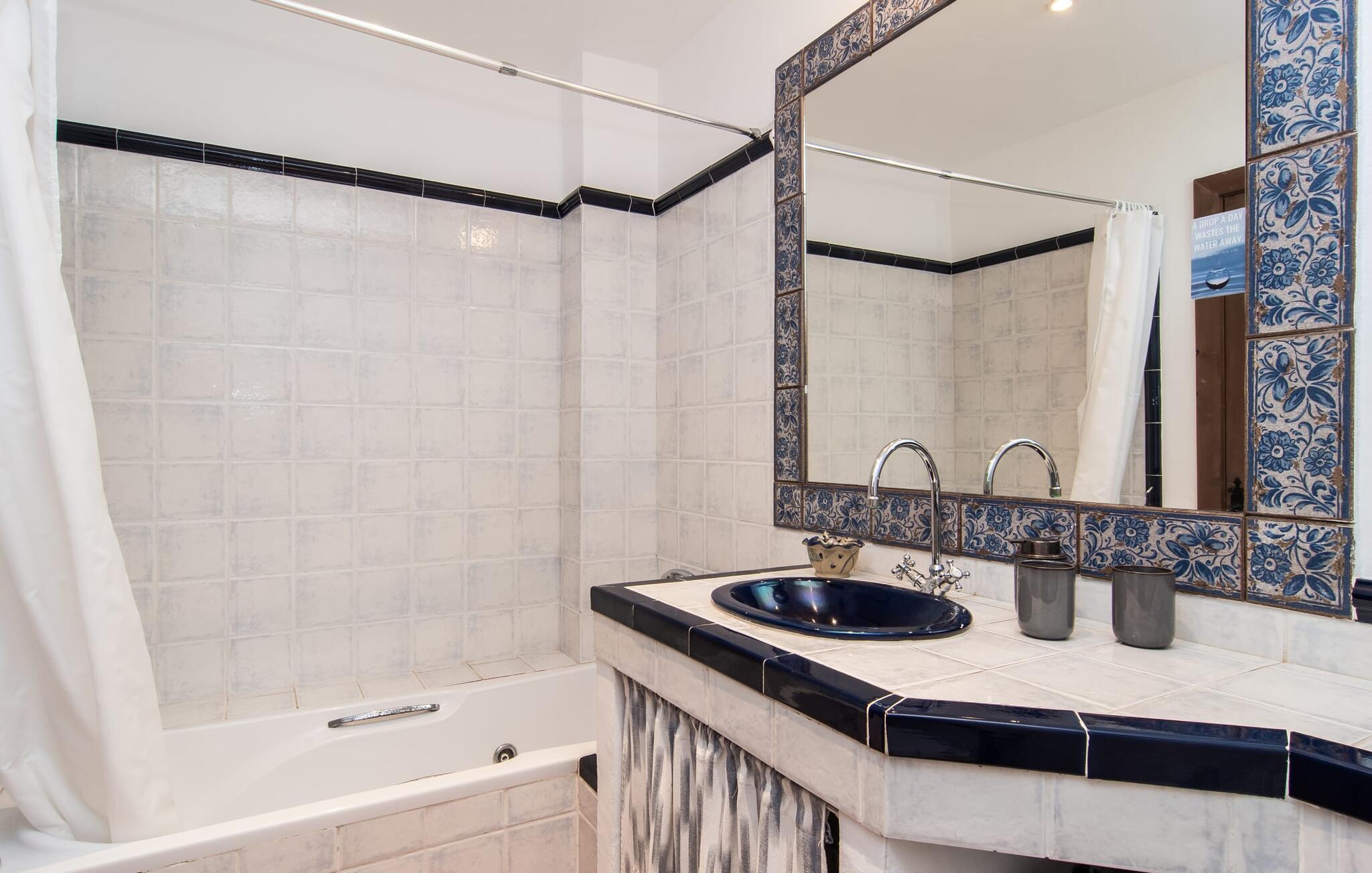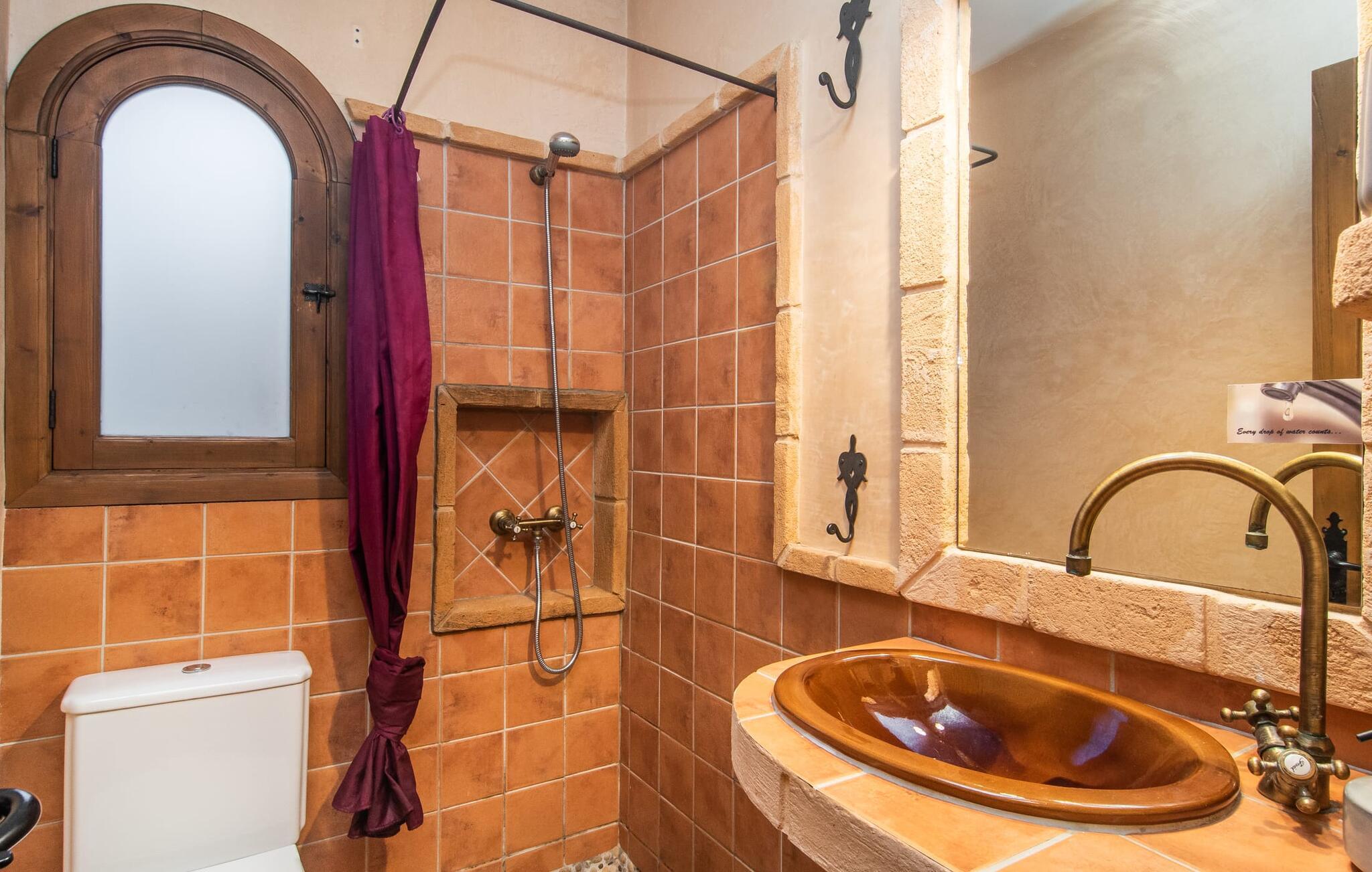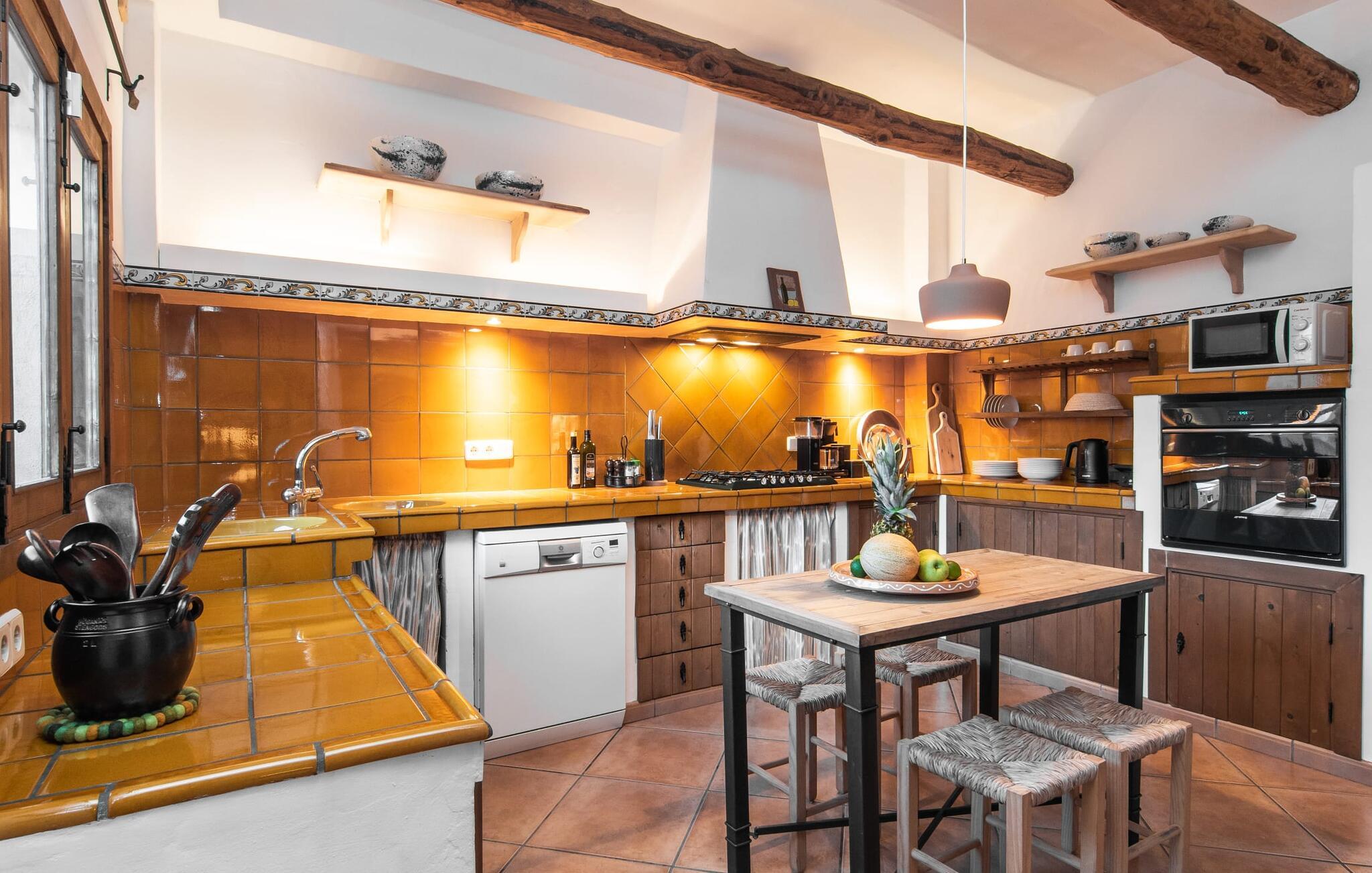 Med stor sans for detaljer har eieren også lykkes med å skape et unikt uttrykk i interiøret. Små, omsorgsfullt arrangerte detaljer understreker det spesielle ved spisestuen, som har et spisebord og teknisk sett er en del av uteområdet når terrassedøren er helt åpen, slik at luften fra øya kan strømme inn. De antikke møblene i elegante, mørke tretoner kombinert med et nøkternt utvalg av pyntegjenstander skaper en koselig atmosfære, som avrundes av den milde knitringen fra peisen. En av veggene i stuen er preget av typisk mallorkinsk arkitektur med naturstein og trebjelker, som også går igjen i taket. Kjøkkenet ligger også i første etasje og er fullt utstyrt med fargerike, gule fliser. I midten av kjøkkenet står det et trebord som gir god plass til å tilberede store måltider. Tilgang til de to soverommene og begge badene er via den dekorative gangen med steinmosaikkgulv. Ett av soverommene har en dobbeltseng, det andre har to enkeltsenger. Ett av badene har også badekar og gir derfor mulighet for et koselig bad med levende lys. En trapp fører opp fra stuen til et vaskerom og en idyllisk takterrasse, som er delvis dekket av en pergola som automatisk blir opplyst i skumringen. En loungegruppe inviterer deg til å nyte, men denne gangen med en bonusutsikt over havet av røde tak og slottet.