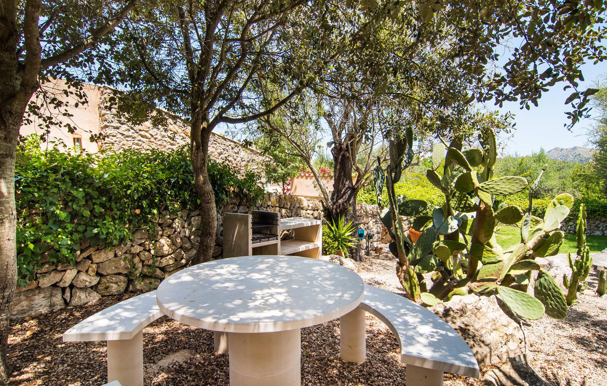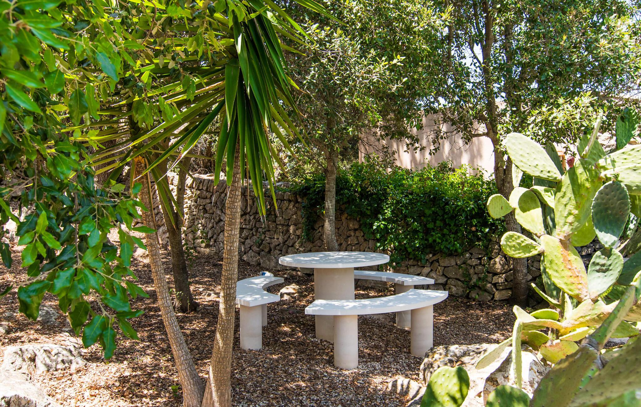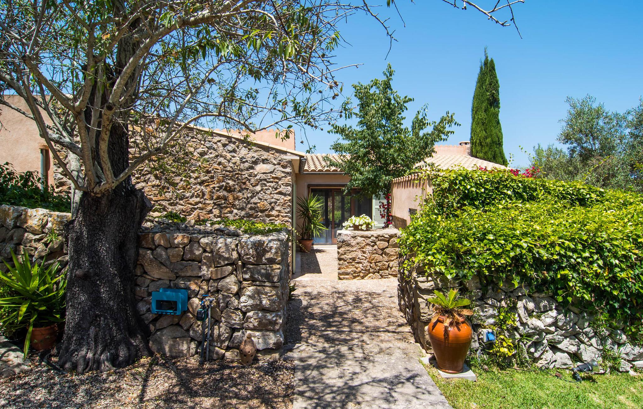 Noen uforglemmelige dager for å lade batteriene, nyte et spesielt bomiljø og samtidig nyte privatlivet og nærheten til infrastrukturelt avanserte områder og havet Es Romagueral gjør det mulig! Hvis du ønsker at kupongkoden(e) bare skal være gyldig i en bestemt periode, kan du angi en startdato her. Selv om reisen er litt humpete, er det pittoreske landskapet verdt det. Oleander, oliven, appelsintrær og andre middelhavsbusker og -trær flankerer stien, som ender på et stort gruslagt område foran huset og fører direkte til steinhuset på bakkenivå. Søte stier, murer og nisjer omgir tomten og inviterer deg til å slappe av i det fri. Naturlig skygge og overbygde terrasseområder gir deg et passende sted til enhver tid på dagen. Paviljongen i olivenlunden er spesielt imponerende. Her trenger du bare å bestemme deg for hvilket måltid på dagen du liker best. Den runde sittegruppen ved siden av grillen har også sin sjarm og gir den rette atmosfæren for hyggelige grillkvelder. Den firkantede, overbygde verandaen på forsiden av huset er perfekt for uteservering, ligger beleilig til og har en vakker utsikt over hagen. Bak boligbygningen, som er omgitt av en liten skog av steineiker, er alt klart for bading og soling. Kanskje du har lyst til å ta en forfriskende dukkert i bassenget om morgenen og nyte solen på en av solsengene i løpet av dagen!