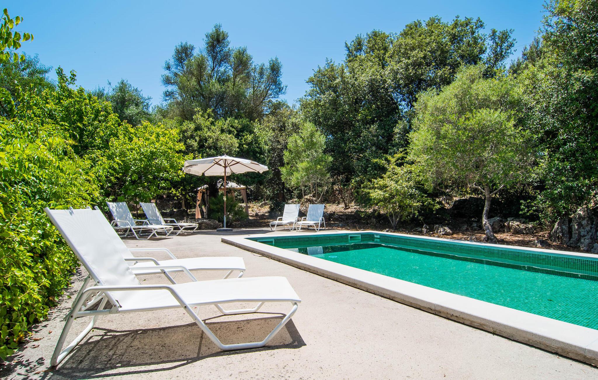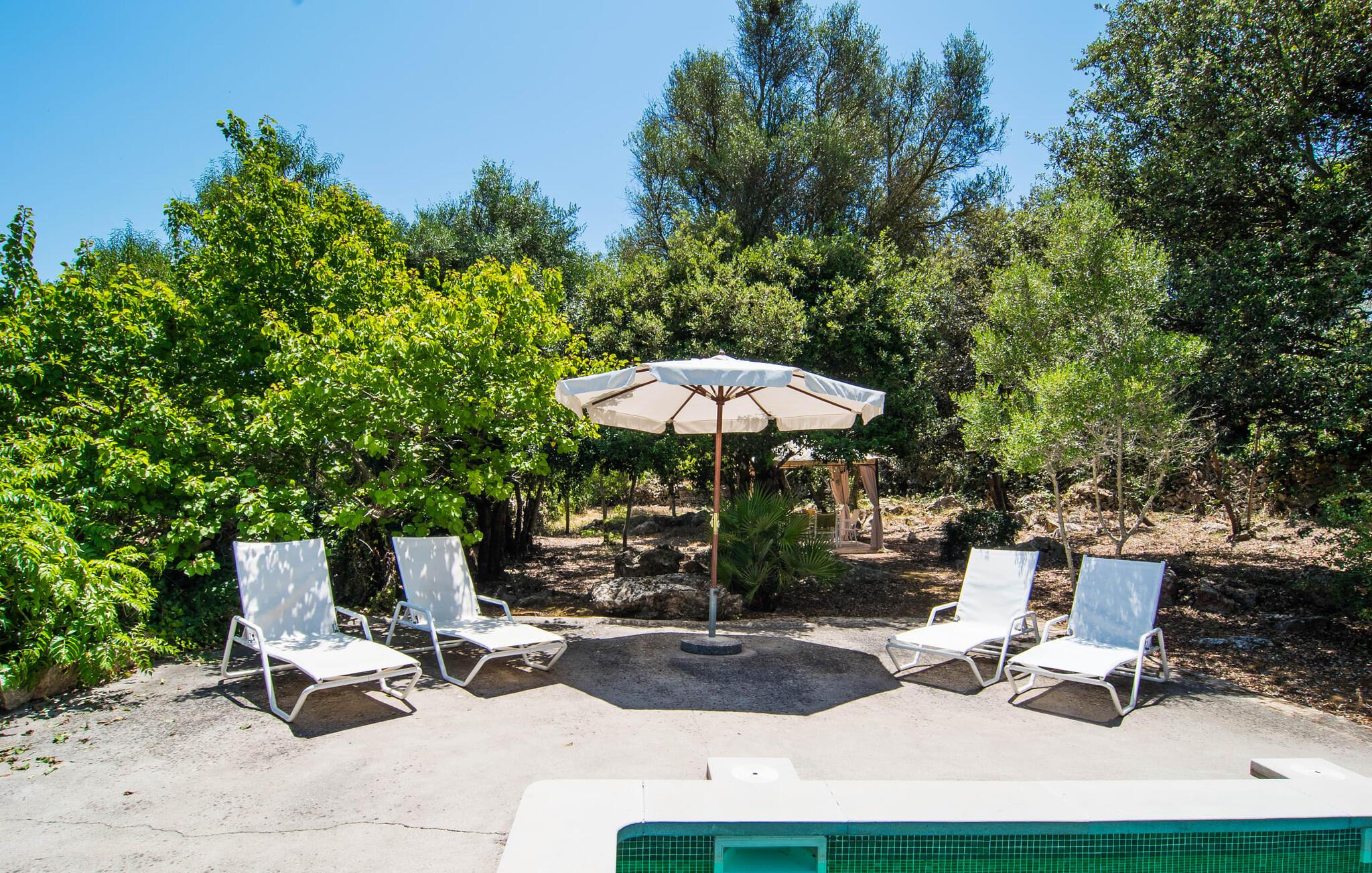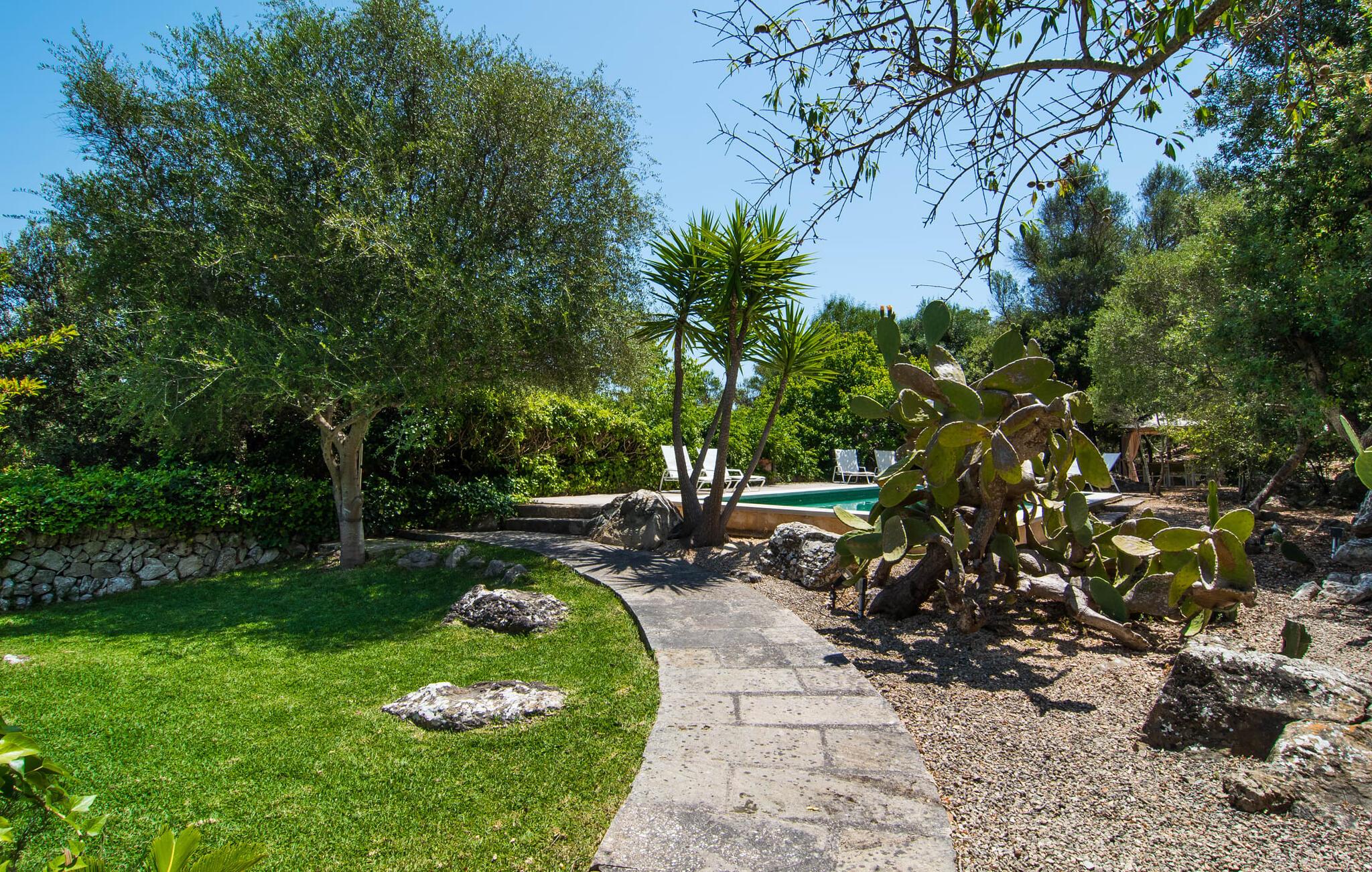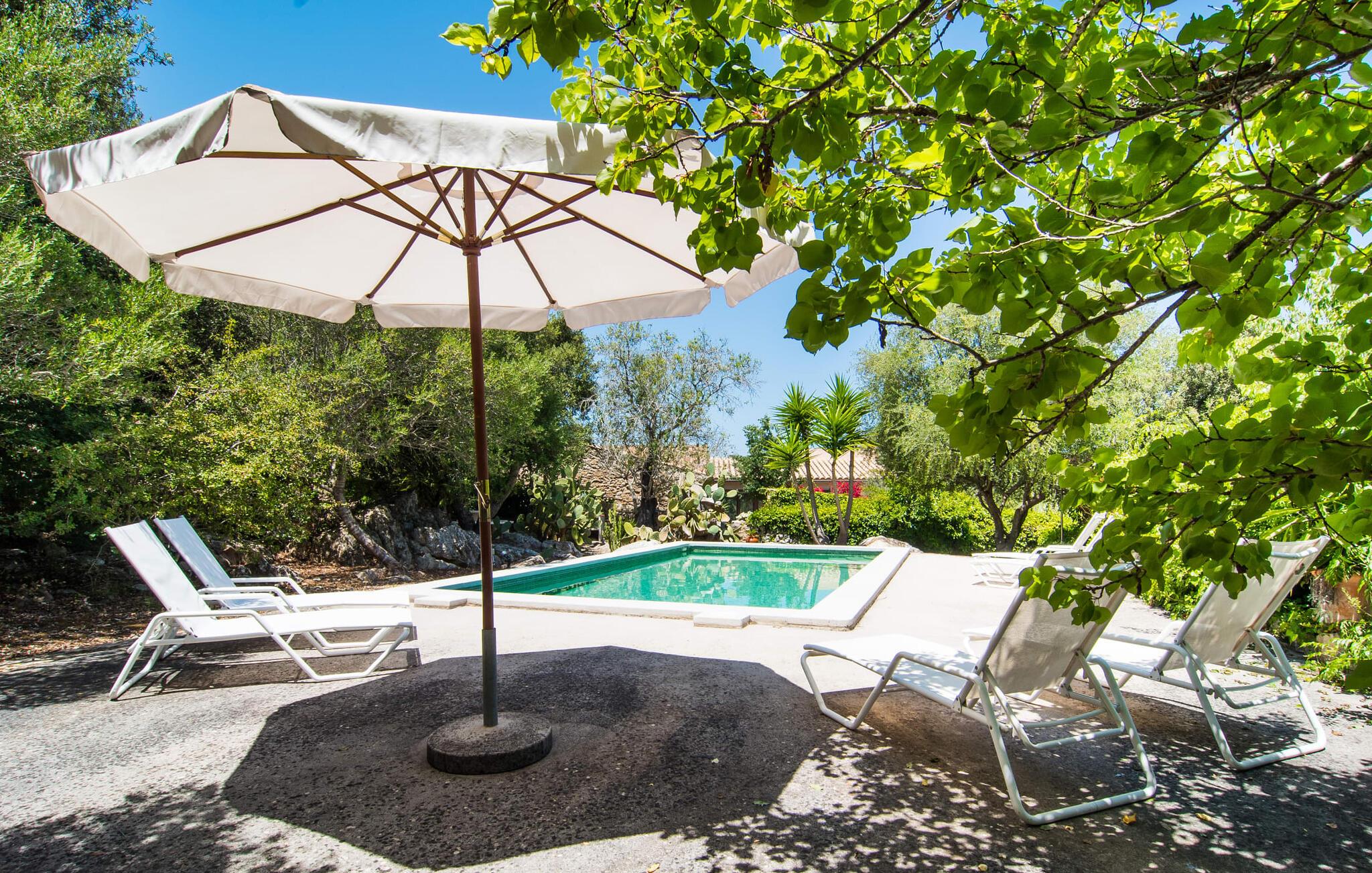 Noen uforglemmelige dager for å lade batteriene, nyte et spesielt bomiljø og samtidig nyte privatlivet og nærheten til infrastrukturelt avanserte områder og havet Es Romagueral gjør det mulig! Hvis du ønsker at kupongkoden(e) bare skal være gyldig i en bestemt periode, kan du angi en startdato her. Selv om reisen er litt humpete, er det pittoreske landskapet verdt det. Oleander, oliven, appelsintrær og andre middelhavsbusker og -trær flankerer stien, som ender på et stort gruslagt område foran huset og fører direkte til steinhuset på bakkenivå. Søte stier, murer og nisjer omgir tomten og inviterer deg til å slappe av i det fri. Naturlig skygge og overbygde terrasseområder gir deg et passende sted til enhver tid på dagen. Paviljongen i olivenlunden er spesielt imponerende. Her trenger du bare å bestemme deg for hvilket måltid på dagen du liker best. Den runde sittegruppen ved siden av grillen har også sin sjarm og gir den rette atmosfæren for hyggelige grillkvelder. Den firkantede, overbygde verandaen på forsiden av huset er perfekt for uteservering, ligger beleilig til og har en vakker utsikt over hagen. Bak boligbygningen, som er omgitt av en liten skog av steineiker, er alt klart for bading og soling. Kanskje du har lyst til å ta en forfriskende dukkert i bassenget om morgenen og nyte solen på en av solsengene i løpet av dagen!