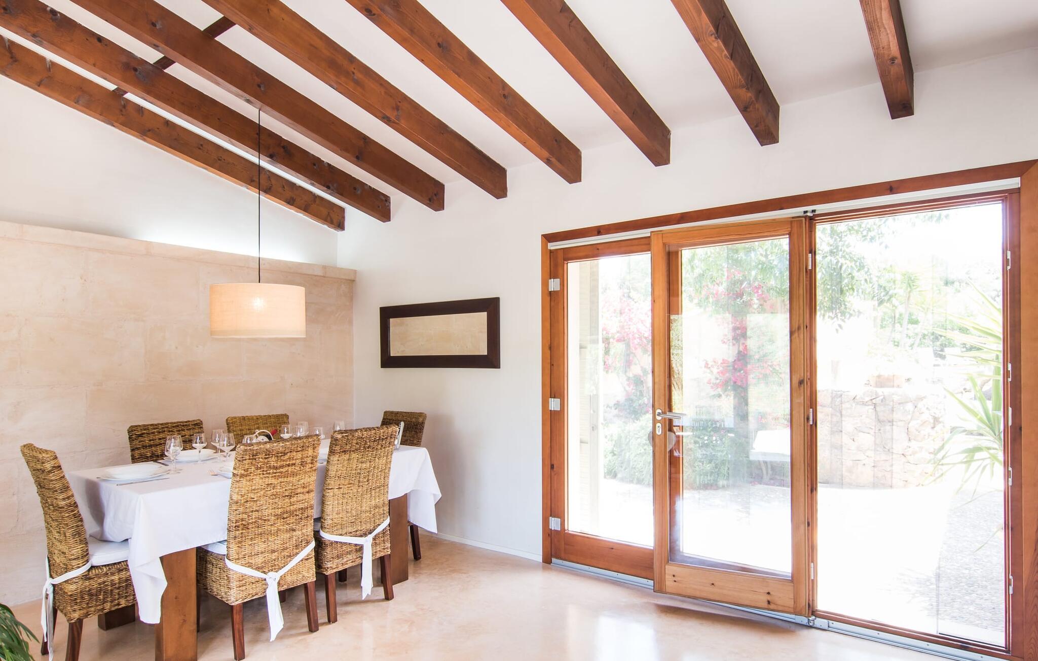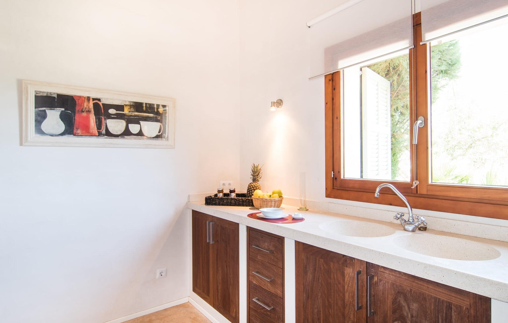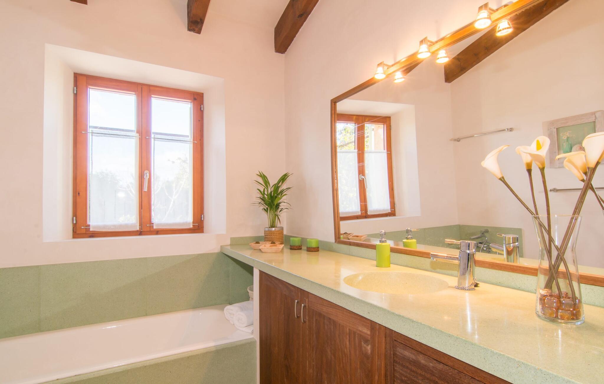Eierne har ikke bare lykkes i å skape et ekstremt smakfullt paradis på en tomt på 175 m², men har også designet det på en original måte og gitt det et veldig individuelt utseende med smarte detaljer. Så snart du kommer inn i rommene gjennom den romslige terrassedøren, befinner du deg direkte i spisestuen, som inviterer deg til å nyte overdådige måltider med sin vakre belysning og møbler. Hvis du liker å lage mat, vil du glede deg over det lyse, typiske mallorcinske mursteinkjøkkenet, som har alle moderne bekvemmeligheter, inkludert keramisk kokeplate, stekeovn, mikrobølgeovn, kjøleskap med fryser, vannkoker, oppvaskmaskin og kaffemaskin. Og ikke glem å prøve ut en typisk spansk oppskrift her! Er du på utkikk etter en retreat, selv om du helst vil være på ferie med maks seks personer? Det er faktisk ikke så lett, men her, i tillegg til de naturlig isolerte og svært estetisk innredede soverommene, er en tydelig adskilt stue et annet attraktivt alternativ for å finne et rolig sted inne. Sofaer, peis, TV, CD- og DVD-spiller lar ikke noe tilbake å ønske; den trådløse DSL-tilkoblingen kompletterer det moderne medietilbudet. Et virkelig pluss: begge badene er utstyrt med dusj og badekar, slik at villaen oppfyller alle gjestenes bade- og forfriskningspreferanser.