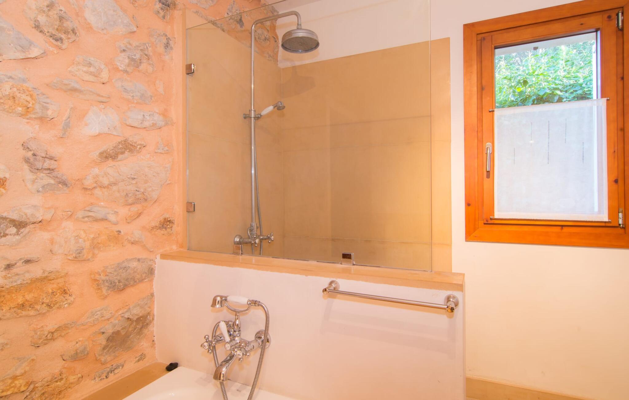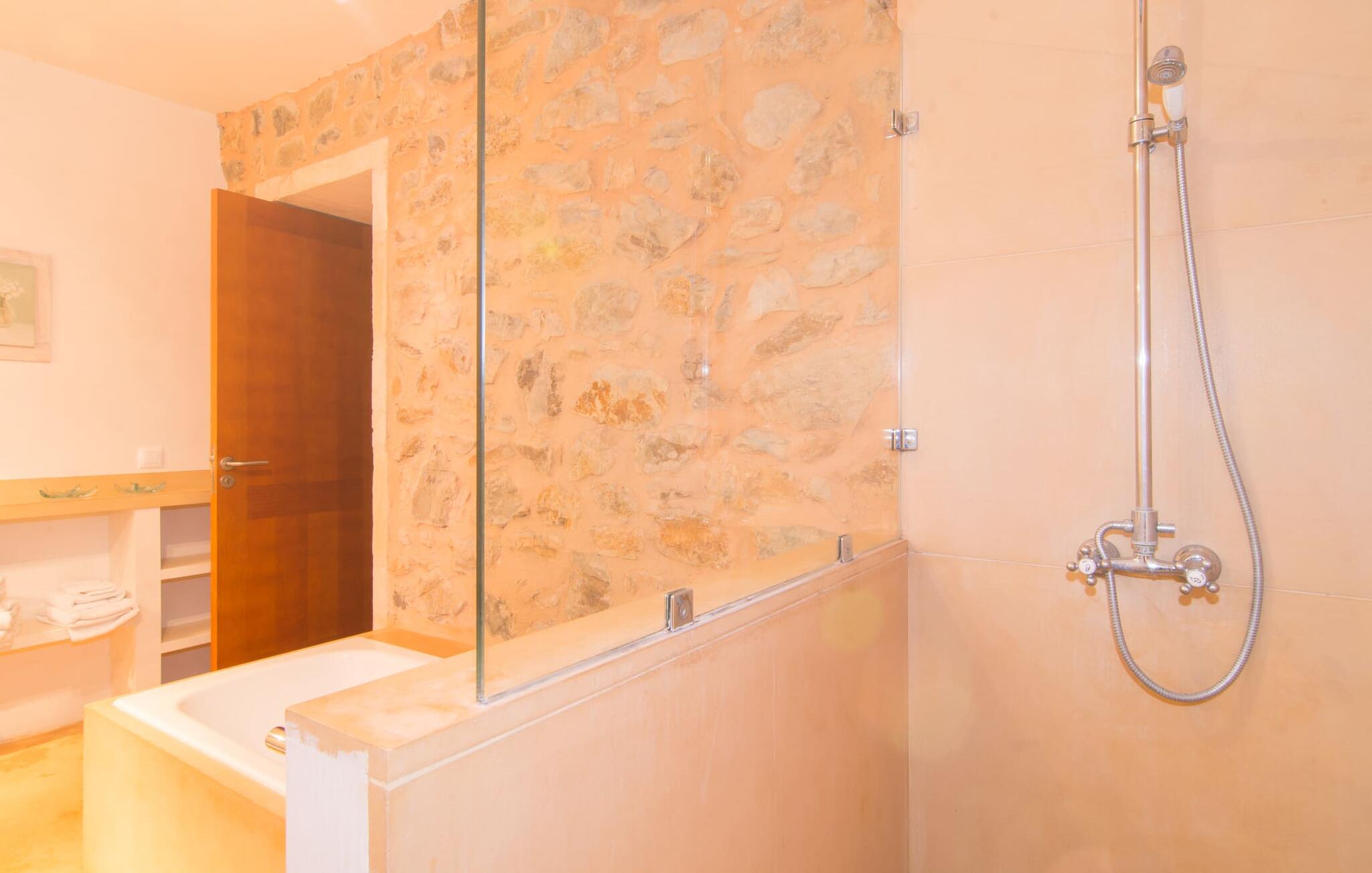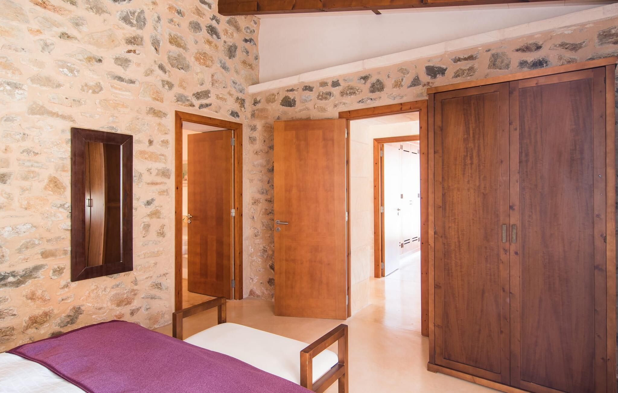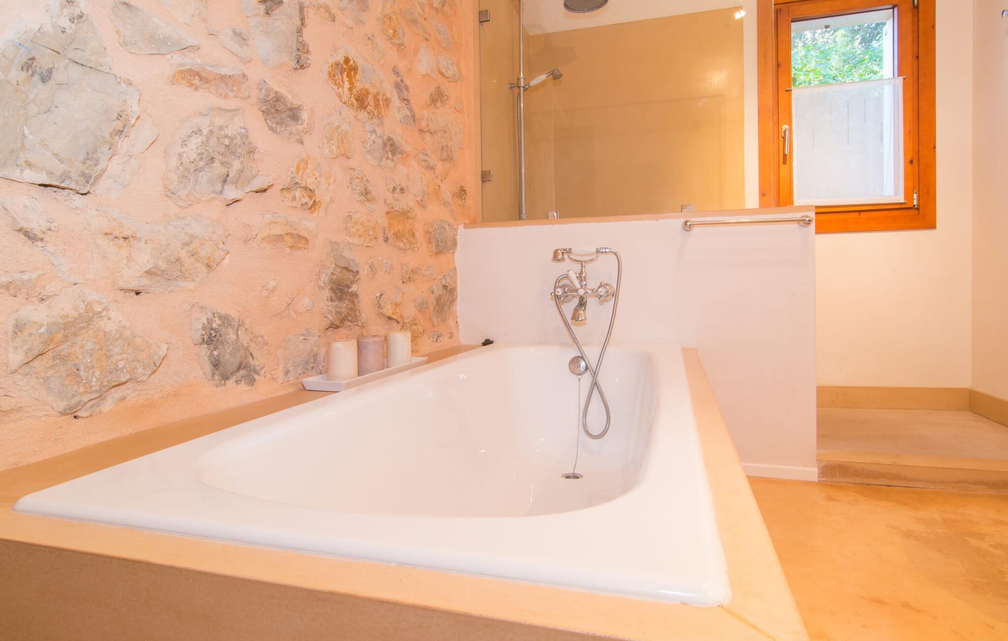 Eierne har ikke bare lykkes i å skape et ekstremt smakfullt paradis på en tomt på 175 m², men har også designet det på en original måte og gitt det et veldig individuelt utseende med smarte detaljer. Så snart du kommer inn i rommene gjennom den romslige terrassedøren, befinner du deg direkte i spisestuen, som inviterer deg til å nyte overdådige måltider med sin vakre belysning og møbler. Hvis du liker å lage mat, vil du glede deg over det lyse, typiske mallorcinske mursteinkjøkkenet, som har alle moderne bekvemmeligheter, inkludert keramisk kokeplate, stekeovn, mikrobølgeovn, kjøleskap med fryser, vannkoker, oppvaskmaskin og kaffemaskin. Og ikke glem å prøve ut en typisk spansk oppskrift her! Er du på utkikk etter en retreat, selv om du helst vil være på ferie med maks seks personer? Det er faktisk ikke så lett, men her, i tillegg til de naturlig isolerte og svært estetisk innredede soverommene, er en tydelig adskilt stue et annet attraktivt alternativ for å finne et rolig sted inne. Sofaer, peis, TV, CD- og DVD-spiller lar ikke noe tilbake å ønske; den trådløse DSL-tilkoblingen kompletterer det moderne medietilbudet. Et virkelig pluss: begge badene er utstyrt med dusj og badekar, slik at villaen oppfyller alle gjestenes bade- og forfriskningspreferanser.