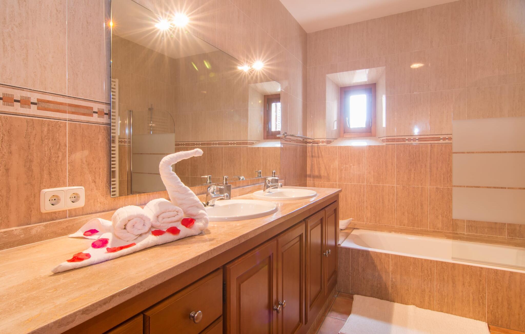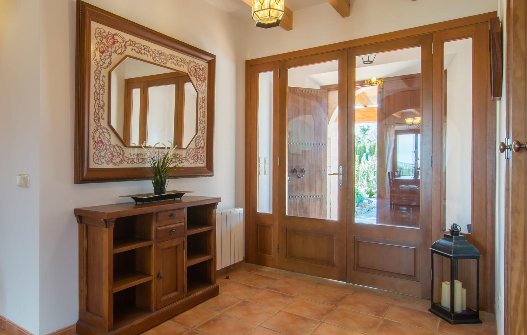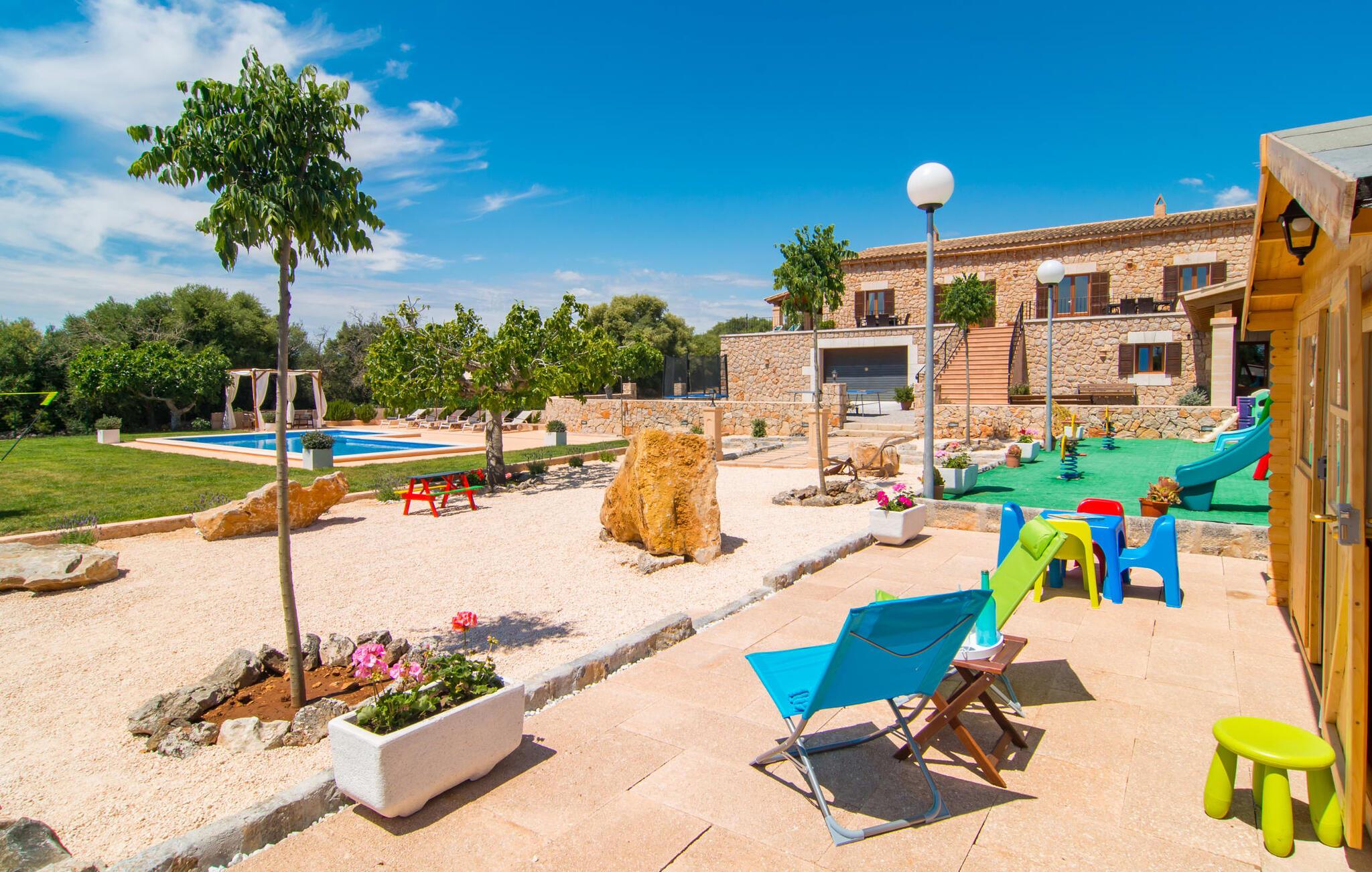 Si hei til Es Sebatlins, et herlig feriehus for hele familien. Med beliggenhet i et av Mallorcas vakreste områder kan du glemme hverdagen og slappe av midt i naturen. Den nybygde eiendommen har et typisk mallorcinsk utseende i naturlig steinbruddstein og imponerer ved første øyekast med sin sofistikerte arkitektur og vellykkede blanding av tradisjon og modernitet. Det velutstyrte uteområdet har en rekke høydepunkter som vil glede både store og små. Med et stort asurblått basseng med en herlig solterrasse og et koselig loungeområde for en forfriskende drink innimellom, en stor privat lekeplass slik at de små gjestene ikke kjeder seg, vil alle finne sitt favorittsted for å nyte ferien til det fulle. Litt nærmere huset ligger den romslige uteserveringen med spisebord og et velutstyrt utekjøkken, som er perfekt for å tilberede regionale delikatesser. Gjør en middag med venner eller familie til en festlig opplevelse! Og det er selvfølgelig mer; villaens smakfullt møblerte interiør imponerer med en like overbevisende blanding av moderne stil og middelhavsoriginalitet. Det elegante kjøkkenet med sine vakre hasselnøttbrune trefronter og skinnende granittbenkeplater ser flott ut og har alle fasiliteter som trengs for en ekte matlagingsopplevelse. Med direkte tilgang til spise- og oppholdsrommet kan kokken også nyte en hyggelig atmosfære. Og hvis du vil ta det rolig om kvelden, er det bare å slappe av i de herlig myke loungemøblene. Nå er det bare å bestemme seg for om man vil tenne opp i peisen og nyte en knitrende ild eller se en spennende film på flatskjerm-TV-en. Etter en herlig dag på øya, når øynene blir tunge, venter allerede tre vakre soverom på deg. Møblene og tekstilene er holdt i beroligende naturfarger, som i kombinasjon med de svært komfortable sengene sørger for en avslappende nattesøvn. Disse tre soverommene, som er sanne oaser av velvære, overgås bare av de to førsteklasses badene, som oppfyller selv de høyeste krav. Sist, men ikke minst, byr huset på en spesiell godbit: et fullt utstyrt treningsområde. Hvis du ikke vil gå glipp av litt sport på ferien, kan du svette så mye du vil her (eller bare nyte de mange mallorkinske delikatessene). Hvis du foretrekker naturen fremfor treningsstudioet, er området rundt villaen ideelt for lange spaserturer eller fotturer gjennom det fortryllende landskapet i den østlige delen av øya. Har du lyst på litt mallorkinsk kultur og byliv? En kjøretur til Sant Llorenç des Cardassar tar bare 1,8 km. Her venter alle slags små butikker, kafeer og restauranter på å bli oppdaget. Og hvis du foretrekker en mild havbris, er det bare å pakke strandbagene og dra til den vakre sandstranden Sa Coma, som ligger bare 20 minutter unna med bil. Den særdeles familievennlige Finca Es Sebatlins ligger i fortryllende omgivelser i den vakre østlige delen av øya. Eiendommen ligger midt i naturen, med fantastisk utsikt over det mallorkinske landskapet. I Sant Llorenc, bare 1,8 km unna, finner du alt du trenger for dine daglige behov, fra supermarked og bakerier til kafeer, banker og apotek. Og den nærmeste sandstranden, som Sa Coma, kan nås med bil på bare 20 minutter.
