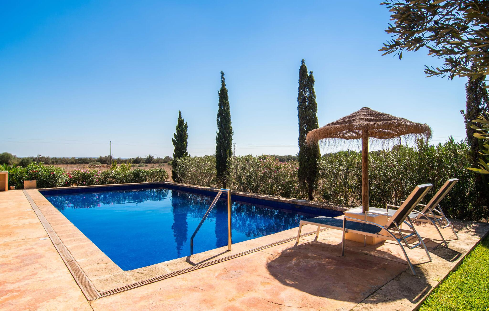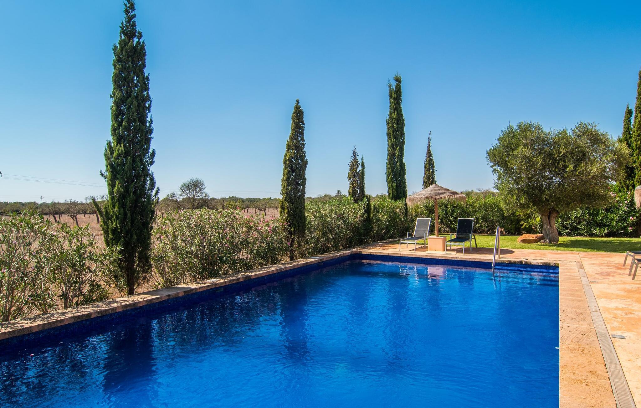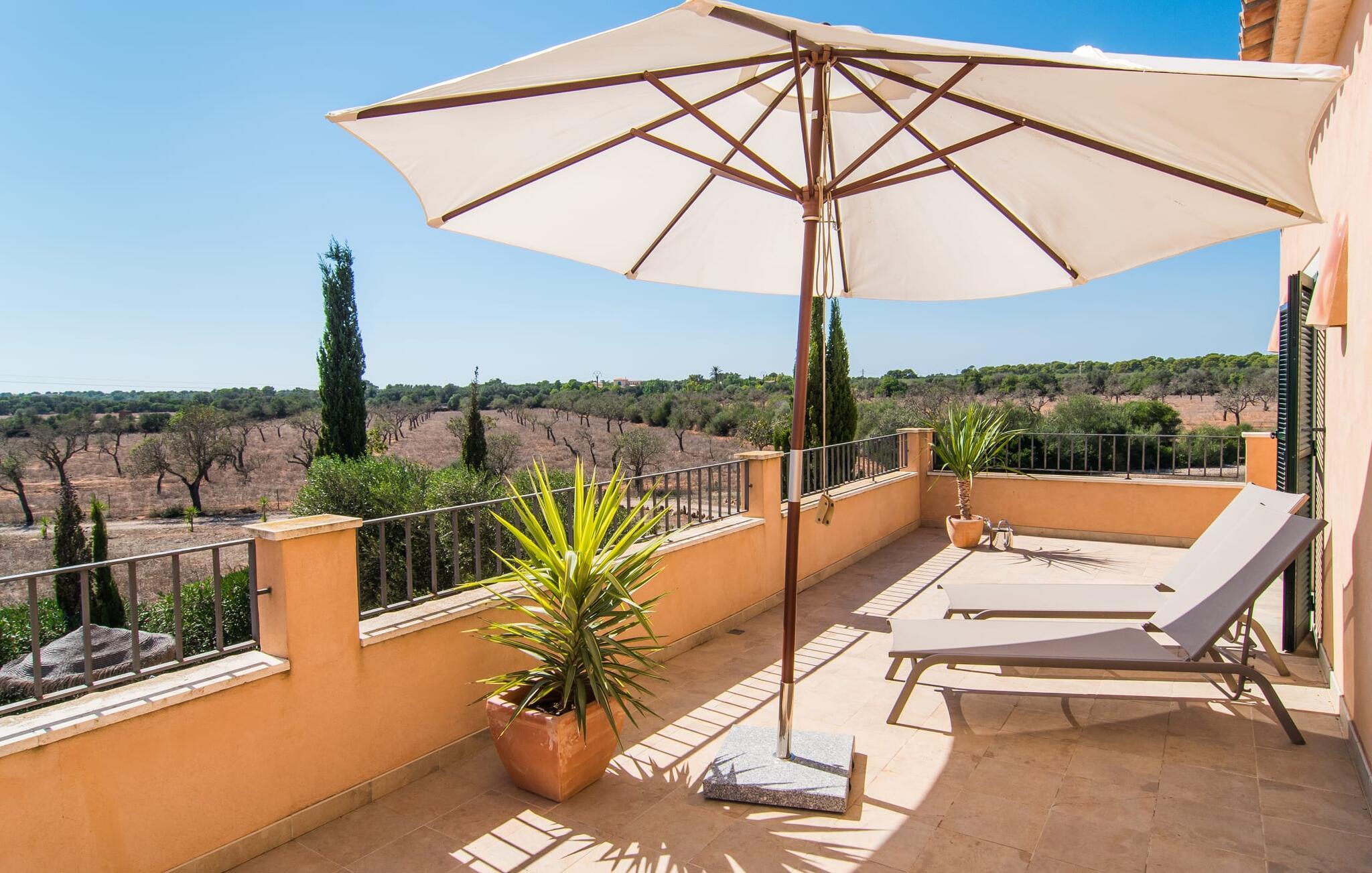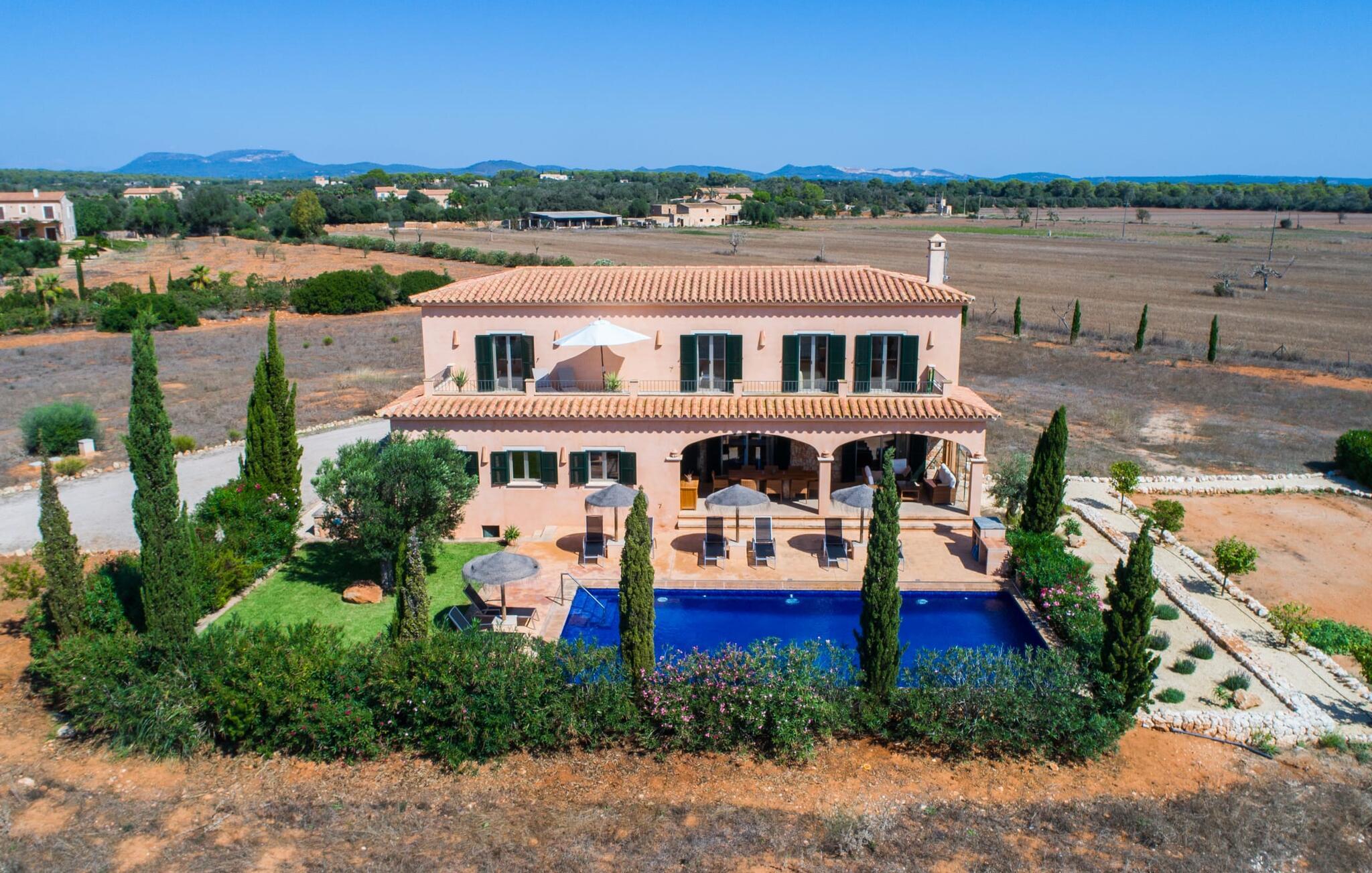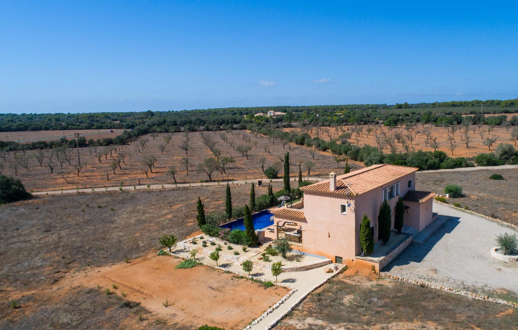Det staselige Es Vinyolet de Campos er en av de få villaene som ligger midt i åkrene i en rolig blindvei. Sypresser og en liten steinhage omgir huset. De landlige eiendommene er så store at nabolaget er ganske spredt. Så ingen kan se over hekken mens du svømmer noen runder i det 12 meter lange bassenget og slapper av under kokosparasollene, mens du serverer grillretter på den overbygde terrassen eller unner deg en espresso eller en mandelcroissant på de komfortable rottingmøblene. Den lange balkongen går utenfor soverommene i første etasje og gir enda mer privatliv, god plass til solsenger og beroliger øyet med en klar utsikt over sletten med oliventrær. Her blir selv bynevrotikere uventet forvandlet til lidenskapelige campesinos som oppdager den rolige, landlige regionen for seg selv.