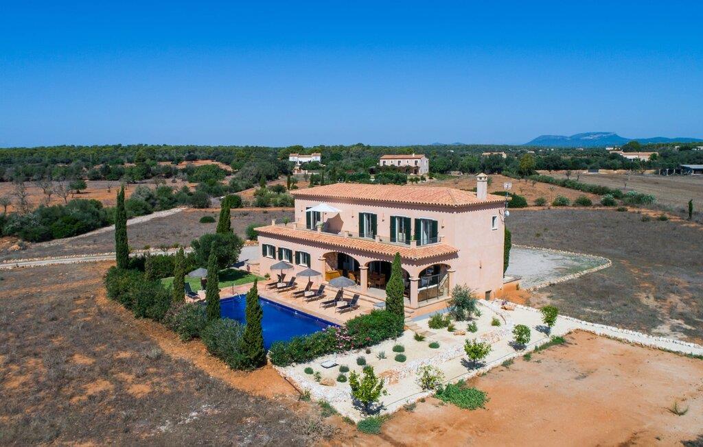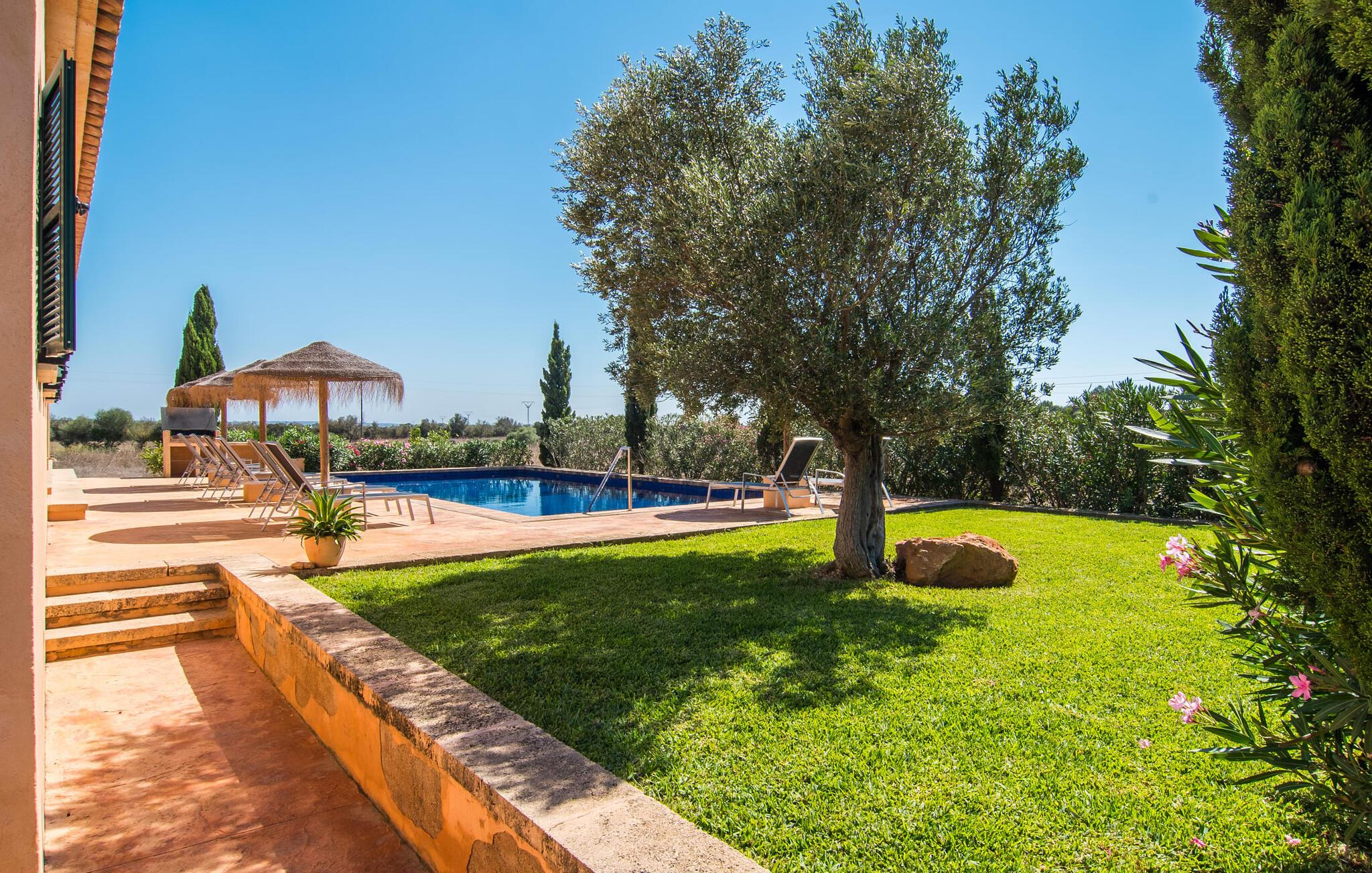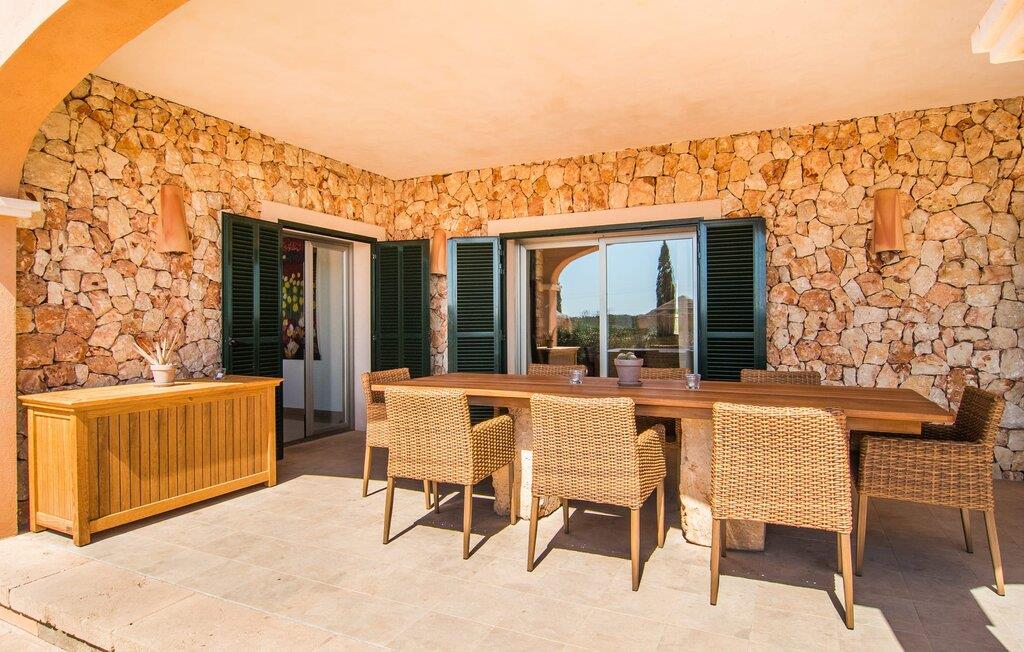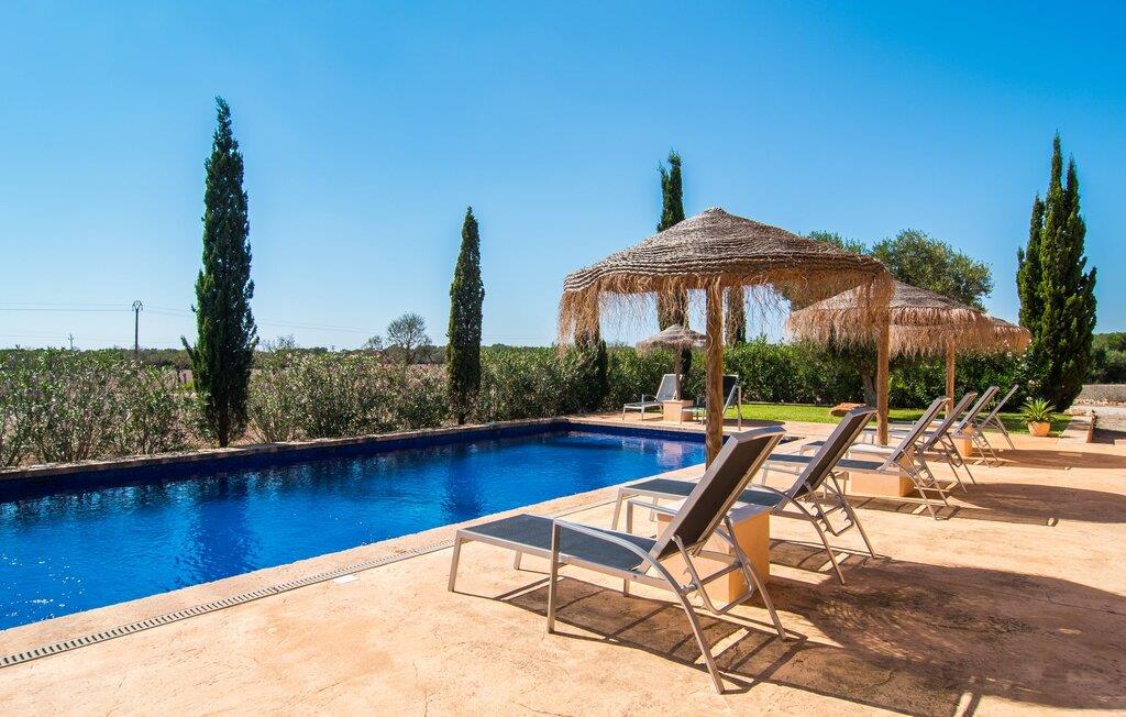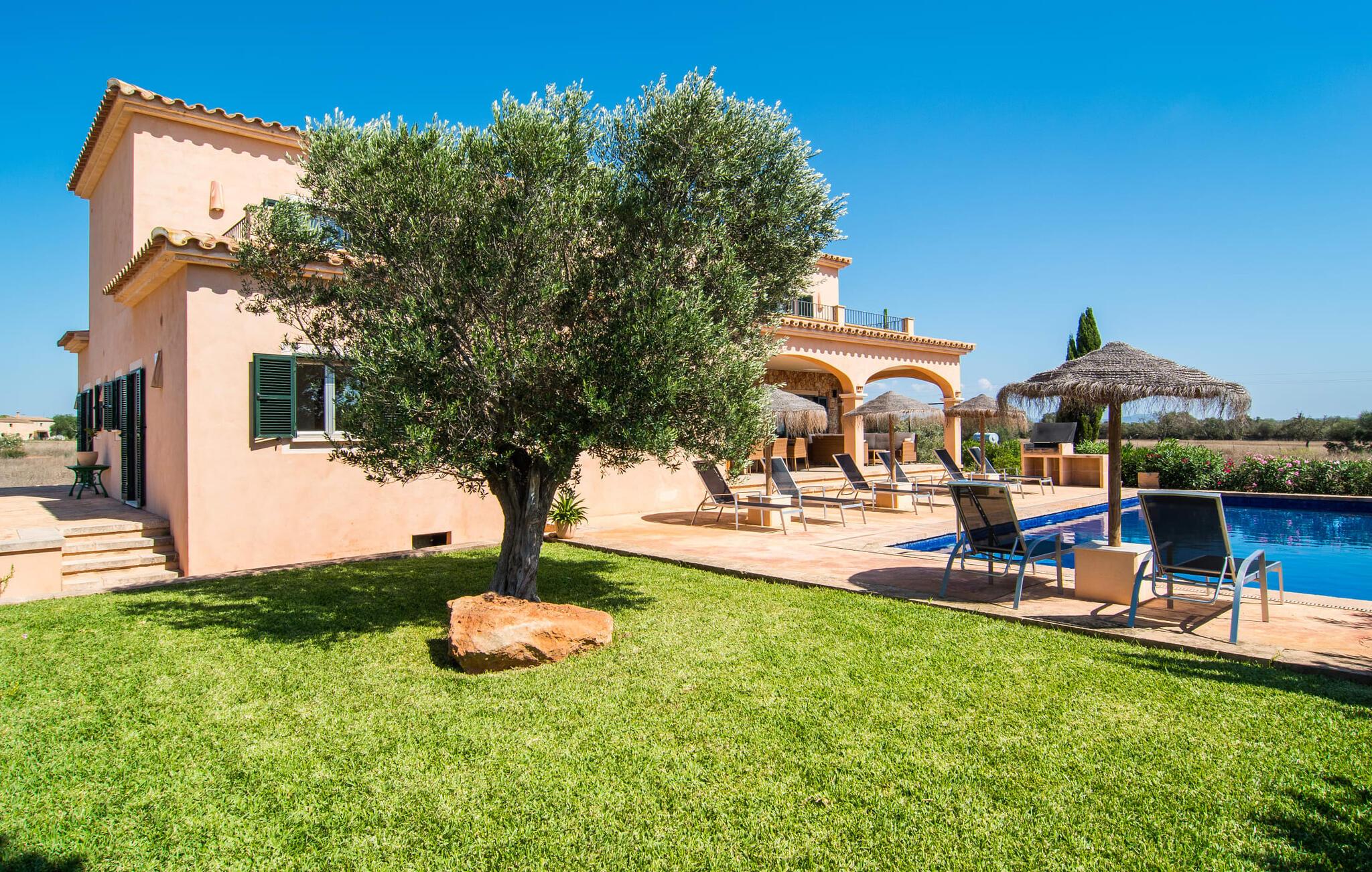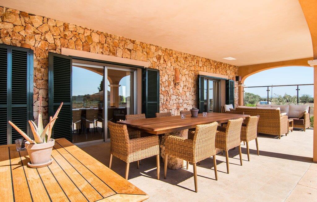 Det staselige Es Vinyolet de Campos er en av de få villaene som ligger midt i åkrene i en rolig blindvei. Sypresser og en liten steinhage omgir huset. De landlige eiendommene er så store at nabolaget er ganske spredt. Så ingen kan se over hekken mens du svømmer noen runder i det 12 meter lange bassenget og slapper av under kokosparasollene, mens du serverer grillretter på den overbygde terrassen eller unner deg en espresso eller en mandelcroissant på de komfortable rottingmøblene. Den lange balkongen går utenfor soverommene i første etasje og gir enda mer privatliv, god plass til solsenger og beroliger øyet med en klar utsikt over sletten med oliventrær. Her blir selv bynevrotikere uventet forvandlet til lidenskapelige campesinos som oppdager den rolige, landlige regionen for seg selv.