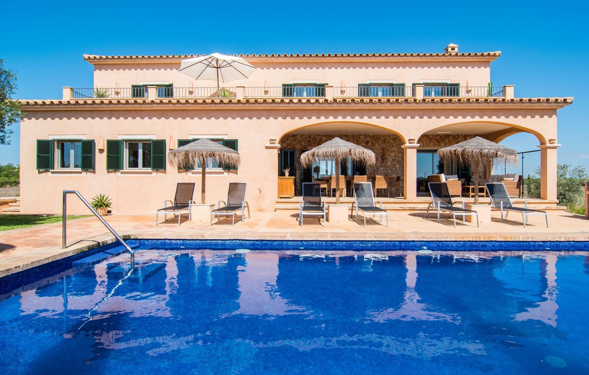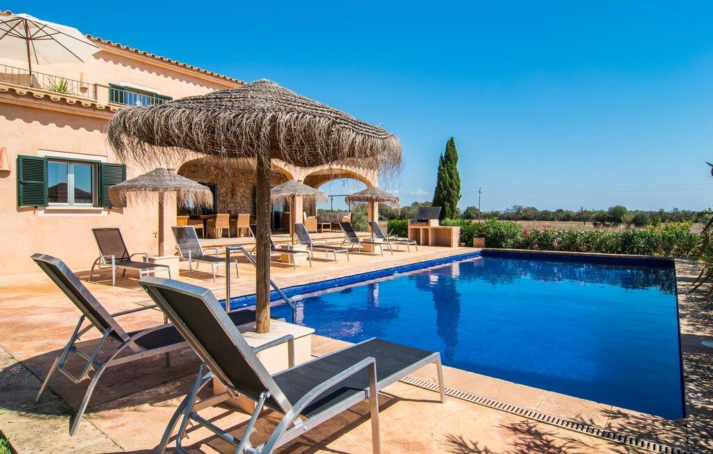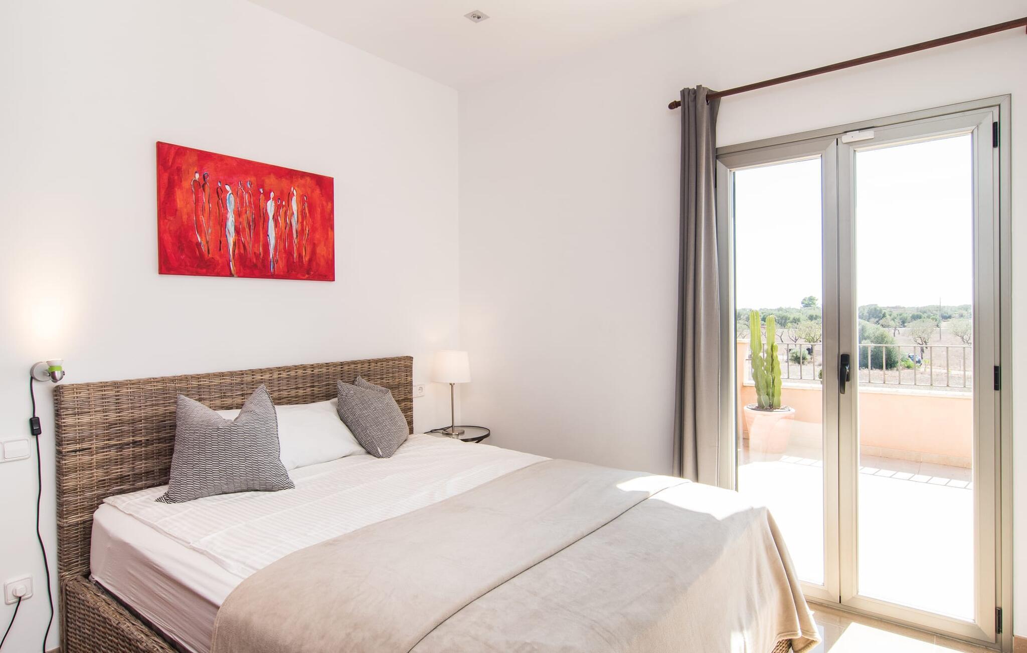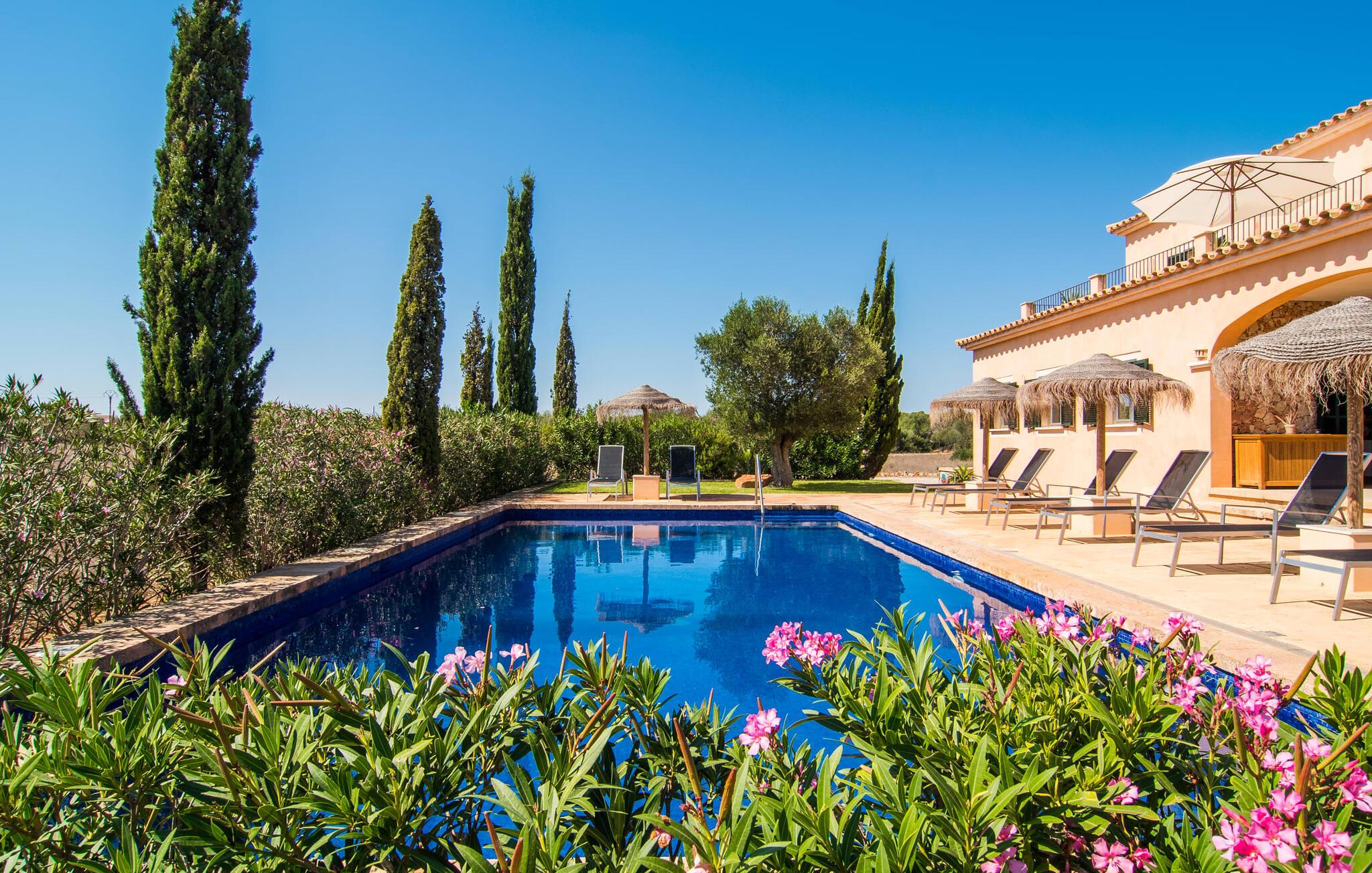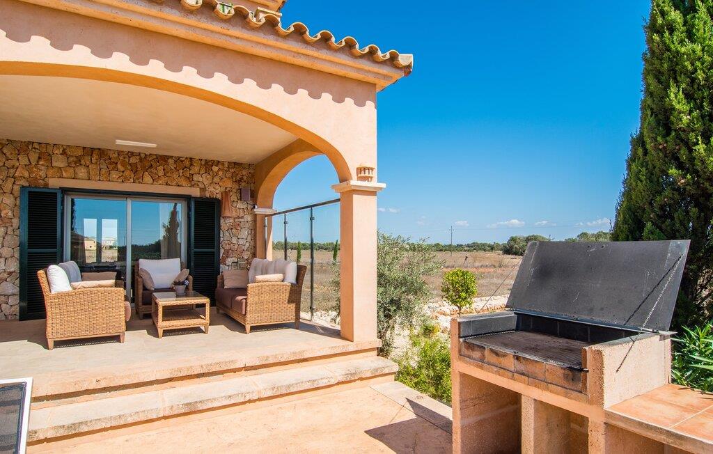 Det staselige Es Vinyolet de Campos er en av de få villaene som ligger midt i åkrene i en rolig blindvei. Sypresser og en liten steinhage omgir huset. De landlige eiendommene er så store at nabolaget er ganske spredt. Så ingen kan se over hekken mens du svømmer noen runder i det 12 meter lange bassenget og slapper av under kokosparasollene, mens du serverer grillretter på den overbygde terrassen eller unner deg en espresso eller en mandelcroissant på de komfortable rottingmøblene. Den lange balkongen går utenfor soverommene i første etasje og gir enda mer privatliv, god plass til solsenger og beroliger øyet med en klar utsikt over sletten med oliventrær. Her blir selv bynevrotikere uventet forvandlet til lidenskapelige campesinos som oppdager den rolige, landlige regionen for seg selv.