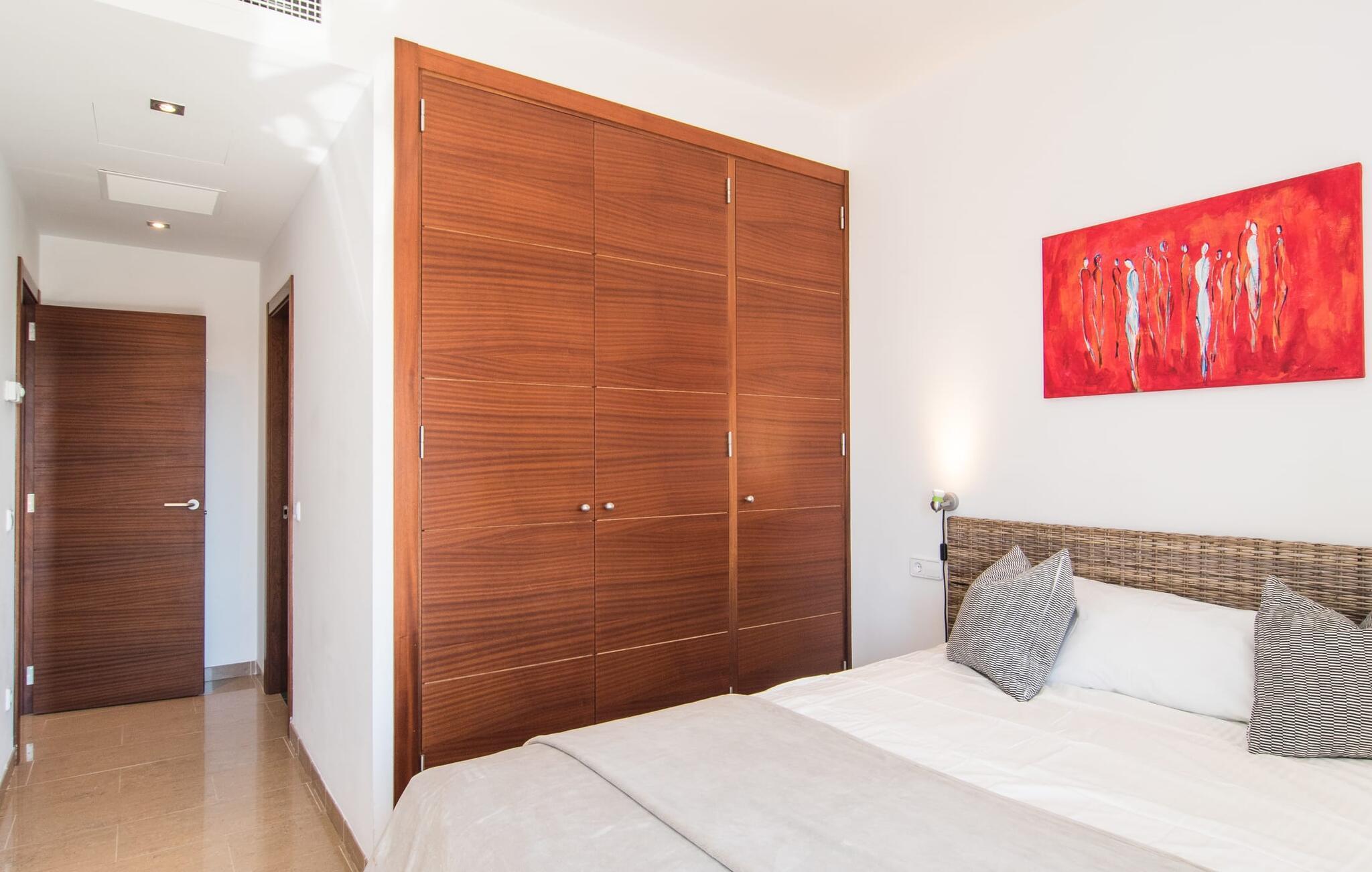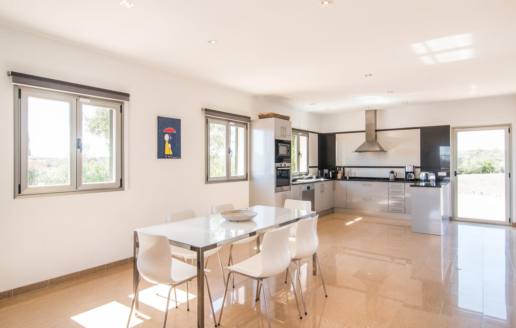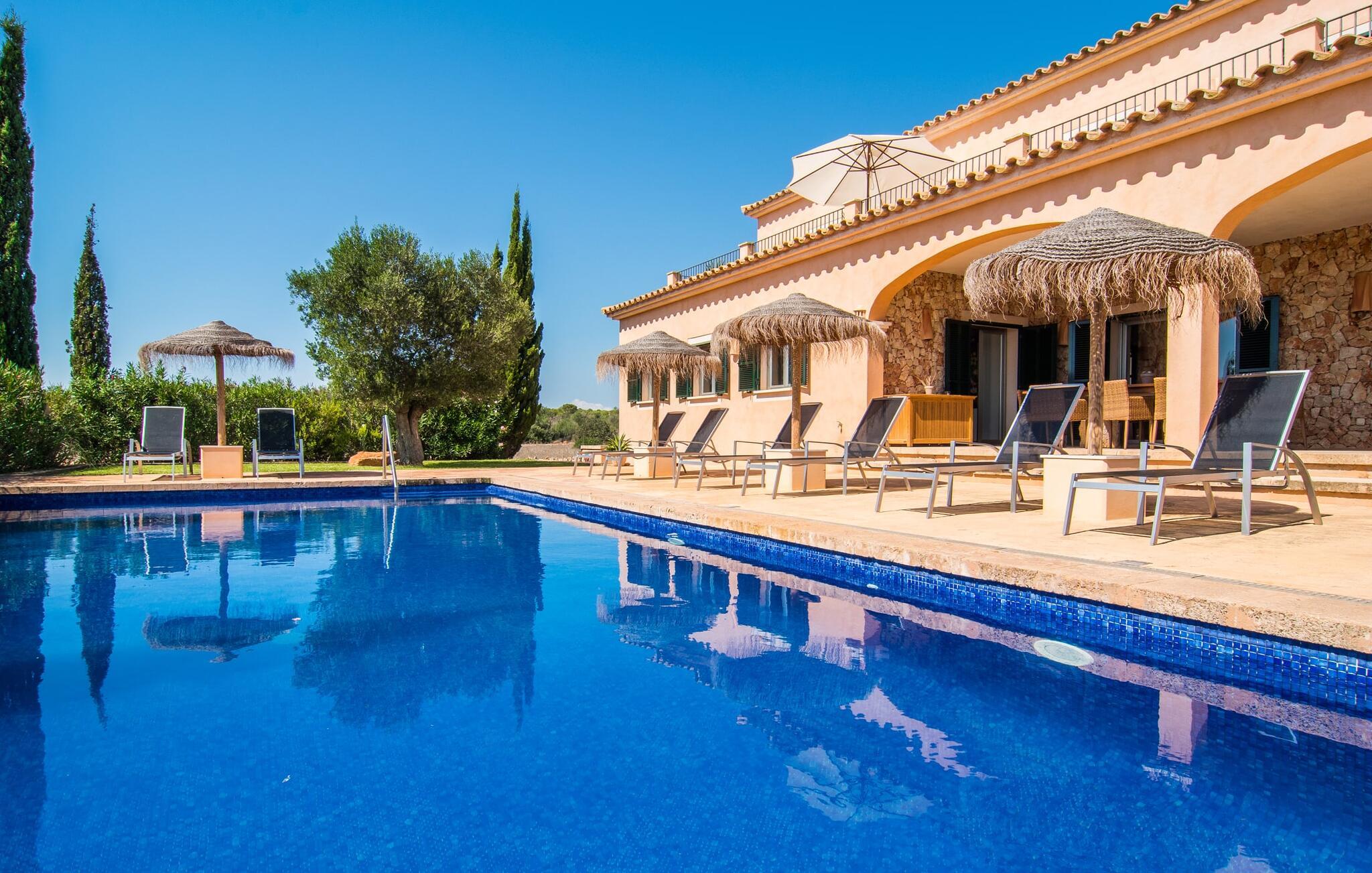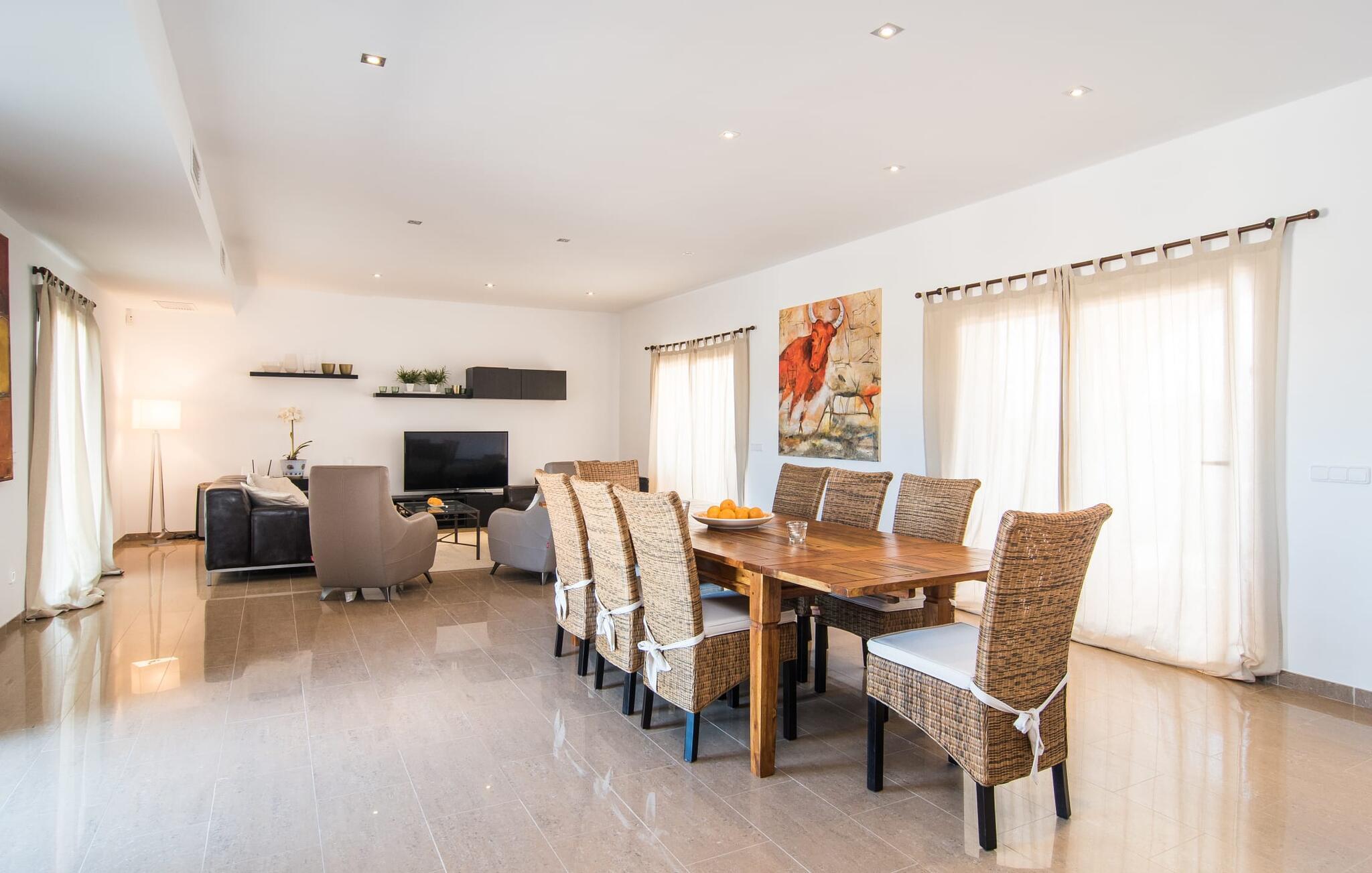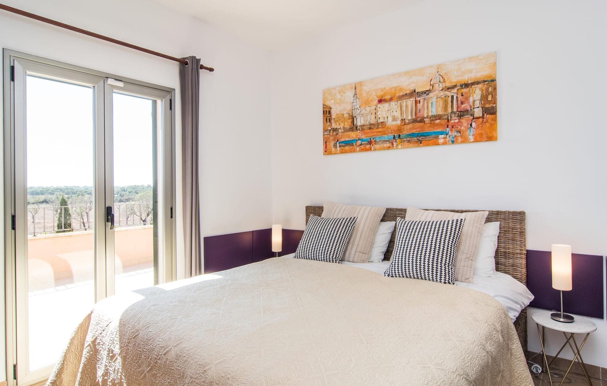 Det staselige Es Vinyolet de Campos er en av de få villaene som ligger midt i åkrene i en rolig blindvei. Sypresser og en liten steinhage omgir huset. De landlige eiendommene er så store at nabolaget er ganske spredt. Så ingen kan se over hekken mens du svømmer noen runder i det 12 meter lange bassenget og slapper av under kokosparasollene, mens du serverer grillretter på den overbygde terrassen eller unner deg en espresso eller en mandelcroissant på de komfortable rottingmøblene. Den lange balkongen går utenfor soverommene i første etasje og gir enda mer privatliv, god plass til solsenger og beroliger øyet med en klar utsikt over sletten med oliventrær. Her blir selv bynevrotikere uventet forvandlet til lidenskapelige campesinos som oppdager den rolige, landlige regionen for seg selv.