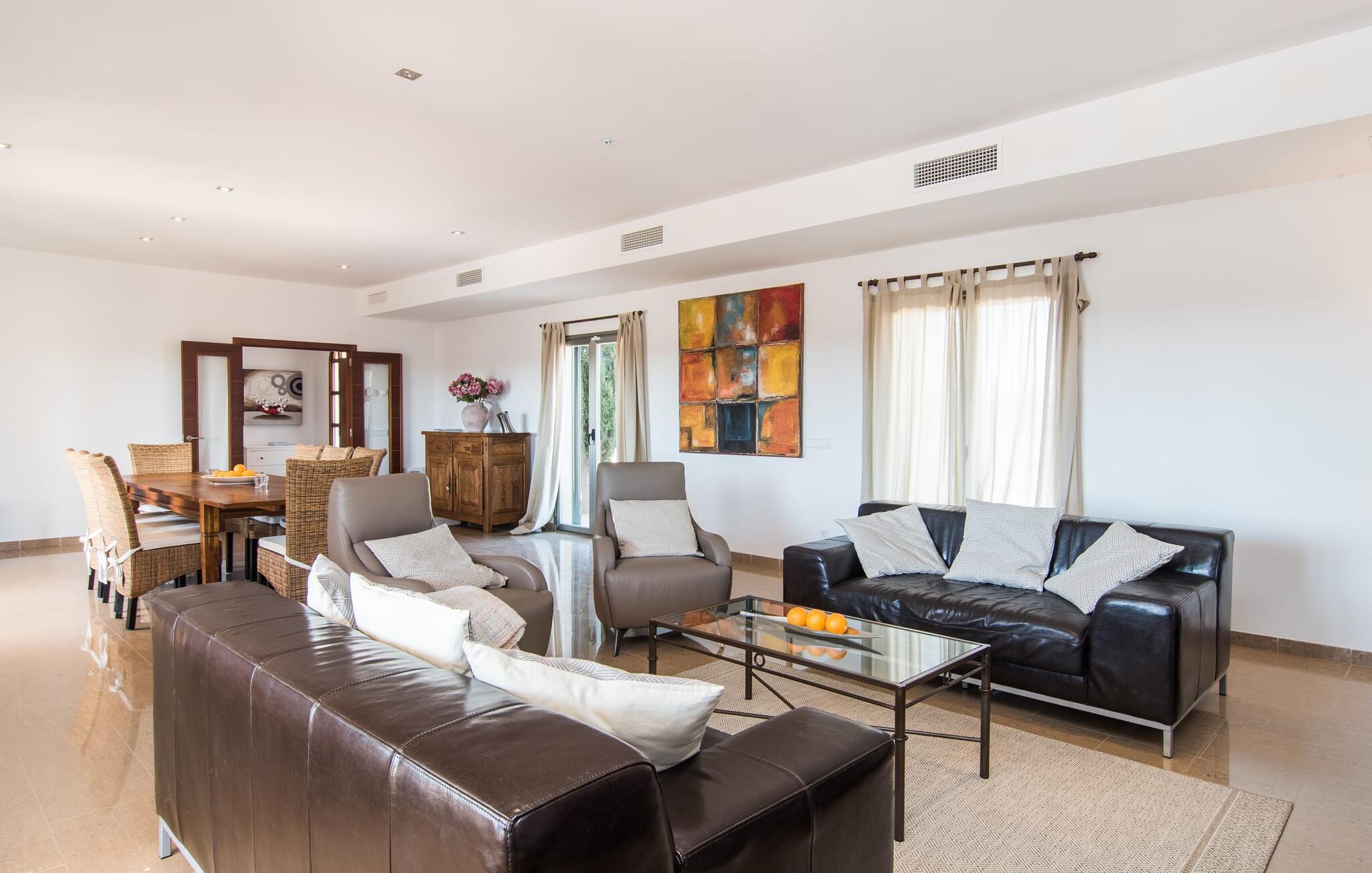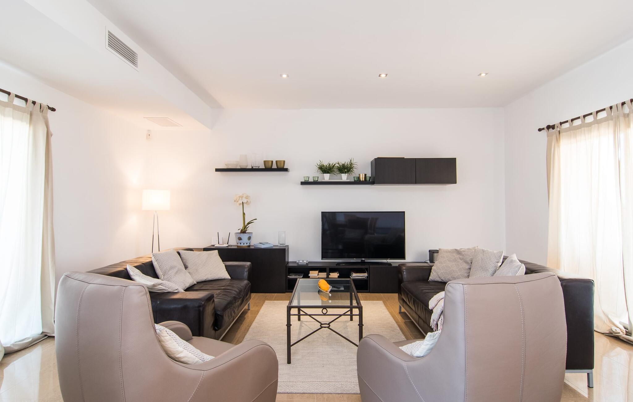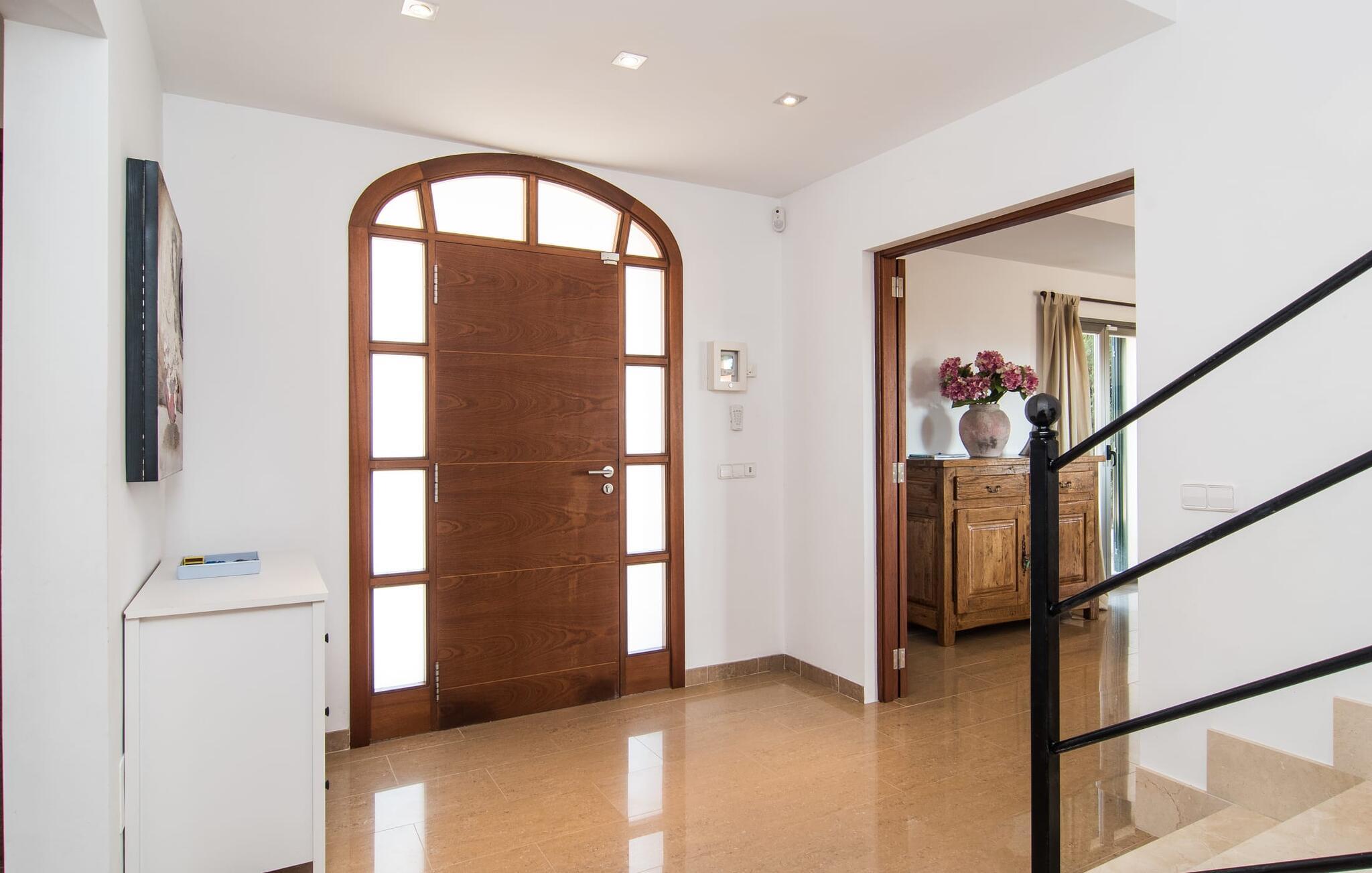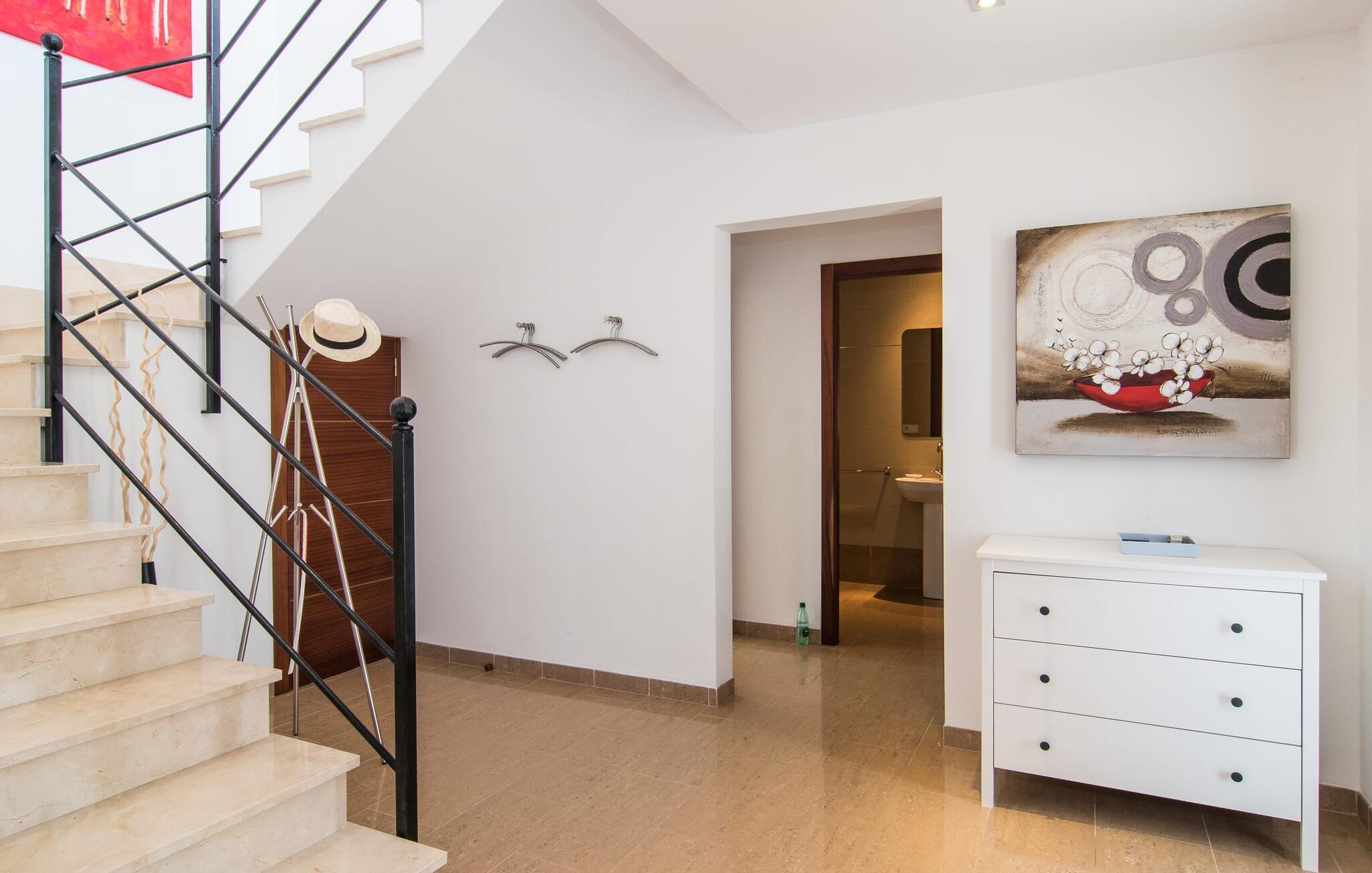 De nye eierne har pusset opp villaen innvendig og innredet den med eksepsjonell smak og komfort: Stilen er lys og minimalistisk, men med lyse fargeaksenter på veggene, møblene er elegante og komfortable, den store flatskjerm-TV-en er et skikkelig blikkfang, og kjøkkenet er et skinnende rike for kokker med side-by-side-kjøleskap og elektriske apparater av høy kvalitet. Taklamper sørger for at de vakre rommene er diskret opplyst overalt. Den øverste etasjen er forbeholdt feriedrømmene, og disse kan bare være rosa: Alle de fire dobbeltrommene (med senger på 1,80 eller 1,60 x 2 meter) har eget bad med dusjkabinett og direkte utgang til den solfylte balkongen. Gulvvarme og klimaanlegg sørger for en behagelig temperatur i rommet, noe som gjør villaen ideell for en time-out både sommer og vinter.