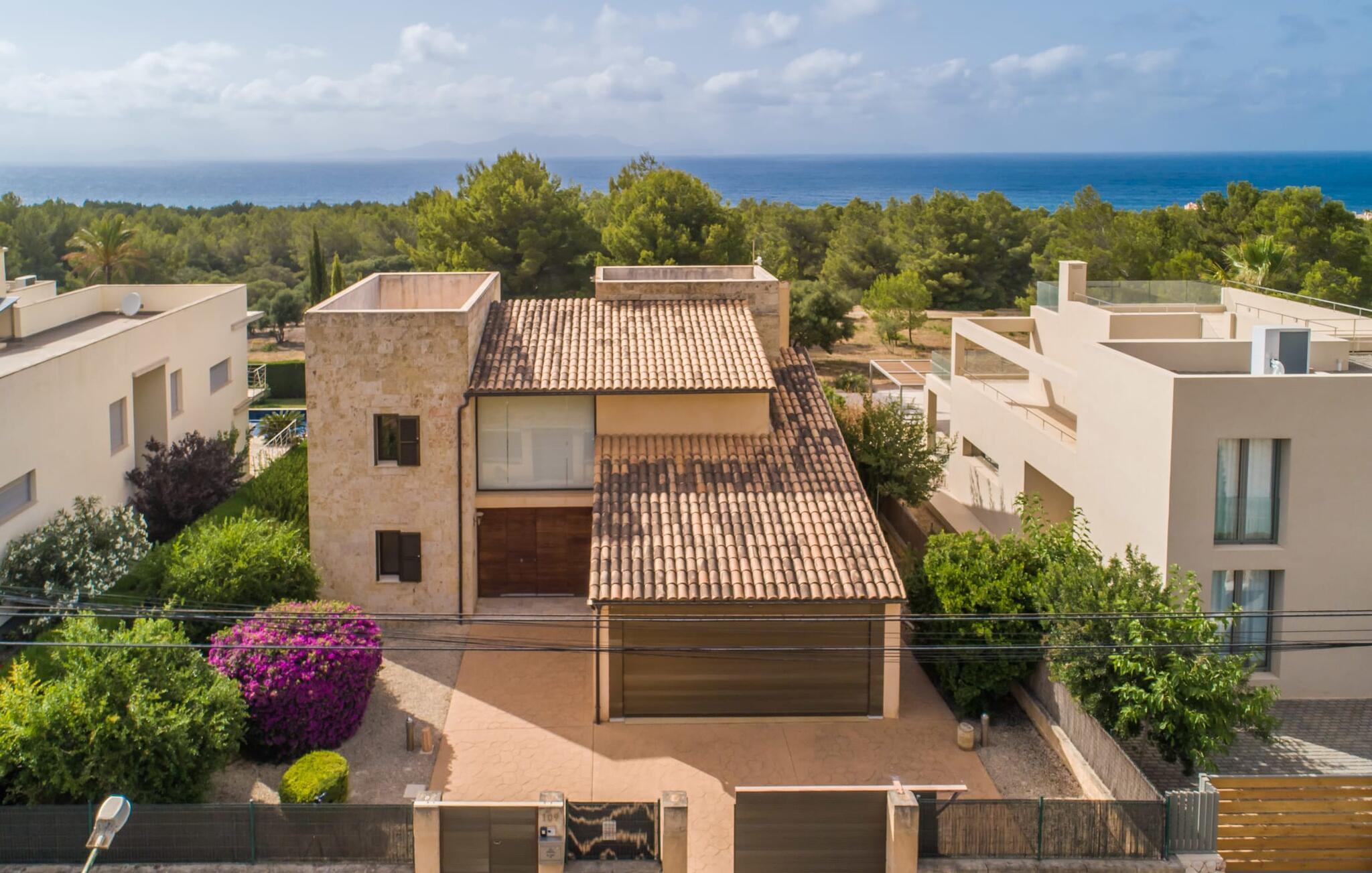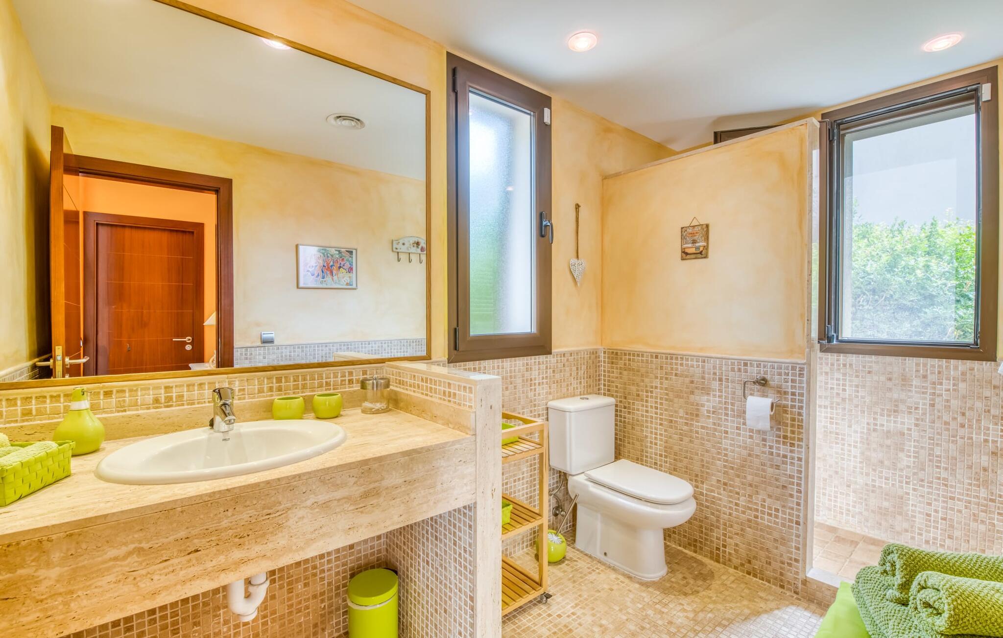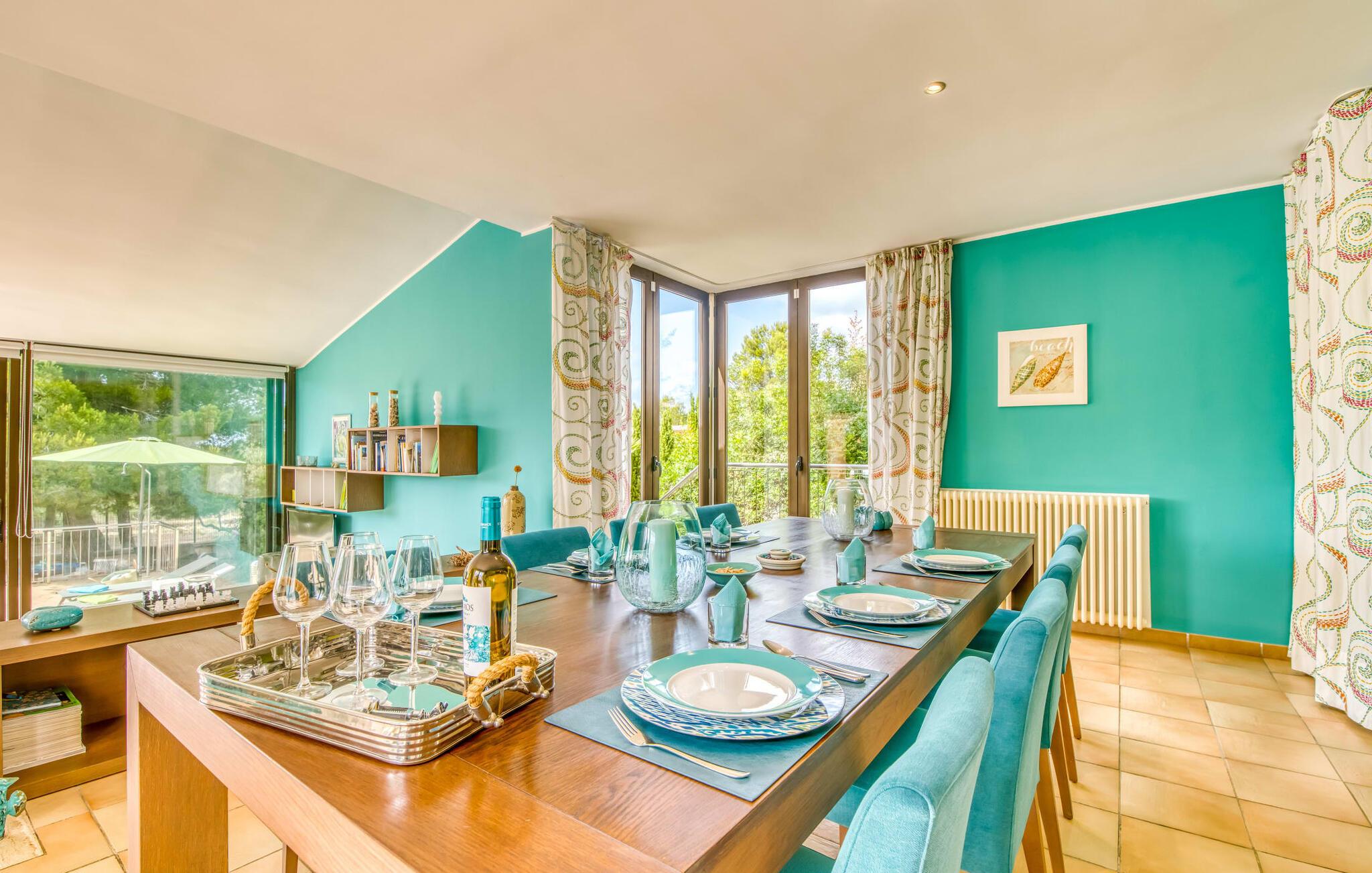 Villa Esmeralda Turquesa utnytter naturlige lyskilder som en del av arkitekturen, og forfrisker den med et levende og dynamisk interiør. De friske fargetonene gir hvert rom sin egen individuelle karakter. Gjennom panoramavinduene kommer det uhindret dagslys inn i alle rom. Typisk for Mallorca er de lyse sandsteinsveggene som fremhever villaens muntre fargeaksenter, som er synlige fra alle vinkler. Huset har tre soverom, hvert med en dobbeltseng (180 x 200 cm). Eierne stiller gjerne en barneseng til disposisjon ved behov. To av soverommene har bad i direkte tilknytning. To av dem har badekar, ideelt for et avslappende bad. Villaen er ideell for tre par som ønsker å nyte tiden sammen, samtidig som de har en viss grad av uavhengighet og privatliv. Tre bad! Kjøkkenet er velutstyrt: oppvaskmaskin, komfyr og avtrekkshette, kaffe- og espressomaskin, et godt utvalg av urter og krydder til dine favorittoppskrifter. Frokostbaren er perfekt for en rask matbit mellom måltidene eller for å starte dagen på egen hånd med en bolle müsli. Et gratis glass vin venter på deg ved ankomst. I den tilstøtende spisestuen er det et stort eikebord med plass til åtte personer. Ved siden av kjøkkenet ligger den åpne stuen, som du også kommer til via trappen. Her kan du tilbringe koselige timer i den komfortable skinnsofaen. Enten du bare vil legge opp føttene og se en film på flatskjerm-TV-en, nyte utsikten over middelhavshagen fra terrassen eller skue ut mot havet i bakgrunnen. Galleriet i første etasje garanterer den beste utsikten for å se den spektakulære solnedgangen. Strandutstyr som parasoller, strandmatter, en kjølebag, solsenger til stranden og sandleker til barna er tilgjengelig for gjestene i huset.