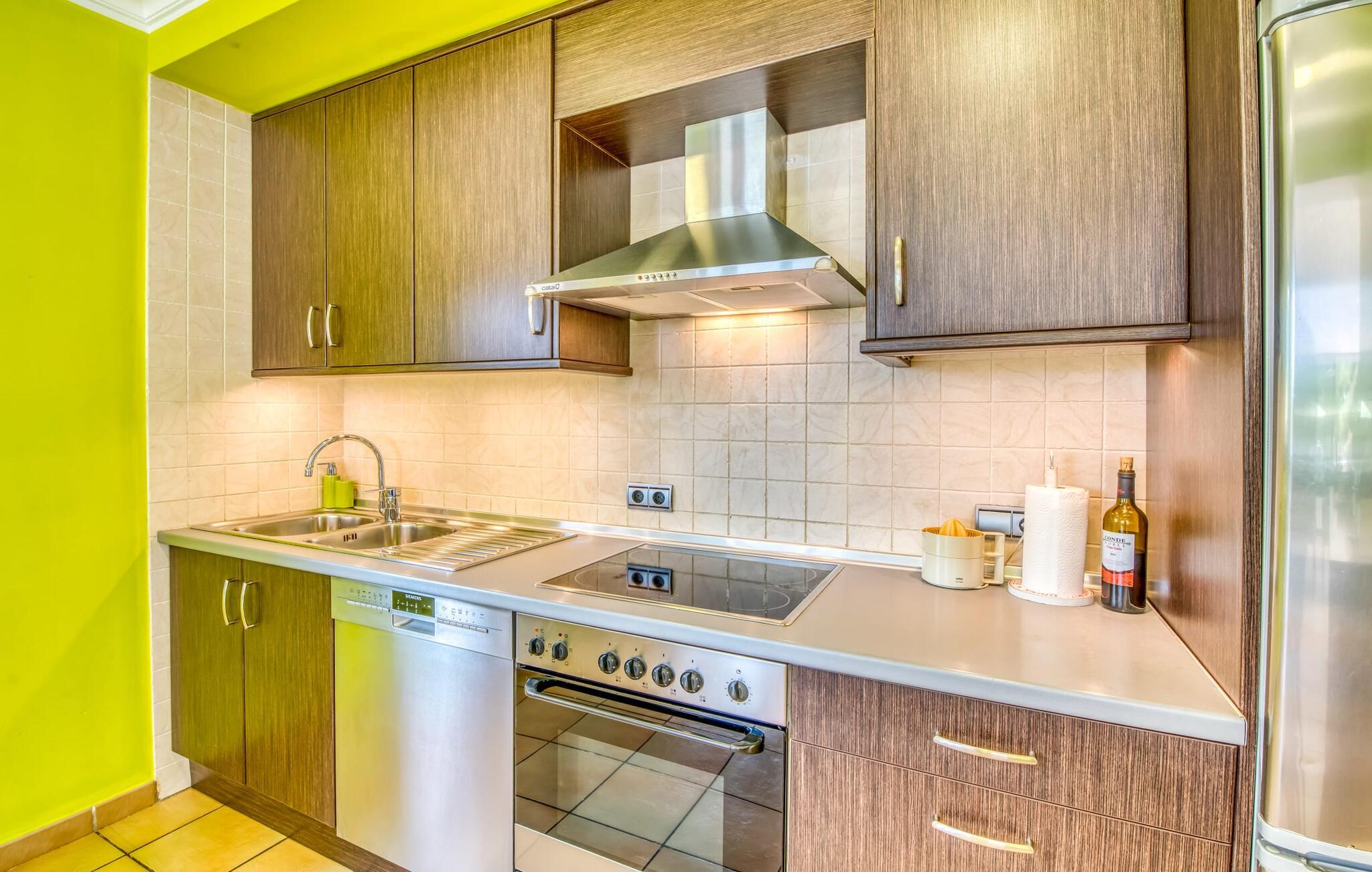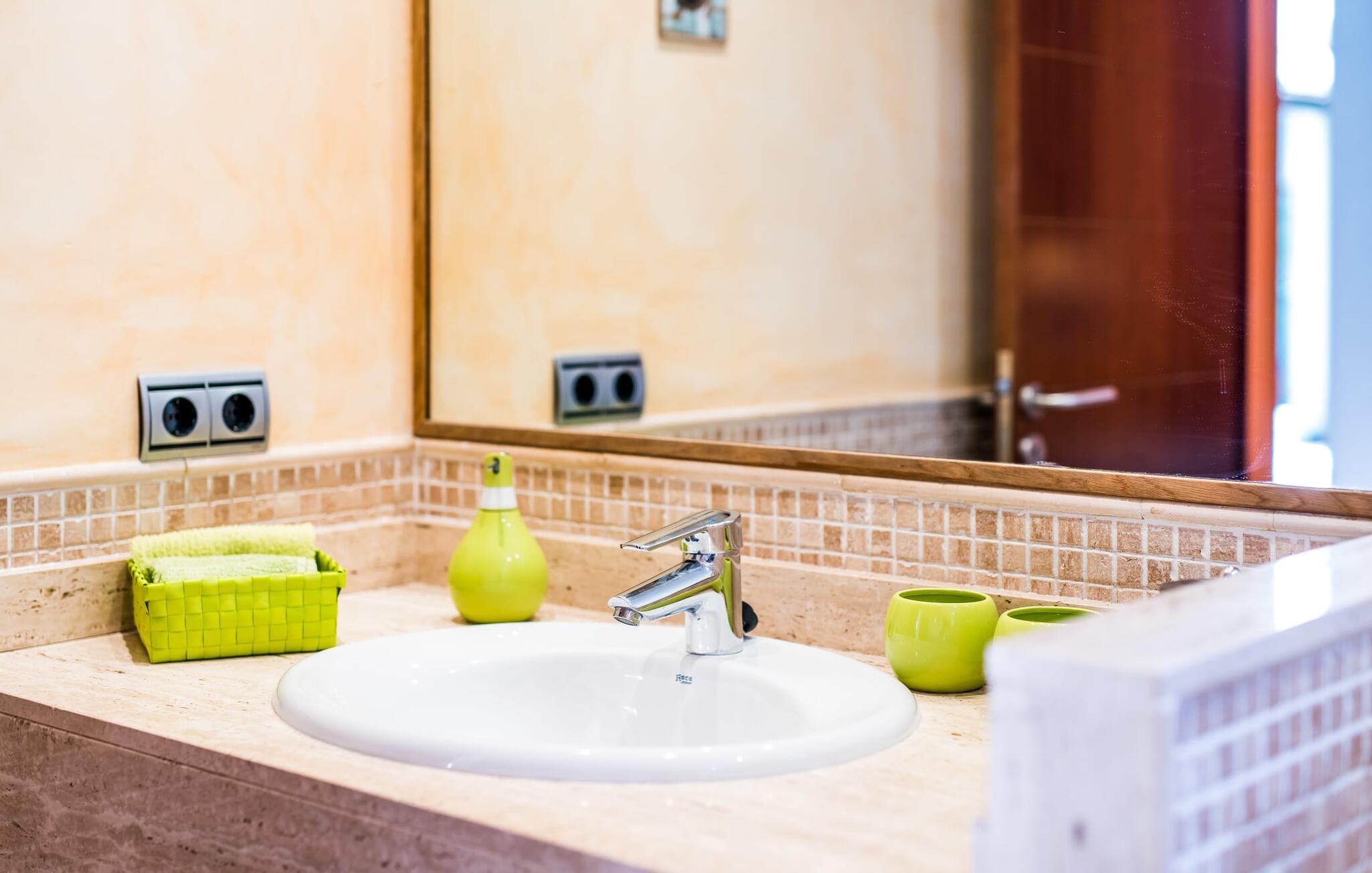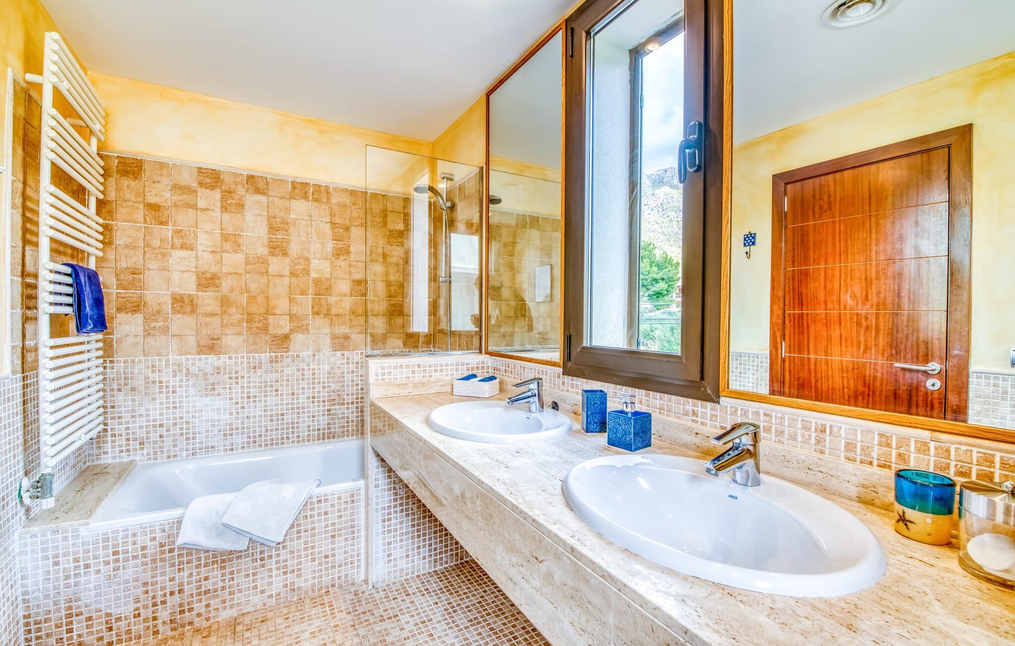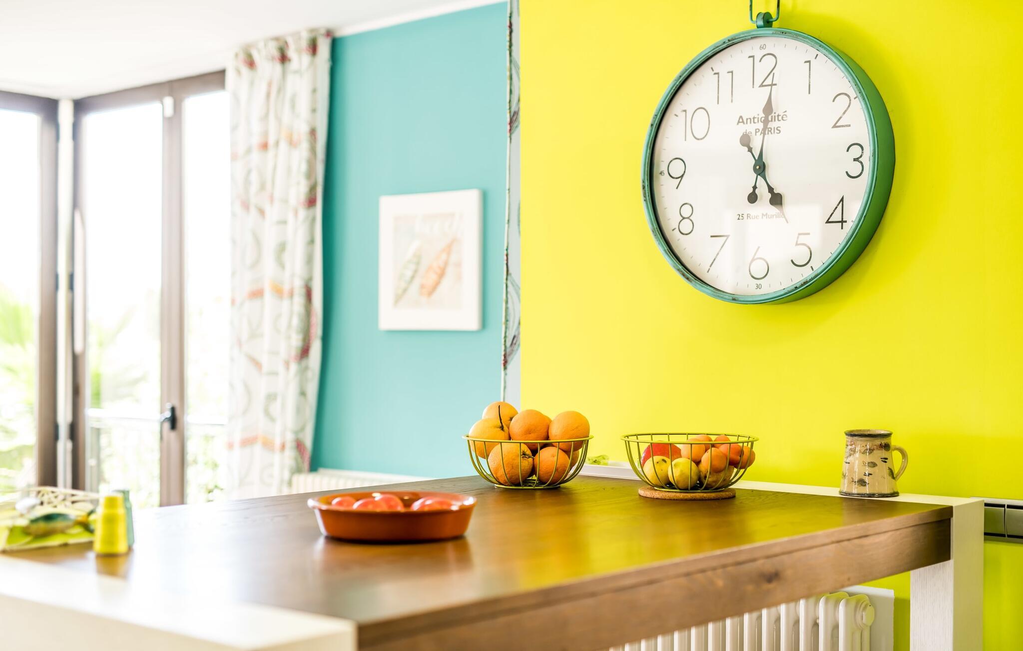 Villa Esmeralda Turquesa utnytter naturlige lyskilder som en del av arkitekturen, og forfrisker den med et levende og dynamisk interiør. De friske fargetonene gir hvert rom sin egen individuelle karakter. Gjennom panoramavinduene kommer det uhindret dagslys inn i alle rom. Typisk for Mallorca er de lyse sandsteinsveggene som fremhever villaens muntre fargeaksenter, som er synlige fra alle vinkler. Huset har tre soverom, hvert med en dobbeltseng (180 x 200 cm). Eierne stiller gjerne en barneseng til disposisjon ved behov. To av soverommene har bad i direkte tilknytning. To av dem har badekar, ideelt for et avslappende bad. Villaen er ideell for tre par som ønsker å nyte tiden sammen, samtidig som de har en viss grad av uavhengighet og privatliv. Tre bad! Kjøkkenet er velutstyrt: oppvaskmaskin, komfyr og avtrekkshette, kaffe- og espressomaskin, et godt utvalg av urter og krydder til dine favorittoppskrifter. Frokostbaren er perfekt for en rask matbit mellom måltidene eller for å starte dagen på egen hånd med en bolle müsli. Et gratis glass vin venter på deg ved ankomst. I den tilstøtende spisestuen er det et stort eikebord med plass til åtte personer. Ved siden av kjøkkenet ligger den åpne stuen, som du også kommer til via trappen. Her kan du tilbringe koselige timer i den komfortable skinnsofaen. Enten du bare vil legge opp føttene og se en film på flatskjerm-TV-en, nyte utsikten over middelhavshagen fra terrassen eller skue ut mot havet i bakgrunnen. Galleriet i første etasje garanterer den beste utsikten for å se den spektakulære solnedgangen. Strandutstyr som parasoller, strandmatter, en kjølebag, solsenger til stranden og sandleker til barna er tilgjengelig for gjestene i huset.