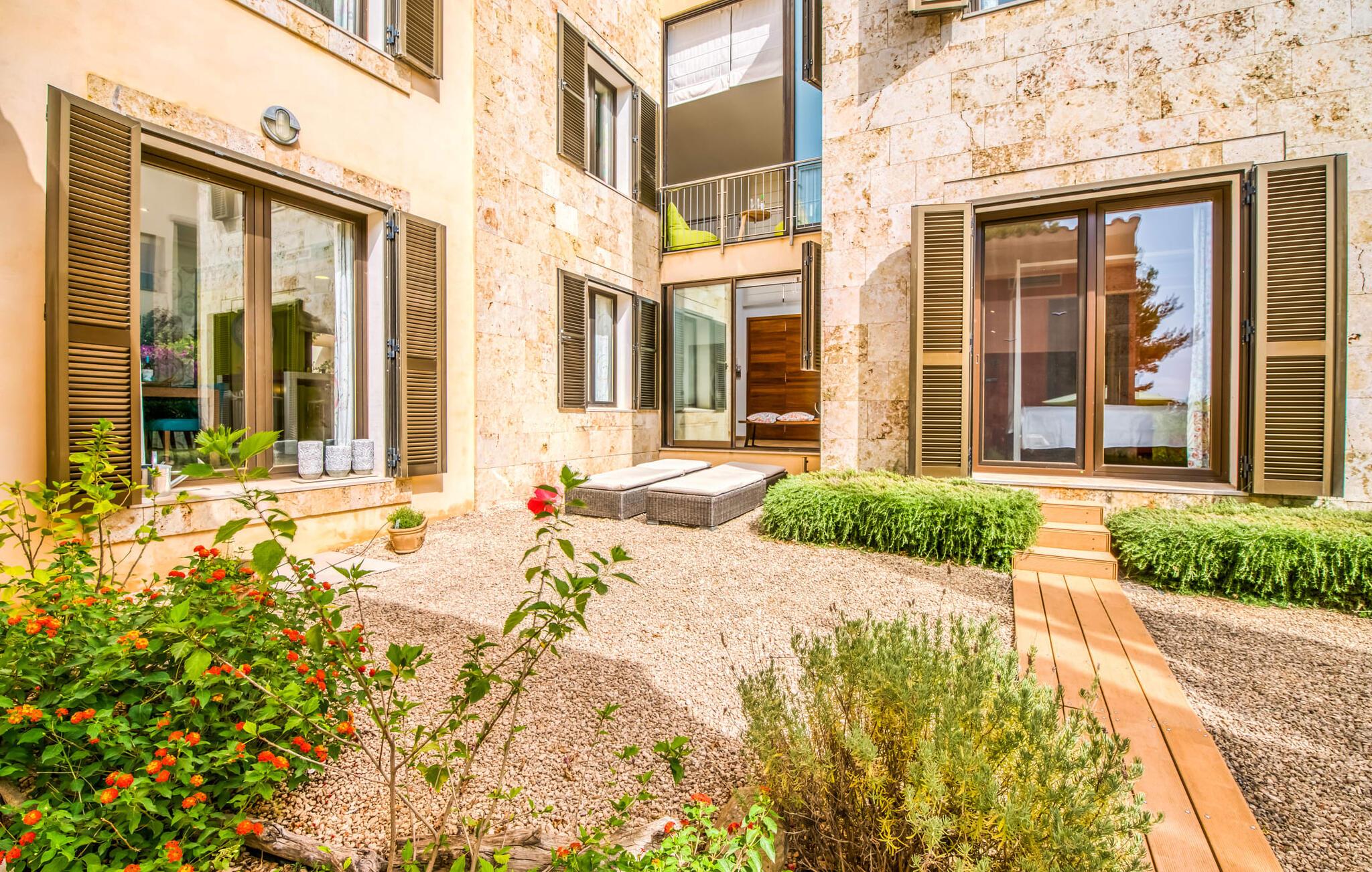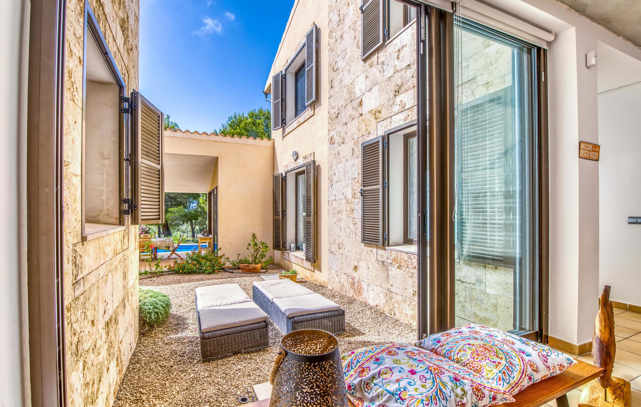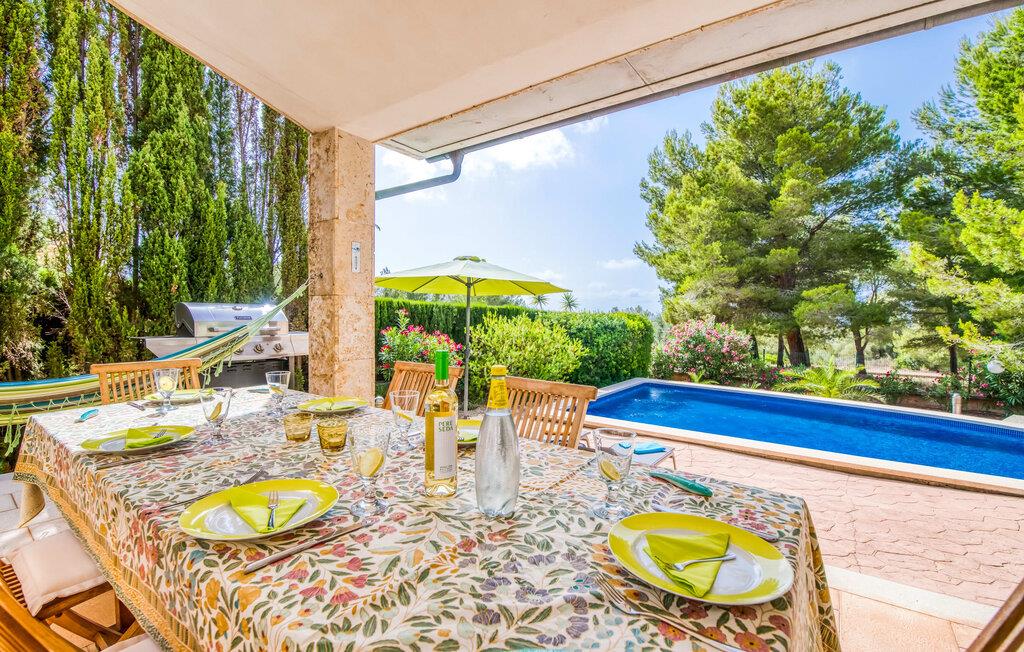 Forestill deg følgende: Et asurblått basseng som lokker i sollyset. En fantastisk stor bassengterrasse med seks solsenger og fantastisk utsikt over det ville fjellandskapet i Sierra de Levante. Det er et fantastisk utvalg av middelhavsplanter i nærheten: Bougainvillea, oleander og furu ... en blanding av dufter som ville fått førsteklasses parfymører til å gå i ekstase. Et pust av salt havluft svever over din private oase fra bredden av det grønne, ubebygde naturreservatet bare 1 km unna. På terrassen kan du nyte solen ... ta en pause i skyggen av furutreet ditt. Eller slapp av i strandstolen og legg til et maritimt preg på hagen din. Slapp av på den store overbygde terrassen før en ettermiddagssiesta. En luksuriøs, gassdrevet grill venter på deg der, slik at du raskt kan trylle frem et deilig måltid. Om kvelden inviterer det opplyste bassenget deg til et forfriskende kveldsbad.