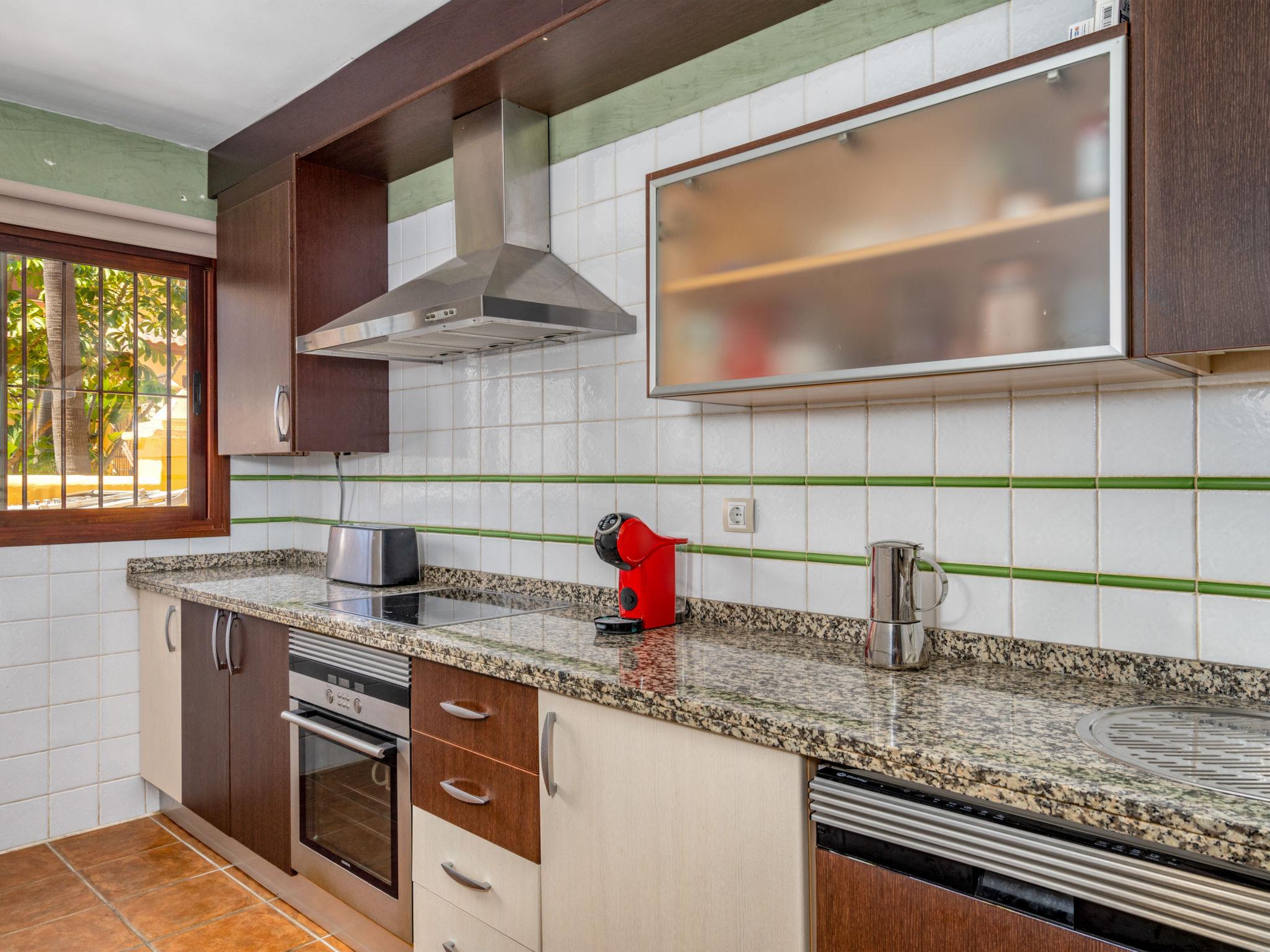 "Mirador de Marina", 4-room terraced house 160 m2 on 3 levels. Very practical and comfortable furnishings: living/dining room with open-hearth fireplace, dining table, bathroom, digital TV and air conditioning. Exit to the terrace. 1 double bedroom with 1 french bed (160 cm, length 190 cm), bathroom, air conditioning and forced-air heating. 1 double bedroom with 1 french bed (150 cm, length 190 cm), air conditioning and forced-air heating. 1 double bedroom with 2 beds (90 cm, length 190 cm), air conditioning and forced-air heating. Kitchen (oven, dishwasher, 4 ceramic glass hob hotplates, toaster, kettle, microwave). Bathroom. Terrace furniture. Partial view of the sea. Facilities: washing machine, iron, children's high chair, baby cot, hair dryer. Internet (WiFi, free). Please note: non-smoking house. 1 small pet/ dog allowed. Smoke alarm, fire extinguisher. VUT/MA/65149 // Reg. Nr.: ESFCTU0000290400000766790000000000000000VUT/MA/651494