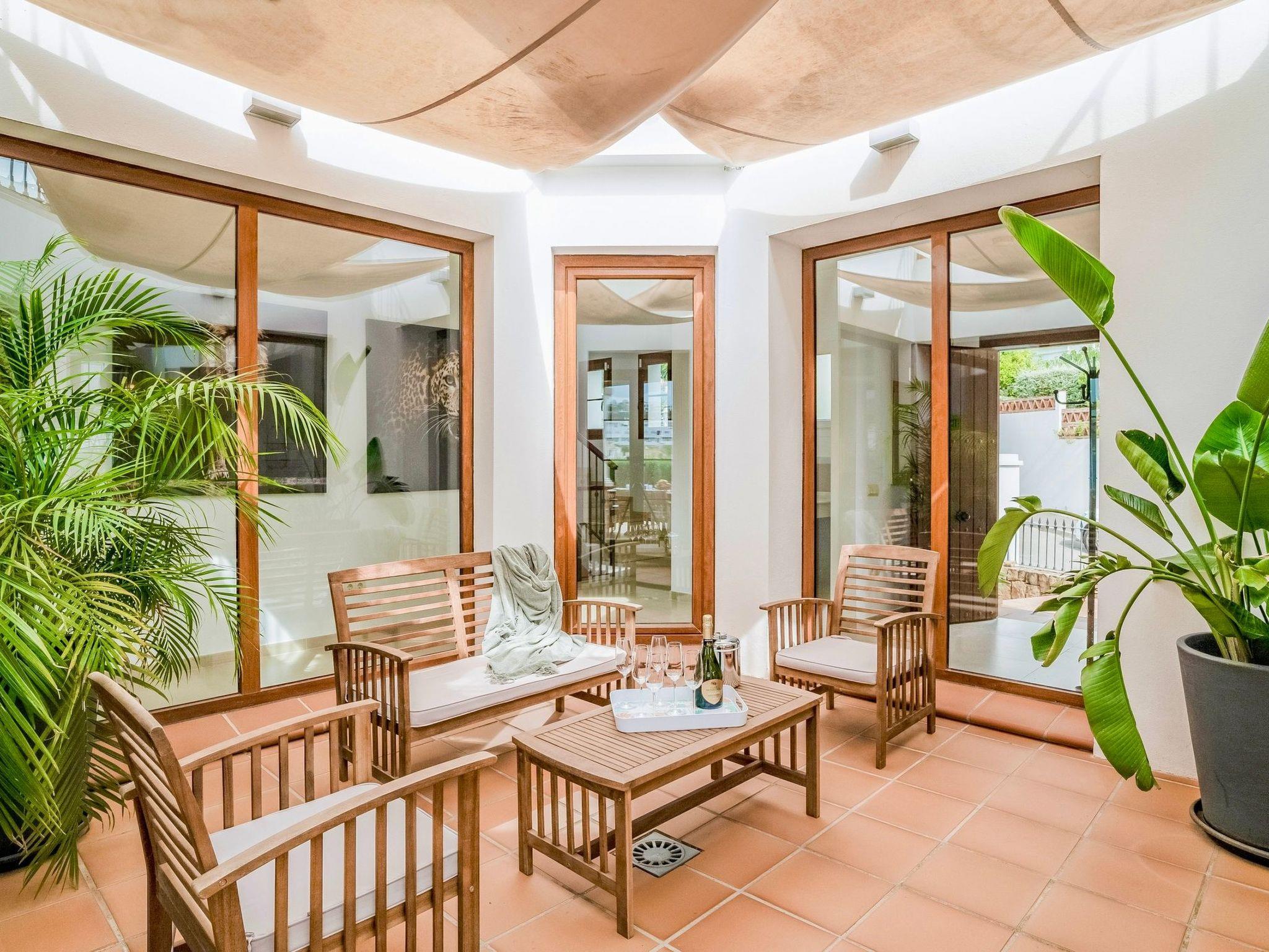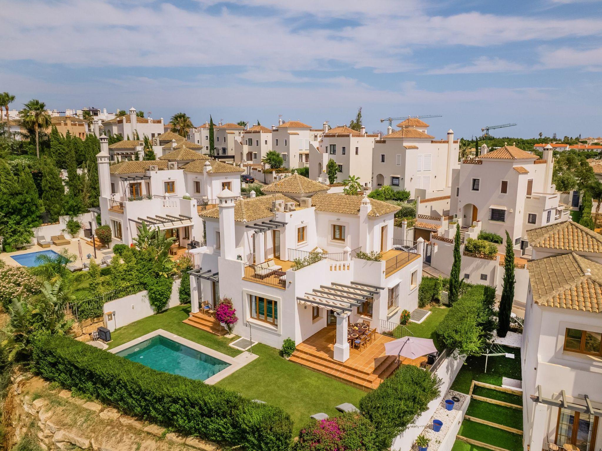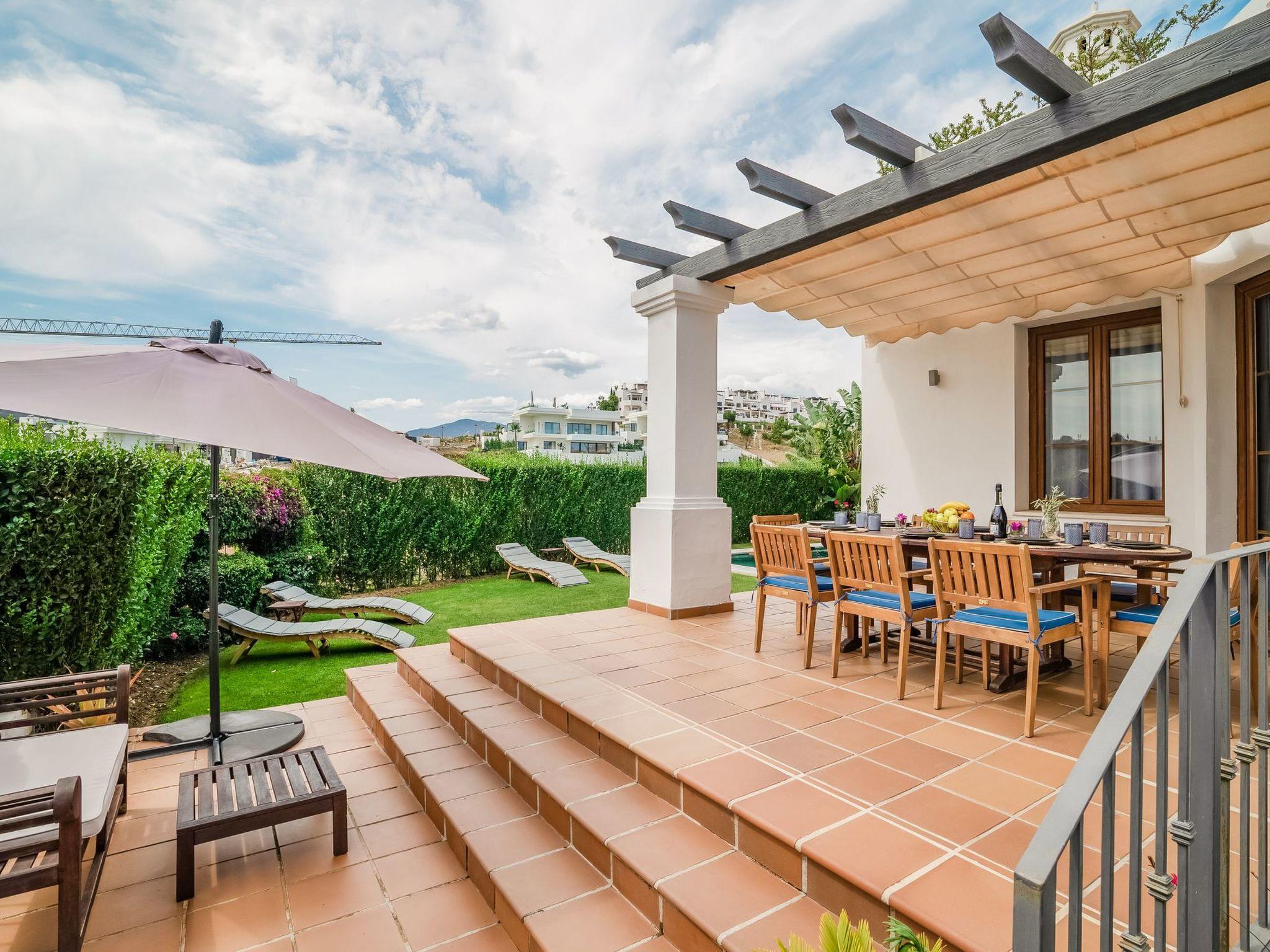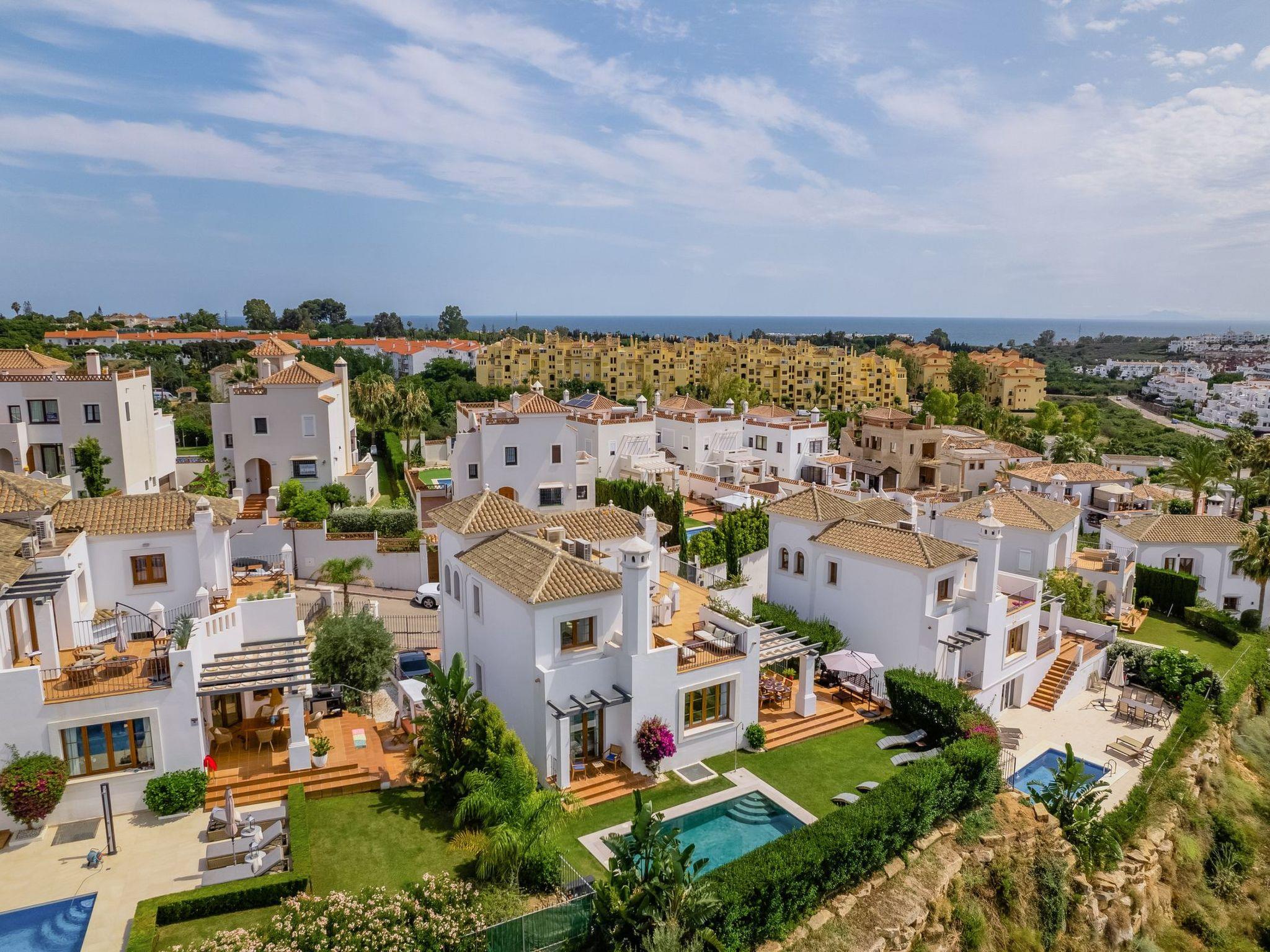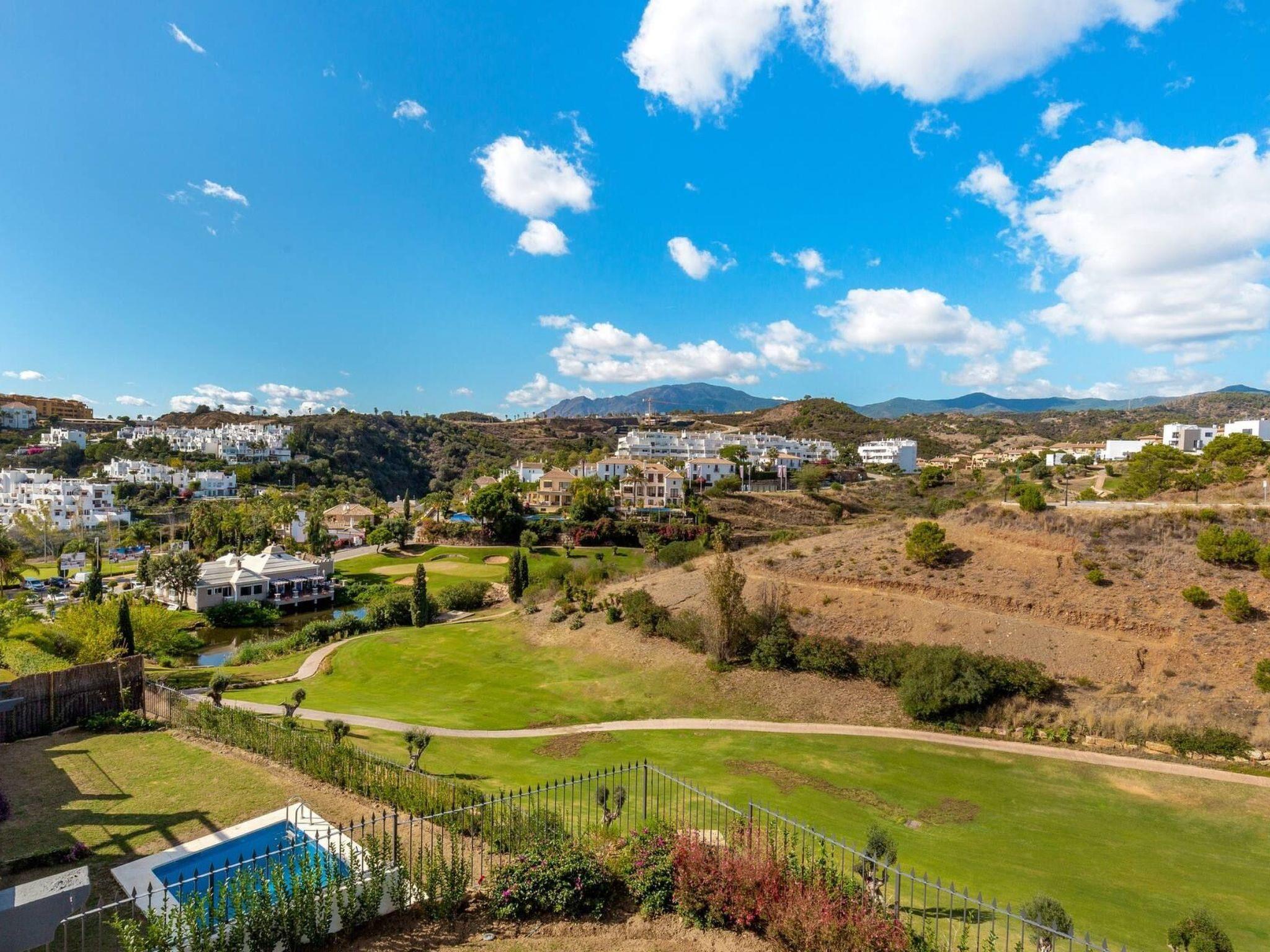 The exterior of the villa is a true paradise for outdoor lovers. It has a comfortable terrace with a gas barbecue and outdoor dining area, perfect for enjoying the warm evenings. There is also a lovely inner courtyard ideal for relaxing, as well as a heated swimming pool in winter surrounded by 8 sunbeds for sunbathing. Furthermore, from the roof terrace, you can admire breathtaking views of the sea, Gibraltar, the pool area and the golf courses, offering a perfect setting to create unforgettable memories.