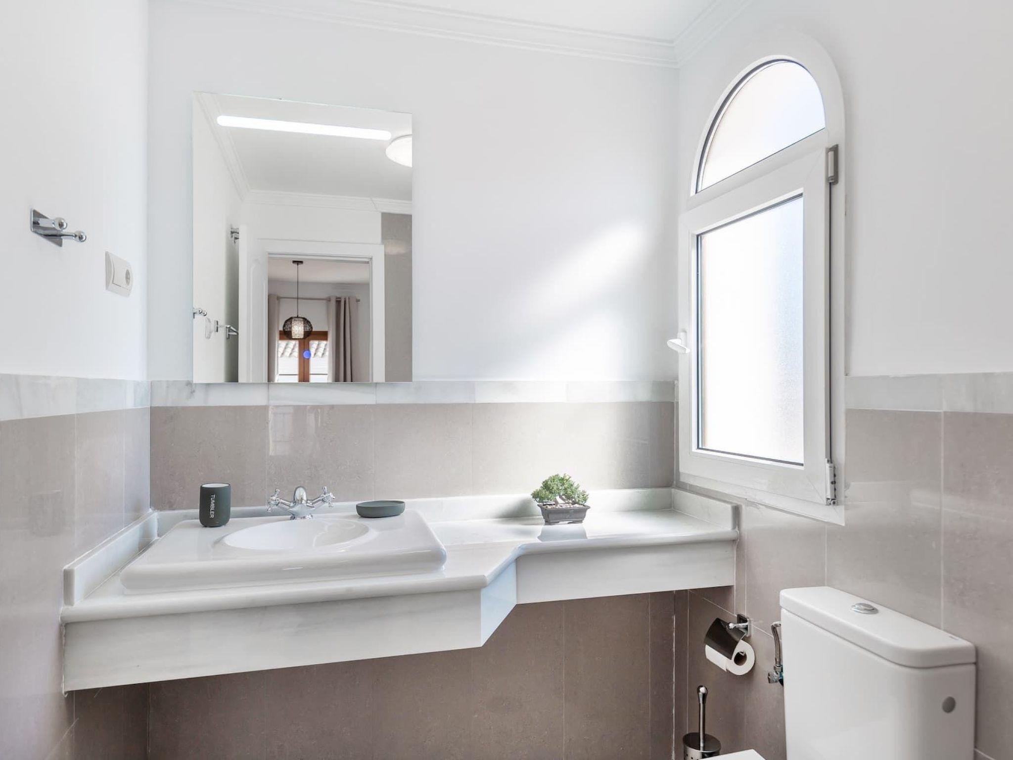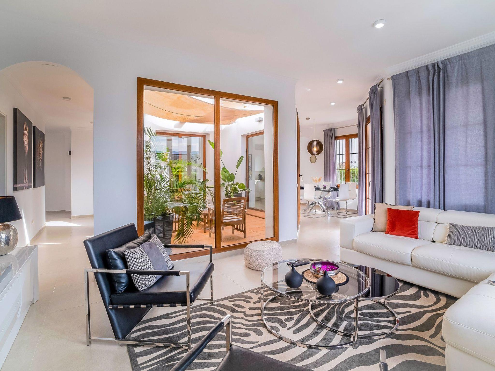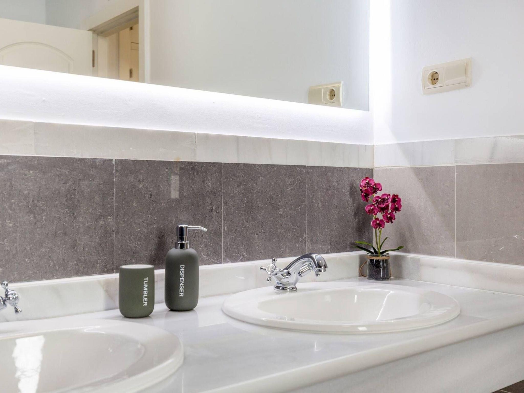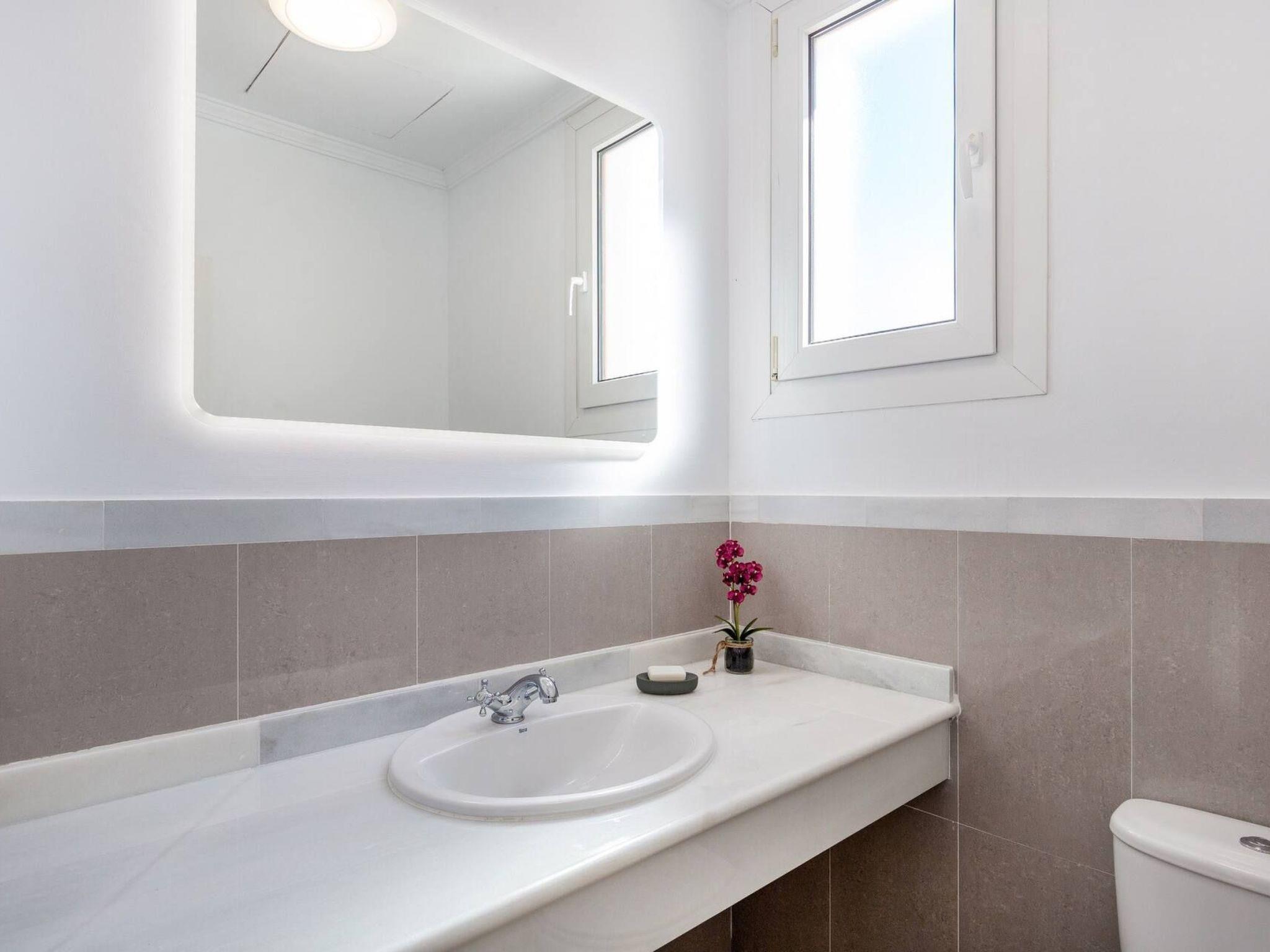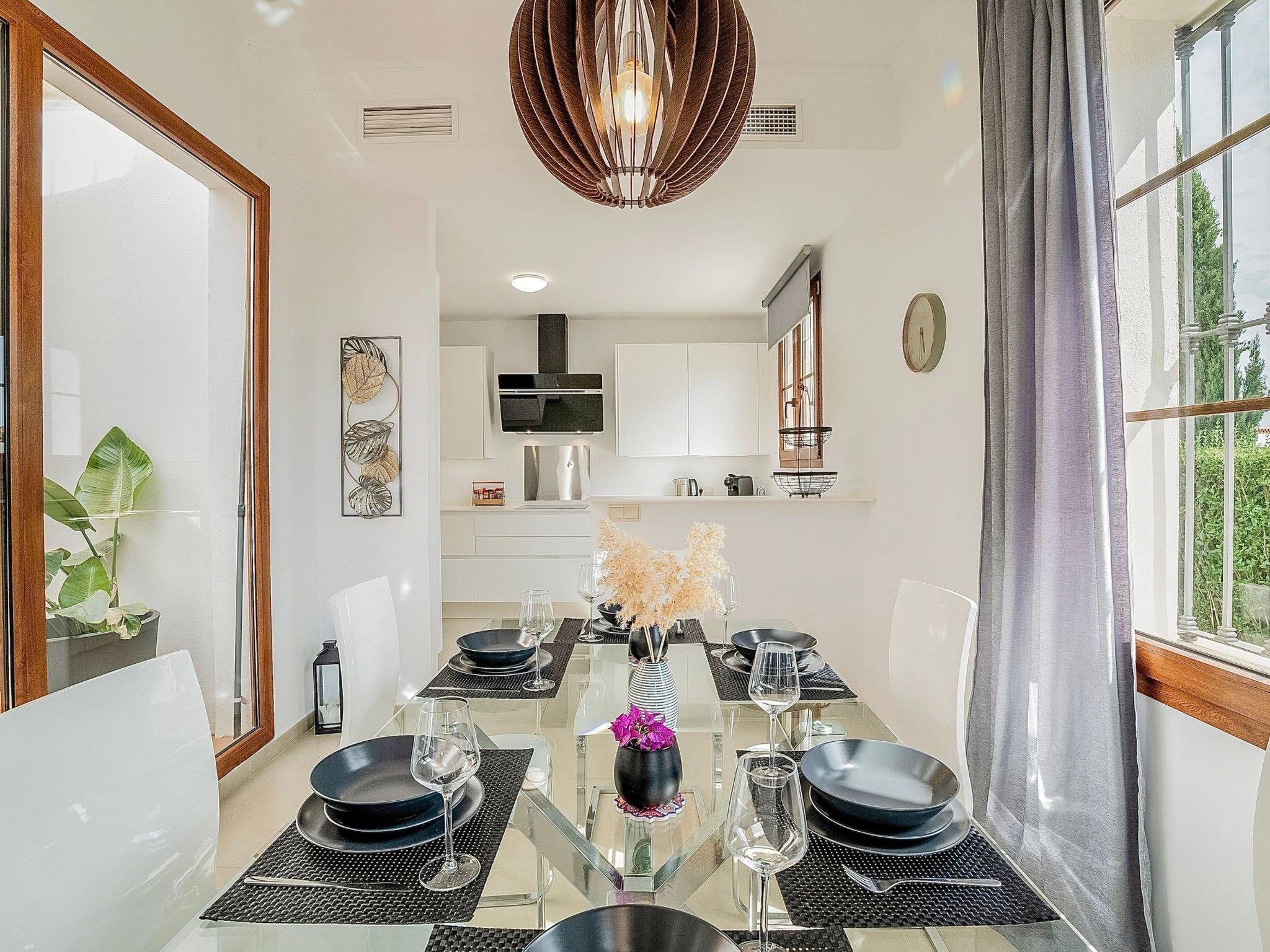 The exterior of the villa is a true paradise for outdoor lovers. It has a comfortable terrace with a gas barbecue and outdoor dining area, perfect for enjoying the warm evenings. There is also a lovely inner courtyard ideal for relaxing, as well as a heated swimming pool in winter surrounded by 8 sunbeds for sunbathing. Furthermore, from the roof terrace, you can admire breathtaking views of the sea, Gibraltar, the pool area and the golf courses, offering a perfect setting to create unforgettable memories.