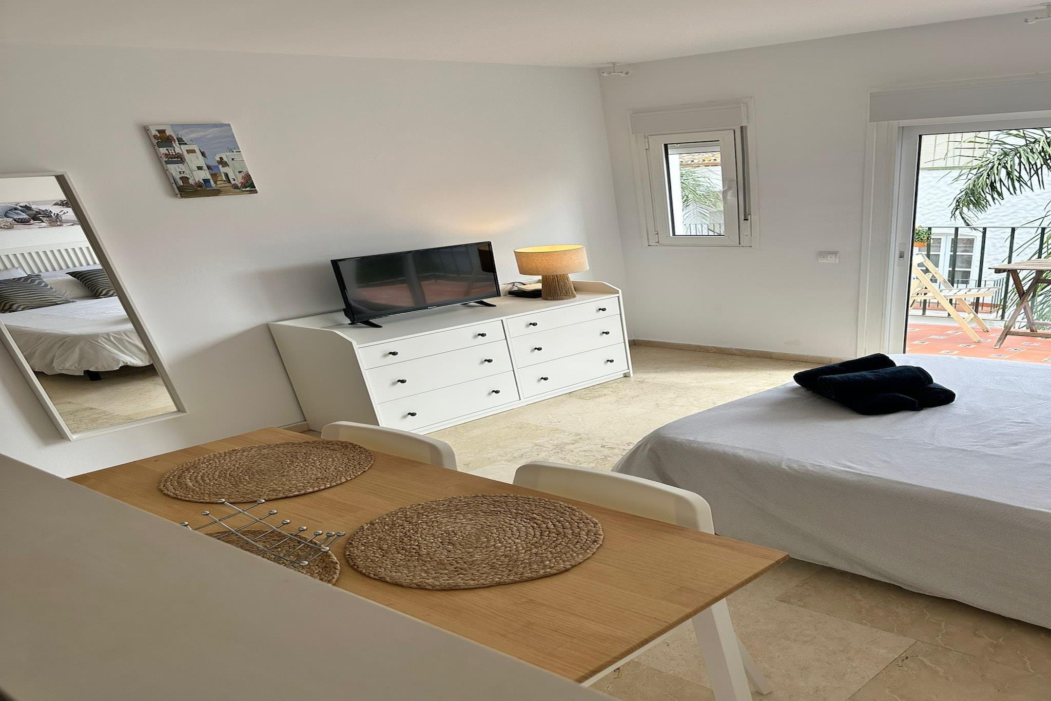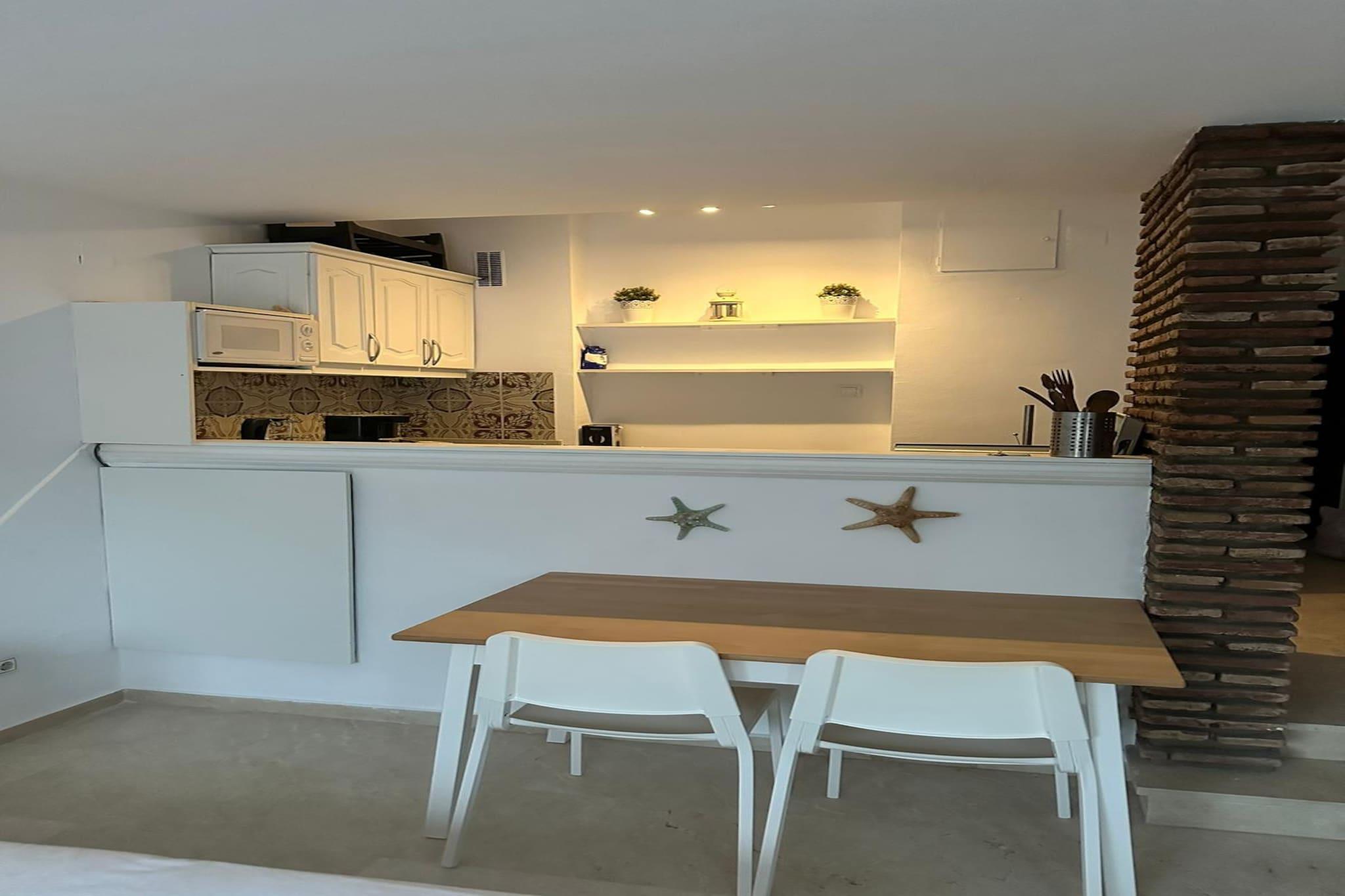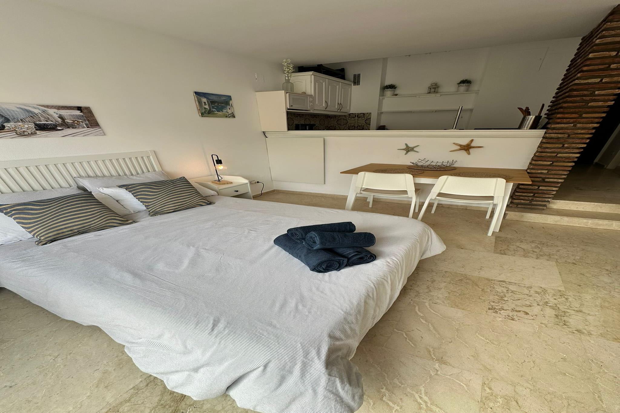 Eiendommen, sammen med sin koselige og fullt utstyrte design, tilbyr et komfortabelt 25 m² stort studio, ideelt for innkvartering av opptil to gjester. Studioet er omtenksomt innredet med sentralvarme og klimaanlegg, noe som sikrer komfort hele året. Gjestene kan nyte balkongen, som gir et fredelig sted å slappe av. Ytterligere fasiliteter inkluderer et felles svømmebasseng, Wi-Fi, en vaskemaskin, myggnett i hele boligen og en TV for underholdning. Eiendommen ligger i Estepona, og har en førsteklasses beliggenhet med lett tilgang til lokale fasiliteter og attraksjoner. Det ligger bare 50 meter fra en restaurant, 75 meter fra en busstasjon og 150 meter fra et supermarked, noe som sikrer at gjestene har alt de trenger innen gangavstand. Sandstranden ligger bare 500 meter unna, mens du finner en golfbane 800 meter fra studioet. Estepona sentrum er en kort 3-kilometers kjøretur, og tilbyr en rekke butikker og kulturelle opplevelser. Den nærmeste flyplassen ligger 60 kilometer unna, noe som gjør beliggenheten både tilgjengelig og praktisk for reisende. Ettromsleiligheten har et fullt utstyrt kjøkken med moderne apparater, inkludert kjøleskap, mikrobølgeovn, stekeovn og fryser, samt nødvendig kjøkkenutstyr. Ytterligere fasiliteter som kaffemaskin, brødrister, vannkoker og juicer er også tilgjengelig, slik at du enkelt kan tilberede måltider og nyte drinker. Dette praktiske kjøkkenoppsettet sikrer at gjestene fullt ut kan nyte en selvbetjent opplevelse.