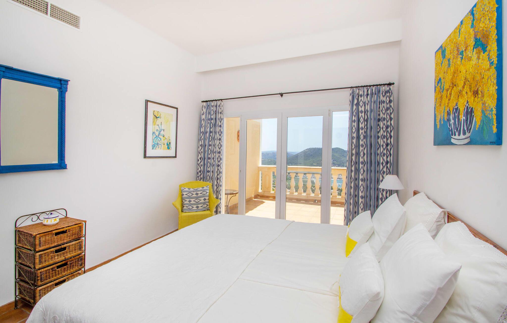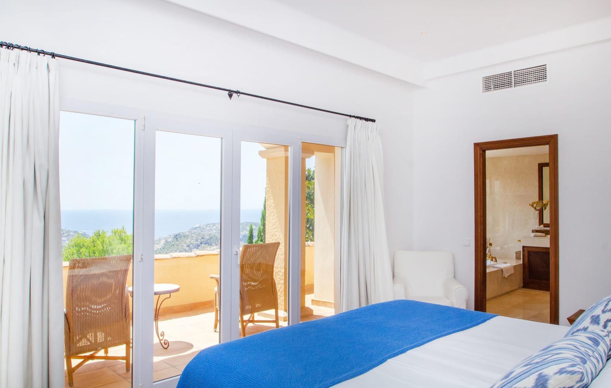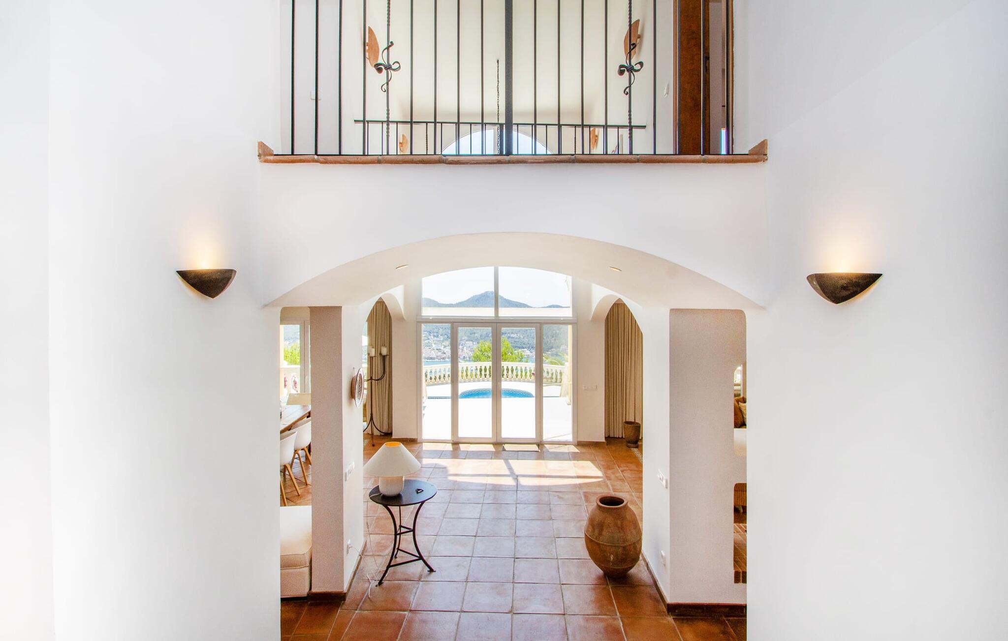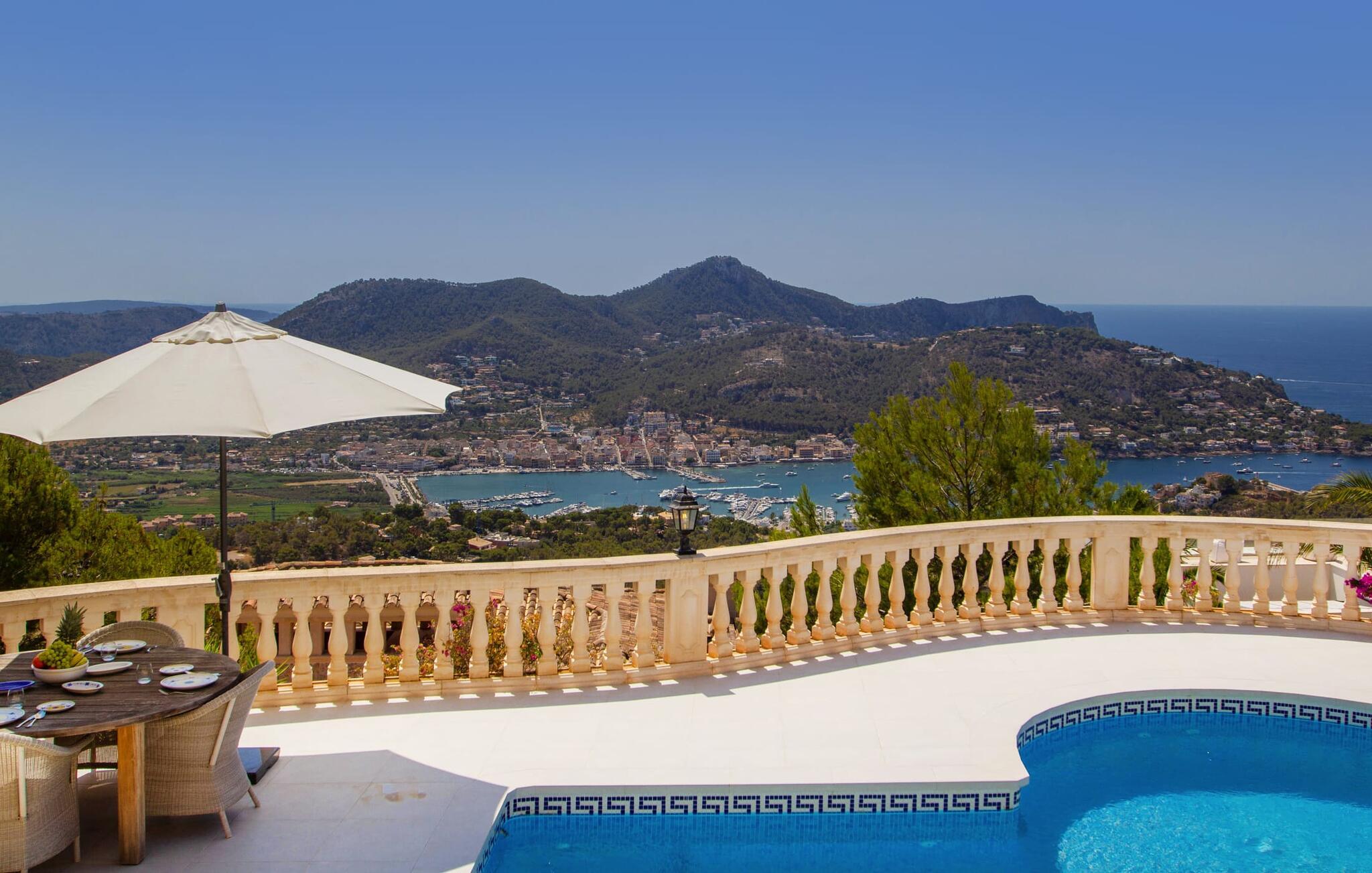 Man kan bare snakke om ferievillaen Port d'Andratx i superlativer: En av de mest stilfulle villaene troner på en enestående tilbaketrukket beliggenhet i et av Mallorcas mest prestisjefylte villastrøk, i Mont Ports, over den flotteste havnebyen som øya Mallorca har å by på. Den gule og hvite boligen byr på absolutt luksus med mange terrasser og balkonger omgitt av frodig middelhavsvegetasjon. Majestetiske palmer, fioler, skimrende bougainvilleaer, sypresser, oliventrær, Middelhavet og Tramuntana-fjellene danner et uforglemmelig panorama som du kan nyte fra denne utrolige villaen. Og du kan nyte absolutt privatliv ved å ta en dukkert i det organisk formede bassenget, som også kan varmes opp og derfor kan brukes utover høysesongen. Å slappe av på en av de komfortable solsengene under parasollen er den ultimate måten å koble av på. Herlig, ikke sant? På grunn av beliggenheten i åssiden på den såkalte Millionaire's Hill, fører en utvendig trapp fra bassengområdet til de overbygde terrassene ved huset. Her finner du flere solsenger, samt sittegrupper og spiseplasser. Du kan sette deg godt til rette på utekjøkkenet, hvor du kan tilberede måltidene dine og nyte det imponerende kveldspanoramaet over den opplyste havnebyen fra komfortable kurvstoler.