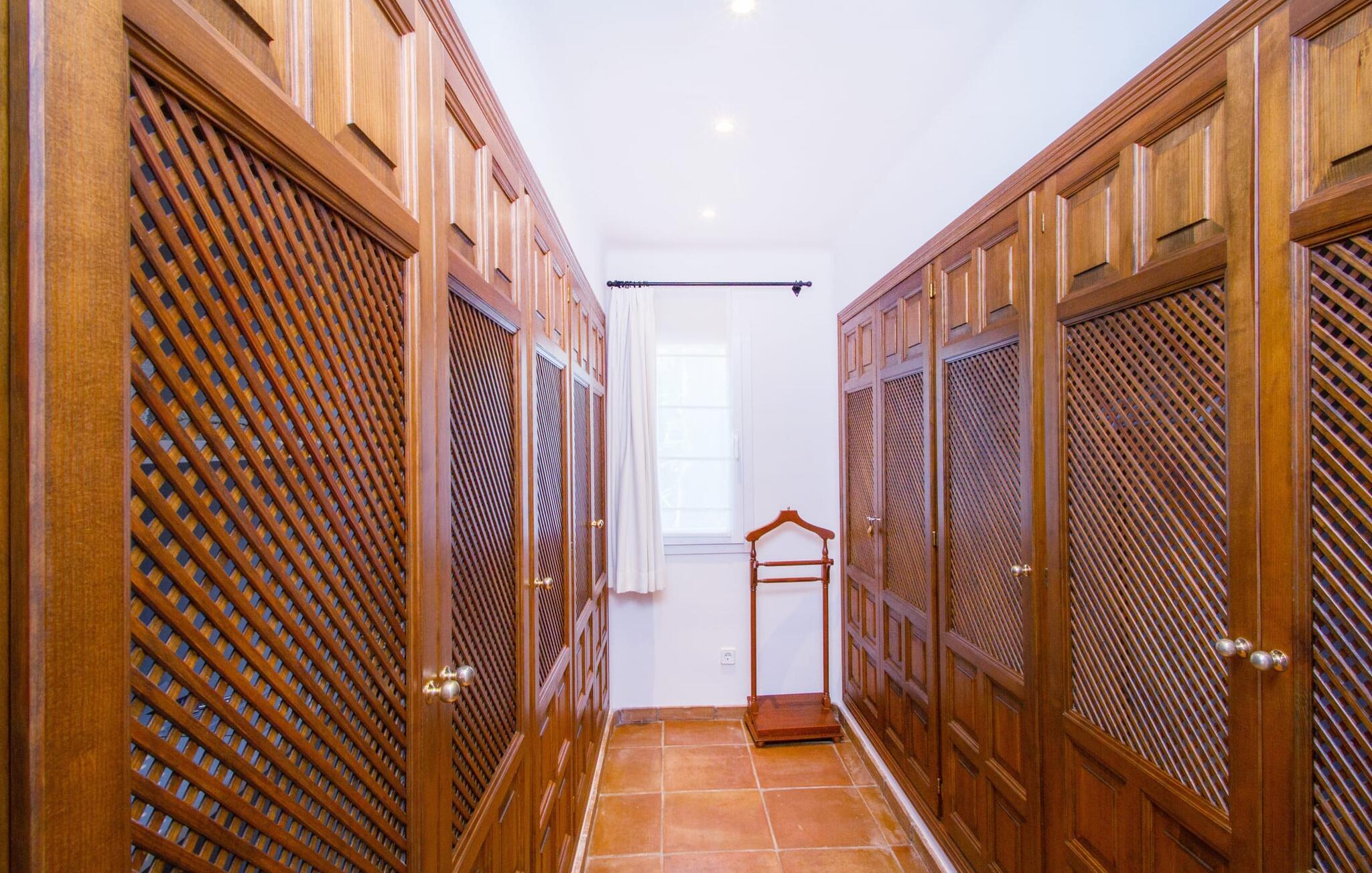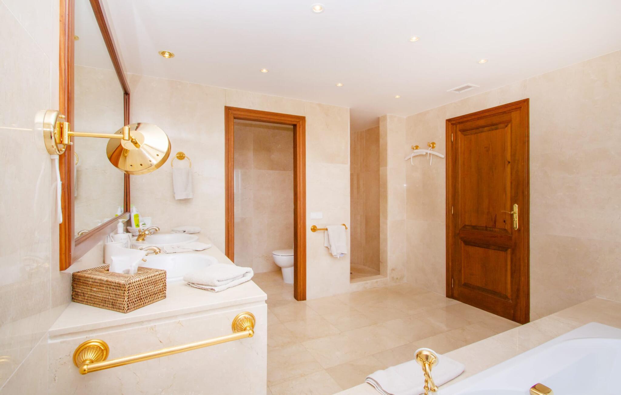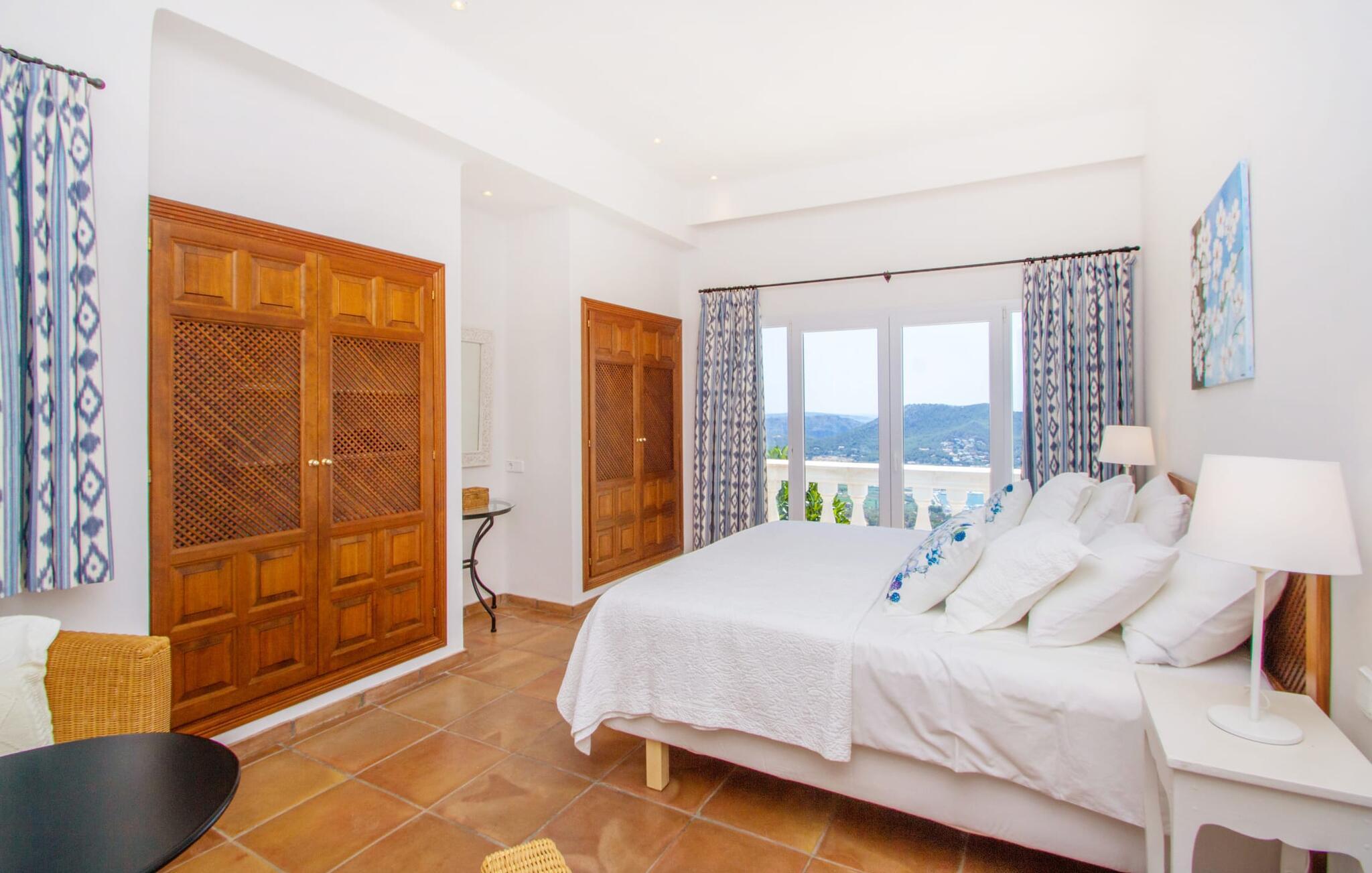 Man kan bare snakke om ferievillaen Port d'Andratx i superlativer: En av de mest stilfulle villaene troner på en enestående tilbaketrukket beliggenhet i et av Mallorcas mest prestisjefylte villastrøk, i Mont Ports, over den flotteste havnebyen som øya Mallorca har å by på. Den gule og hvite boligen byr på absolutt luksus med mange terrasser og balkonger omgitt av frodig middelhavsvegetasjon. Majestetiske palmer, fioler, skimrende bougainvilleaer, sypresser, oliventrær, Middelhavet og Tramuntana-fjellene danner et uforglemmelig panorama som du kan nyte fra denne utrolige villaen. Og du kan nyte absolutt privatliv ved å ta en dukkert i det organisk formede bassenget, som også kan varmes opp og derfor kan brukes utover høysesongen. Å slappe av på en av de komfortable solsengene under parasollen er den ultimate måten å koble av på. Herlig, ikke sant? På grunn av beliggenheten i åssiden på den såkalte Millionaire's Hill, fører en utvendig trapp fra bassengområdet til de overbygde terrassene ved huset. Her finner du flere solsenger, samt sittegrupper og spiseplasser. Du kan sette deg godt til rette på utekjøkkenet, hvor du kan tilberede måltidene dine og nyte det imponerende kveldspanoramaet over den opplyste havnebyen fra komfortable kurvstoler.