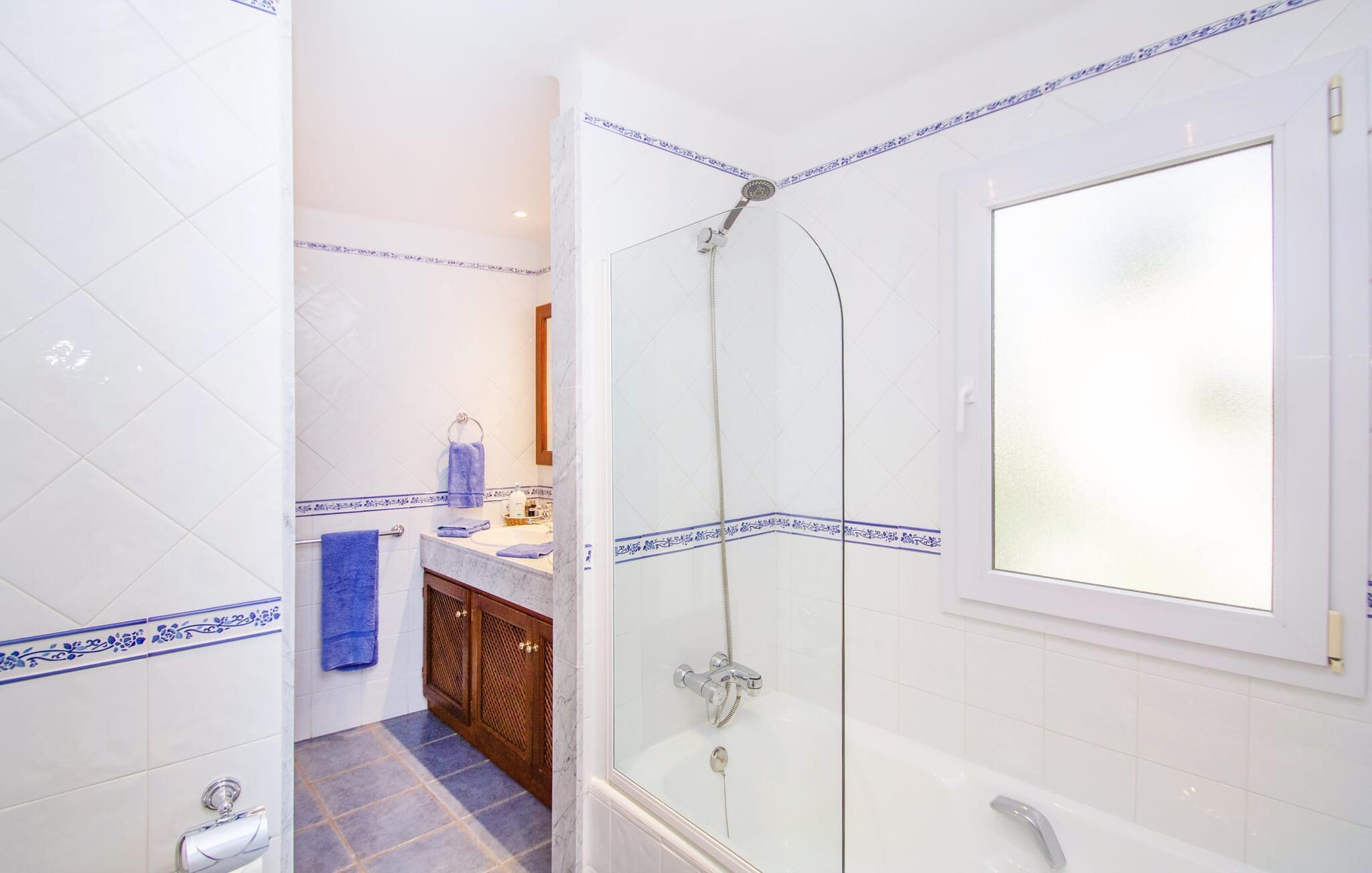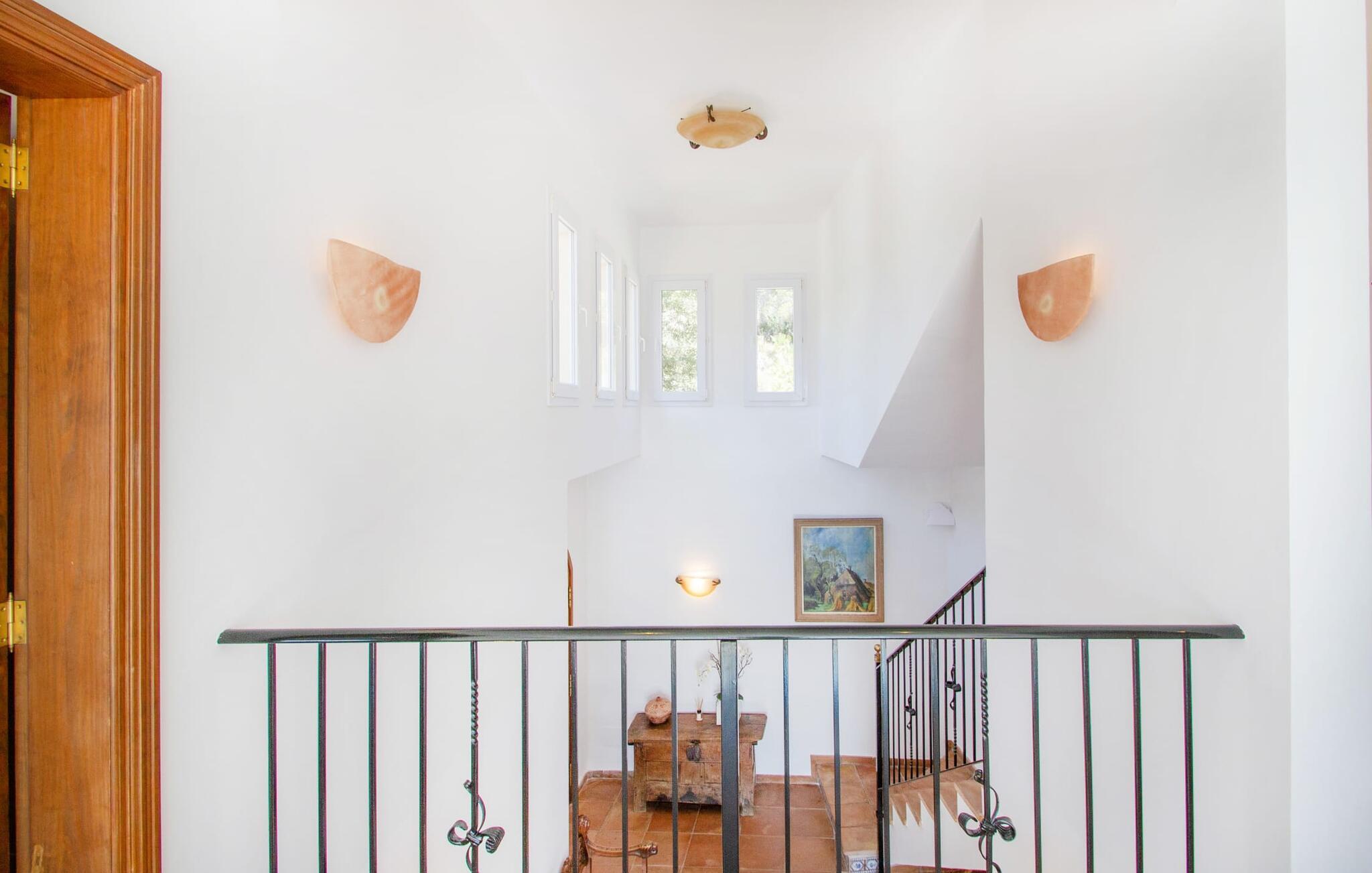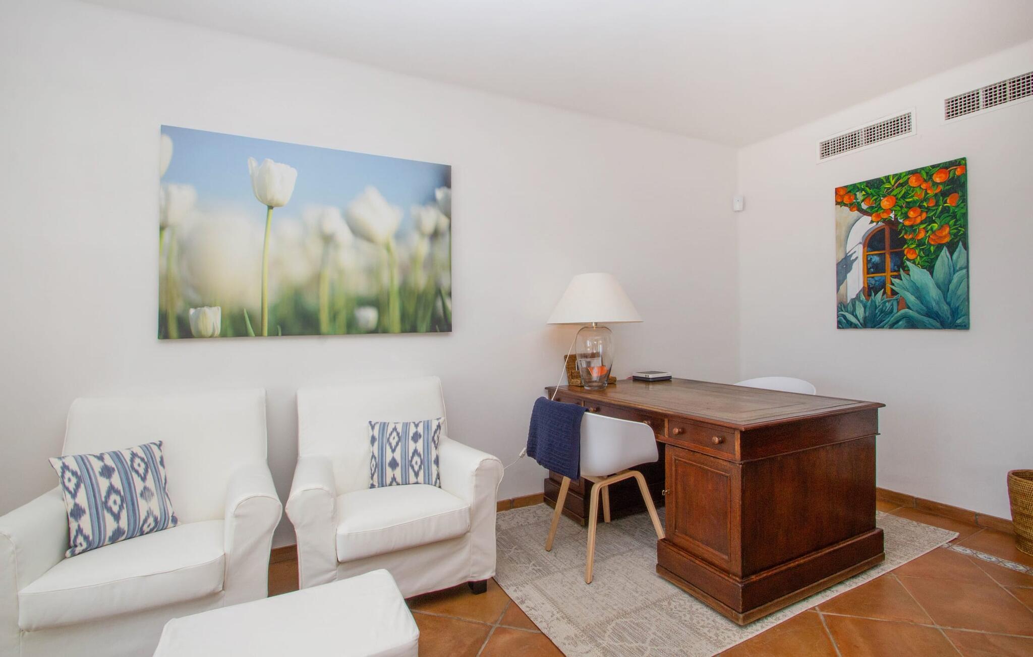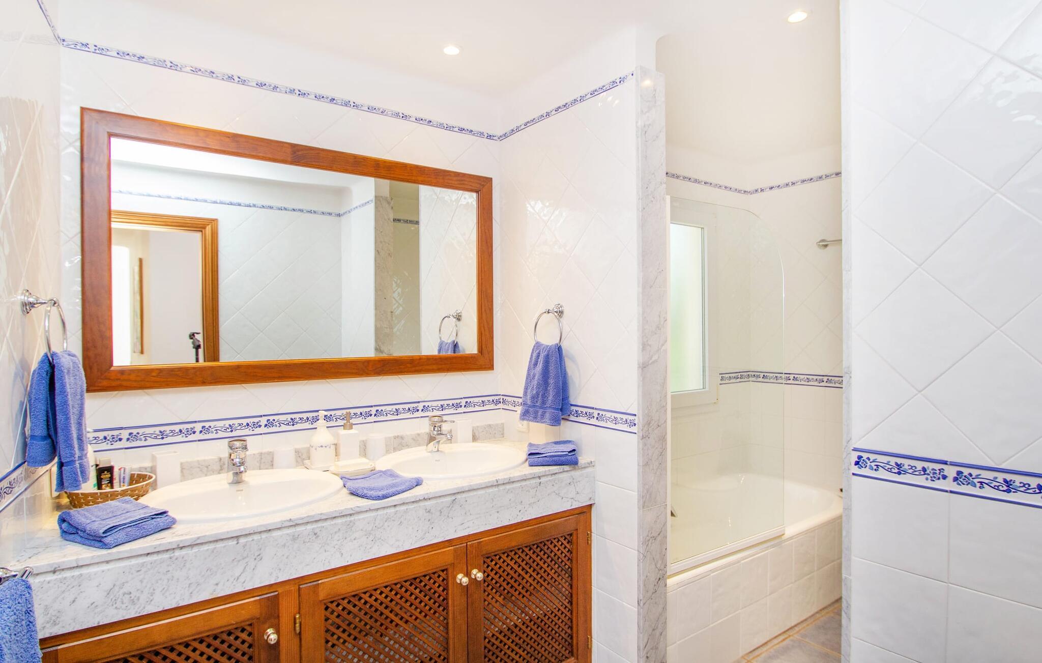 Man kan bare snakke om ferievillaen Port d'Andratx i superlativer: En av de mest stilfulle villaene troner på en enestående tilbaketrukket beliggenhet i et av Mallorcas mest prestisjefylte villastrøk, i Mont Ports, over den flotteste havnebyen som øya Mallorca har å by på. Den gule og hvite boligen byr på absolutt luksus med mange terrasser og balkonger omgitt av frodig middelhavsvegetasjon. Majestetiske palmer, fioler, skimrende bougainvilleaer, sypresser, oliventrær, Middelhavet og Tramuntana-fjellene danner et uforglemmelig panorama som du kan nyte fra denne utrolige villaen. Og du kan nyte absolutt privatliv ved å ta en dukkert i det organisk formede bassenget, som også kan varmes opp og derfor kan brukes utover høysesongen. Å slappe av på en av de komfortable solsengene under parasollen er den ultimate måten å koble av på. Herlig, ikke sant? På grunn av beliggenheten i åssiden på den såkalte Millionaire's Hill, fører en utvendig trapp fra bassengområdet til de overbygde terrassene ved huset. Her finner du flere solsenger, samt sittegrupper og spiseplasser. Du kan sette deg godt til rette på utekjøkkenet, hvor du kan tilberede måltidene dine og nyte det imponerende kveldspanoramaet over den opplyste havnebyen fra komfortable kurvstoler.