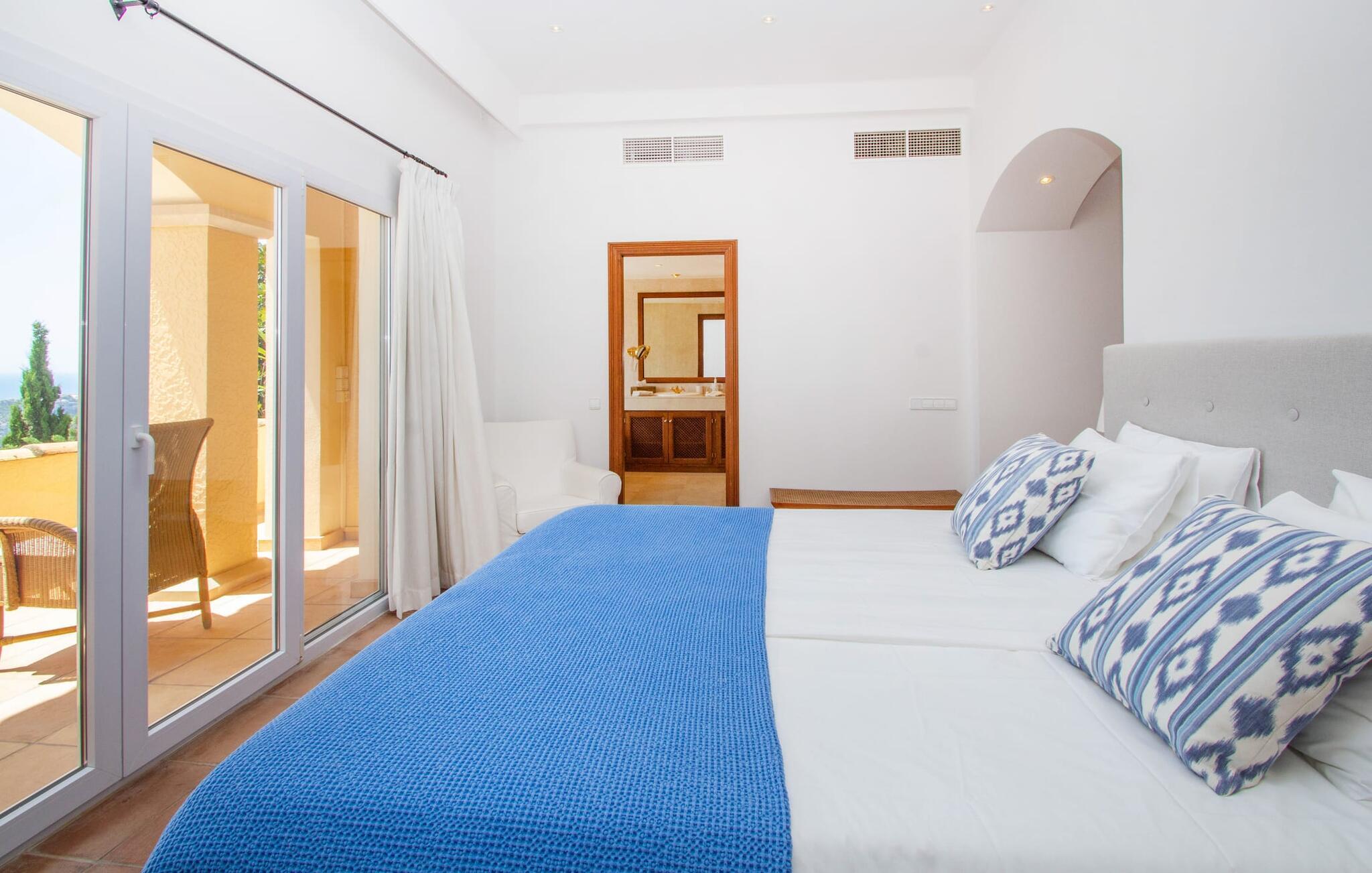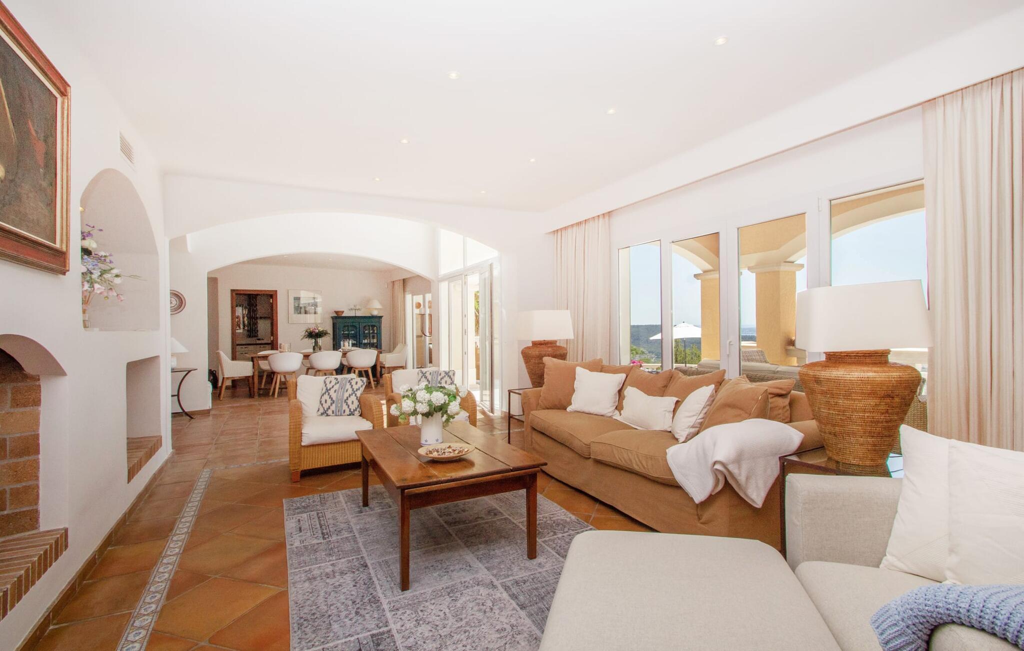 Det luksuriøse boarealet på 463 m² byr på en lys stue med mange terrasseutganger. Interiøret er innredet i naturlige farger og en moderne landlig stil. Terrakottagulvfliser, hvite vegger og innfelte spotlights skaper en hyggelig atmosfære der du umiddelbart vil føle deg hjemme. Et fullt utstyrt kjøkken er selvfølgelig også tilgjengelig. Alle soverommene ligger i øverste etasje. De er tilgjengelige via et halvåpent galleri, som gir utsikt over den interessante arkitekturen i dette unike huset. Alle soverommene har klimaanlegg og tilgang til en balkong. Alle rommene har utsikt over havnen og havet. Tre bad står til rådighet for å gjøre oppholdet ditt komplett, og hovedsoverommet får litt ekstra i form av et eget bad med stort badekar og gylne armaturer. Med gulvvarme kan du nyte godt av fordelene ved å bo i huset hele året. Og så må vi selvfølgelig ikke glemme at den gode solen i tillegg til det oppvarmede bassenget også byr på en innendørs badstue, en vintersjarm som det er vanskelig å motstå.
