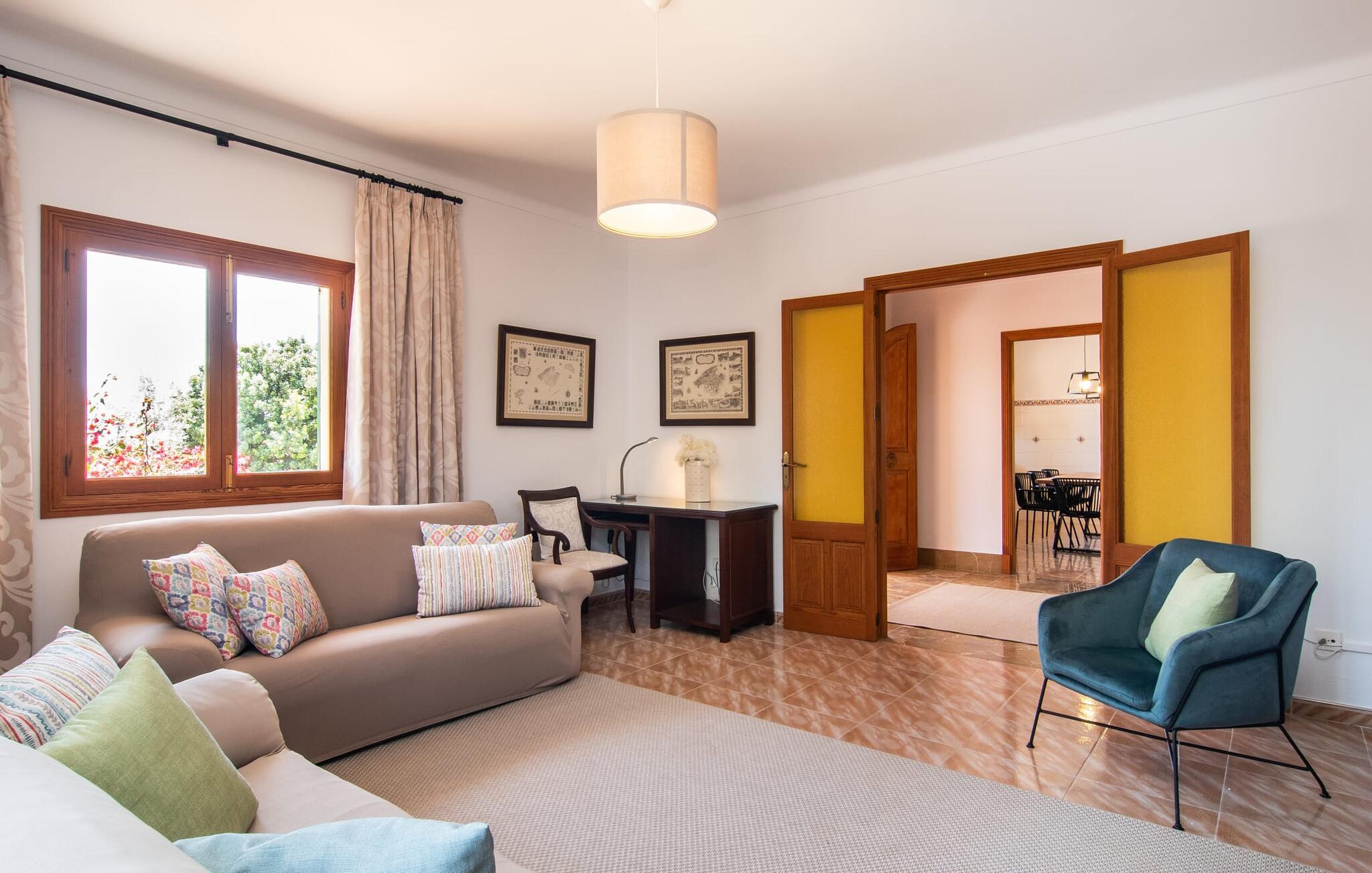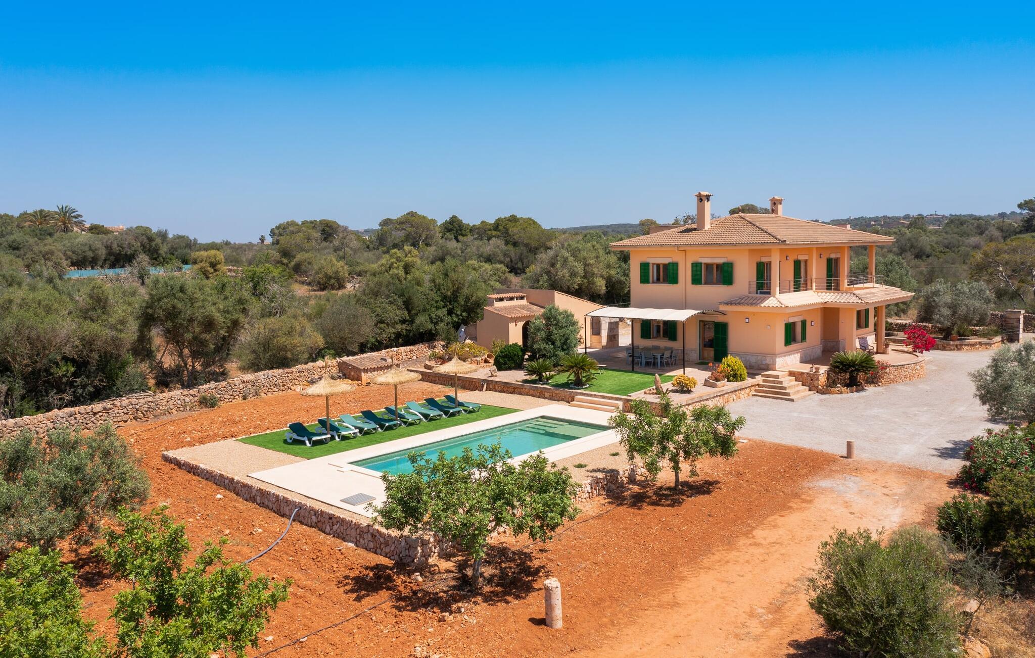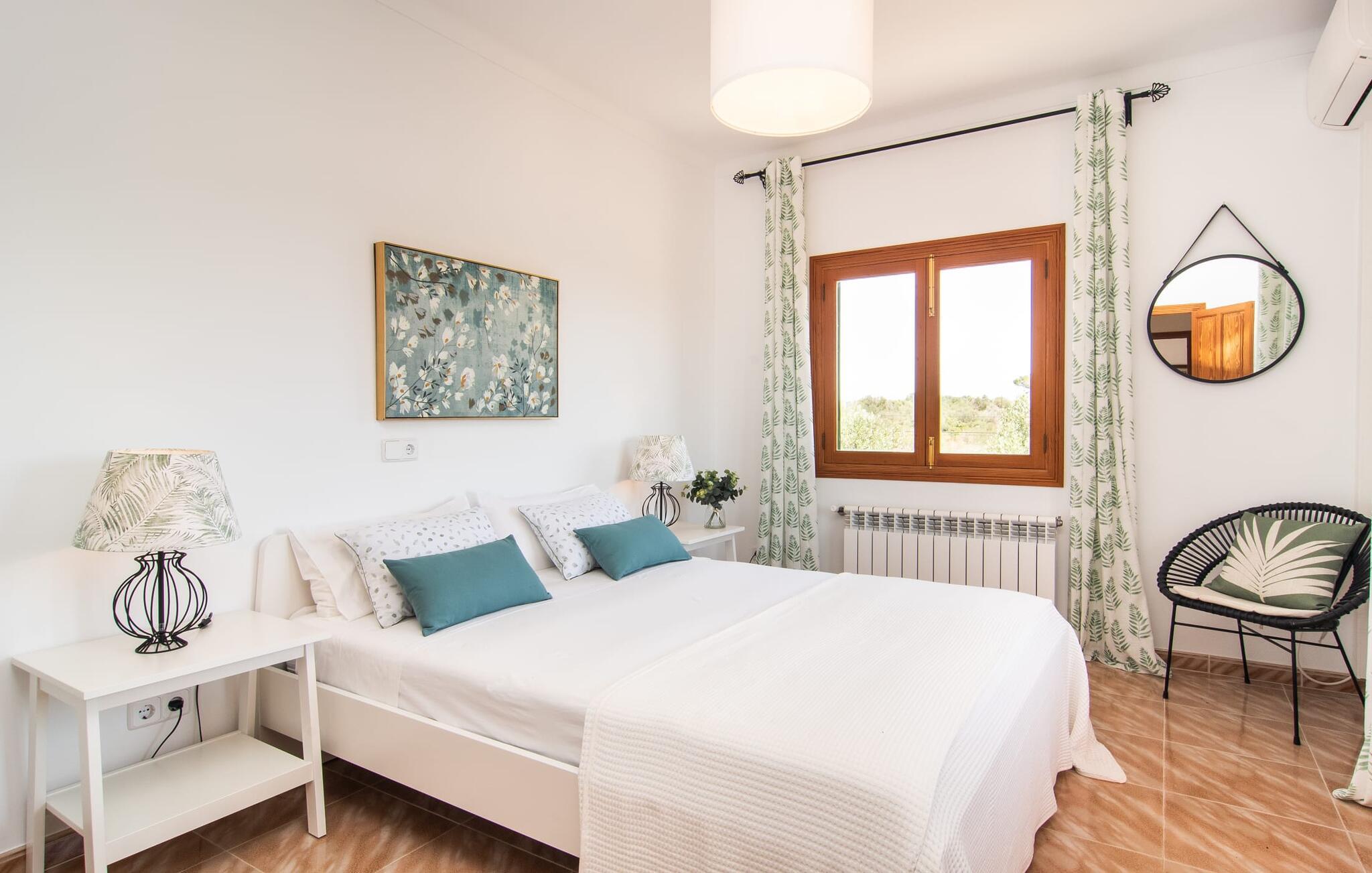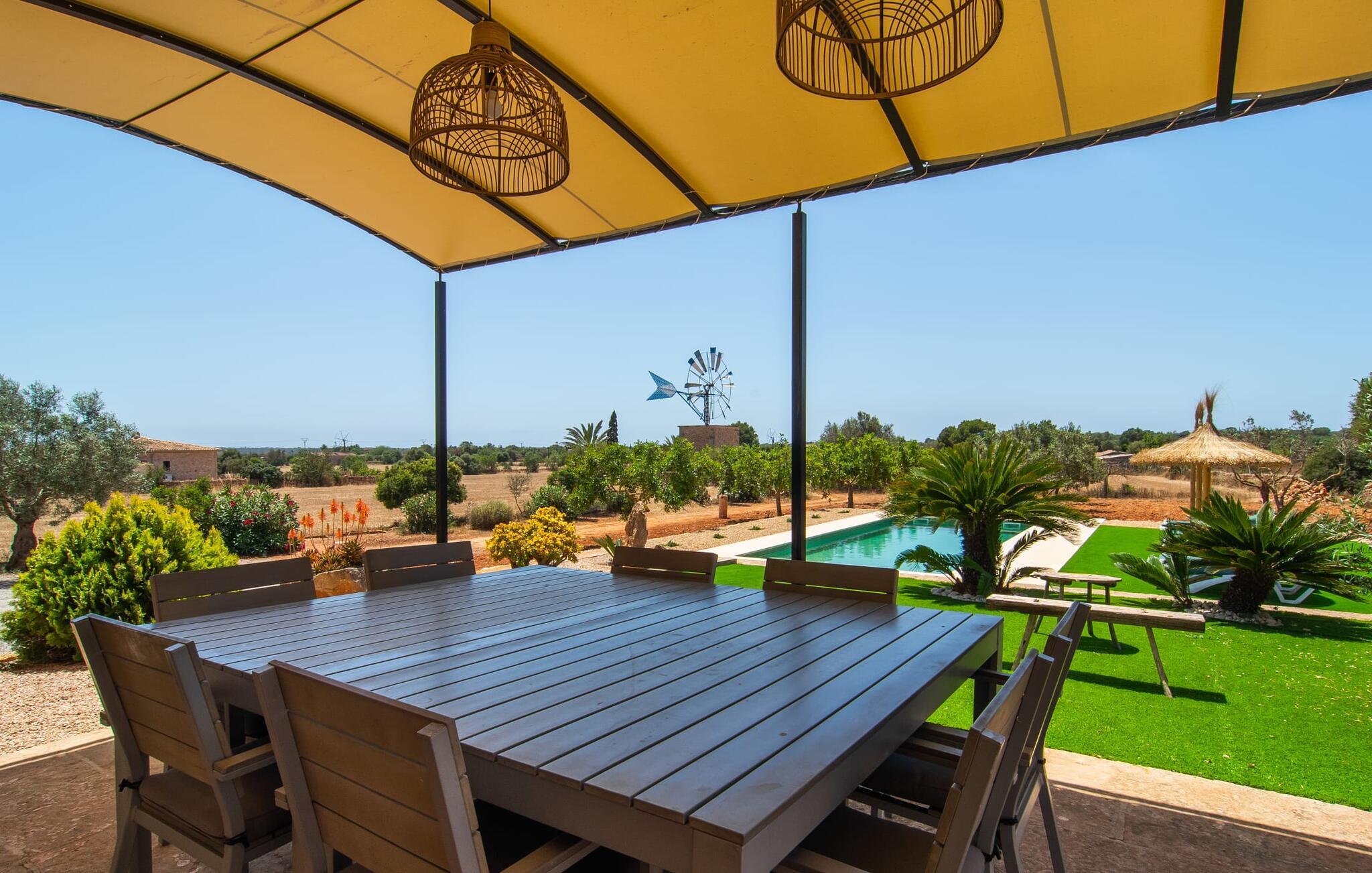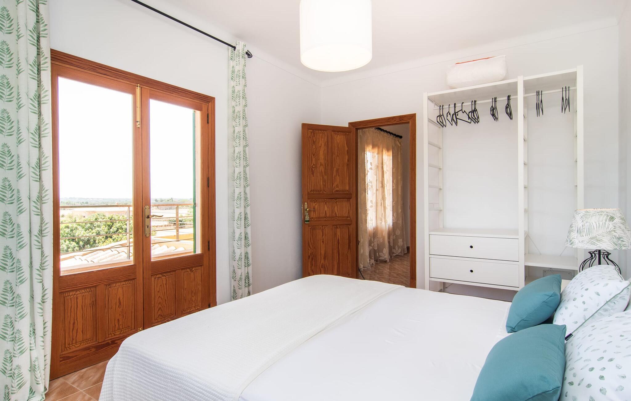 Denne avslappingen finner du også inne i den majestetiske feriegården. Kombinasjonen av mallorcinsk landstil med moderne innredningsdetaljer kan beskrives som svært vellykket. Et romslig inngangsparti med middelhavspreg inviterer deg til å utforske huset. I første etasje finner du den koselige TV-stuen, det store spisekjøkkenet med en sosial spiseplass og et av de klimatiserte avslapningsrommene. Et trendy bad med dusjkabinett avrunder denne etasjen. Attraktivt tilbehør i landlig stil fremhever også den øverste etasjen på en dyktig måte. De tre andre soverommene, hvorav to har direkte utgang til solfylte balkonger med fortryllende utsikt, vitner også om dette. Ytterligere to komfortable bad (med dusj eller badekar) er en del av det velværebringende basisutstyret i dette vakkert beliggende feriehuset. Innredningen i det romslige feriehuset er ideell for flere konstellasjoner med opptil åtte reisende, f.eks. to familier eller flere vennepar. Alle er velkomne på Hort de Can Rafalet! Den innbydende bassenggården Hort de Can Rafalet imponerer med sin landlige ro mellom oliventrær og en historisk vindmølle, kombinert med de mest moderne bekvemmeligheter. Eiendommen har en førsteklasses beliggenhet sør på Mallorca, mellom den lille byen Ses Salines og kystbyen Colònia de Sant Jordi. I tillegg til naturperler som saltmarkene, ligger byens tiltrekningskraft også i nærheten av drømmestranden Es Trenc. Denne ligger bare 10 minutter unna med bil.