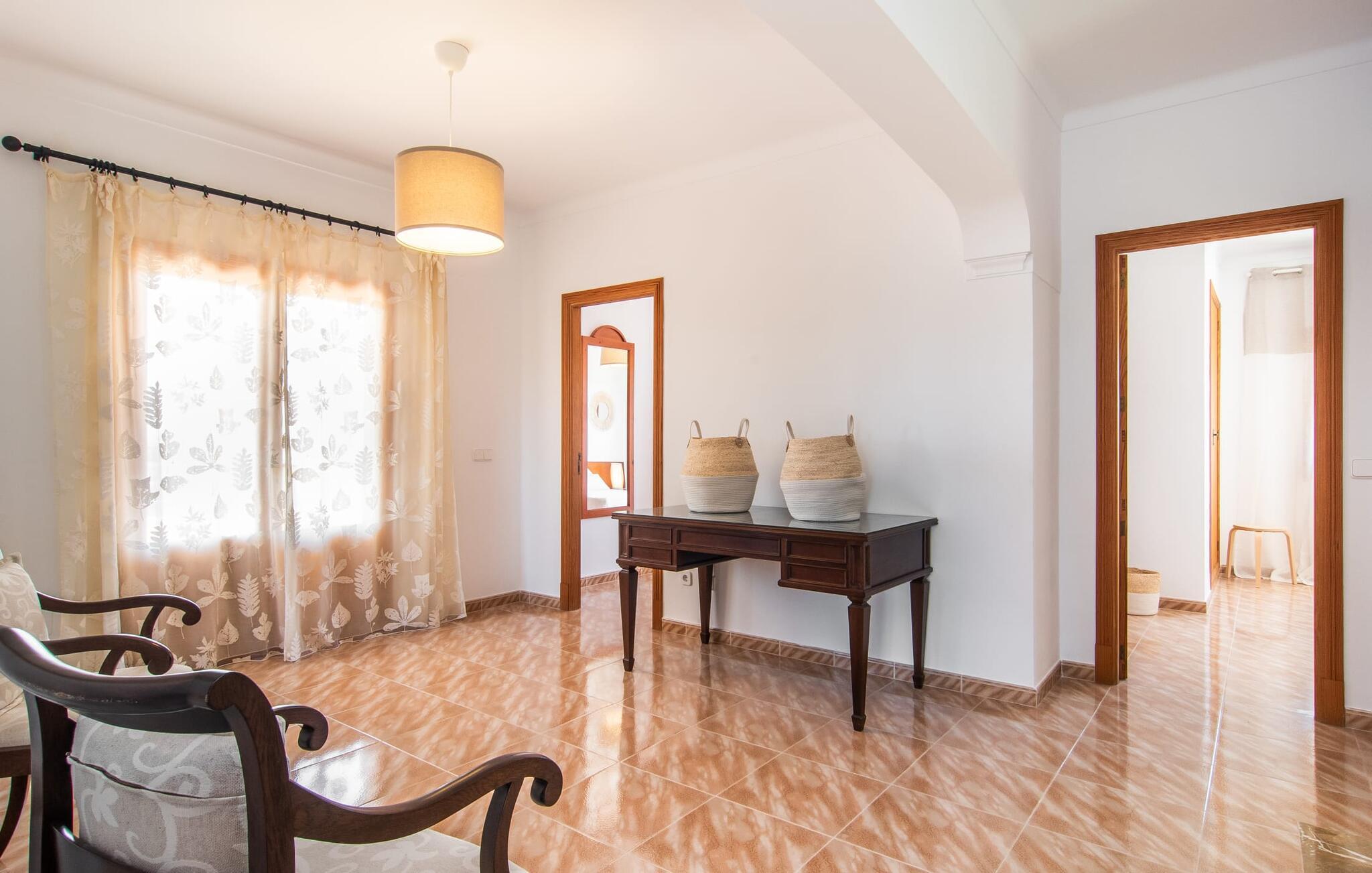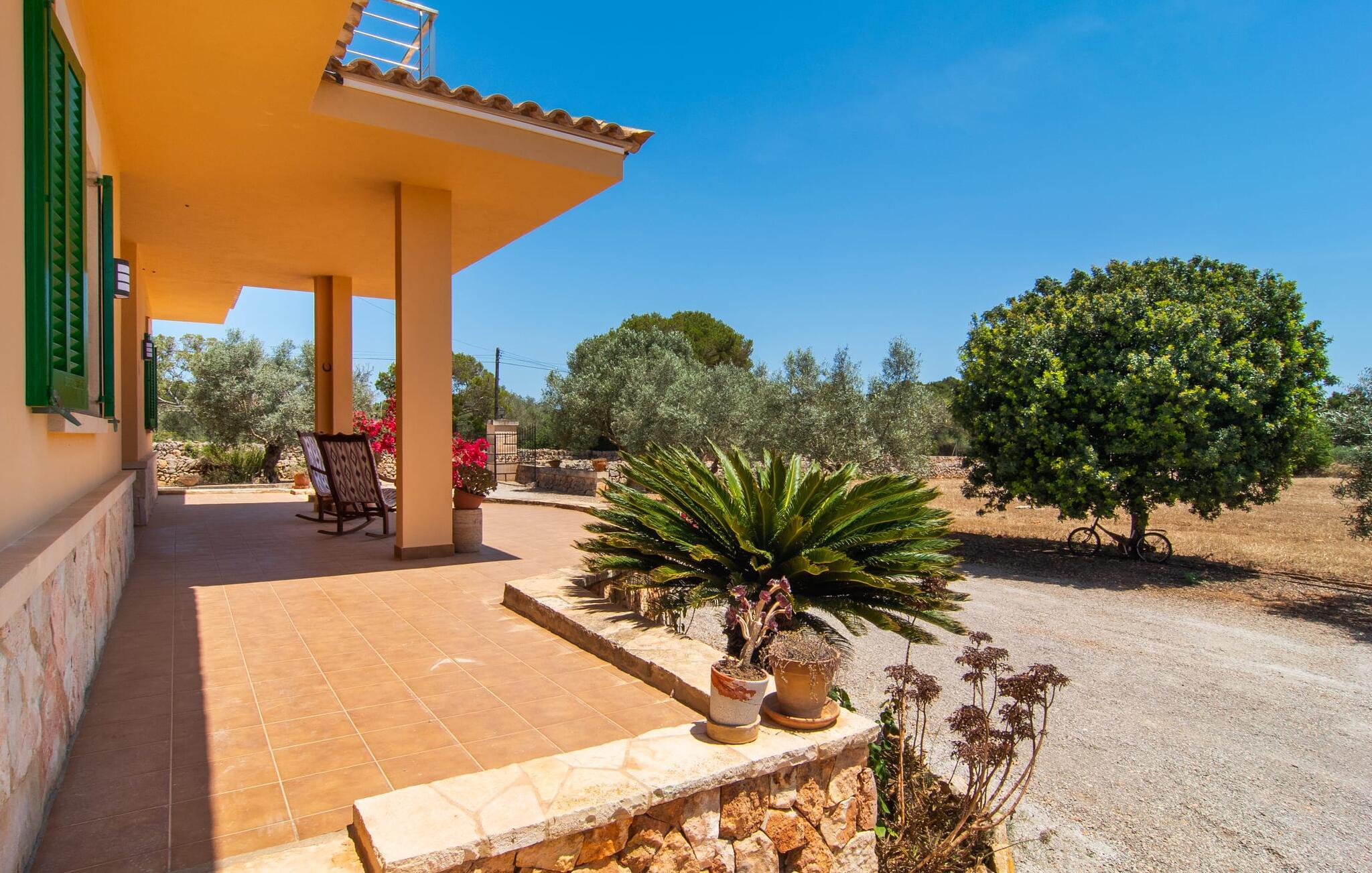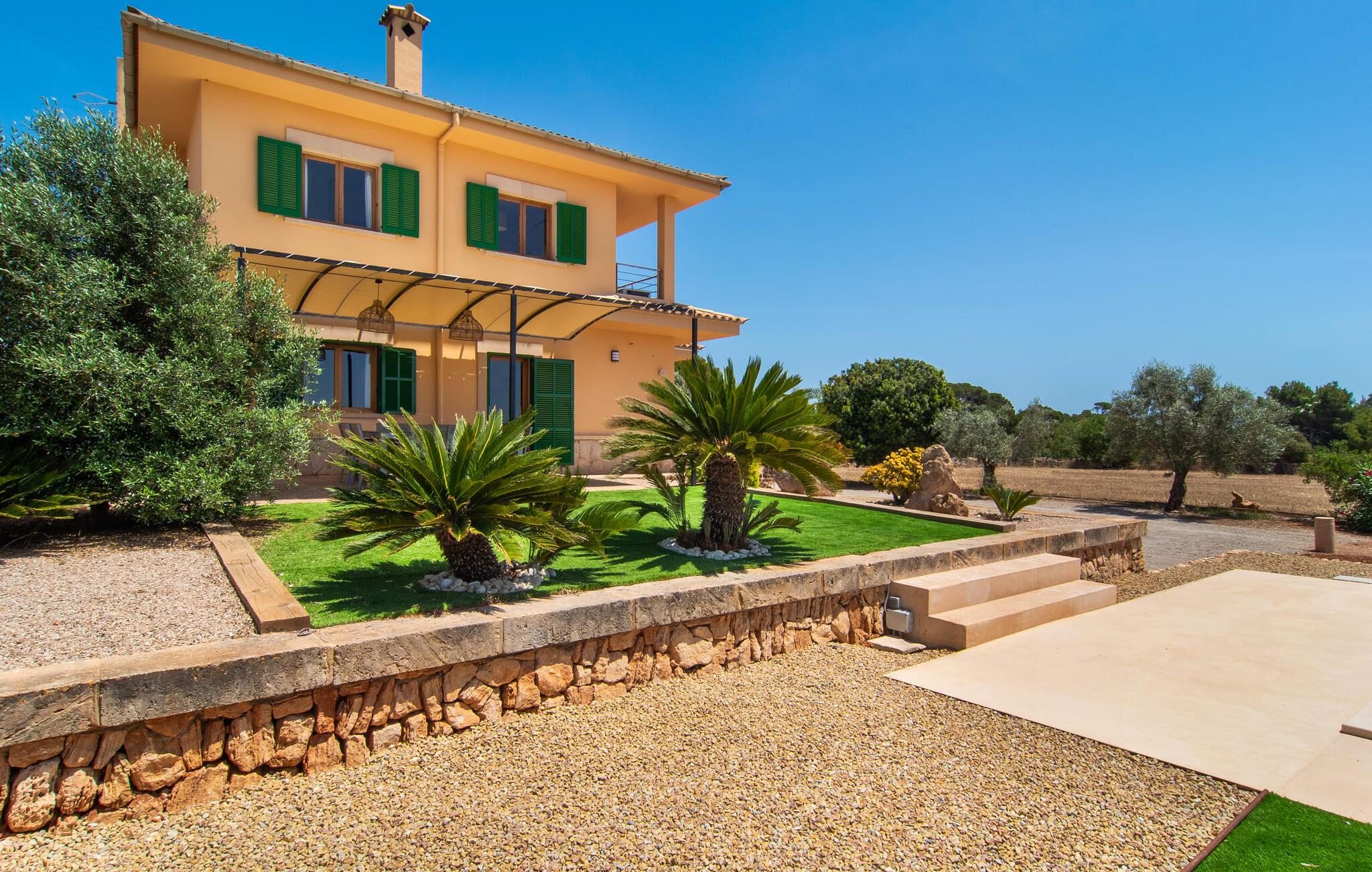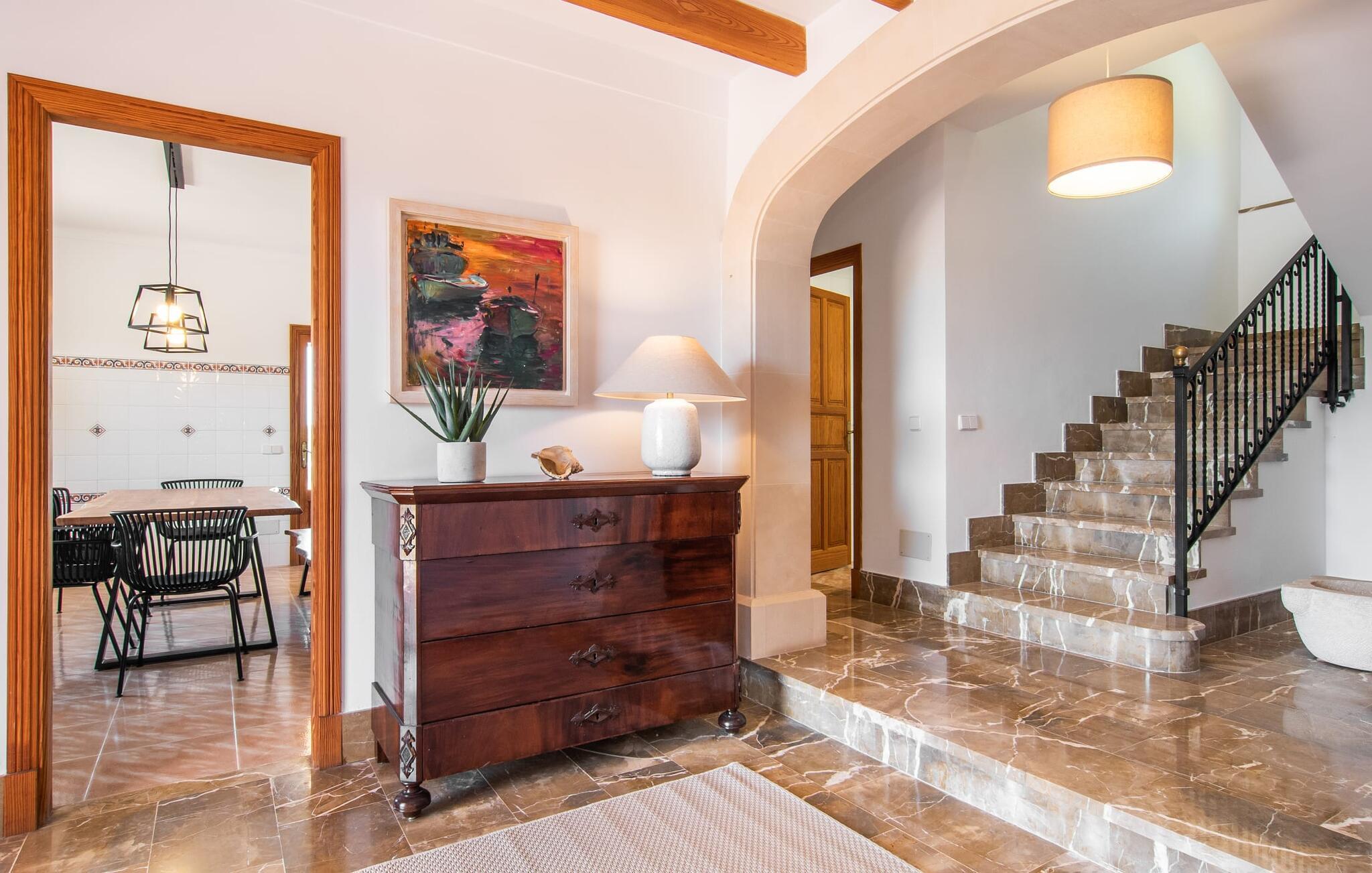 Denne avslappingen finner du også inne i den majestetiske feriegården. Kombinasjonen av mallorcinsk landstil med moderne innredningsdetaljer kan beskrives som svært vellykket. Et romslig inngangsparti med middelhavspreg inviterer deg til å utforske huset. I første etasje finner du den koselige TV-stuen, det store spisekjøkkenet med en sosial spiseplass og et av de klimatiserte avslapningsrommene. Et trendy bad med dusjkabinett avrunder denne etasjen. Attraktivt tilbehør i landlig stil fremhever også den øverste etasjen på en dyktig måte. De tre andre soverommene, hvorav to har direkte utgang til solfylte balkonger med fortryllende utsikt, vitner også om dette. Ytterligere to komfortable bad (med dusj eller badekar) er en del av det velværebringende basisutstyret i dette vakkert beliggende feriehuset. Innredningen i det romslige feriehuset er ideell for flere konstellasjoner med opptil åtte reisende, f.eks. to familier eller flere vennepar. Alle er velkomne på Hort de Can Rafalet! Den innbydende bassenggården Hort de Can Rafalet imponerer med sin landlige ro mellom oliventrær og en historisk vindmølle, kombinert med de mest moderne bekvemmeligheter. Eiendommen har en førsteklasses beliggenhet sør på Mallorca, mellom den lille byen Ses Salines og kystbyen Colònia de Sant Jordi. I tillegg til naturperler som saltmarkene, ligger byens tiltrekningskraft også i nærheten av drømmestranden Es Trenc. Denne ligger bare 10 minutter unna med bil.