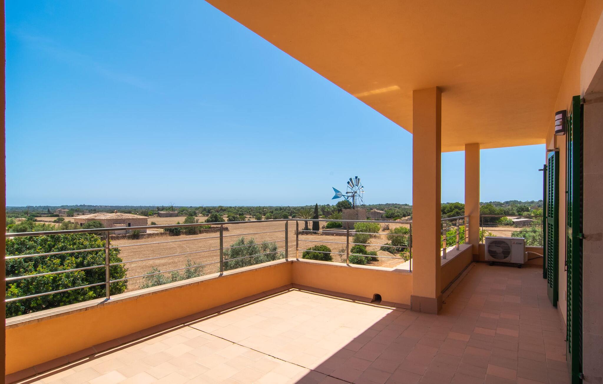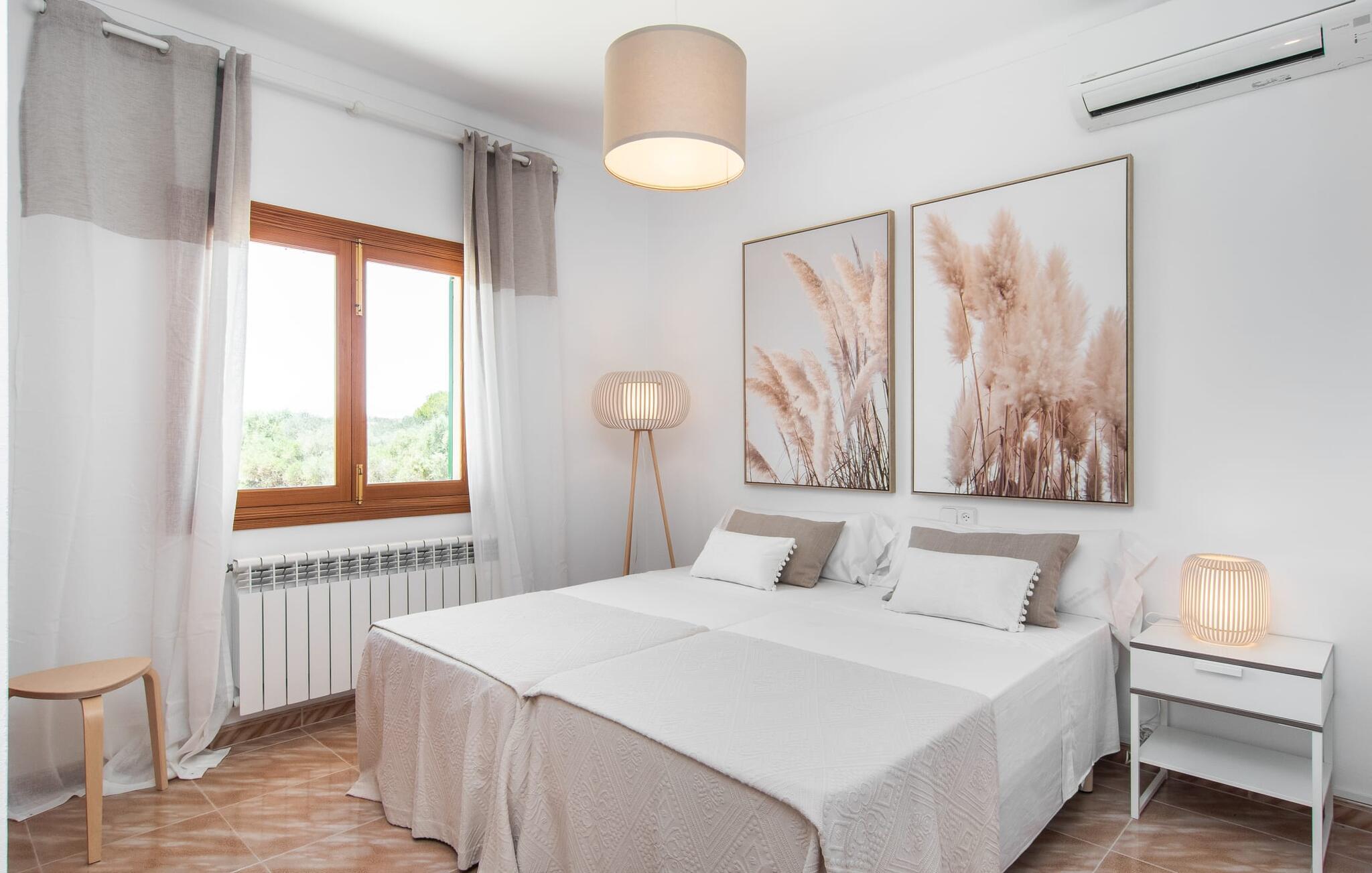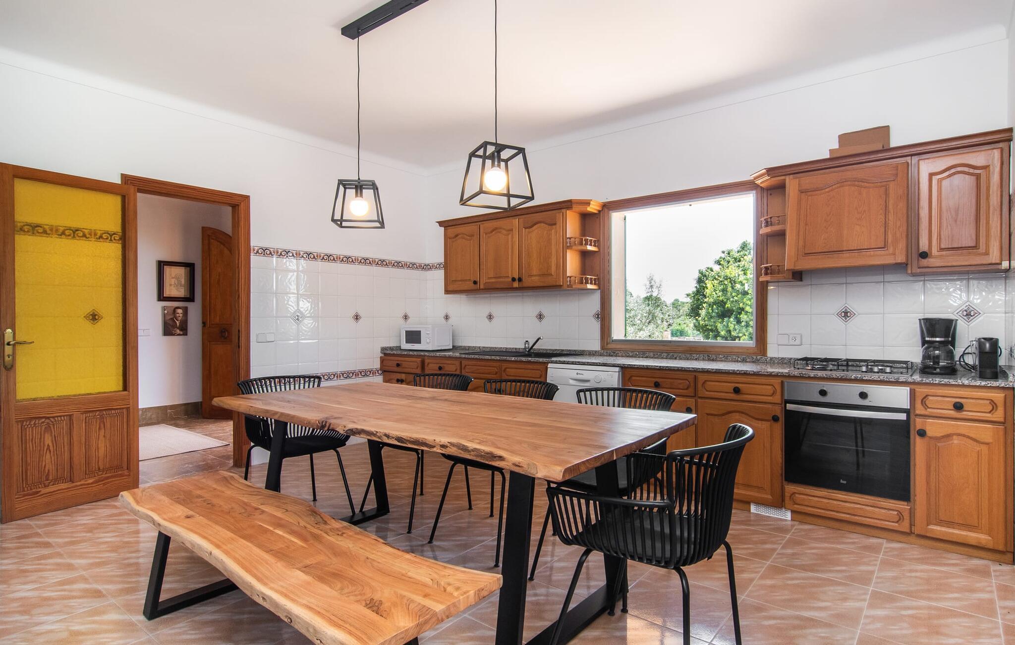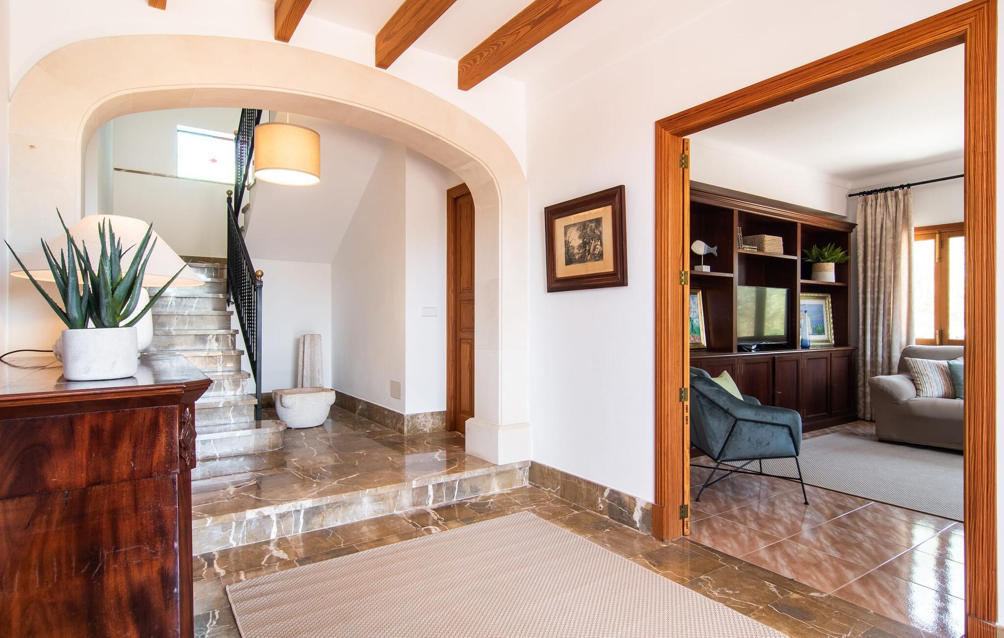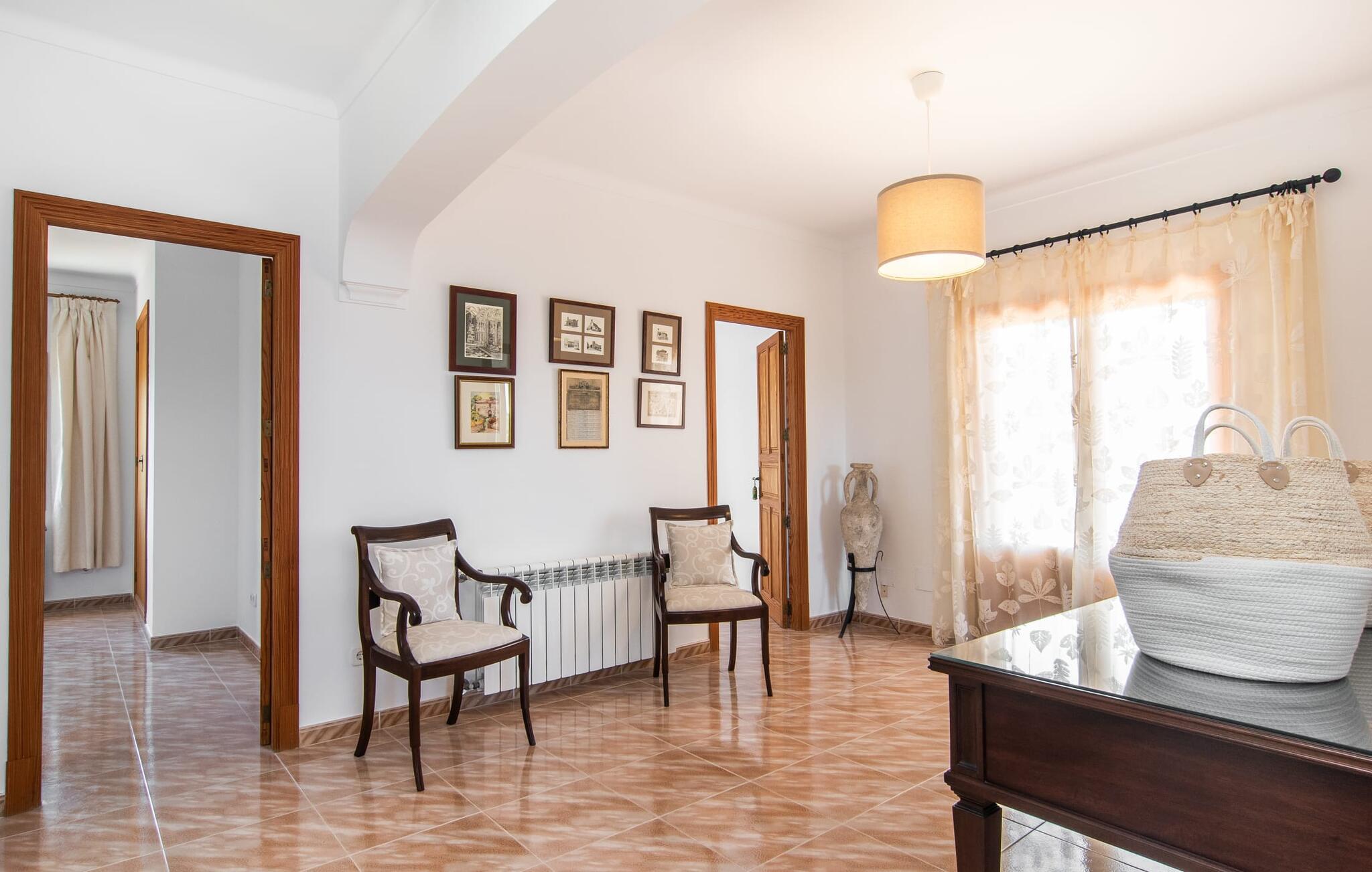 Denne avslappingen finner du også inne i den majestetiske feriegården. Kombinasjonen av mallorcinsk landstil med moderne innredningsdetaljer kan beskrives som svært vellykket. Et romslig inngangsparti med middelhavspreg inviterer deg til å utforske huset. I første etasje finner du den koselige TV-stuen, det store spisekjøkkenet med en sosial spiseplass og et av de klimatiserte avslapningsrommene. Et trendy bad med dusjkabinett avrunder denne etasjen. Attraktivt tilbehør i landlig stil fremhever også den øverste etasjen på en dyktig måte. De tre andre soverommene, hvorav to har direkte utgang til solfylte balkonger med fortryllende utsikt, vitner også om dette. Ytterligere to komfortable bad (med dusj eller badekar) er en del av det velværebringende basisutstyret i dette vakkert beliggende feriehuset. Innredningen i det romslige feriehuset er ideell for flere konstellasjoner med opptil åtte reisende, f.eks. to familier eller flere vennepar. Alle er velkomne på Hort de Can Rafalet! Den innbydende bassenggården Hort de Can Rafalet imponerer med sin landlige ro mellom oliventrær og en historisk vindmølle, kombinert med de mest moderne bekvemmeligheter. Eiendommen har en førsteklasses beliggenhet sør på Mallorca, mellom den lille byen Ses Salines og kystbyen Colònia de Sant Jordi. I tillegg til naturperler som saltmarkene, ligger byens tiltrekningskraft også i nærheten av drømmestranden Es Trenc. Denne ligger bare 10 minutter unna med bil.
