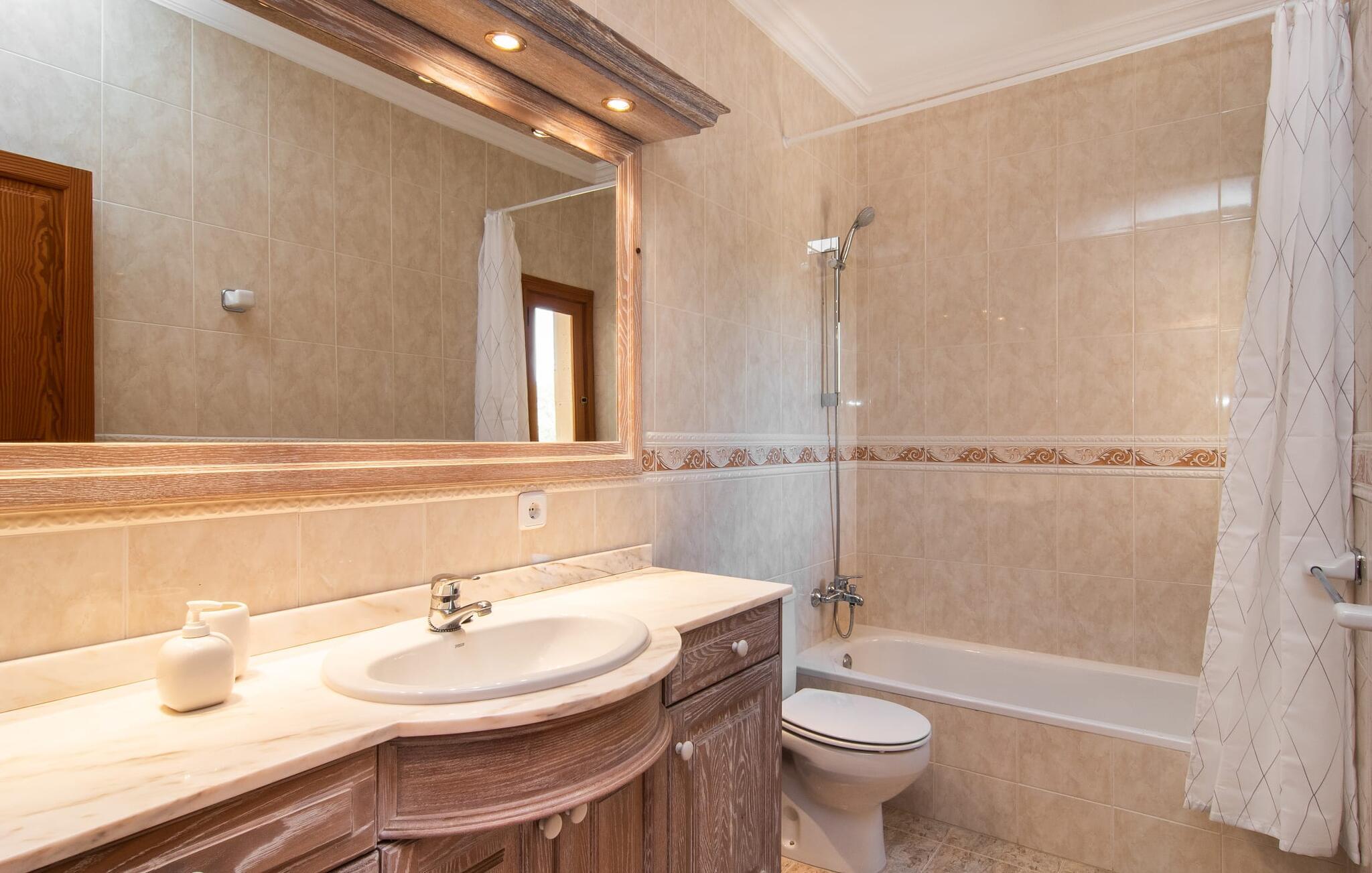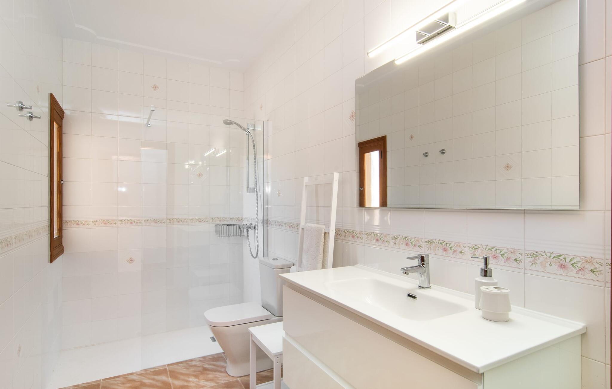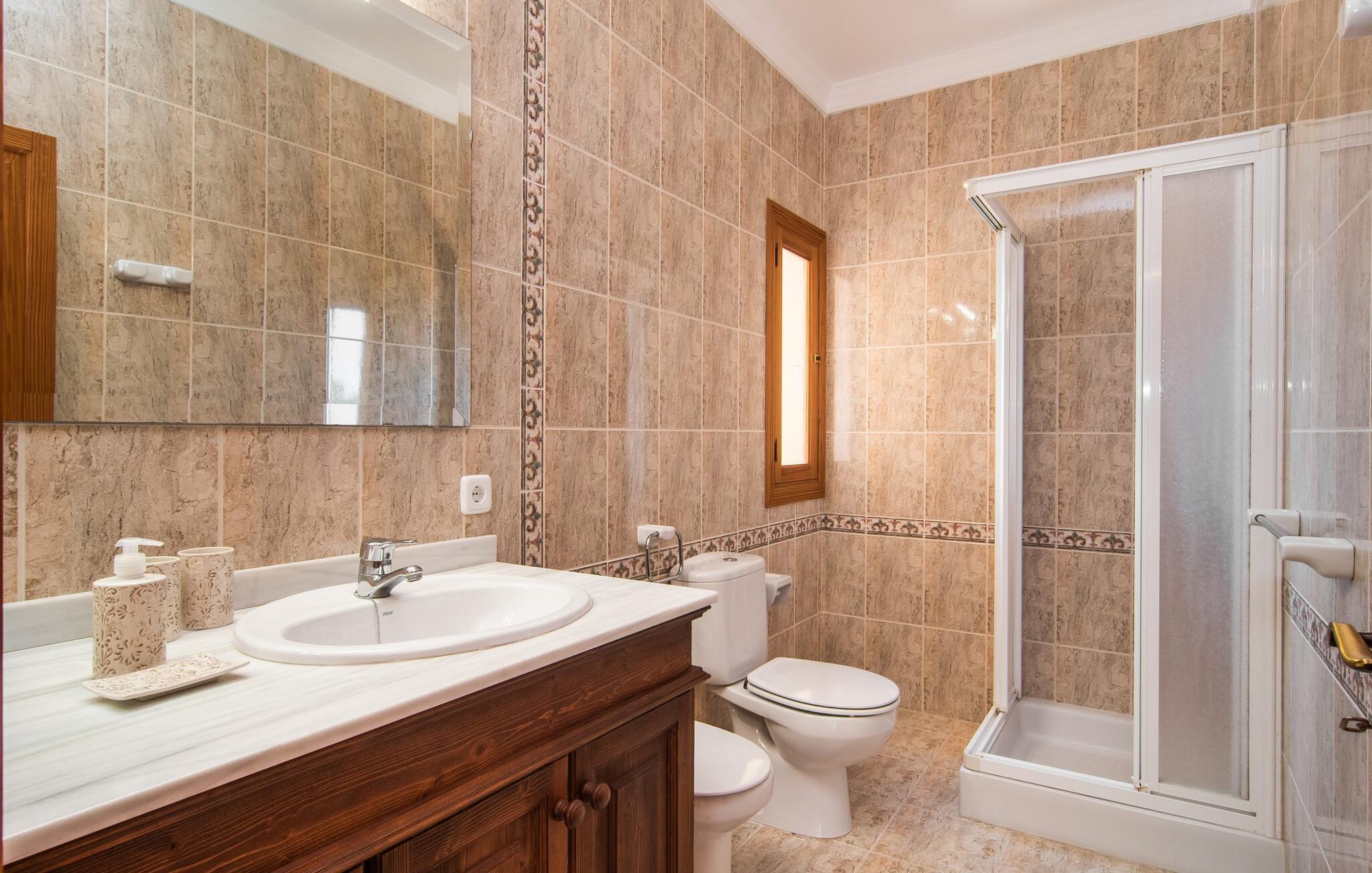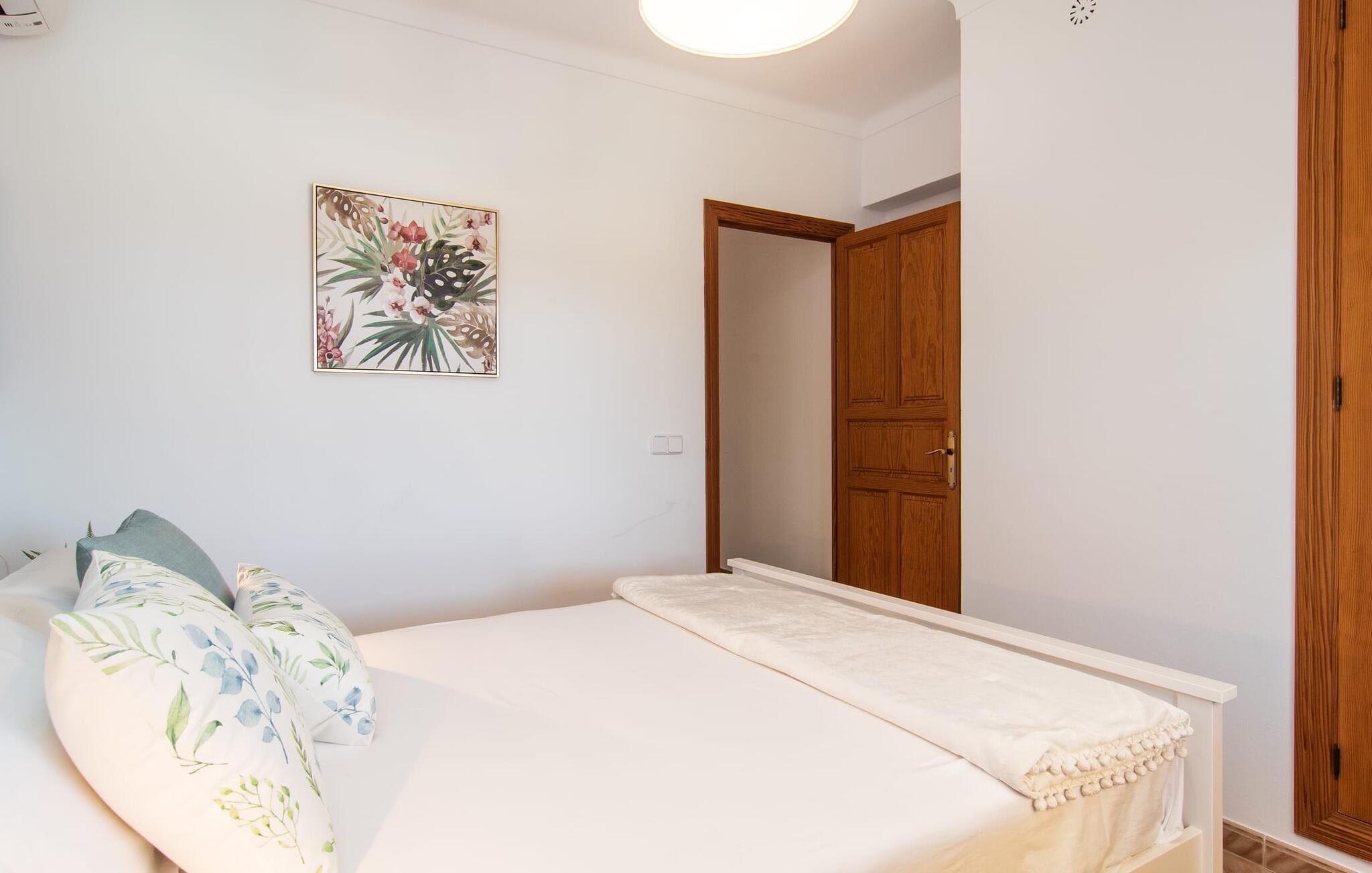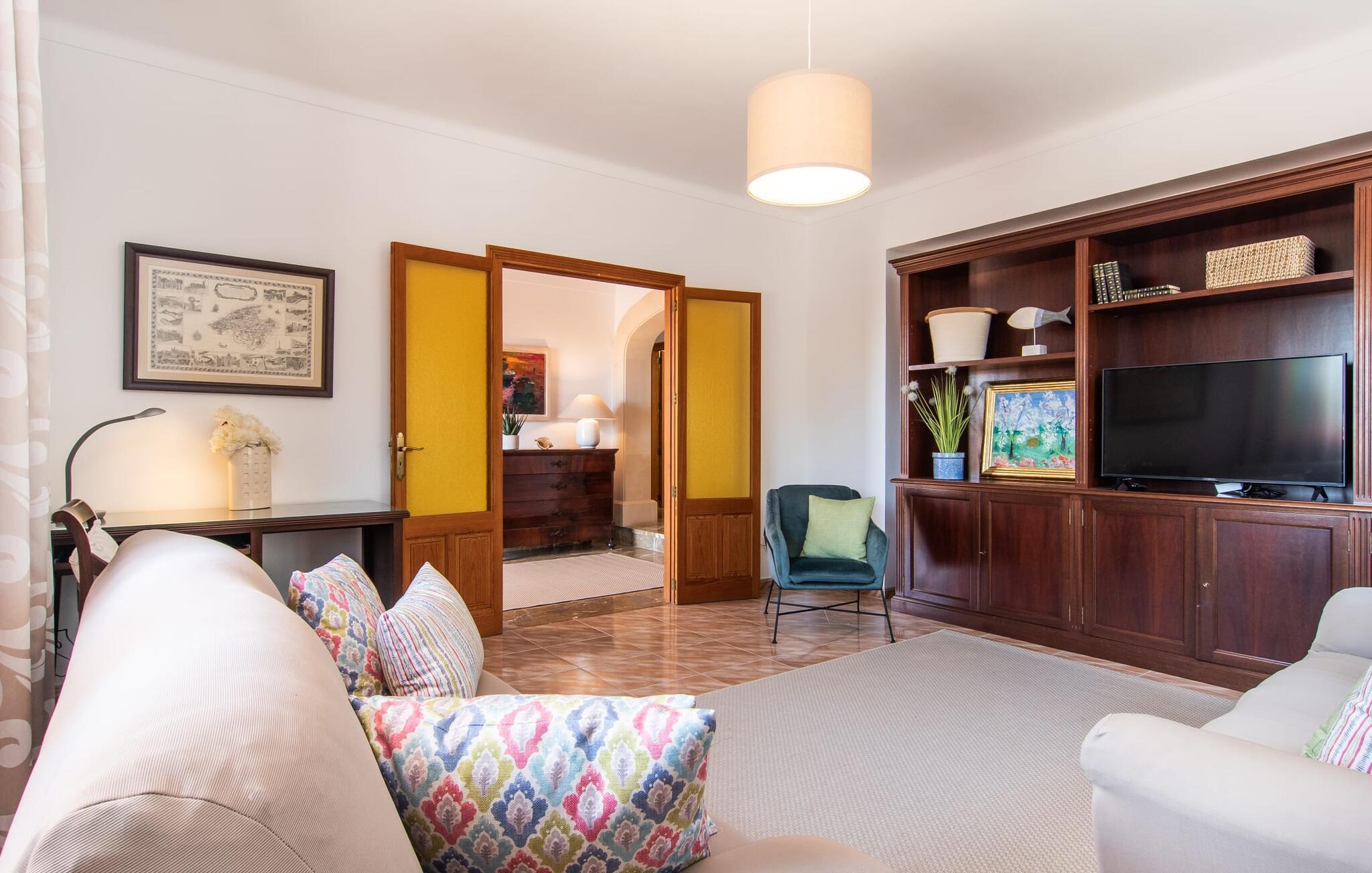 Denne avslappingen finner du også inne i den majestetiske feriegården. Kombinasjonen av mallorcinsk landstil med moderne innredningsdetaljer kan beskrives som svært vellykket. Et romslig inngangsparti med middelhavspreg inviterer deg til å utforske huset. I første etasje finner du den koselige TV-stuen, det store spisekjøkkenet med en sosial spiseplass og et av de klimatiserte avslapningsrommene. Et trendy bad med dusjkabinett avrunder denne etasjen. Attraktivt tilbehør i landlig stil fremhever også den øverste etasjen på en dyktig måte. De tre andre soverommene, hvorav to har direkte utgang til solfylte balkonger med fortryllende utsikt, vitner også om dette. Ytterligere to komfortable bad (med dusj eller badekar) er en del av det velværebringende basisutstyret i dette vakkert beliggende feriehuset. Innredningen i det romslige feriehuset er ideell for flere konstellasjoner med opptil åtte reisende, f.eks. to familier eller flere vennepar. Alle er velkomne på Hort de Can Rafalet! Den innbydende bassenggården Hort de Can Rafalet imponerer med sin landlige ro mellom oliventrær og en historisk vindmølle, kombinert med de mest moderne bekvemmeligheter. Eiendommen har en førsteklasses beliggenhet sør på Mallorca, mellom den lille byen Ses Salines og kystbyen Colònia de Sant Jordi. I tillegg til naturperler som saltmarkene, ligger byens tiltrekningskraft også i nærheten av drømmestranden Es Trenc. Denne ligger bare 10 minutter unna med bil.