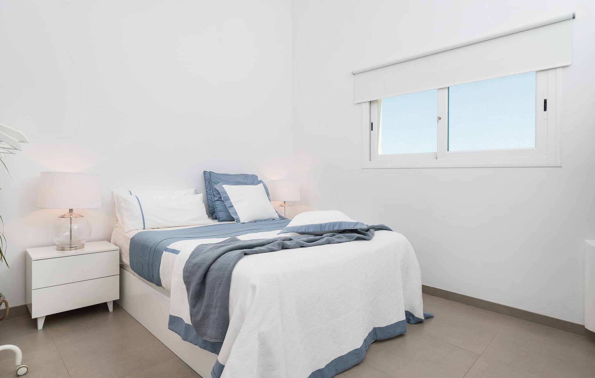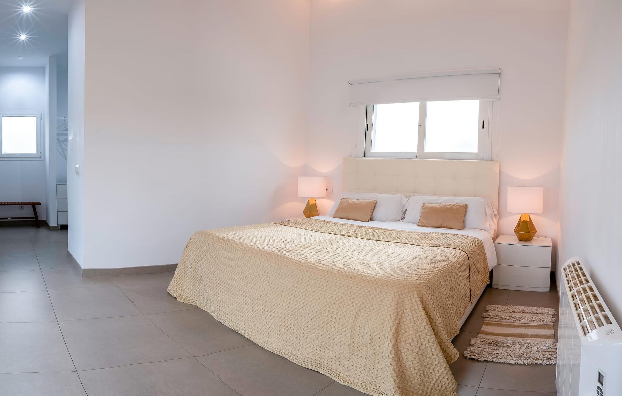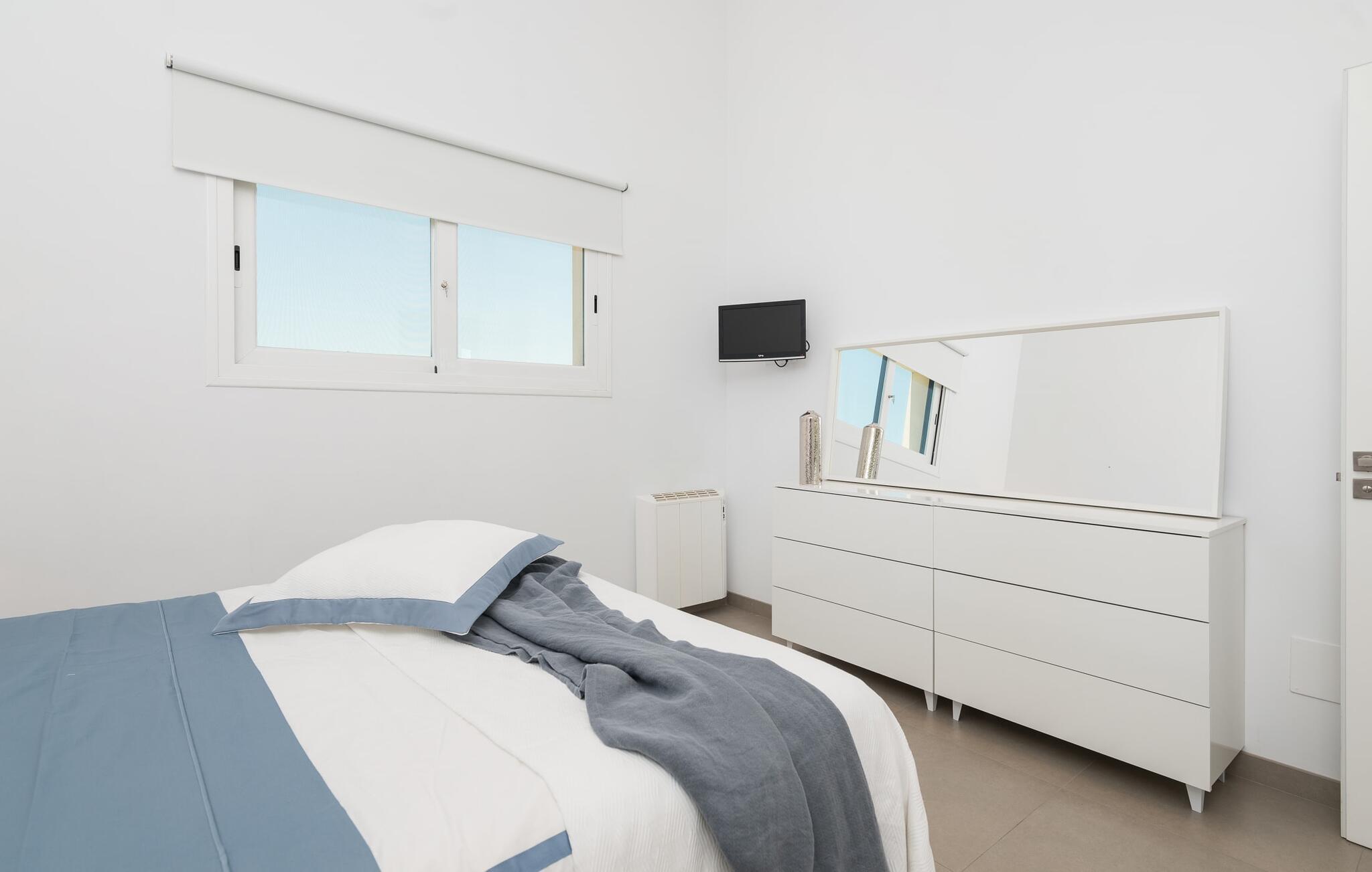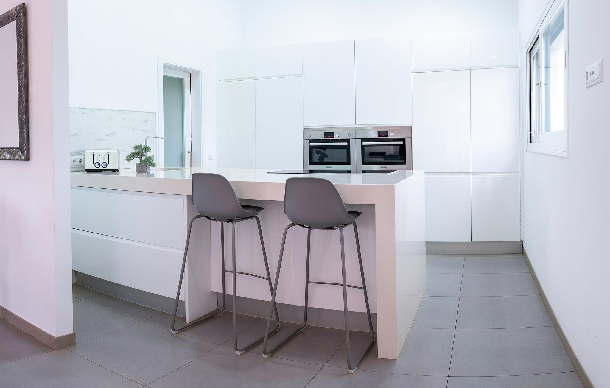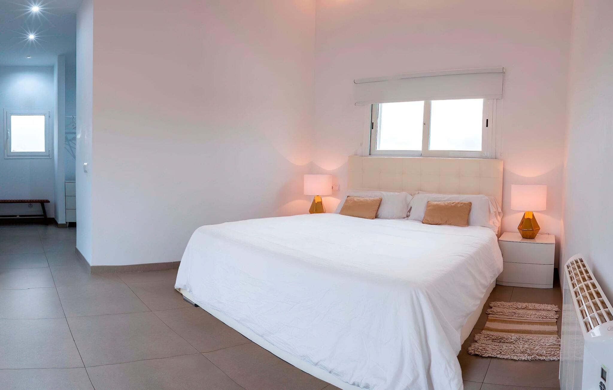 Rette linjer. Stilig. Minimalistisk. Disse fasjonable moteordene vil gå gjennom hodet ditt når du ankommer denne villaen. Som en hvit kube som er avbrutt på midten, reiser denne moderne bygningen seg opp fra den omkringliggende store tomten og imponerer med sin originale kontrast mellom natur og arkitektur. Serenity ønsker også gjestene velkommen til terrassen på baksiden og inviterer til opphold i det fri med solsenger, fluktstoler, bord og stoler. Her foregår alt på ett plan, med den vakreste utsikten over den nordlige delen av øya og dens ruvende åser. En god bok i hånden, en forfriskende drink på bordet, dine kjære i nærheten, hva mer trenger du? Kanskje én ting: en forfriskende dukkert i det kjølige vannet som bokstavelig talt ligger for dine føtter her. Her kan du svømme noen behagelige runder på 11 meter, mens i beste fall noen luftige skyer driver gjennom den blå himmelen over deg (boblebadet du ser på bildene, er ikke lenger der). Mens du soler deg i det kokende vannet, kan du leie dagens grillekspert til å tilberede de deilige grillingrediensene for deg om kvelden.