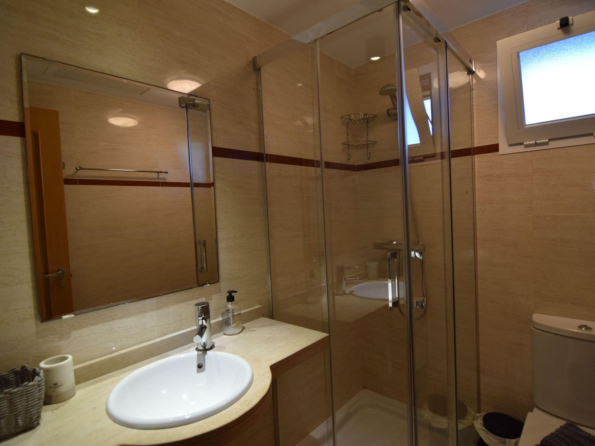 The apartment is located on the first floor with a lift and offers accommodation for up to 4 people. Upon entering to our left is a separate fully-equipped kitchen, with dishwasher, oven, electric stove, Dolce Gusto coffee maker and much more. An outside laundry corner with a washing machine is located here as well. The living room/dining room has plenty of room, and offers dining table, large Smart TV, comfortable sofa, and free Wifi. Through a double glazed large window is an access to a spacious covered terrace with two sun loungers and outside table to fully enjoy the outside space and the amazing sea views. The apartment comprises two double bedrooms each with two beds pushed together creating a king size bed for more comfort. One of the bedrooms has an en-suite bathroom with a hydro massage bath tub with a combination of a shower and bide. This south-east-facing bedroom has built in wardrobes and enjoys an access to the same large terrace as the living room. The second bedroom is north-east-facing and also has built-in wardrobe and a side terrace. Another separate bathroom with a walk-in shower. A rare feature is a central heating / cooling system throughout, clean and quiet. The rooms and living room also have modern style, electric ceiling fans.