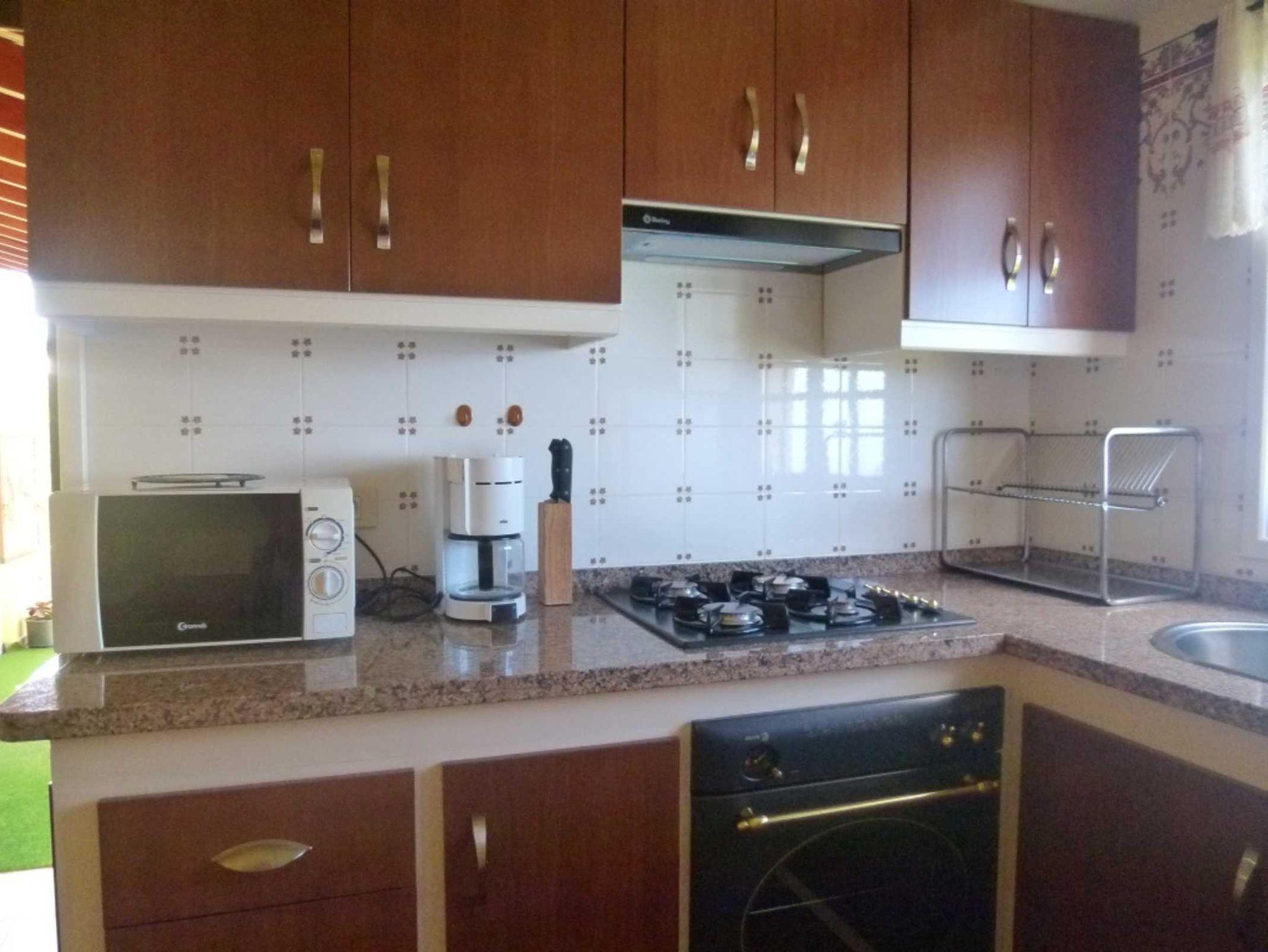 • Küche mit Gasherd (4 Platten), Backofen, Dunstabzug, Kaffeemaschine, Cafetera, Toaster, Kühl-Gefrierkombination, Mikrowelle