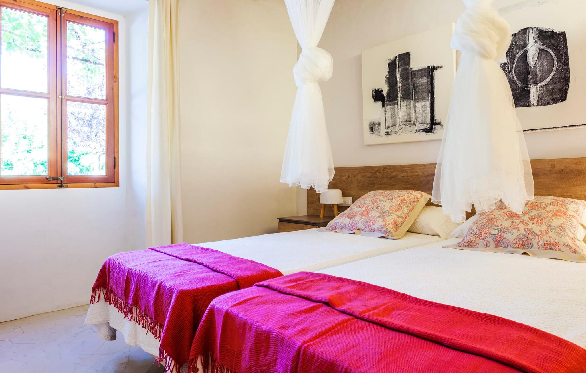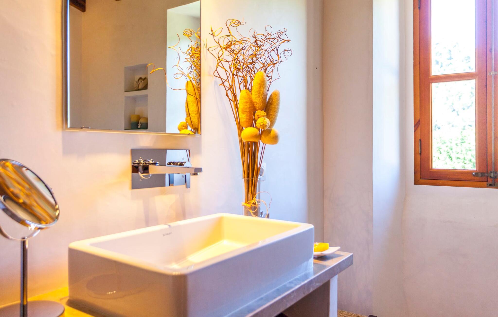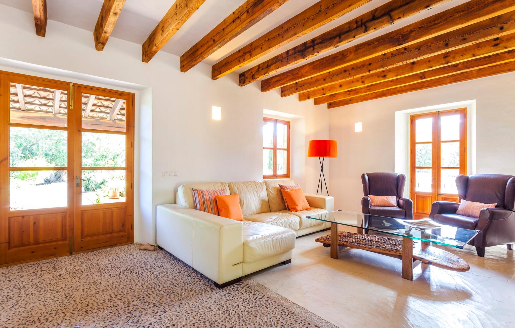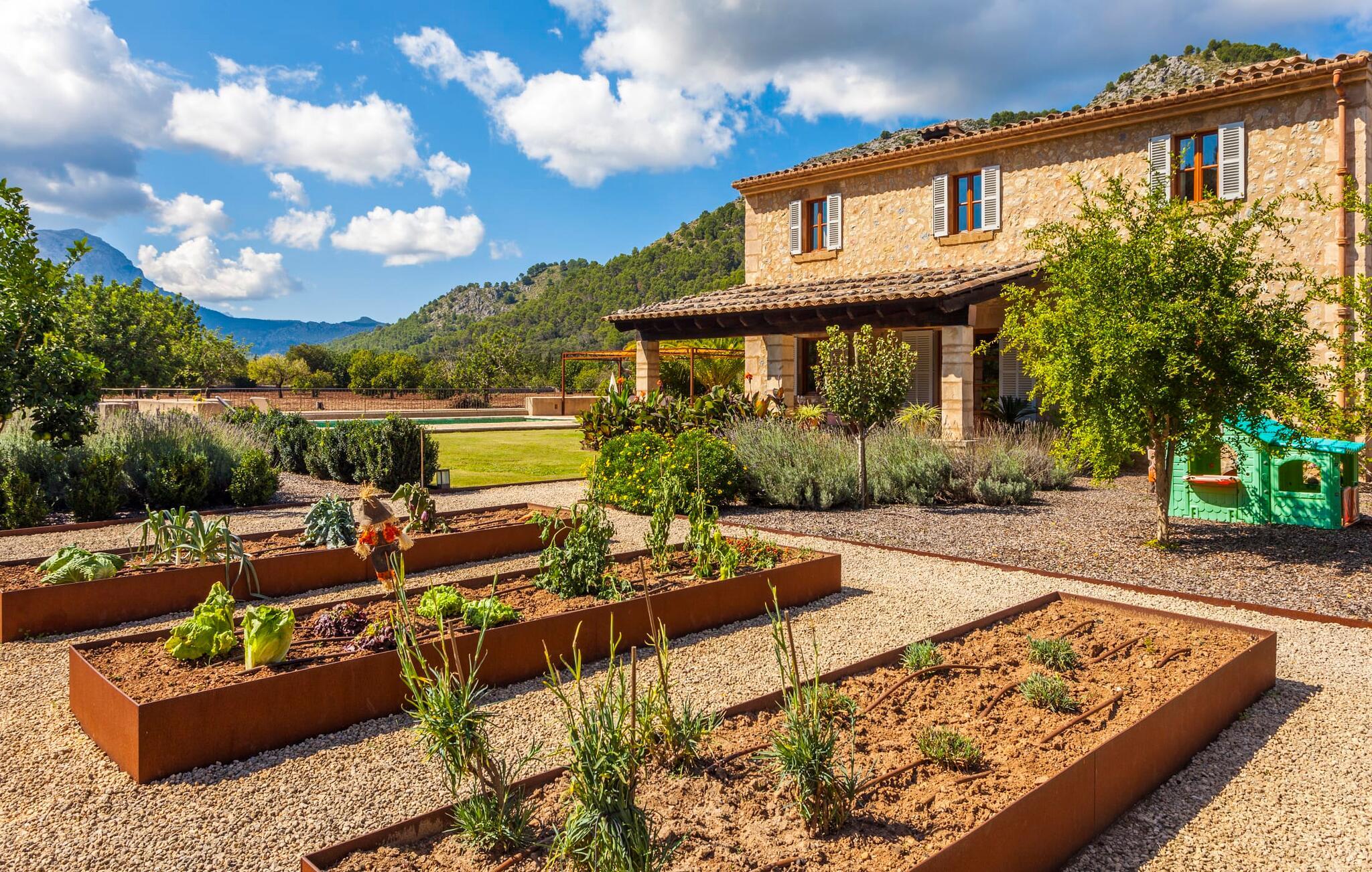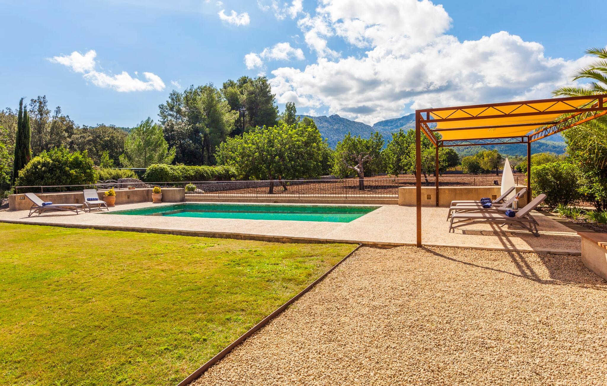 For å gjøre en lang historie kort: Her er alt akkurat som det skal være. Her møtes modernitet og stil med rustikk og naturlig design. I tillegg kommer en velstelt hage og møbler av høy kvalitet, for ikke å snakke om den fantastiske utsikten som vil fengsle enhver besøkende. Villaen med det fantastiske navnet La Rovina ligger i pittoreske omgivelser, omgitt av middelhavsbusker, palmer og skogkledde åser - dette er virkelig Mallorca. Bassenget med terrassedekker og en vakker naturterrasse lover massevis av badeglede og en avslappende ferie. Det er også solsenger og en elegant pergola som gir behagelig skygge. Barnegyngen er plassert i nærheten av bassenget, slik at du kan holde øye med de små selv fra solsengen. Det er også et lekehus og en sandkasse for barna. Bak huset finner du en overbygd terrasse med et rustikt trebord og stilige stoler. Herfra kan du nyte den fantastiske utsikten over den frodige, grønne hagen, som er kjærlig utformet ned til minste detalj. Et herlig sted å runde av en lun sommerkveld. En flaske spansk rødvin med noen oliven og duften av lavendel vil fylle nesen din. Du kan nyte absolutt privatliv på eiendommen - ikke så rart, siden selve tomten er 40 000 m² stor. En vanlig, delvis asfaltert landevei fører direkte til huset, hvor det er parkering for opptil åtte biler og to garasjeplasser.