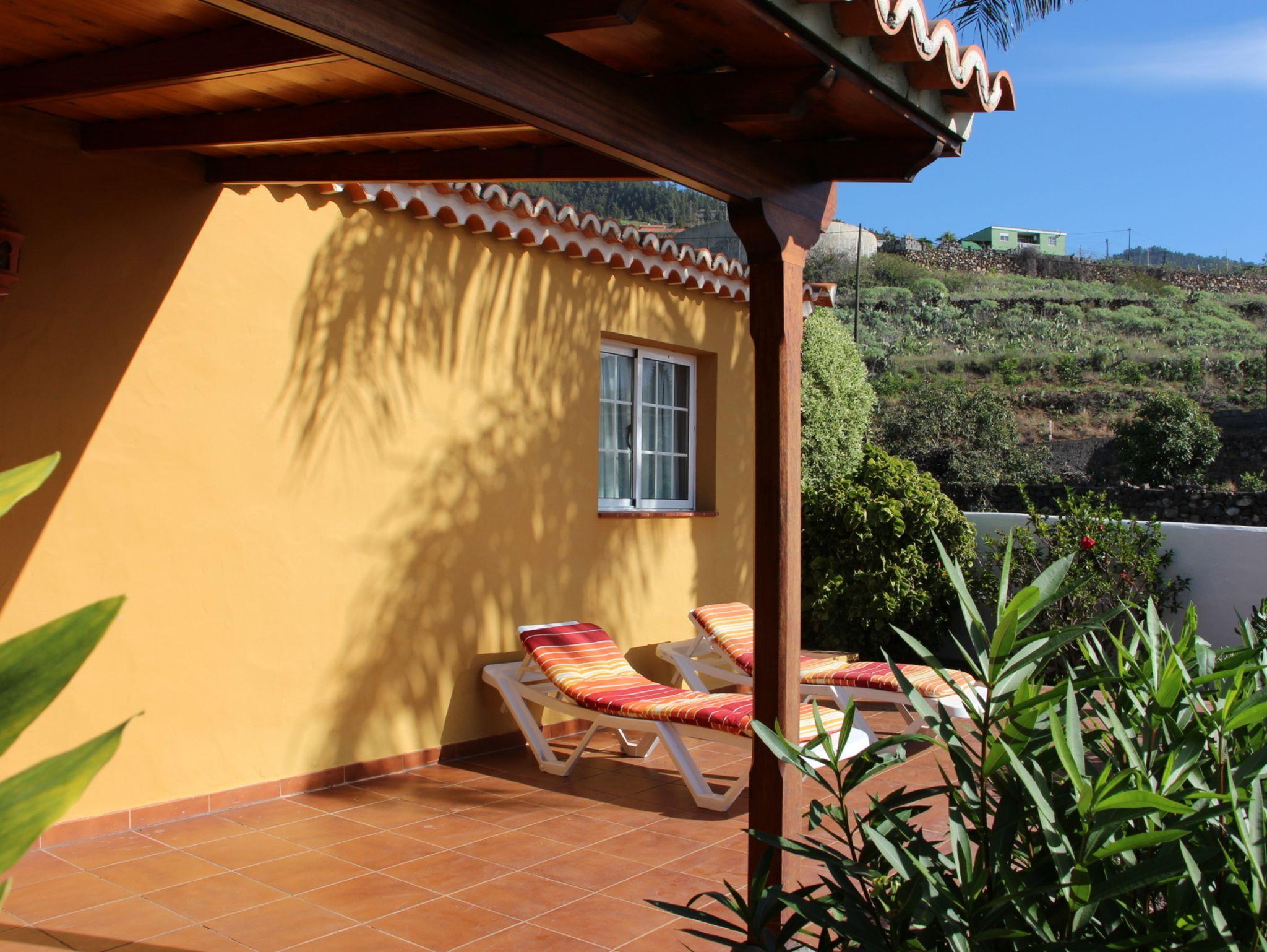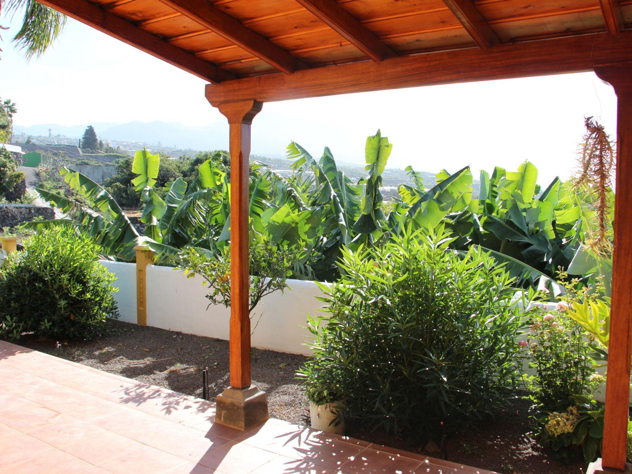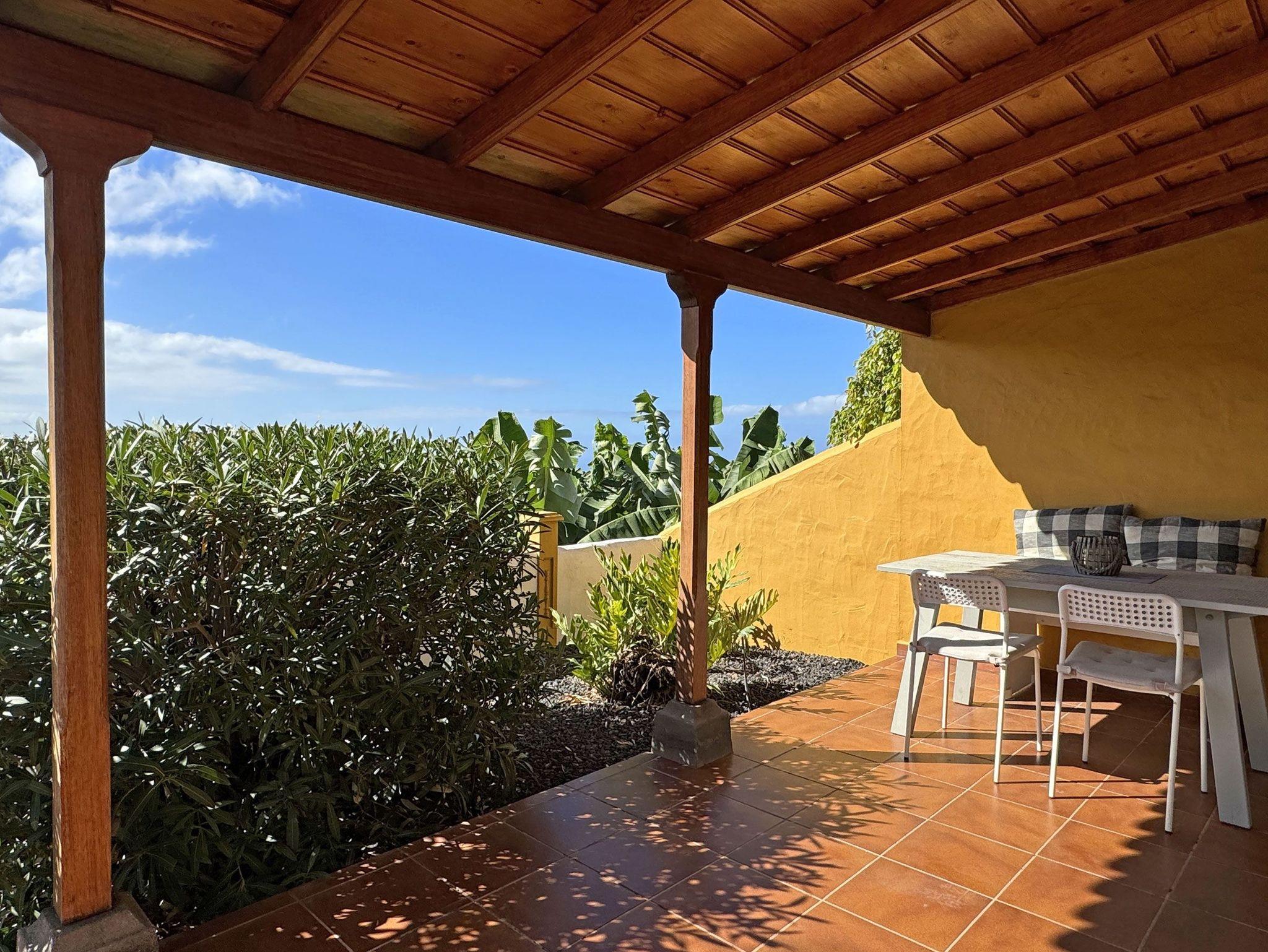 Jede Haushälfte hat ihren eigenen Außenbereich mit einer kleinen überdachten Terrasse mit Tisch, Bank und 2 Stühlen sowie zwei Liegestühlen. Der Garten wurde schön bepflanzt und man hat einen Blick auf Los Llanos.