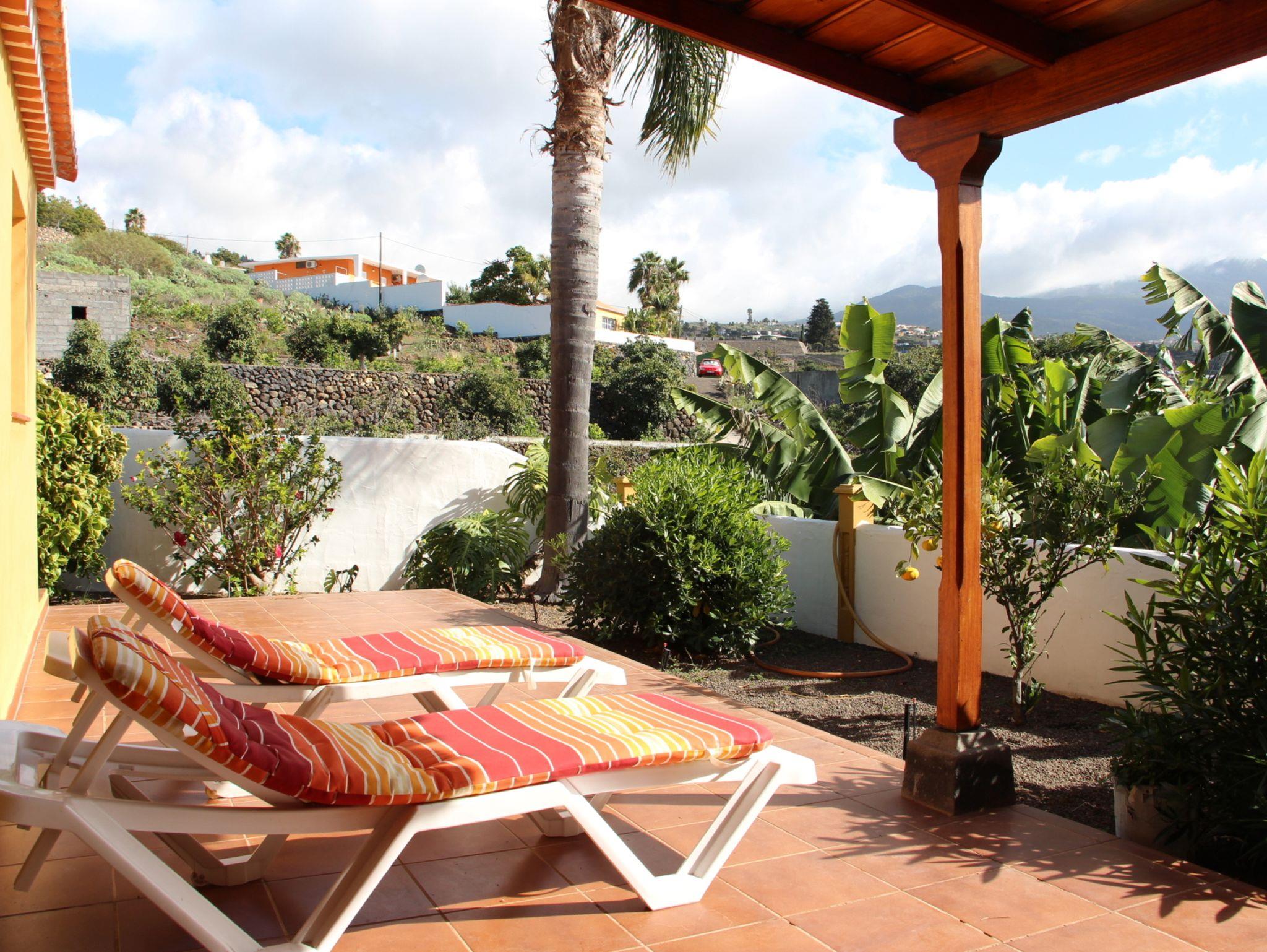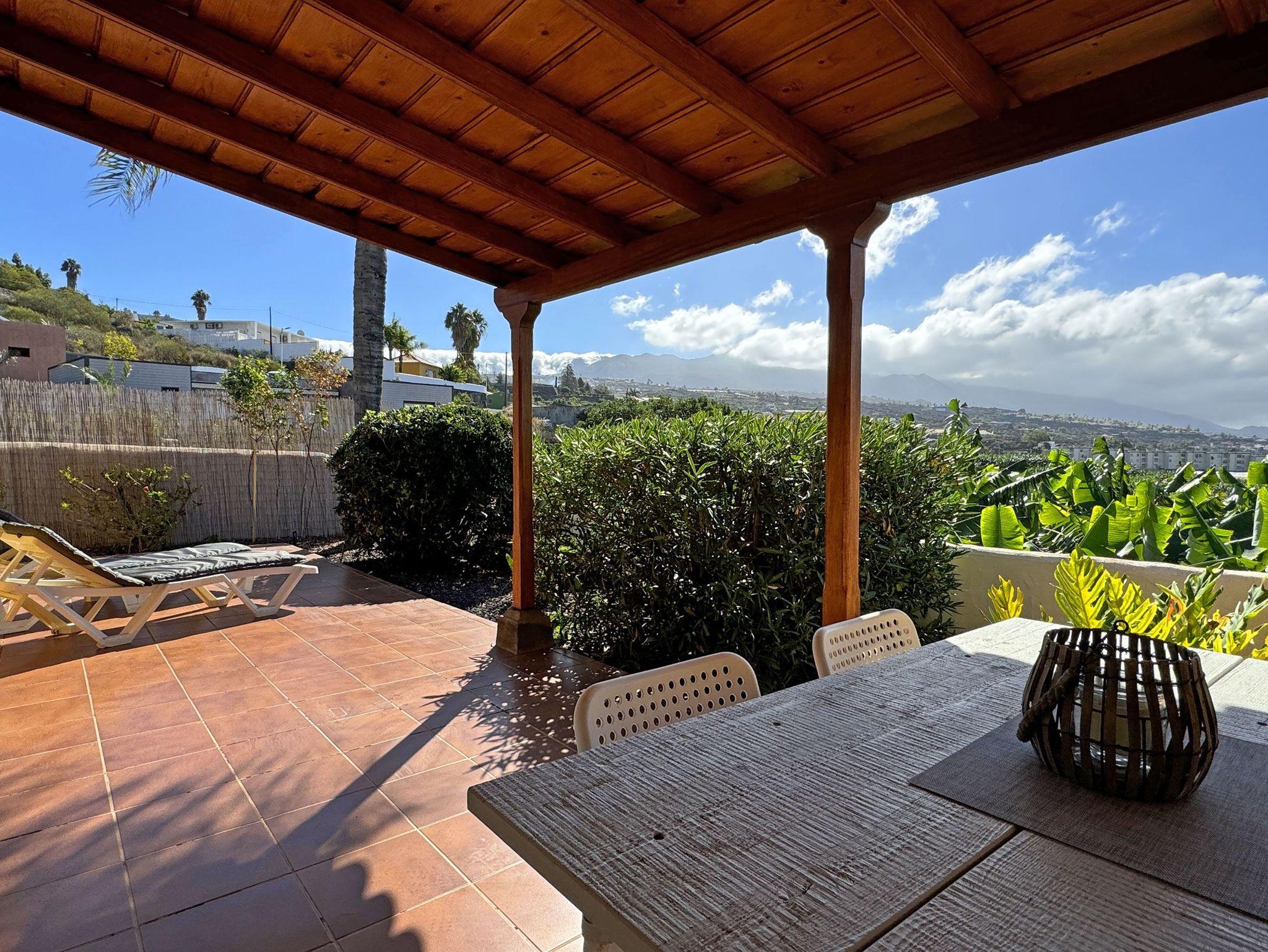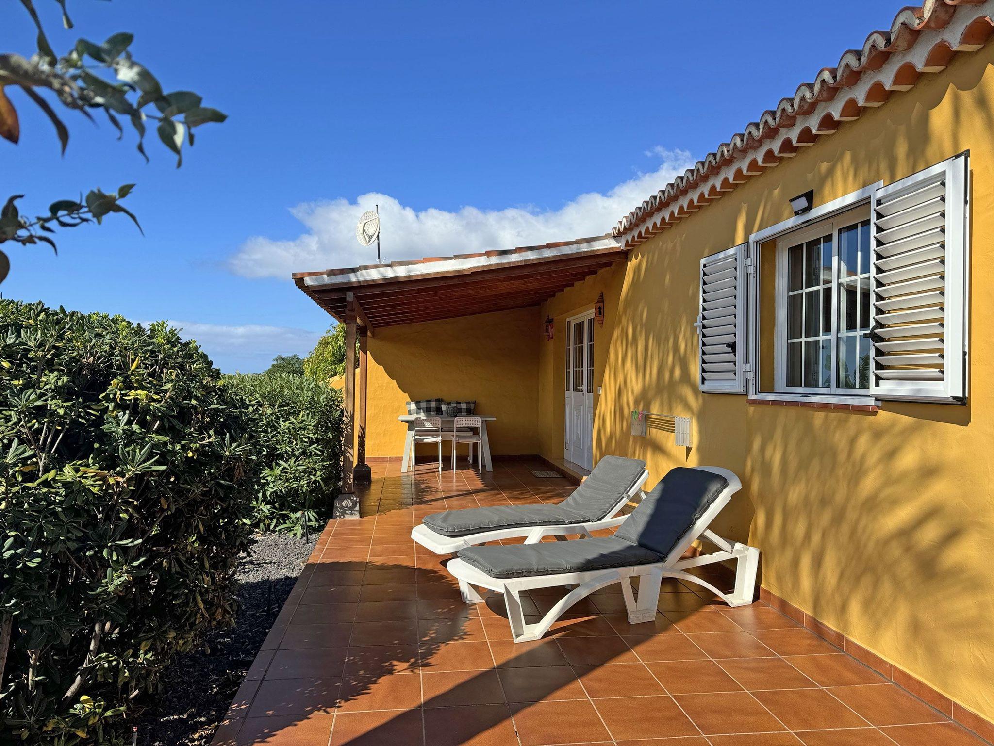 Jede Haushälfte hat ihren eigenen Außenbereich mit einer kleinen überdachten Terrasse mit Tisch, Bank und 2 Stühlen sowie zwei Liegestühlen. Der Garten wurde schön bepflanzt und man hat einen Blick auf Los Llanos.