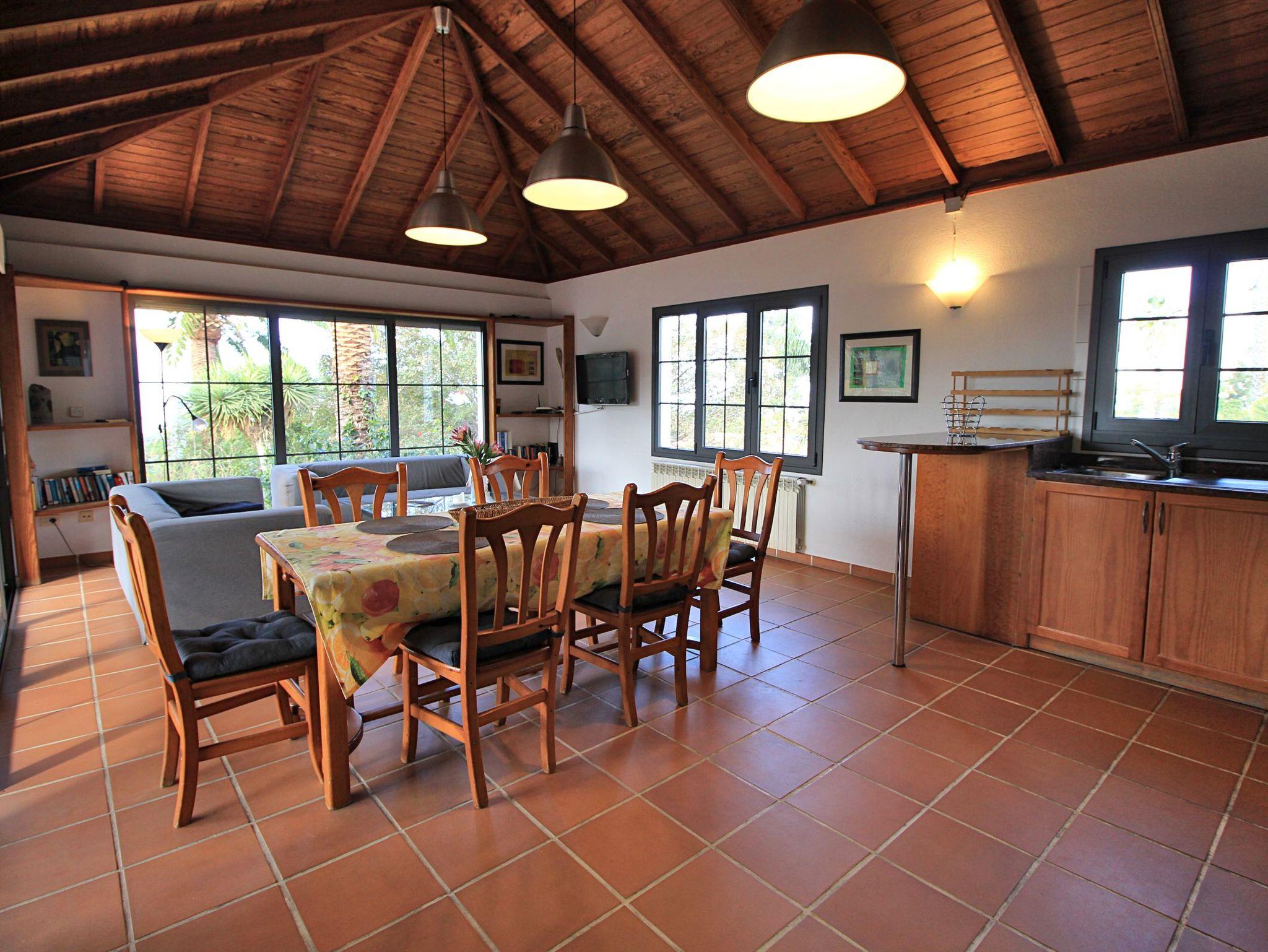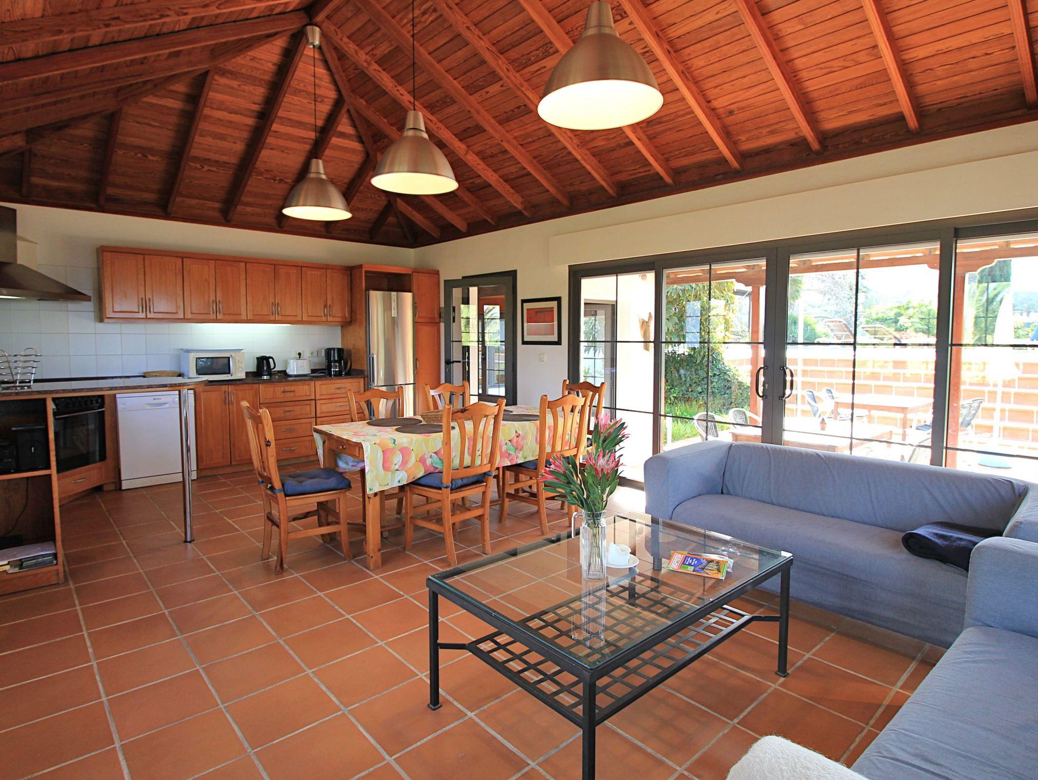 Hohe Kanarische Holzdecken und ein warmer Terracotta-Boden schaffen ein helles, gemütliches Ambiente. Die Fensterfronten kann man alle (teilweise mit Jalousien) abdunkeln.