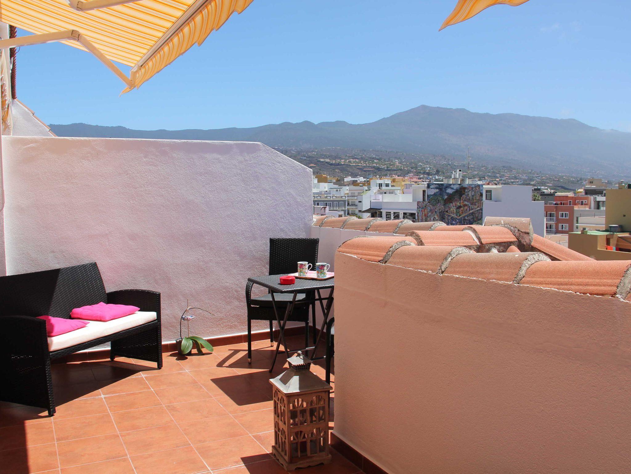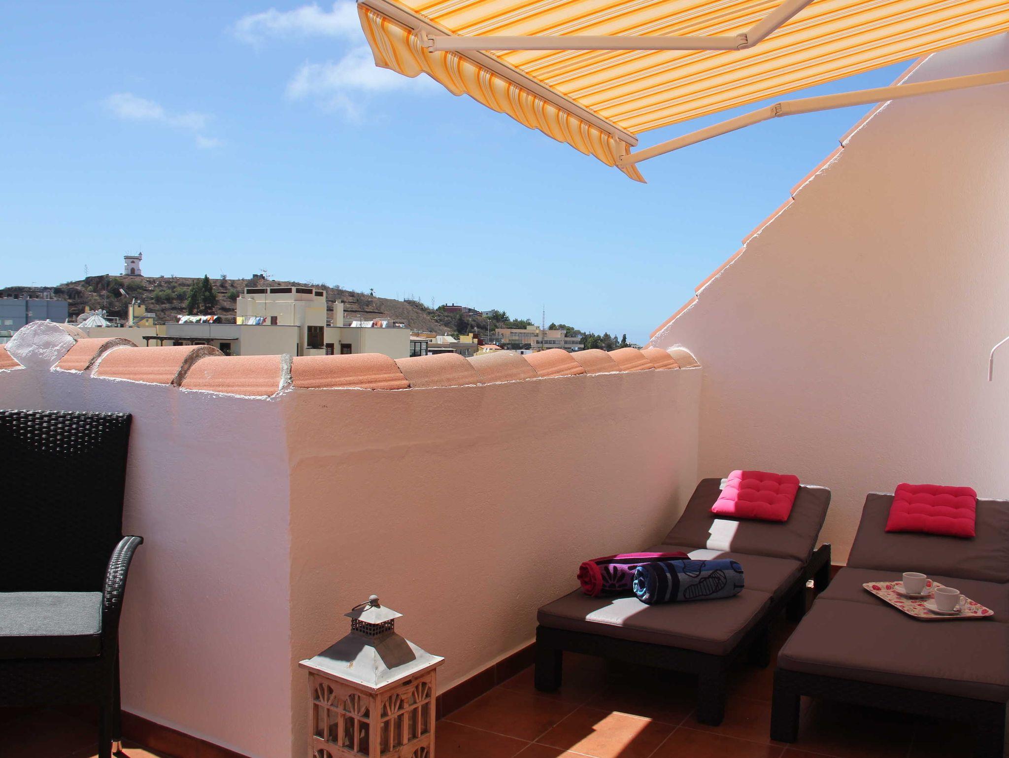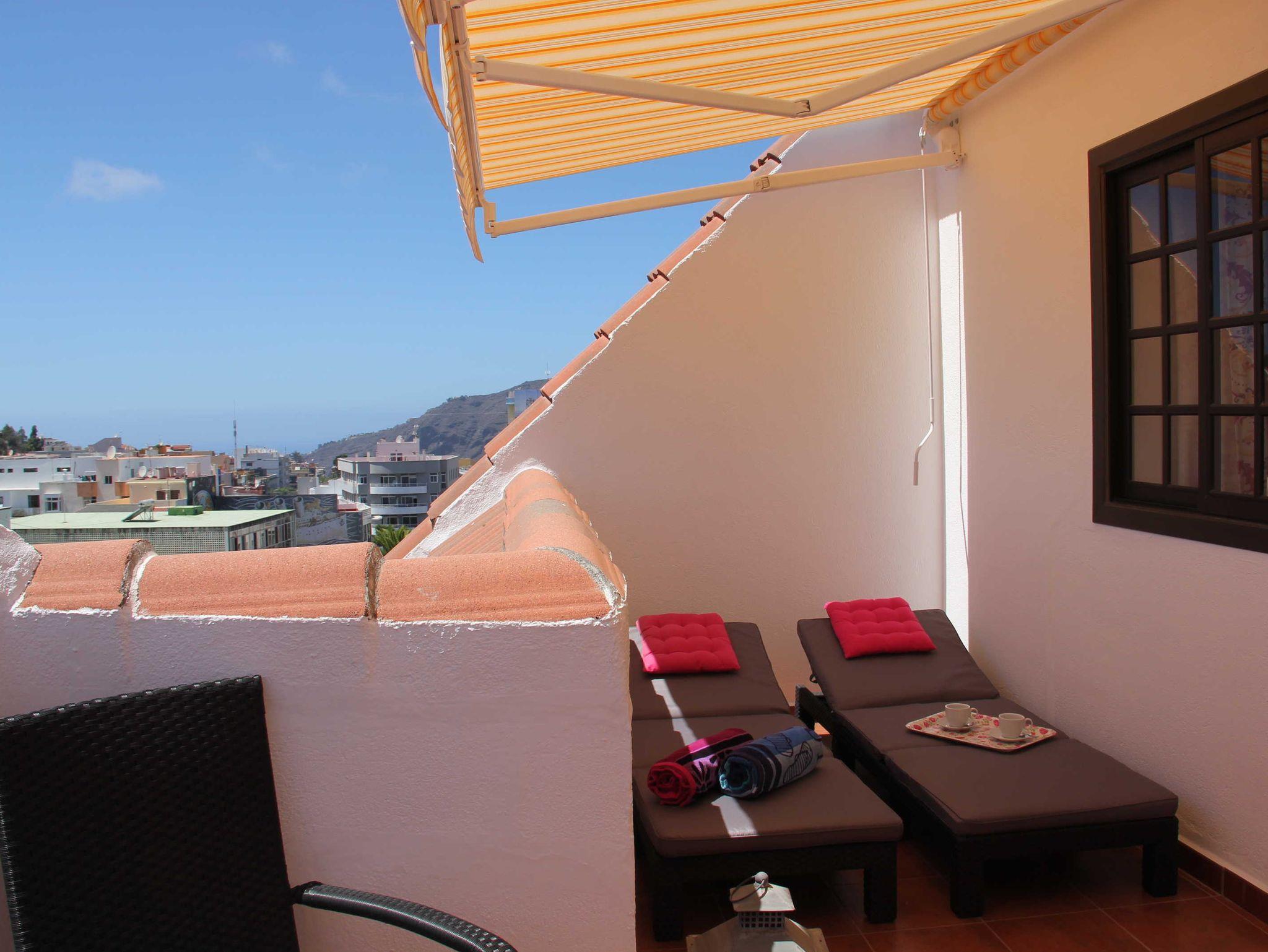 Das komplett neu ausgebaute Apartment bietet allen Komfort und verfügt über einen großen Balkon mit herrlichem Blick über die Dächer auf das Bergpanorama der Cumbre. Richtung Westen ist sogar das Meer zu sehen.