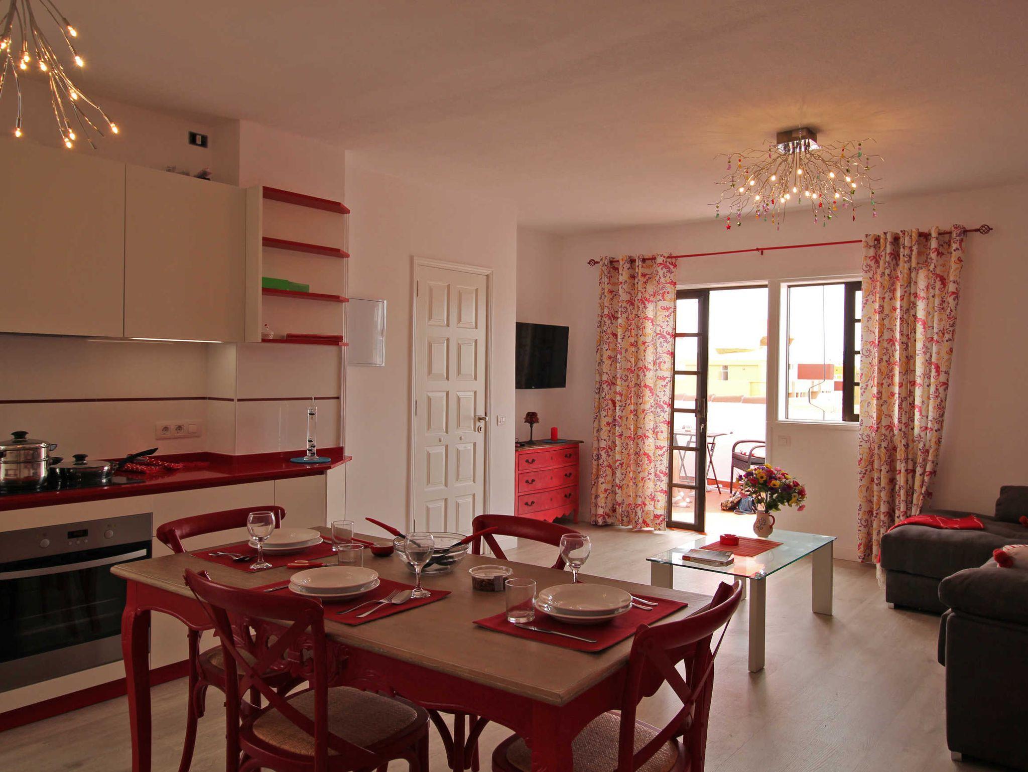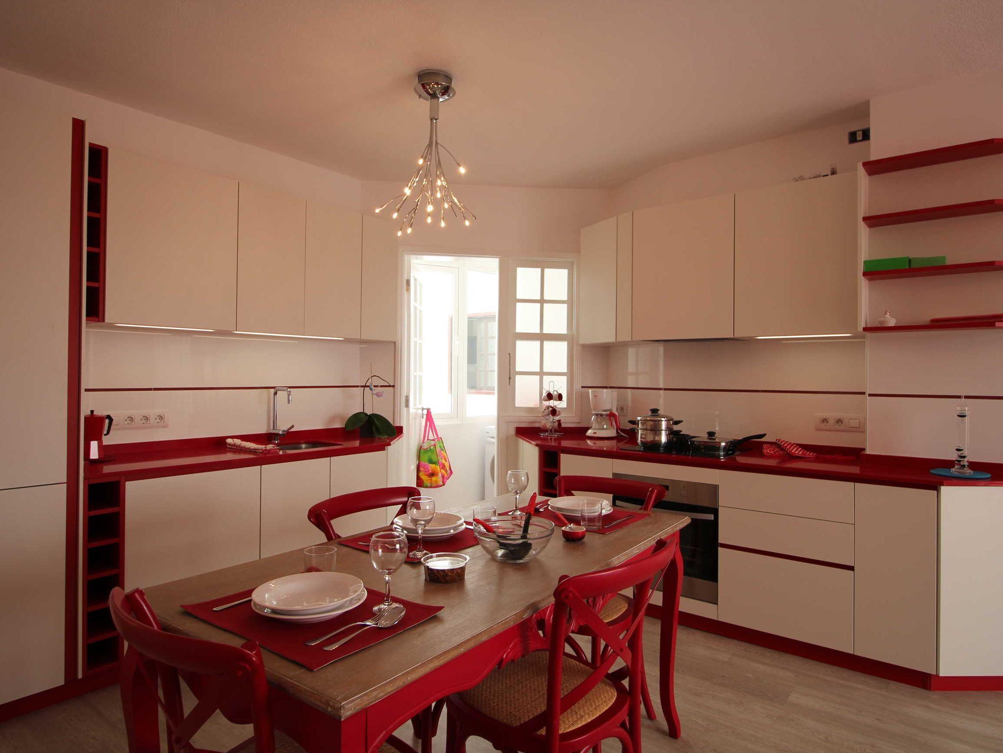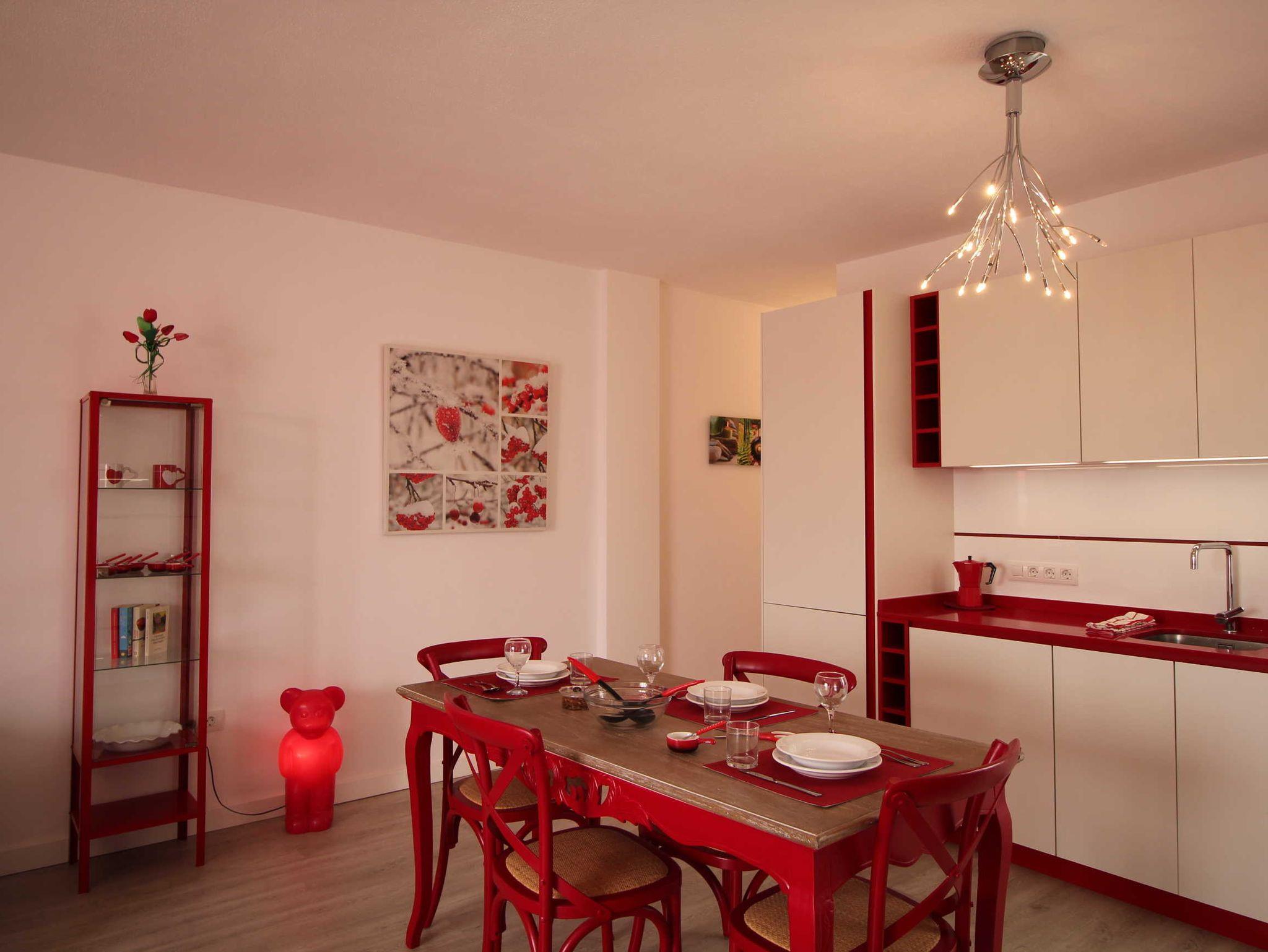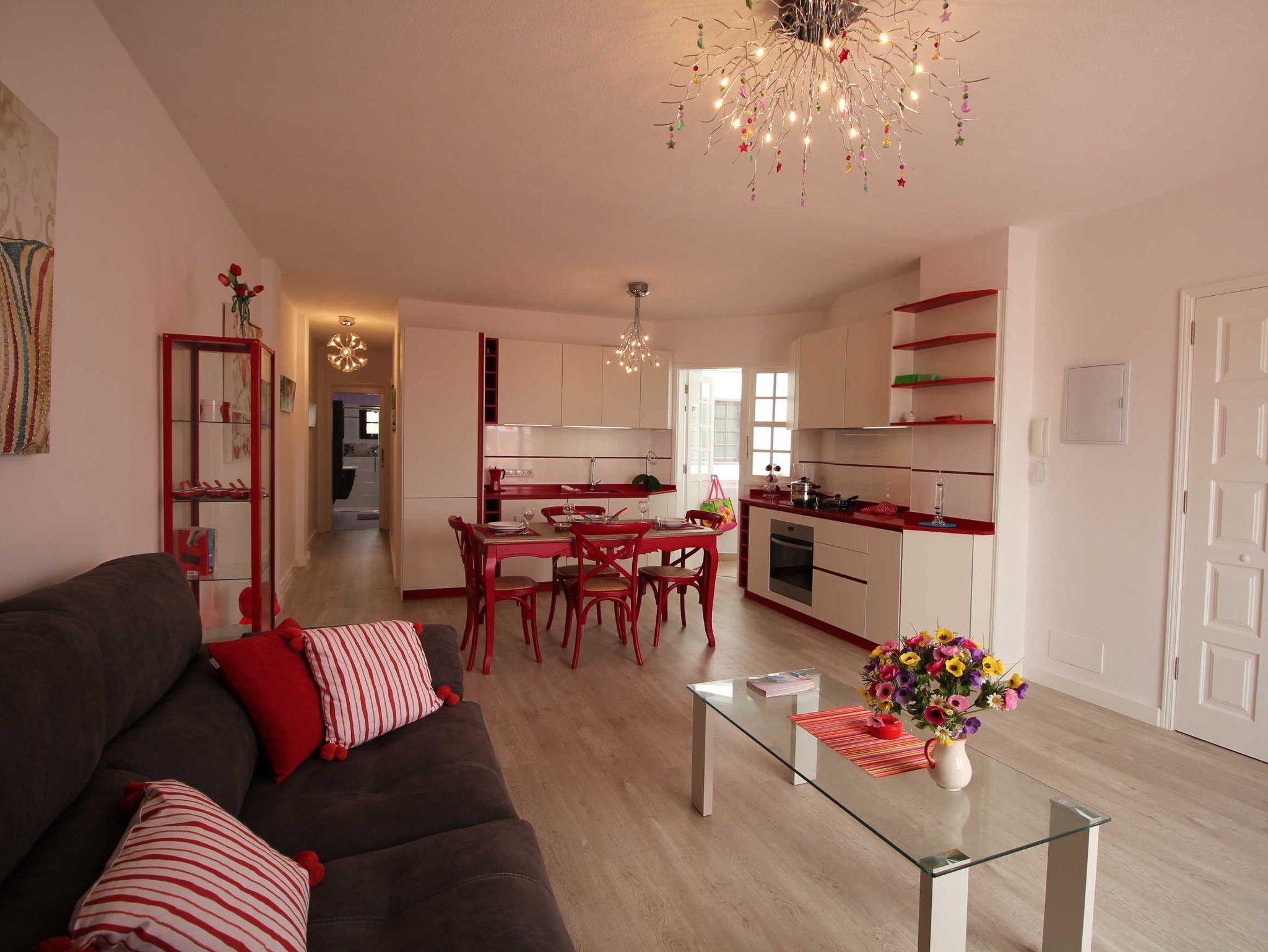 Die Einrichtung ist modern und geschmackvoll, leuchtend rote Akzente strahlen Frische und Fröhlichkeit aus, dazu passt perfekt die dekorative Beleuchtung.
