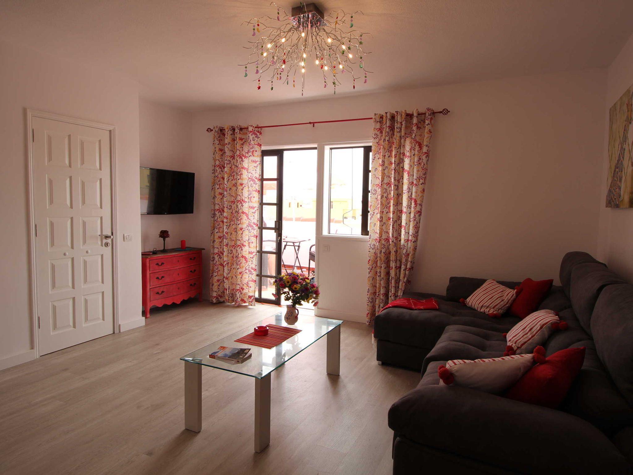 Die Wohnfläche beträgt knapp 76qm. Vom Aufzug kommend betritt man zunächst den geräumigen, lichtdurchfluteten Salon mit amerikanischer Einbauküche. Gegenüber dem Eingang befindet sich eine große, gemütliche Couch mit Recamiere, seitlich ist der Zugang zum Balkon. Für Unterhaltung sorgt ein Sat TV Gerät mit Flachbildschirm und deutschen Programmen.