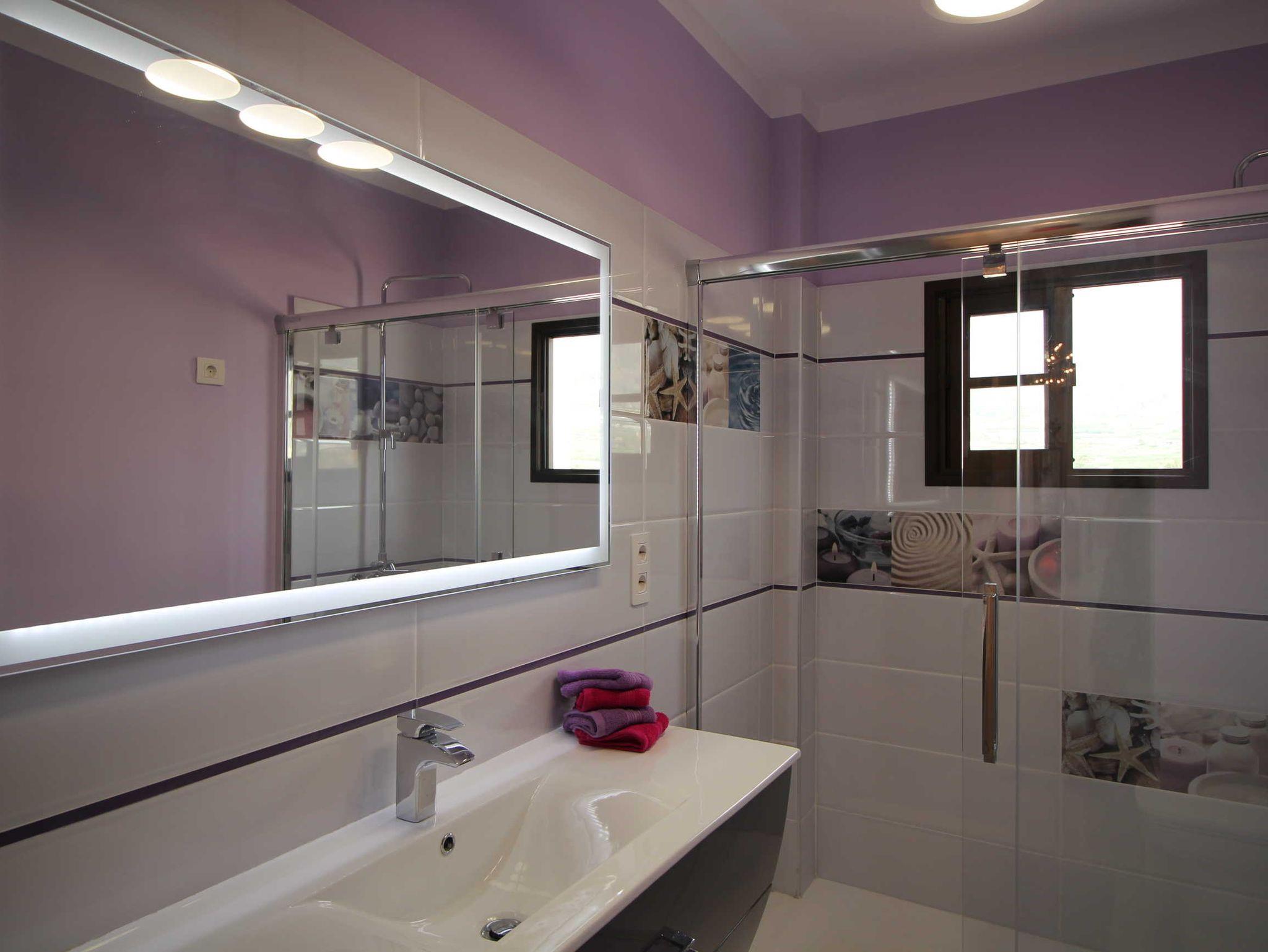 Wunderschön ist das moderne Bad, mit bodengleicher Dusche (Rain-Shower und normal), einem großen Waschtisch mit beleuchtetem Spiegel und WC.
