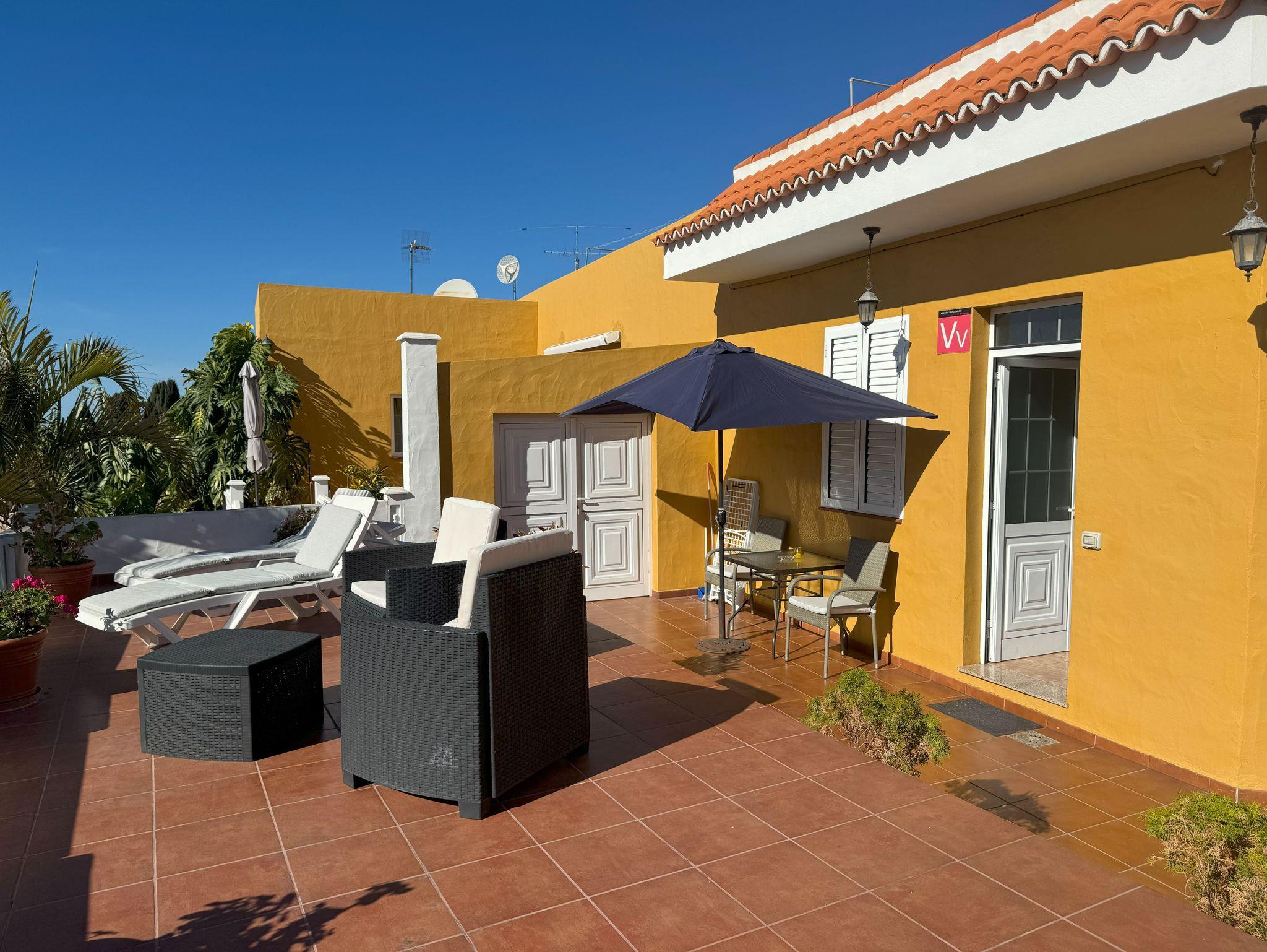 Jede Haushälfte hat ihren eigenen Außenbereich mit einer kleinen Terrasse mit Loungemöbeln sowie zwei Liegestühlen und einem Sonnenschirm. Der Garten wurde schön bepflanzt und man hat einen Blick auf Los Llanos und kann in der Ferne das Meer sehen.
